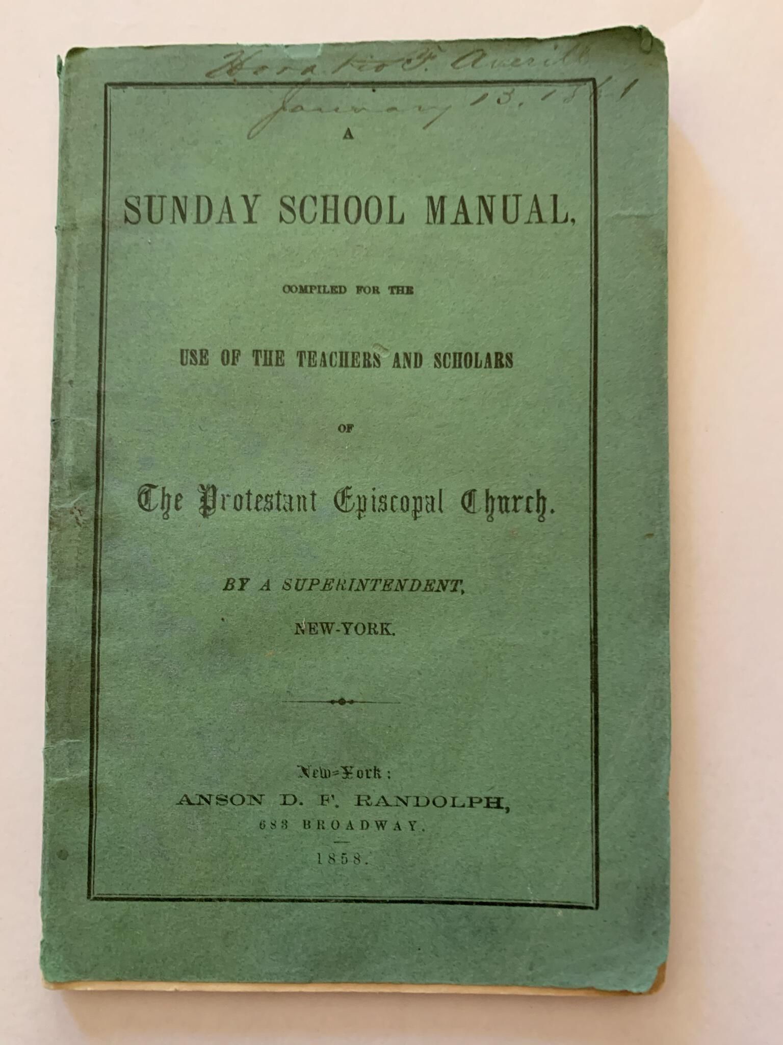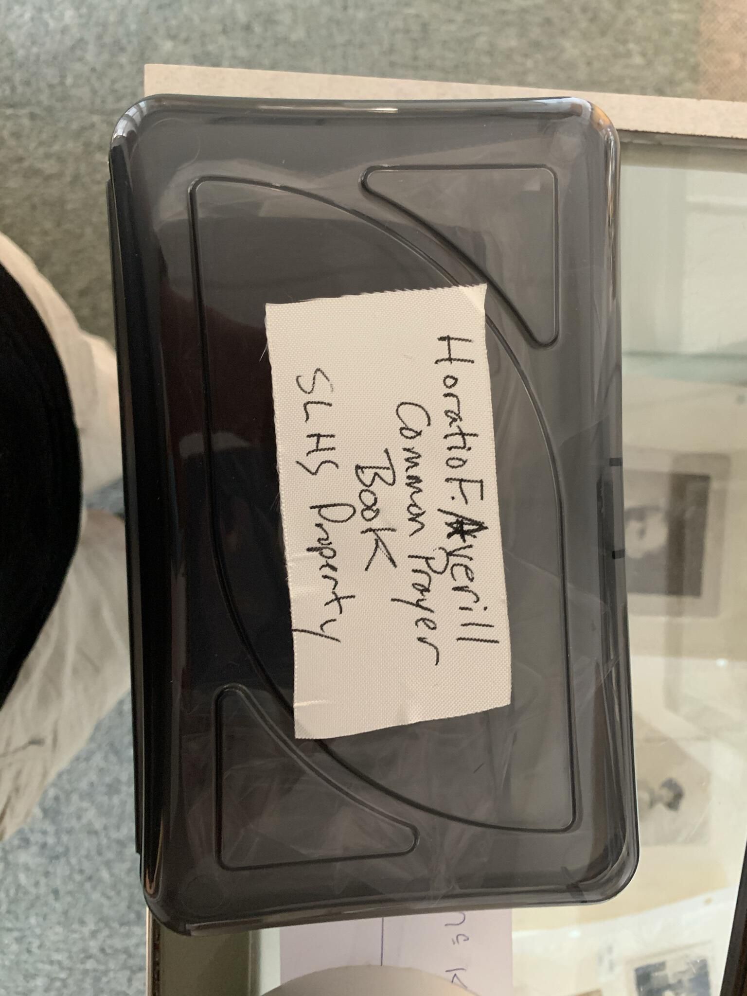 - A book of Common Prayers and a Sunday School Manual that were once owned by Horatio Averill. Both books were gifted to Horatio in 1861 and are SLHS owned items stored in acid-free wrappings located in a plastic container in Drawer 2 of SLHS File Cabinet 3, Drawer 4, on the 2nd Floor of Town Hall, which is a locked and fire-resistant container.Context