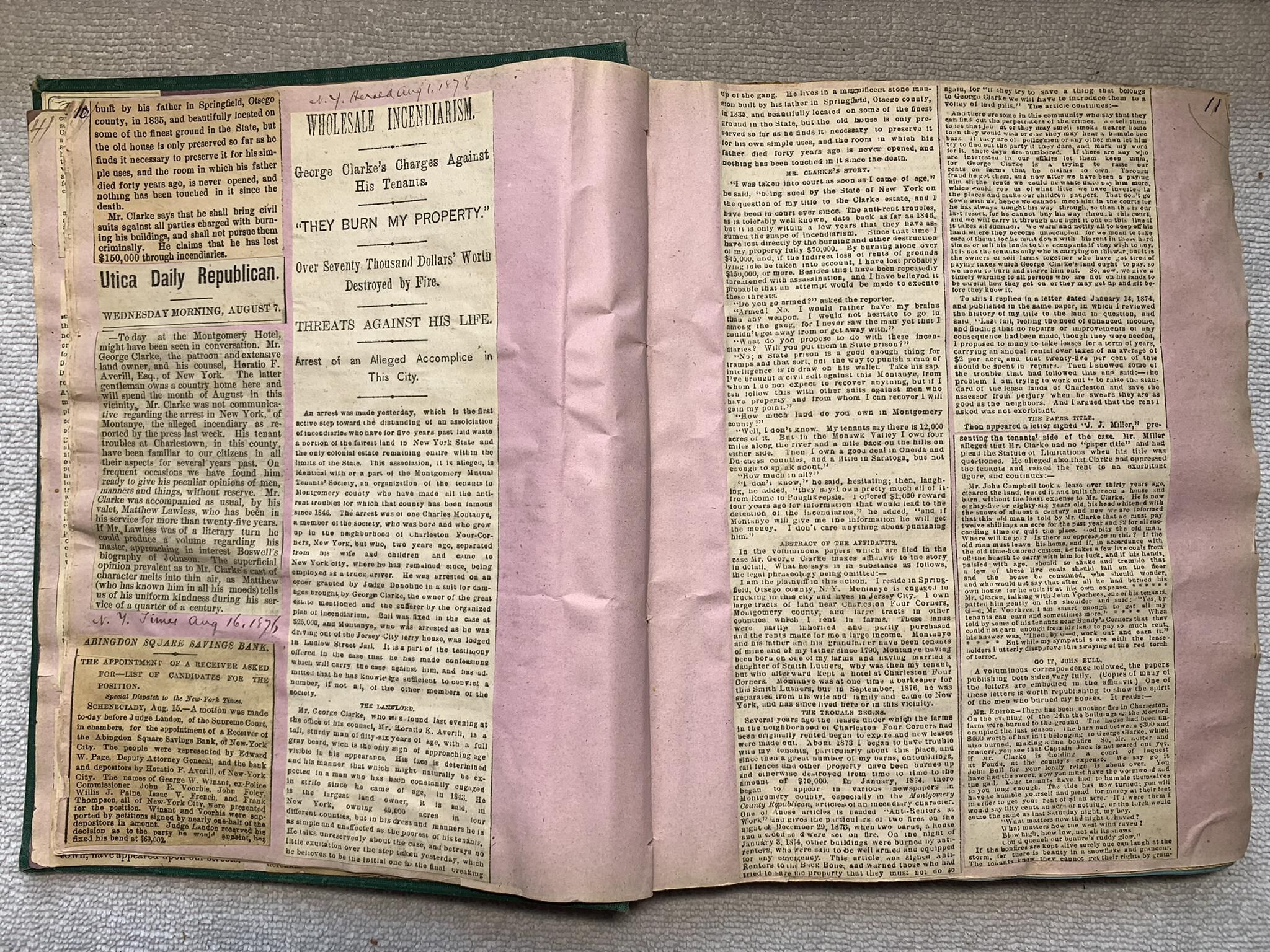 - A forty-nine-page PDF of a scrapbook of newspaper articles that was meticulously maintained by Horatio by his own hand during the late 19th century. The scrapbook includes numerous cut and pasted-in newspaper articles published from December 11, 1877, through April of 1886 that Horatio obviously collected from well over a dozen different newspapers located throughout the region and State regarding the business and social dealings of the overall Averill family and Town of Sand Lake. Most of the articles relate to Horatio's law practice which was involved in many of the most sensational primarily New York City-based civil and criminal cases throughout the last third of the 19th century. In particular, he represented notorious hereditary land baron George Clarke against his frequently violent anti-renter tenants located throughout Central, NY. Other cases involved many of the most sensational matrimonial, insurance, and criminal cases of his day. The articles also include Horatio's defense of his involvement in the Nalle fugitive slave affair, Nalle's eventual death, and the genesis and demise of Averill family-owned or involved businesses and events in Sand Lake, including the Averill Park Hotel, Tally Ho Stage Coach, Plank Road Company, Mutual Protection Agains Horse Thieves, and Averill family marriage, event, and death notices. The PDF also includes two-pages of handwritten notes by an unidentified modern-day local historian that highlight a small fraction of the most interesting entries. The scrapbook was donated to the Town by Richard Seuffert in 1977 and the PDF is downloadable while fully logged into the system. Refer to the included example page for a preview of its content. A much higher resolution PDF is stored off-line and available upon request under the file name: