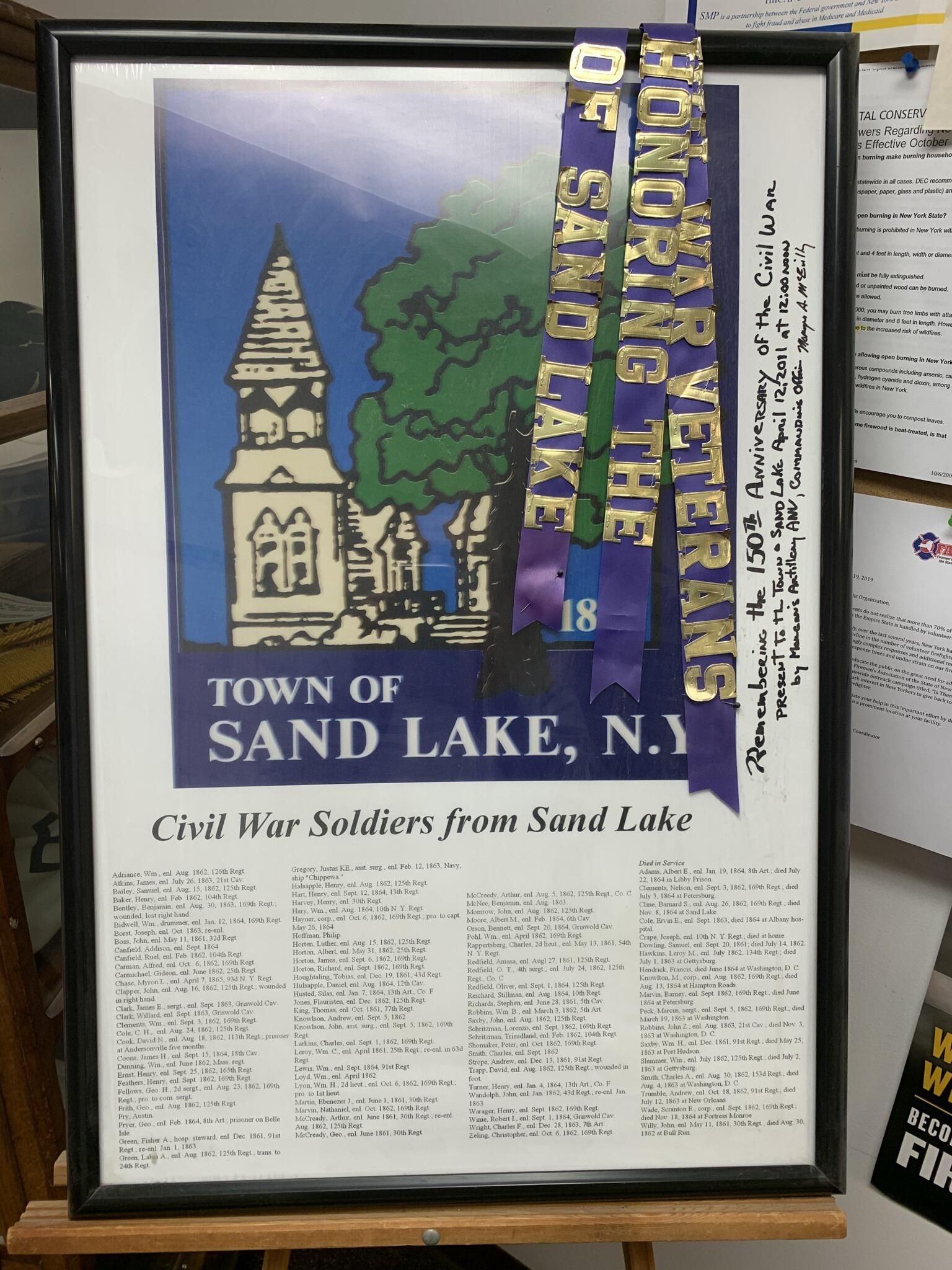 Hand-written listing of Town of Sand Lake related Revolution, Civil War, and War of 1812 veterans compiled by Art Handley on behalf of SLHS perhaps for use in helping commemorate the 150th anniversary of the Civil War or provide data to the builders of the TOSL Veterans Park. The PDF can be downloaded while logged into the system. Hardcopy is stored in Page Protector 10 of the SLHS Miscellaneous Ephemera and Artifacts binder that is located in Drawer 2 of SLHS File Cabinet 1 located on the second floor of Town Hall.Publication Details