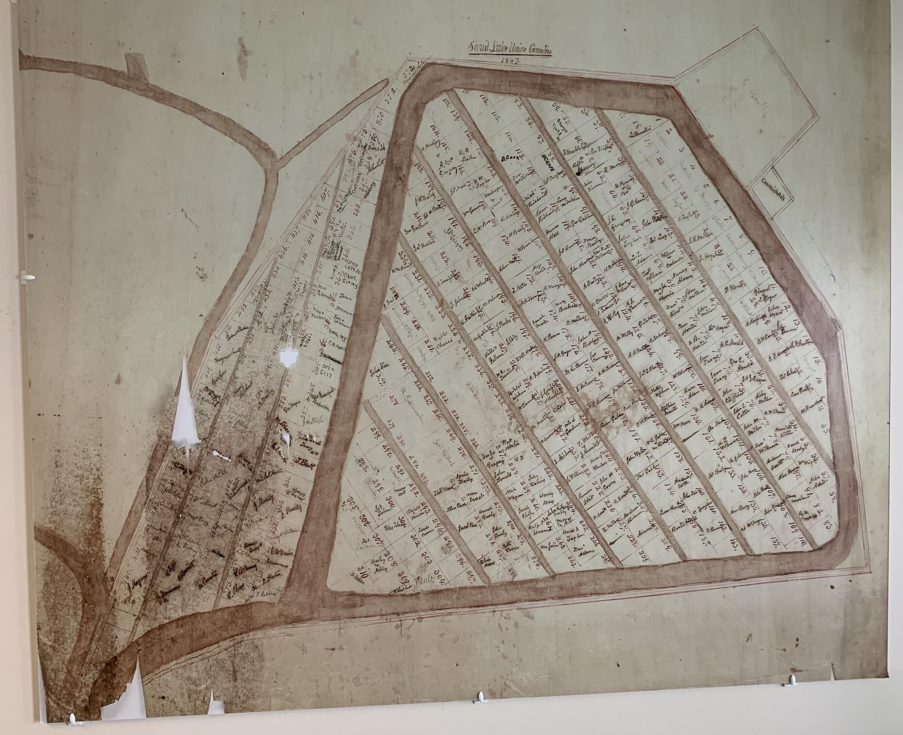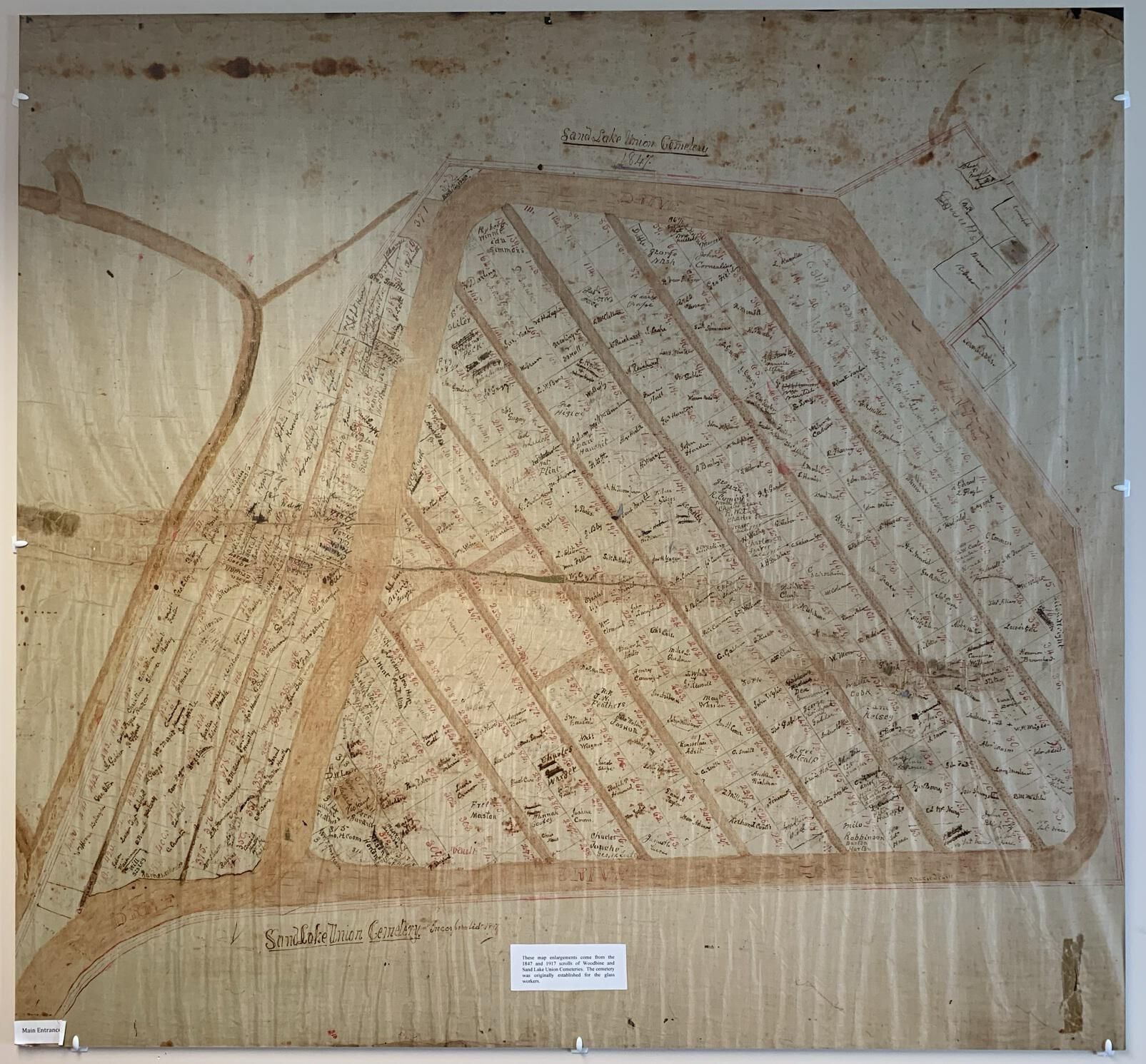 Two enlarged (approximately 4-foot square) photographs of hand-drawn maps of the burial plots in the Woodbine and Sand Lake Union Cemetery in the Hamlet of Averill Park in the Town of Sand Lake, NY, as of 1847 and 1917. The cemeteries were initially established for the internment of glass factory workers. Both maps are currently hanging on the wall near the rear exterior entrance to the TOSL Library on the 2nd floor of Town Hall. The enlarged prints were created to provide visual displays in support of the first Amazing Graves cemetery walking tour and theatrical production on October 15 and 16 2016 and have since proved to be useful in support of research efforts. Refer to the web links portion of this entry for more information about Amazing Graves.Cataloged By