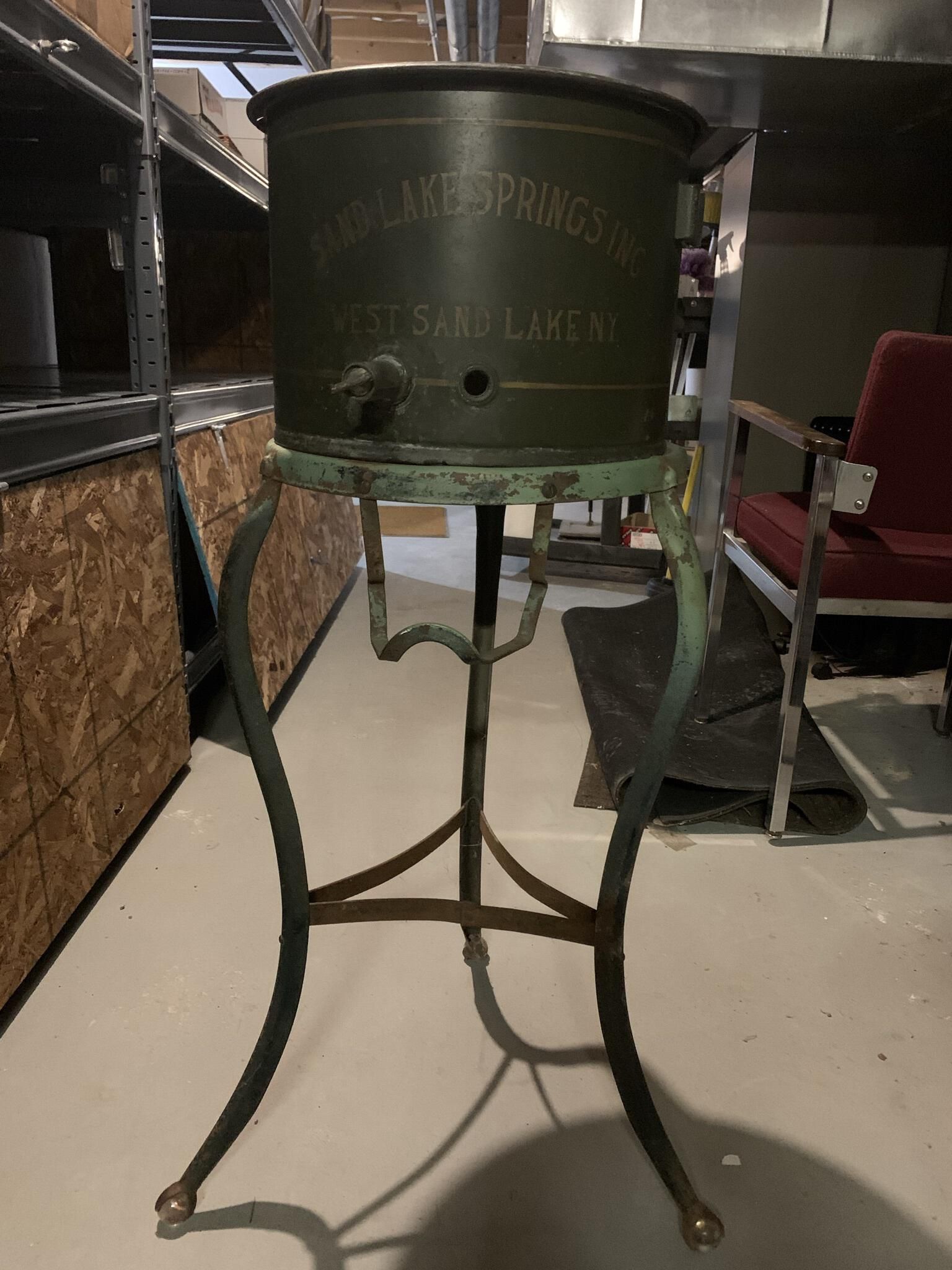 Most of the bottom dispensing portion of a Sand Lake Springs 5 Gallon Water Cooler. See the Sand Lake Springs Town Hall Display for a far more complete example. In particular, this specimen is missing the 5 gallon bottle and part of its spigot and overflow control apparatus. Currently stored in BSA2-L-B&F.Cataloged By