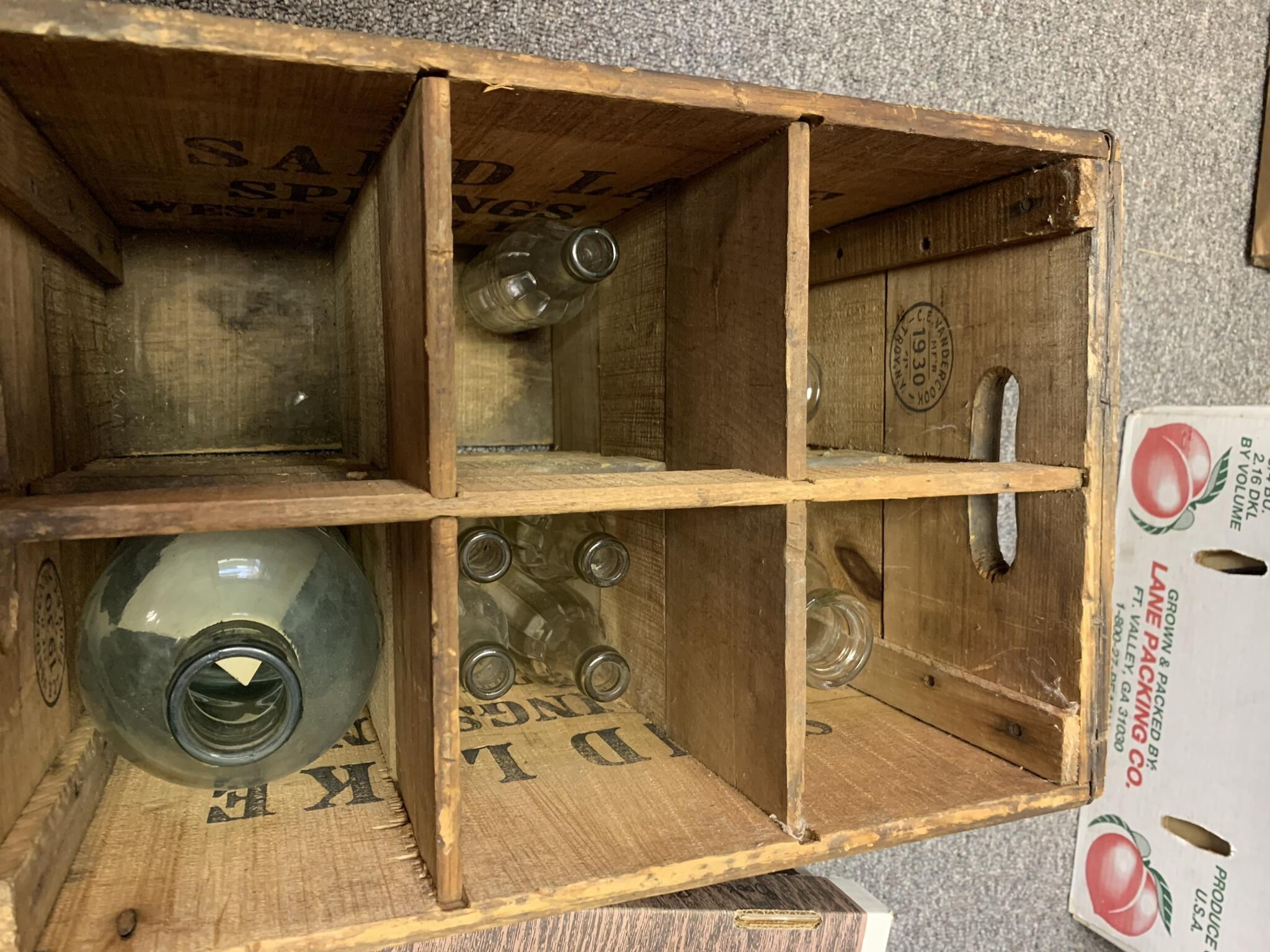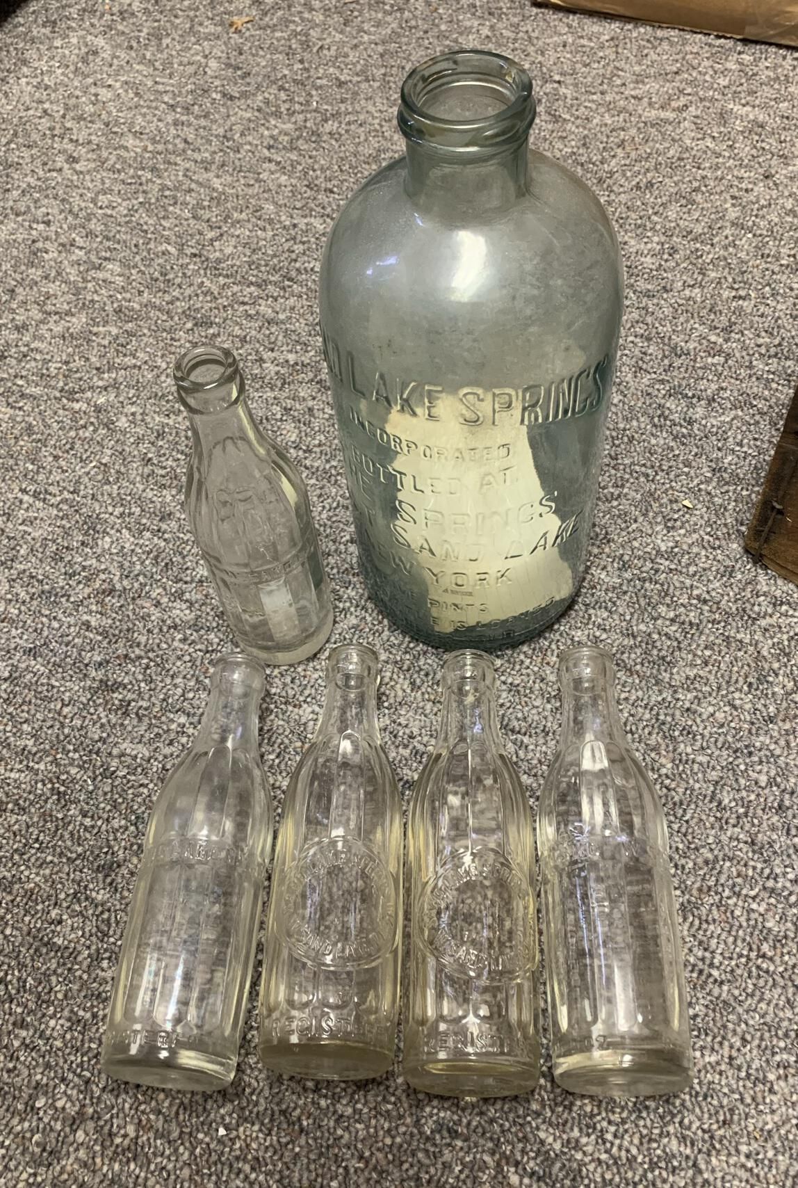 Collection of seven (6 in Box Type 1 and 1 in box Type 2) Sand Lake Springs 5 pint water bottles and three Sand Lake Springs boxes (one Types 1, 2, and 3) / returnable bottle storage containers / caddies as well as five miscellaneous soda bottles stored in Box Type 2.Context
