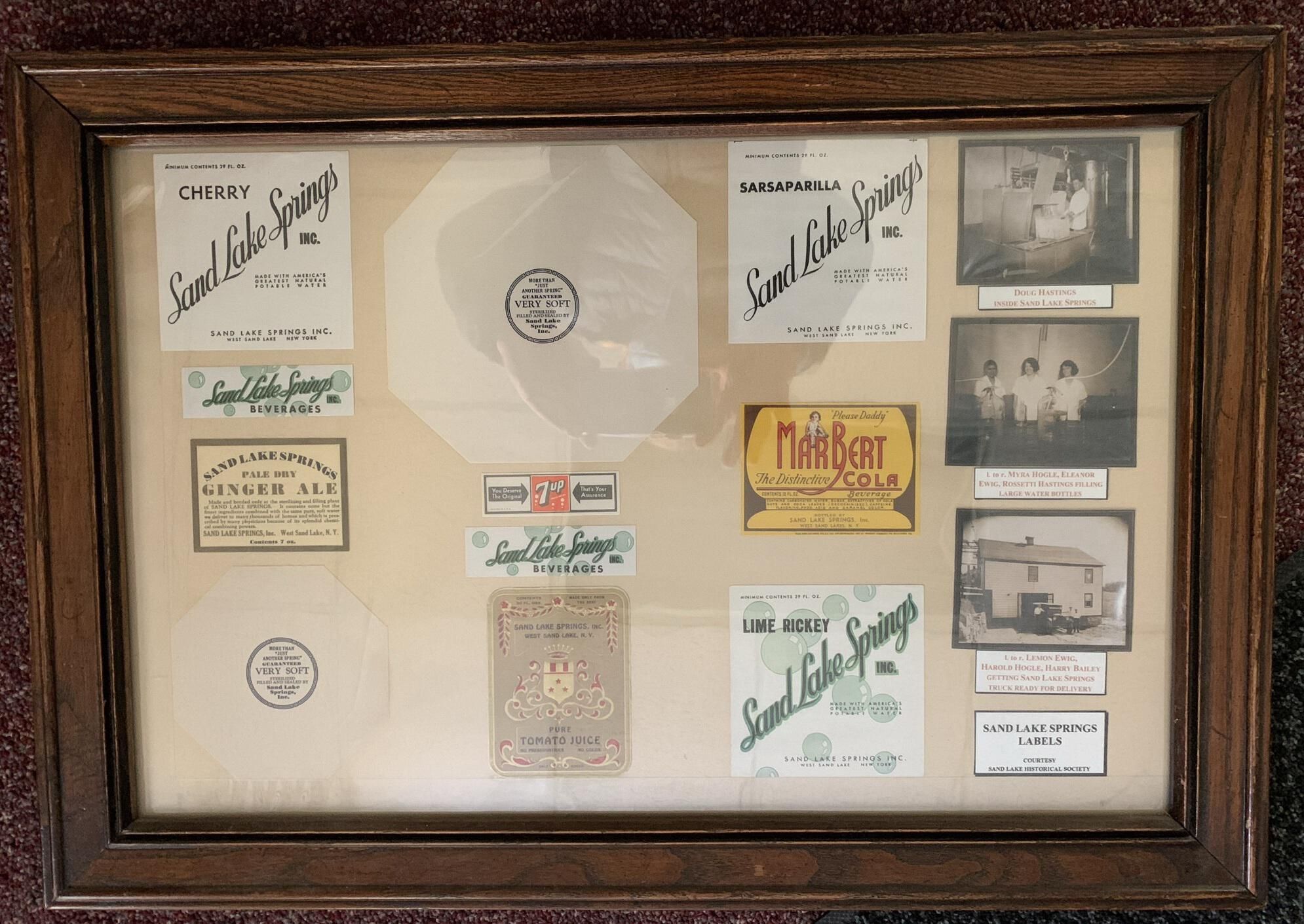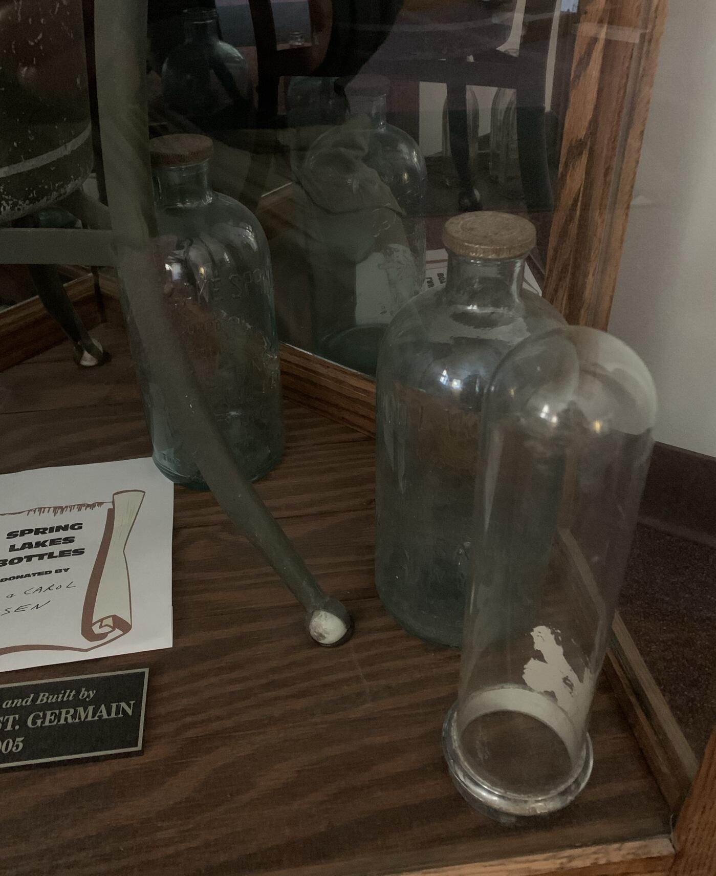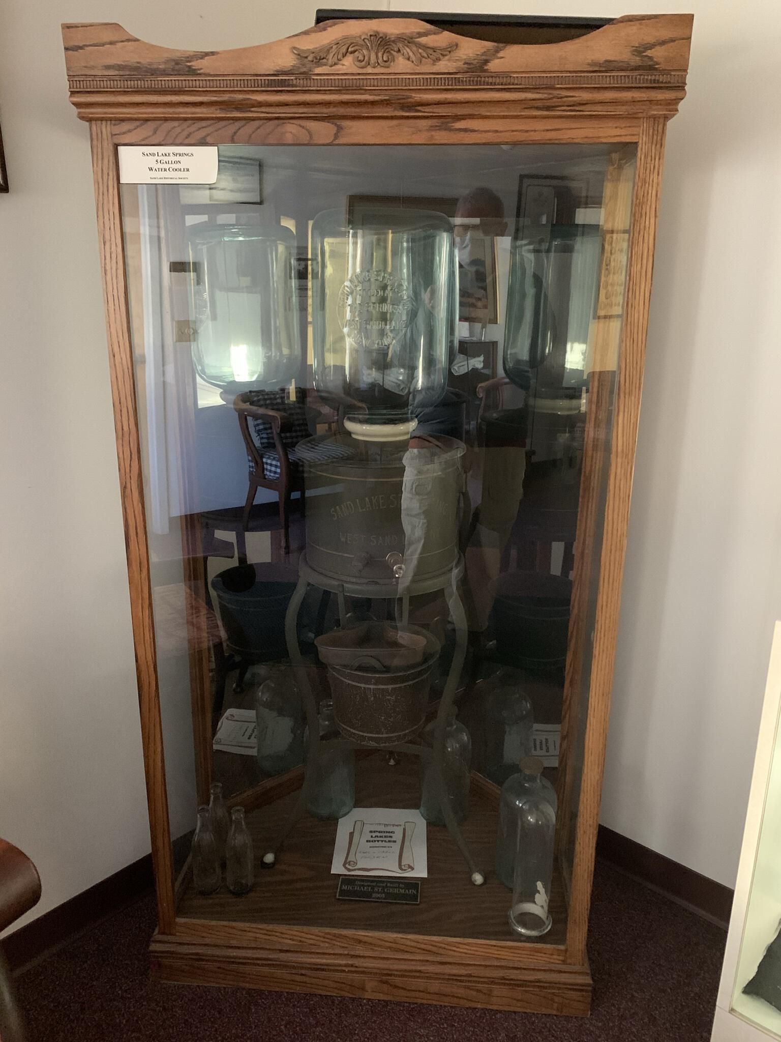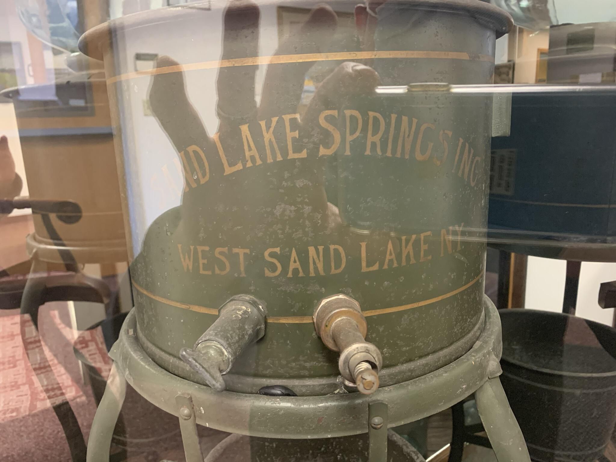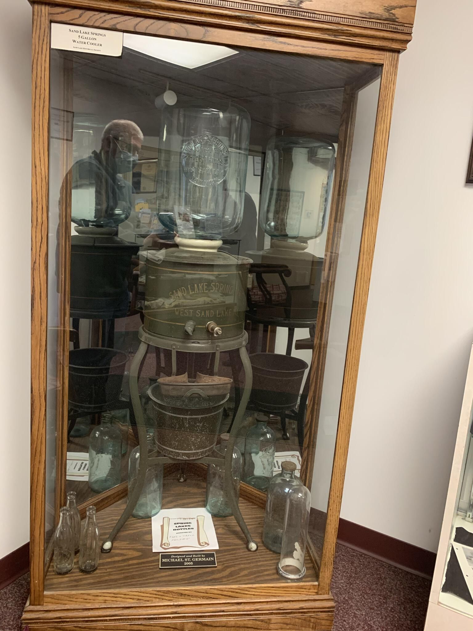 Sand Lake Springs Display and Artifacts. The display is located in the main entrance foyer of the Town Hall of the Town of Sand Lake, NY. The cabinet is too large, heavy, and risky to move to facilitate individually photographing the items stored therein. Organized by SLHS volunteers in 2005 and consisting of solely SLHS owned artifacts.Context