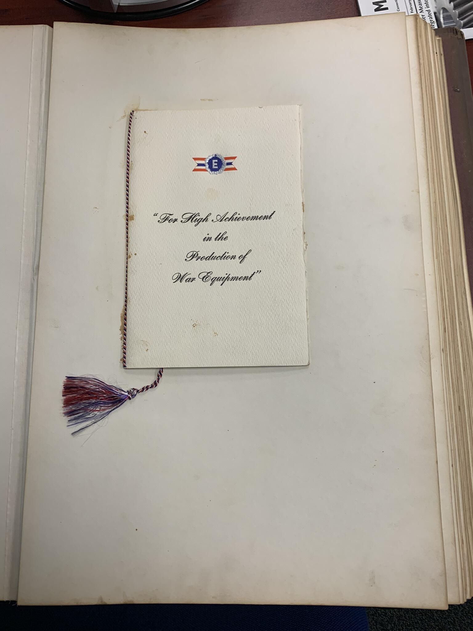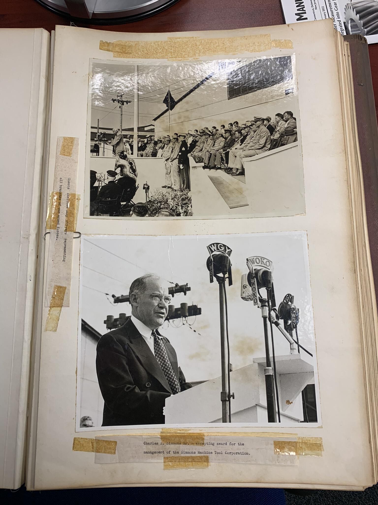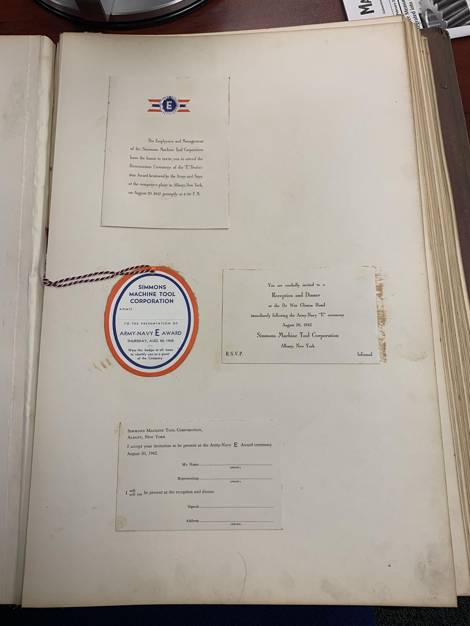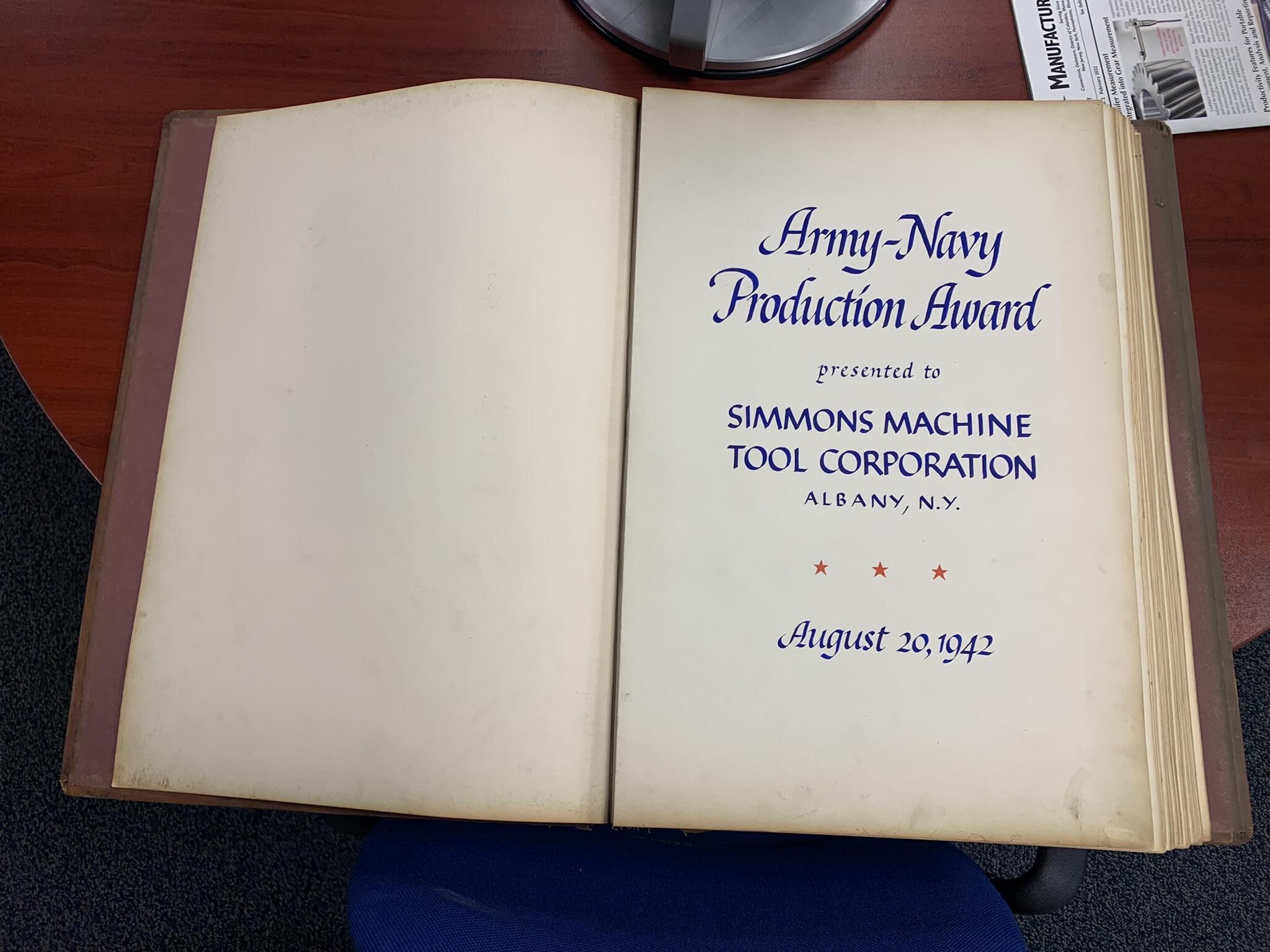 Program commemorating the award of a WWII Army-Navy Production Award similar to the one received by Faith Mills to the Simmons Machine Tool Company of Albany, NY. SLHS Archivist/Curator Mike Perry found the program buried in the SLHS files in February of 2022 with a post-it note affixed to it stating, "see if Albany can use this," without any further explanation of who or what in Albany might be able to use the program. As a result, Mike did some research, discovered that Simmons remained in business, and e-mailed its sales department to determine if Simmons had any interest in the program. Mike received an almost immediate response from Mr. Brandon Teal, who is a Production Manager for Simmons, Town of Sand Lake native and current resident, and member of its historic Teal family. Brandon advised Mike that Simmons was keenly interested in receiving the program to add to its extensive collection of materials commemorating the event. Specifically, Brandon arranged for Mike to visit the Simmons plant in Albany on February 21, 2022, to deliver the program and review a nearly 3-foot tall x 2-foot wide and 5-inch thick scrapbook that Simmons had organized to extensively commemorate the event as well as meet Simmons President and COO, Mr. David Davis, and several other Simmons employees. Simmons had a copy of the program. However, it was permanently glued into the scrapbook. Thus, Mr. Davis explained that the extra loose program would help Simmons further ongoing plans to create a historical display commemorating Simmons' founding in 1910 and over 112 years of history. Brandon and Mike suspect that another Sand Lake resident might have worked for Simmons during the war years, received the program as well as perhaps an award, and eventually donated the program to SLHS. Regardless, SLHS definitely returned the program to the best place to ensure its further preservation and appreciation. Hopefully, SLHS can eventually find additional photos and articles related to its Army-Navy Award presentation.Cataloged By