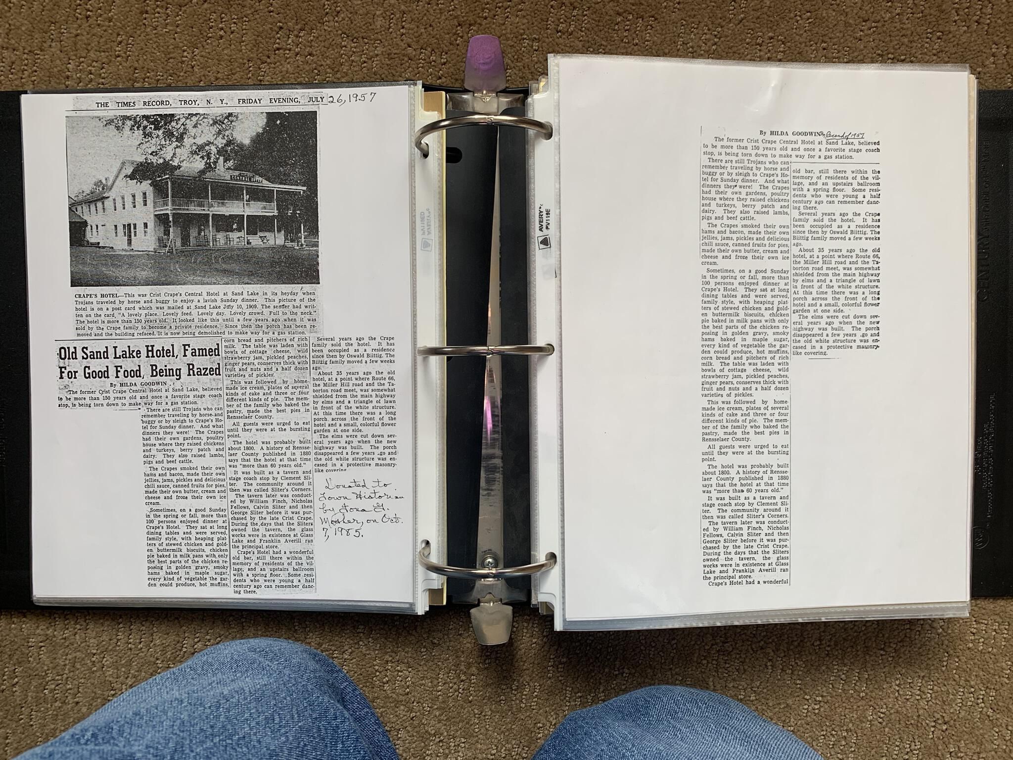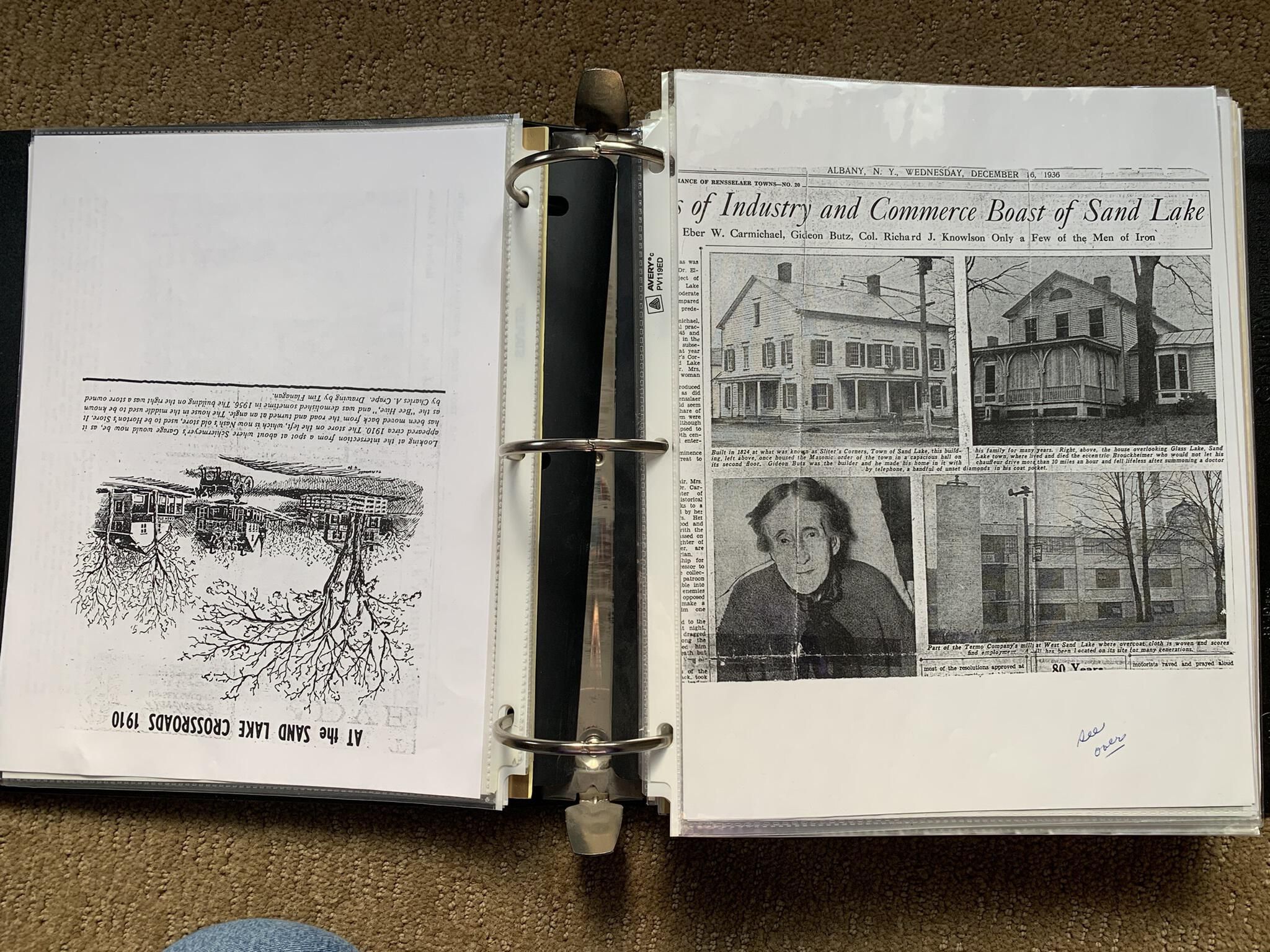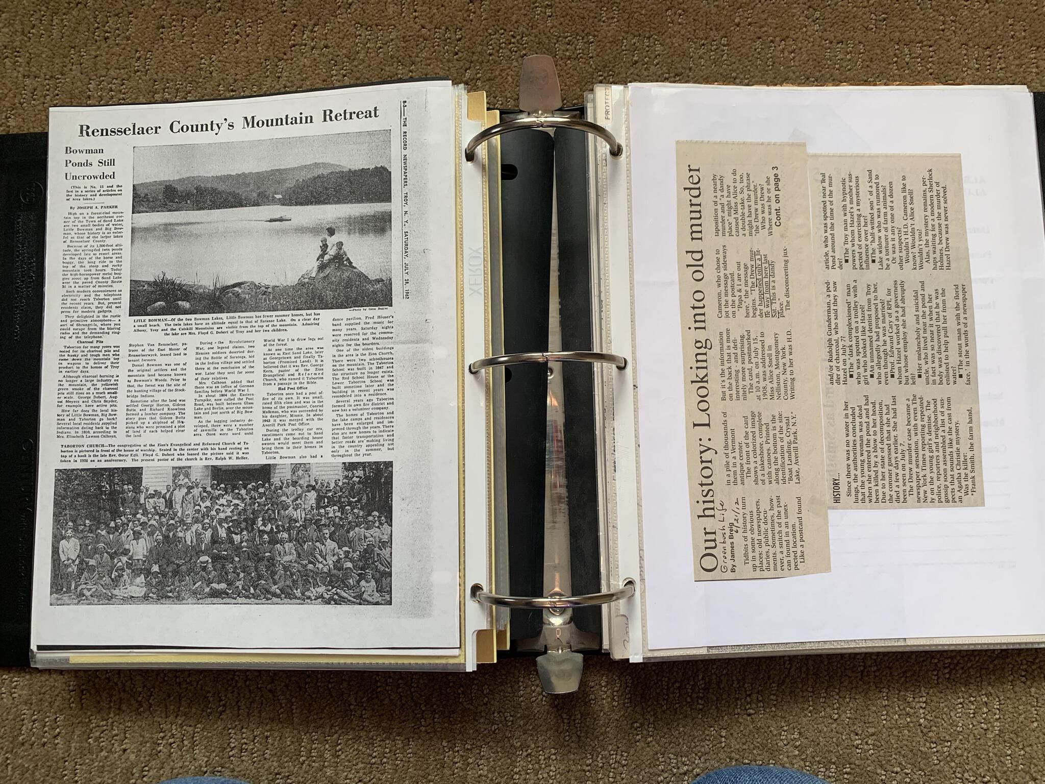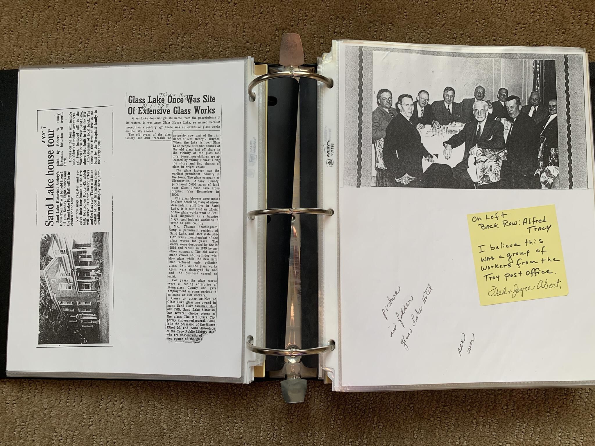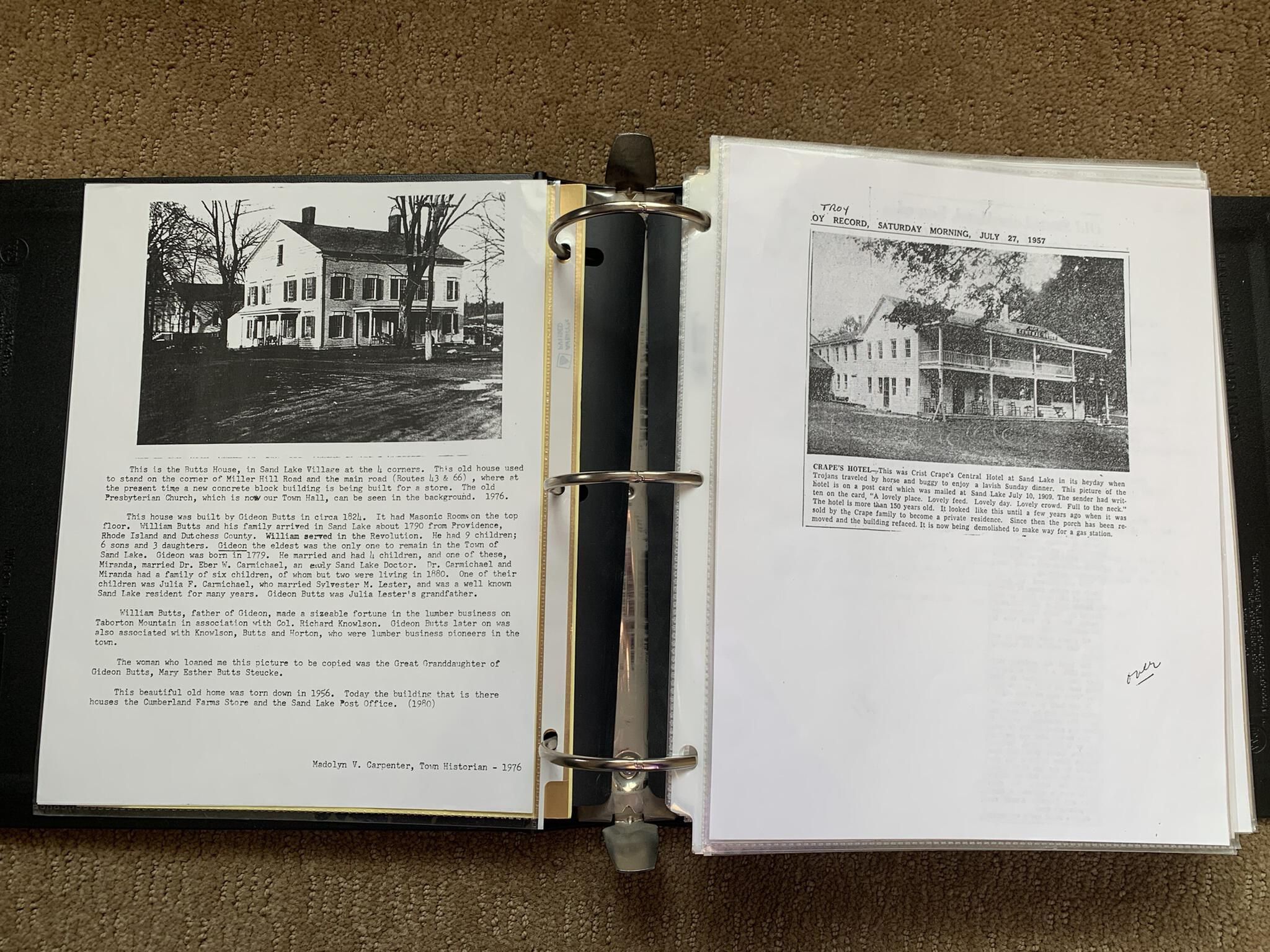 Binder of various newspaper articles, recollections, and memorabilia related to Town of Sand Lake historic hotels (particularly Crooked Lake Hotel), industry (particularly the Rensselaer Glass Factory and charcoal production), homes, churches, and the Sand Lake hamlet of Taborton. Much of the content already appears in other binders or could be obtained from online newspaper archives. Nearly all of the content consists of photocopies of original items. Several multi-page entries have been scanned to PDF and uploaded to the Informal Histories folder of this system as indicated below.Cataloged By