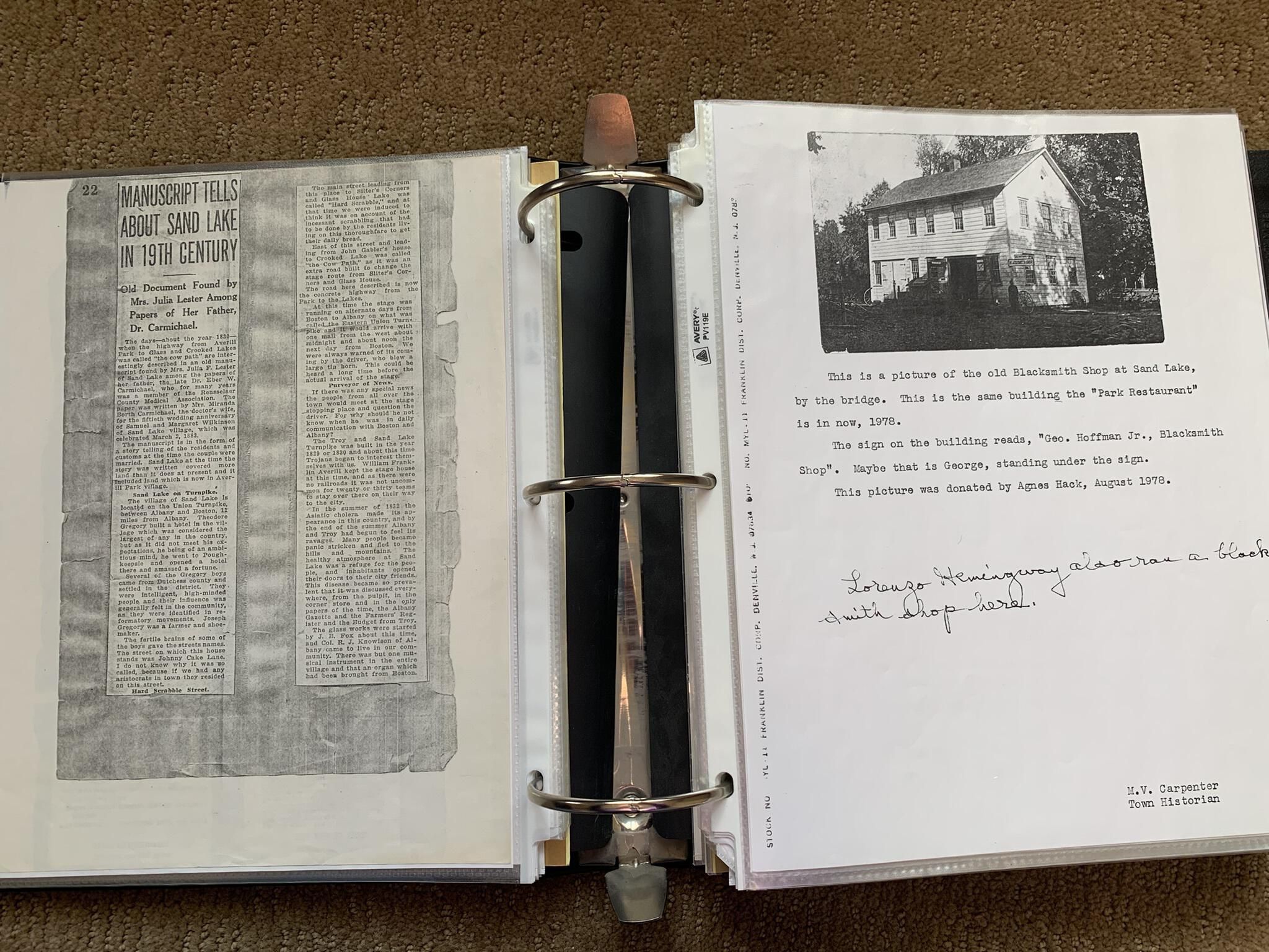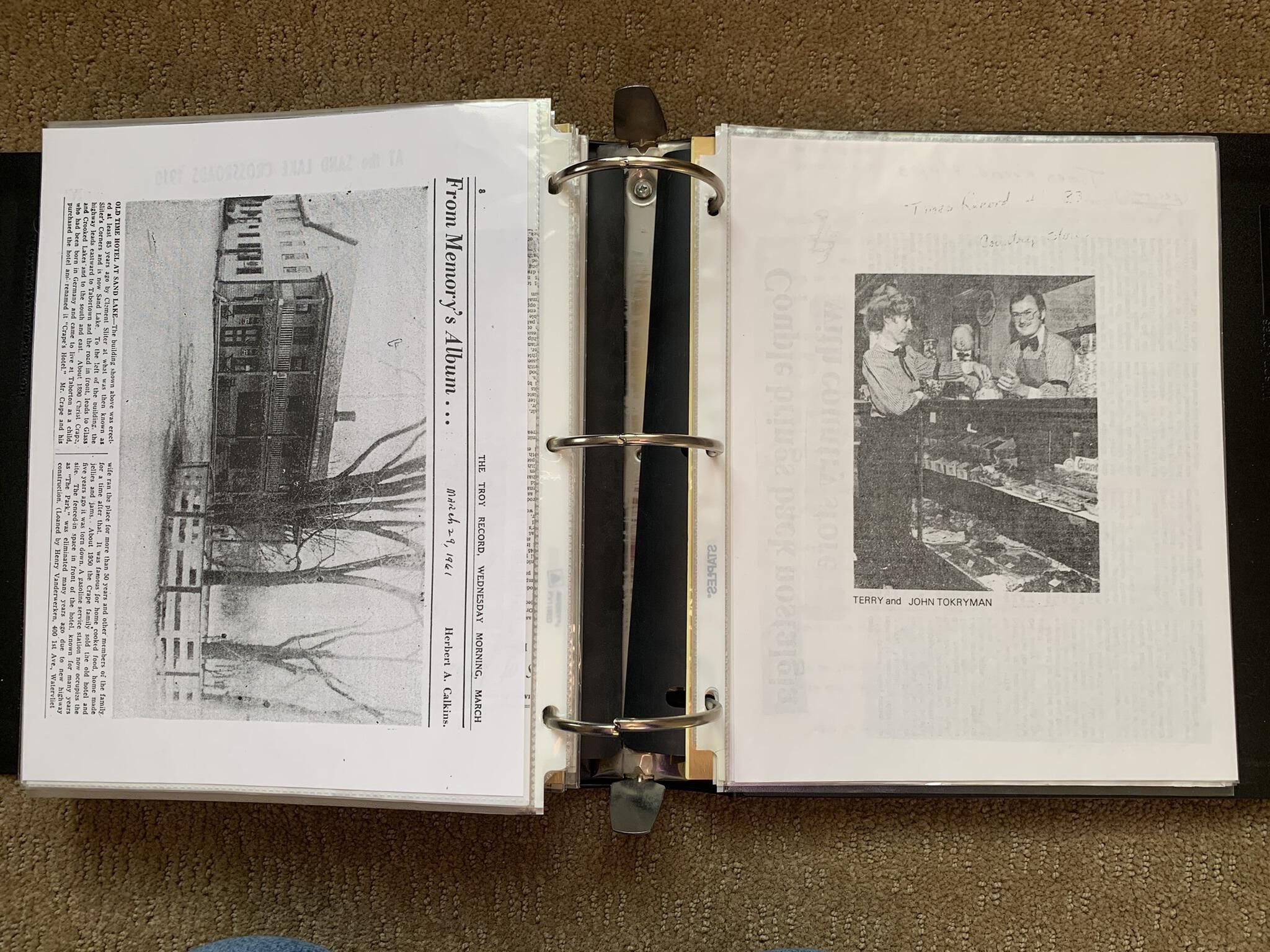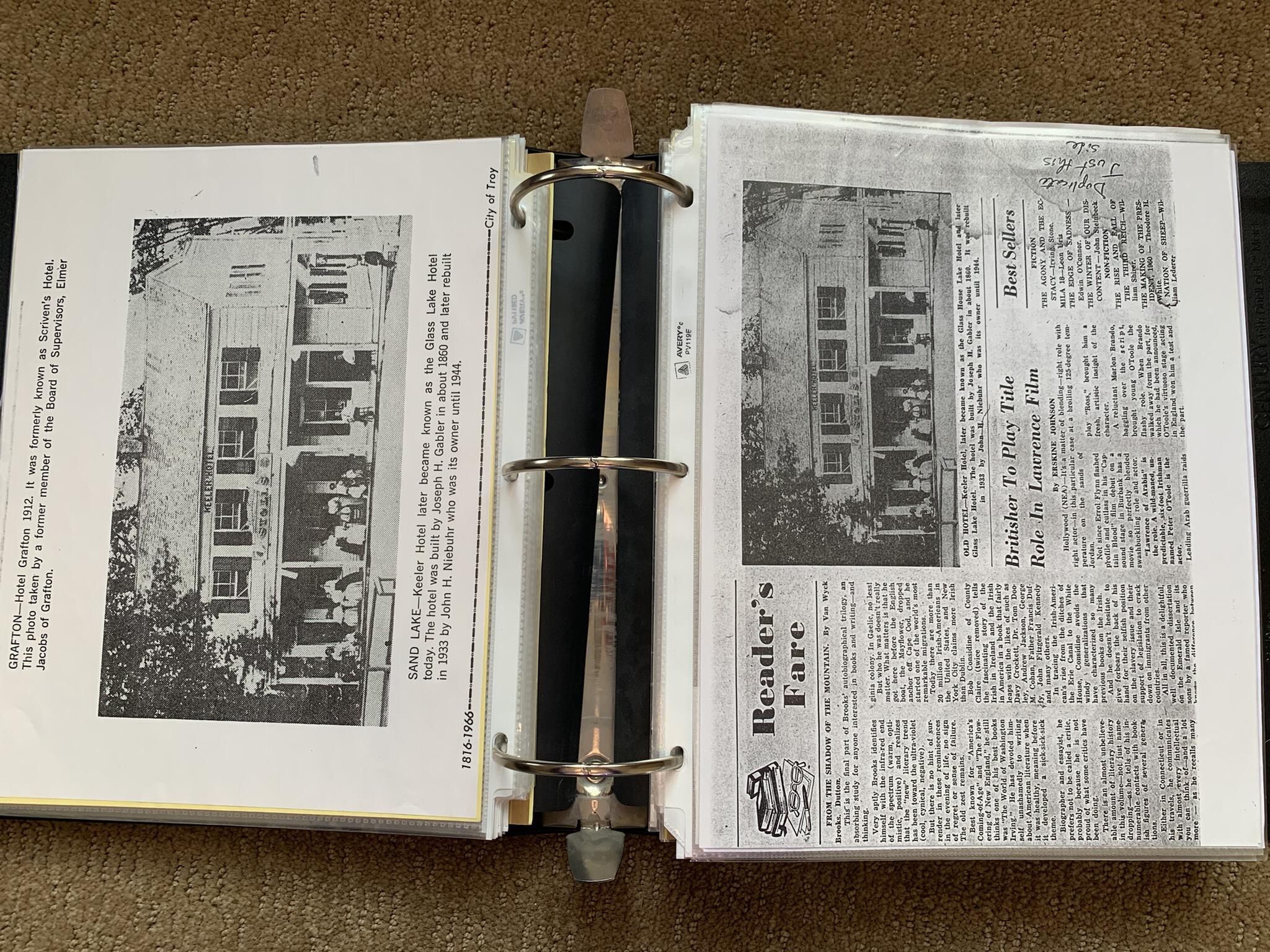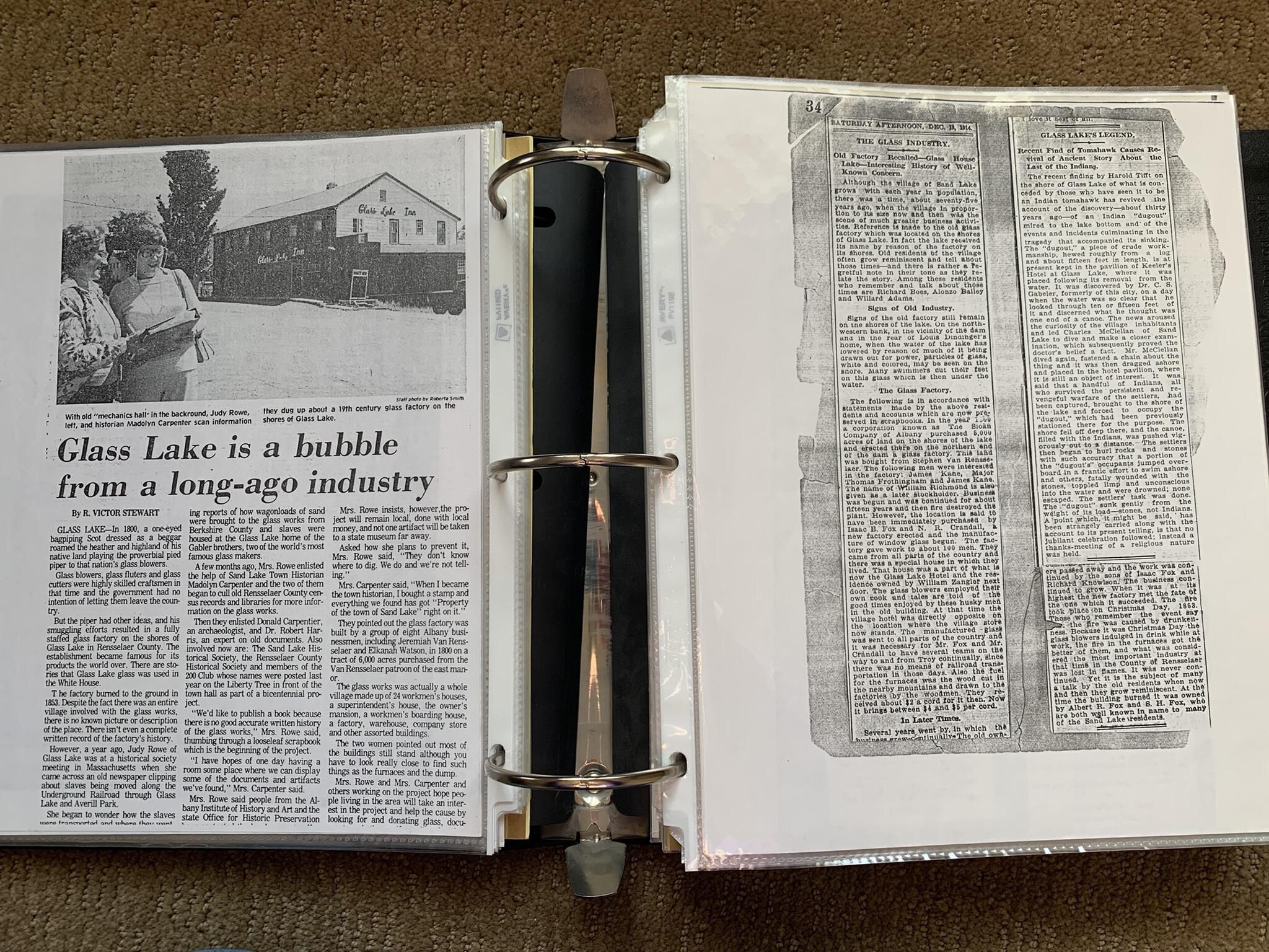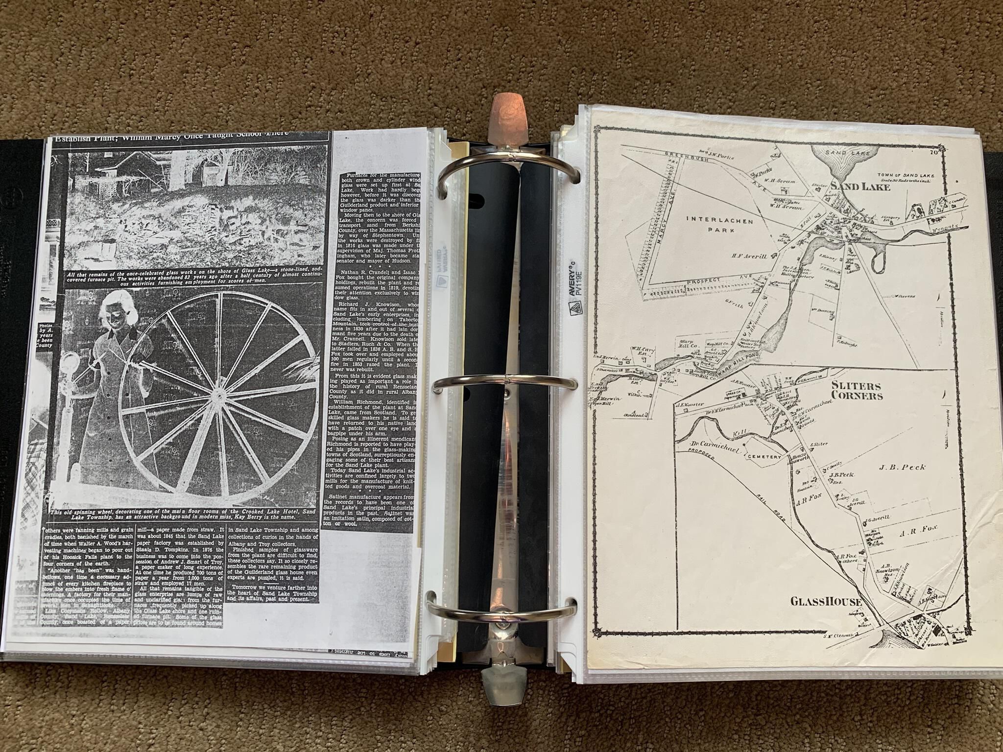 Binder of various newspaper articles, recollections, and memorabilia related to Town of Sand Lake historic hotels (particularly Crooked Lake Hotel), industry (particularly the Rensselaer Glass Factory and charcoal production), homes, churches, and the Sand Lake hamlet of Taborton. Much of the content already appears in other binders or could be obtained from online newspaper archives. Nearly all of the content consists of photocopies of original items. Several multi-page entries have been scanned to PDF and uploaded to the Informal Histories folder of this system as indicated below.Cataloged By