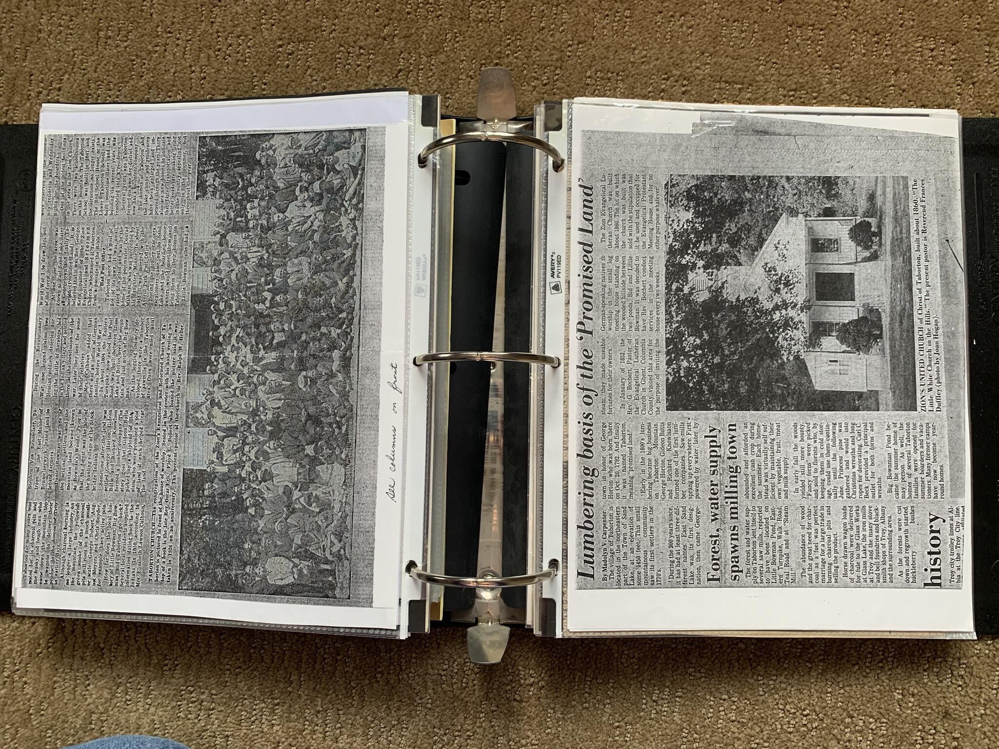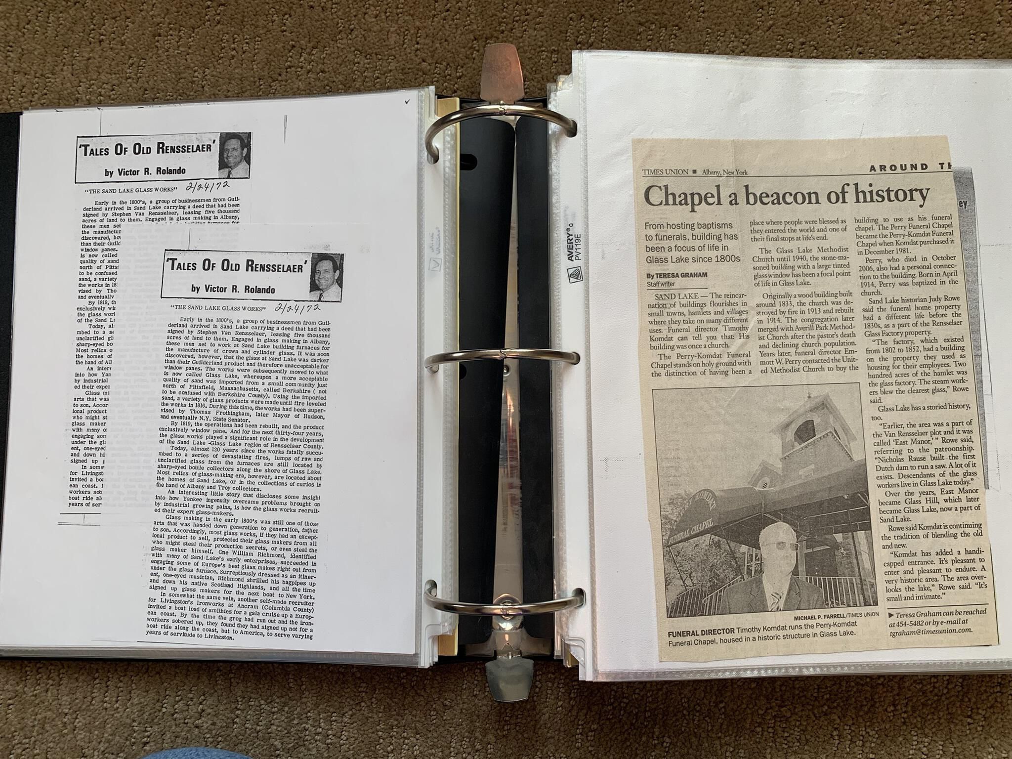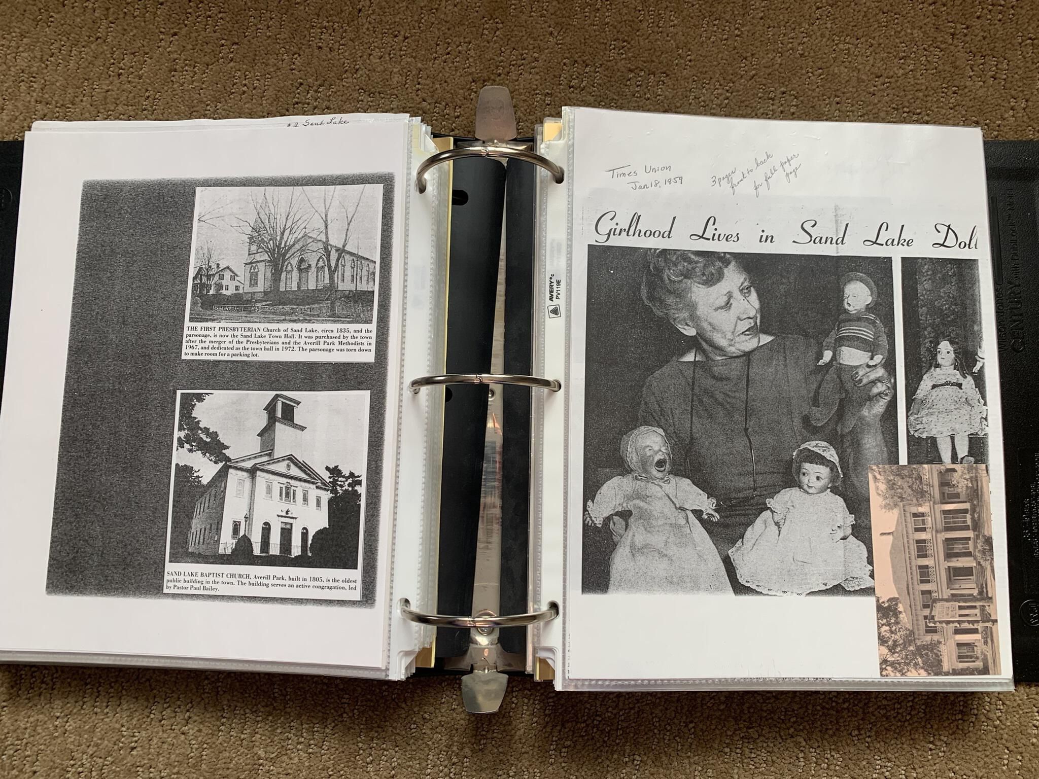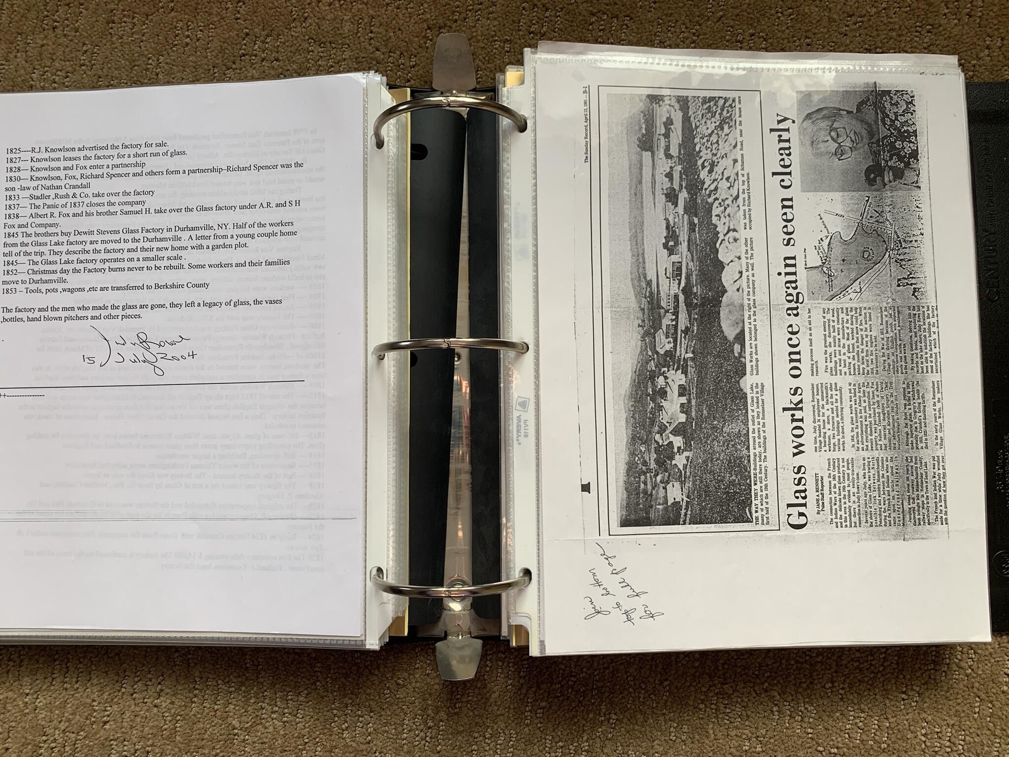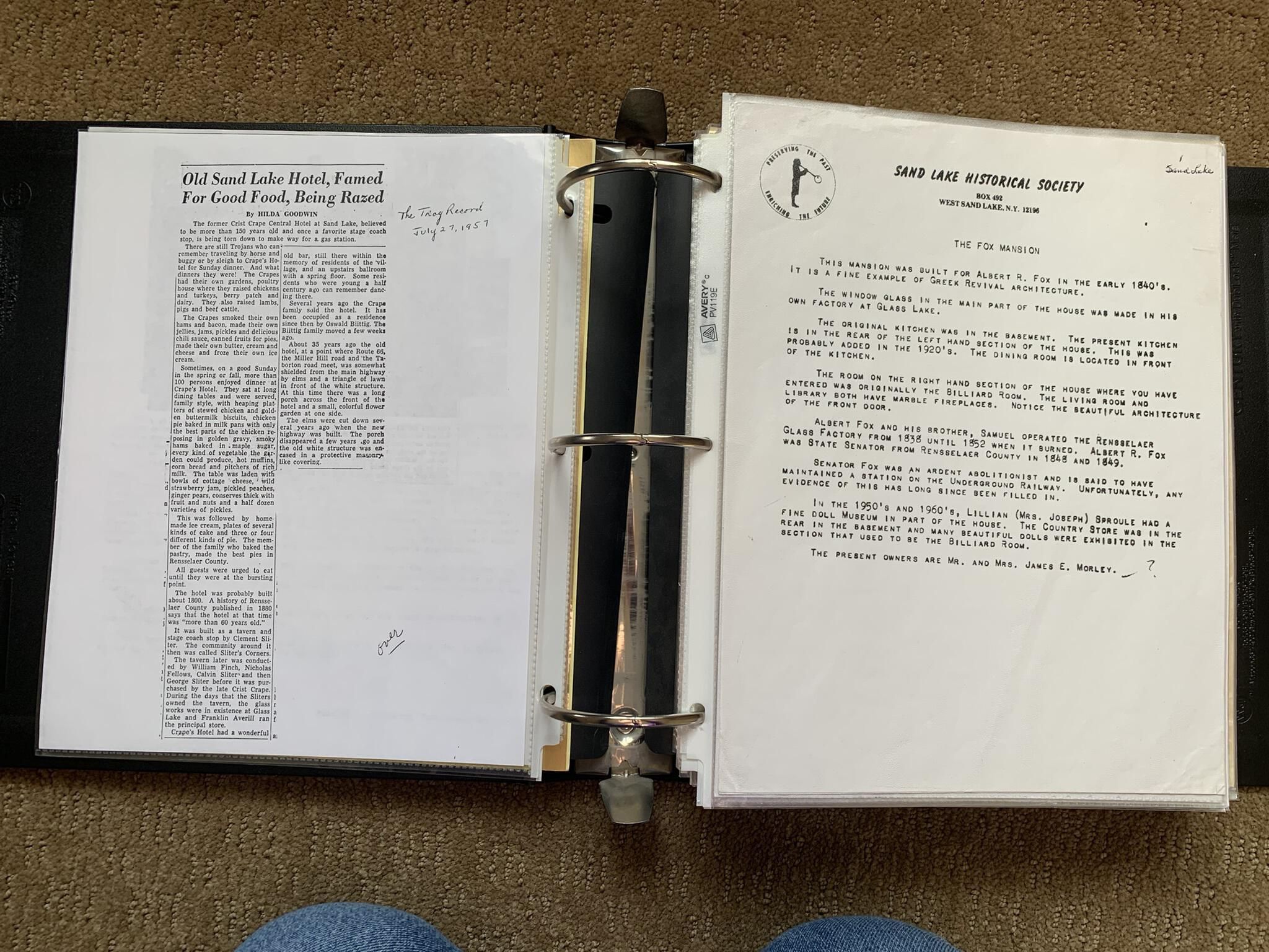 Binder of various newspaper articles, recollections, and memorabilia related to Town of Sand Lake historic hotels (particularly Crooked Lake Hotel), industry (particularly the Rensselaer Glass Factory and charcoal production), homes, churches, and the Sand Lake hamlet of Taborton. Much of the content already appears in other binders or could be obtained from online newspaper archives. Nearly all of the content consists of photocopies of original items. Several multi-page entries have been scanned to PDF and uploaded to the Informal Histories folder of this system as indicated below.Cataloged By