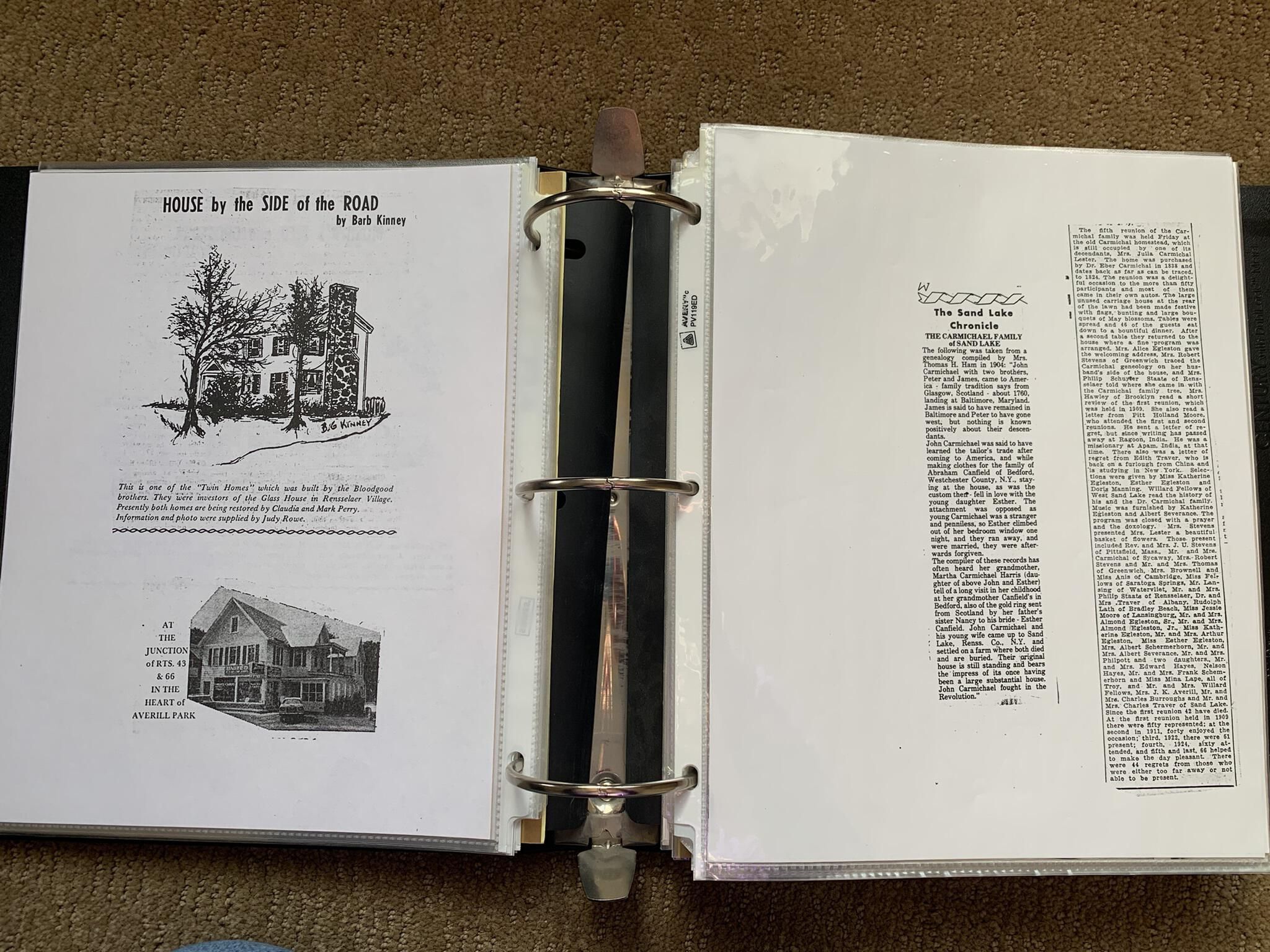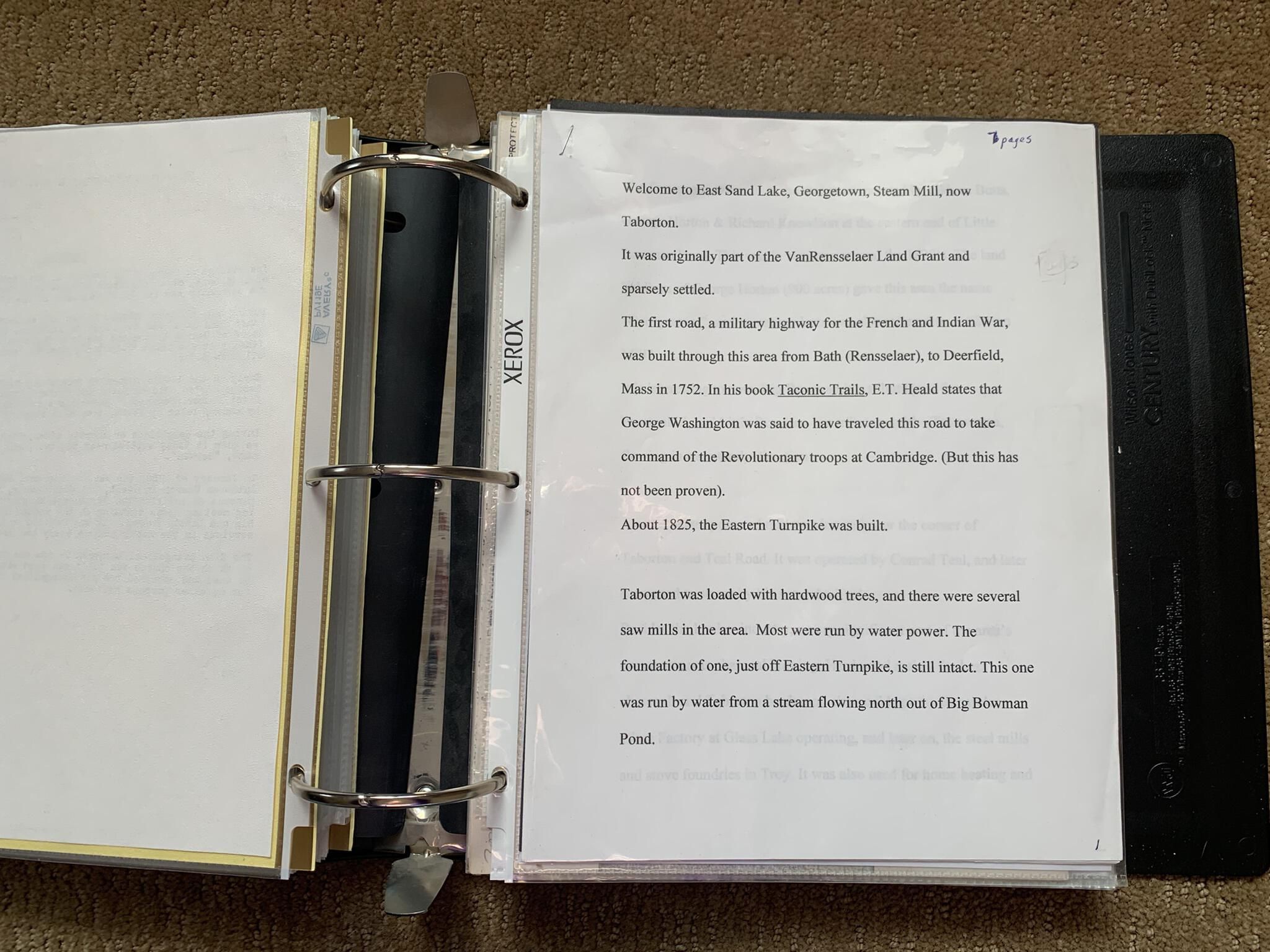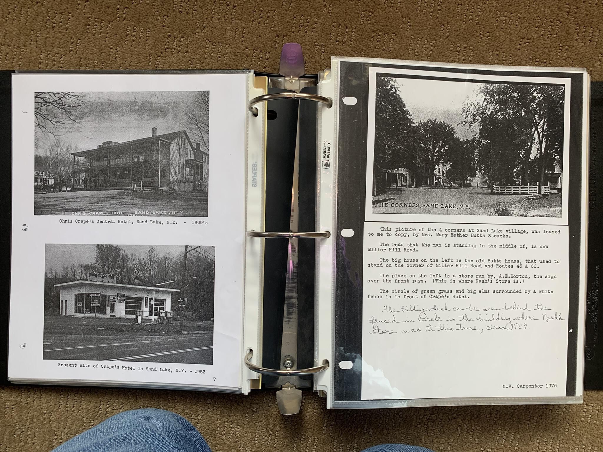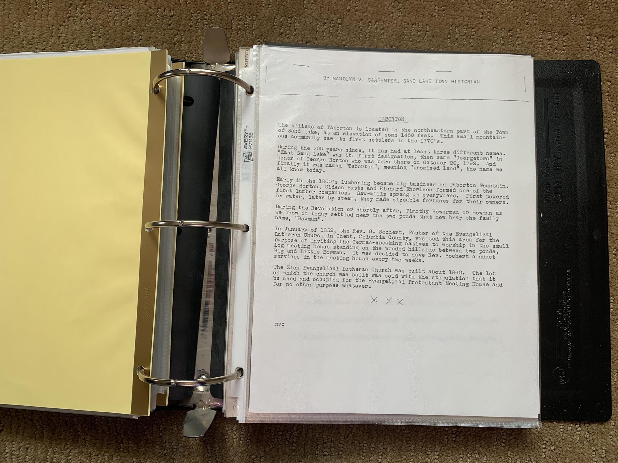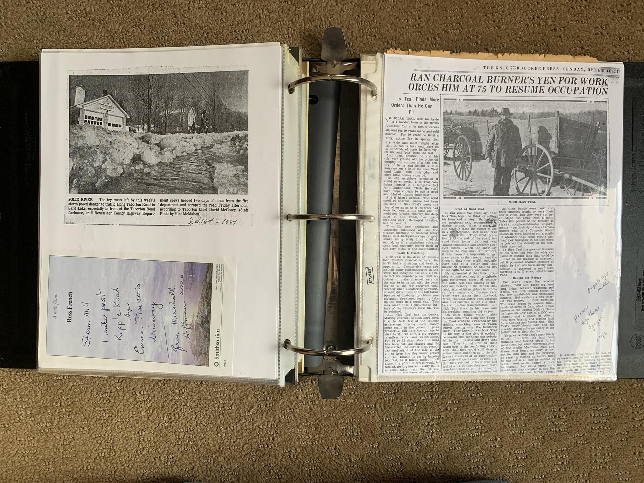 Binder of various newspaper articles, recollections, and memorabilia related to Town of Sand Lake historic hotels (particularly Crooked Lake Hotel), industry (particularly the Rensselaer Glass Factory and charcoal production), homes, churches, and the Sand Lake hamlet of Taborton. Much of the content already appears in other binders or could be obtained from online newspaper archives. Nearly all of the content consists of photocopies of original items. Several multi-page entries have been scanned to PDF and uploaded to the Informal Histories folder of this system as indicated below.Cataloged By