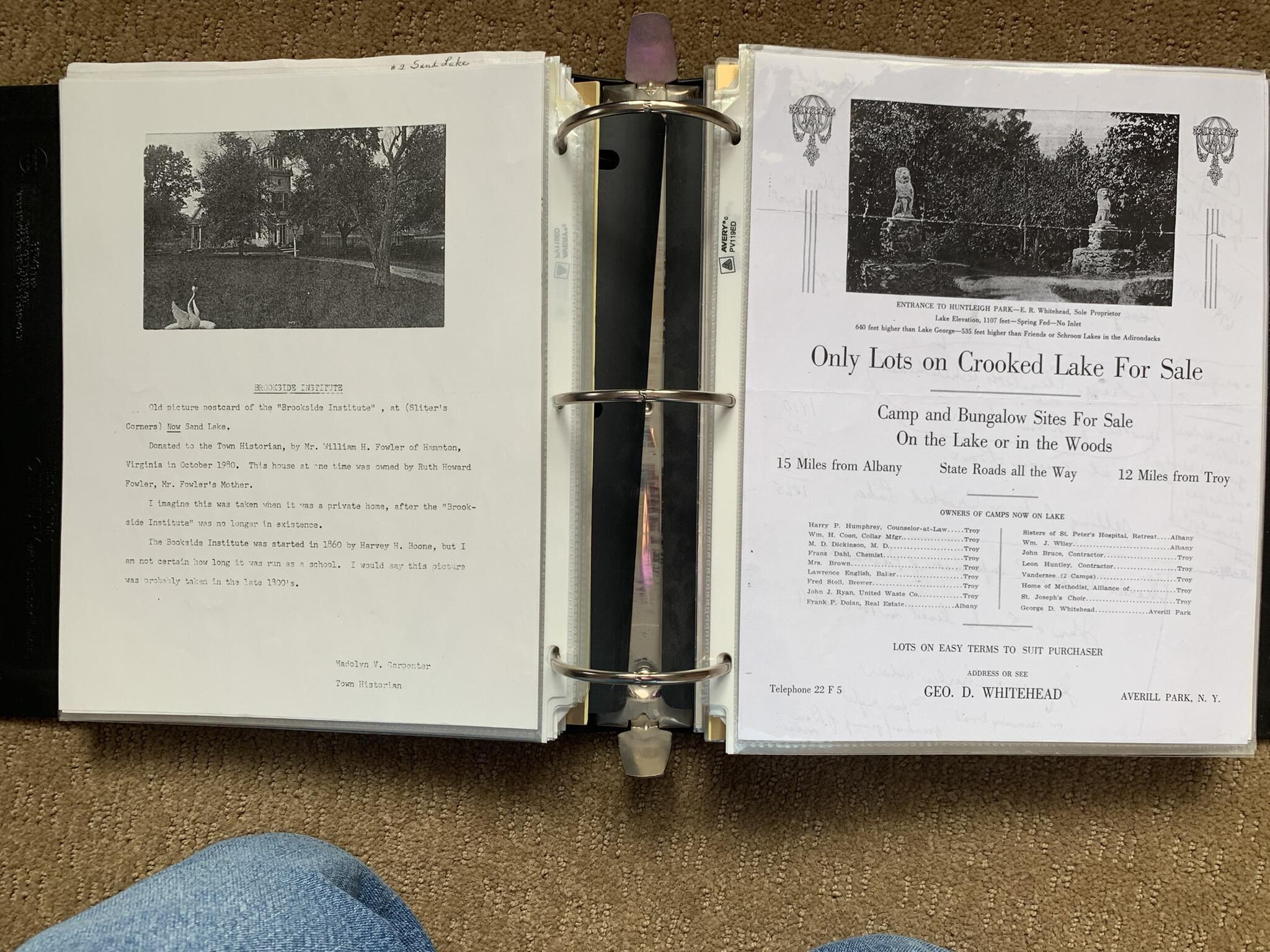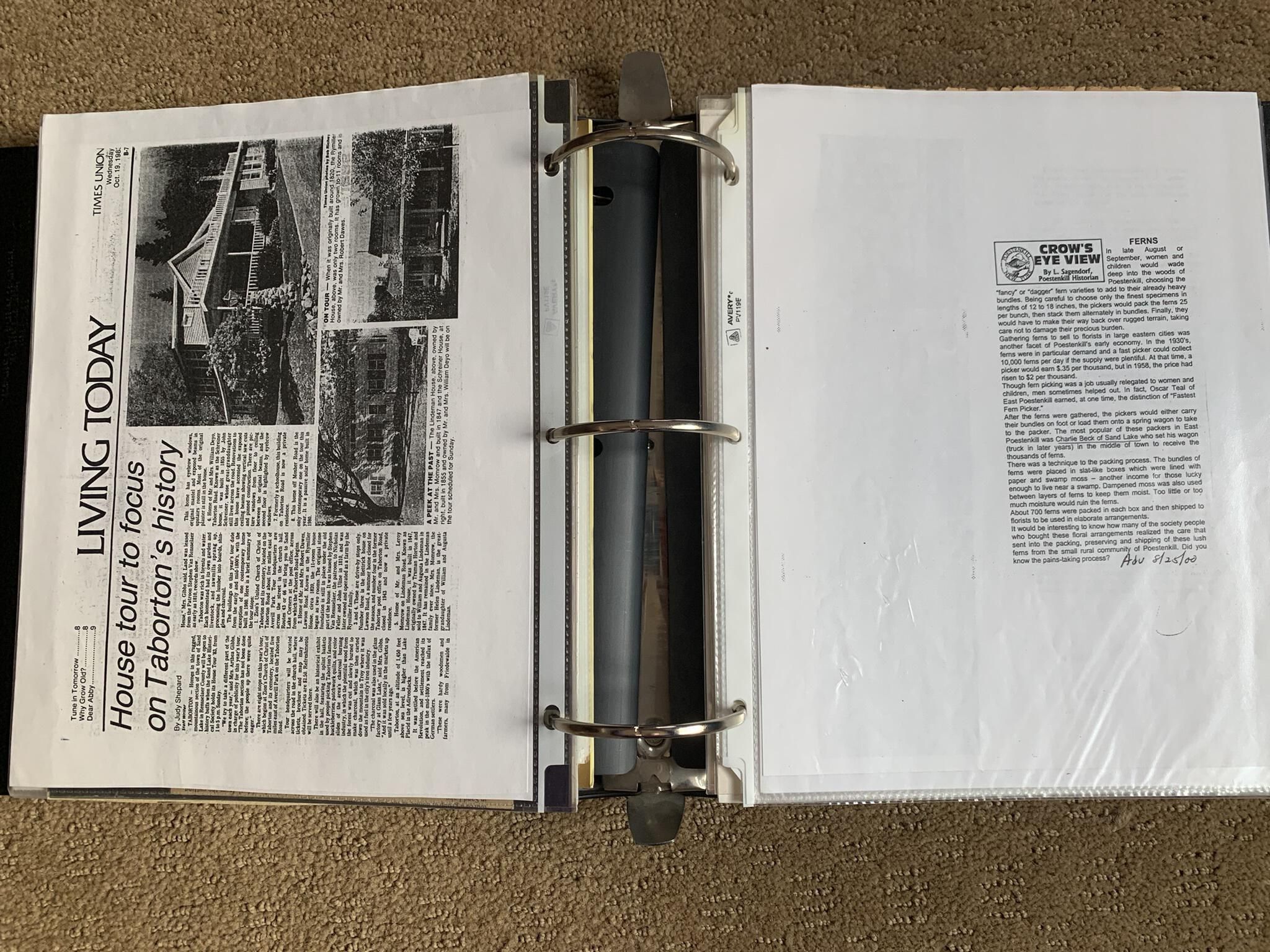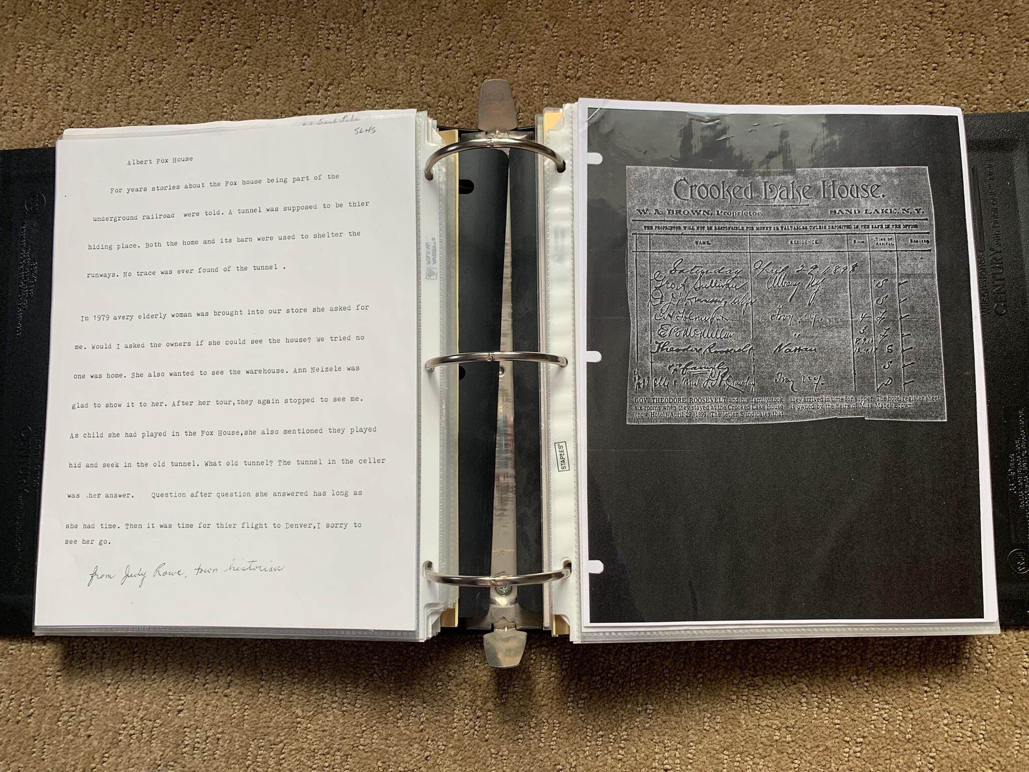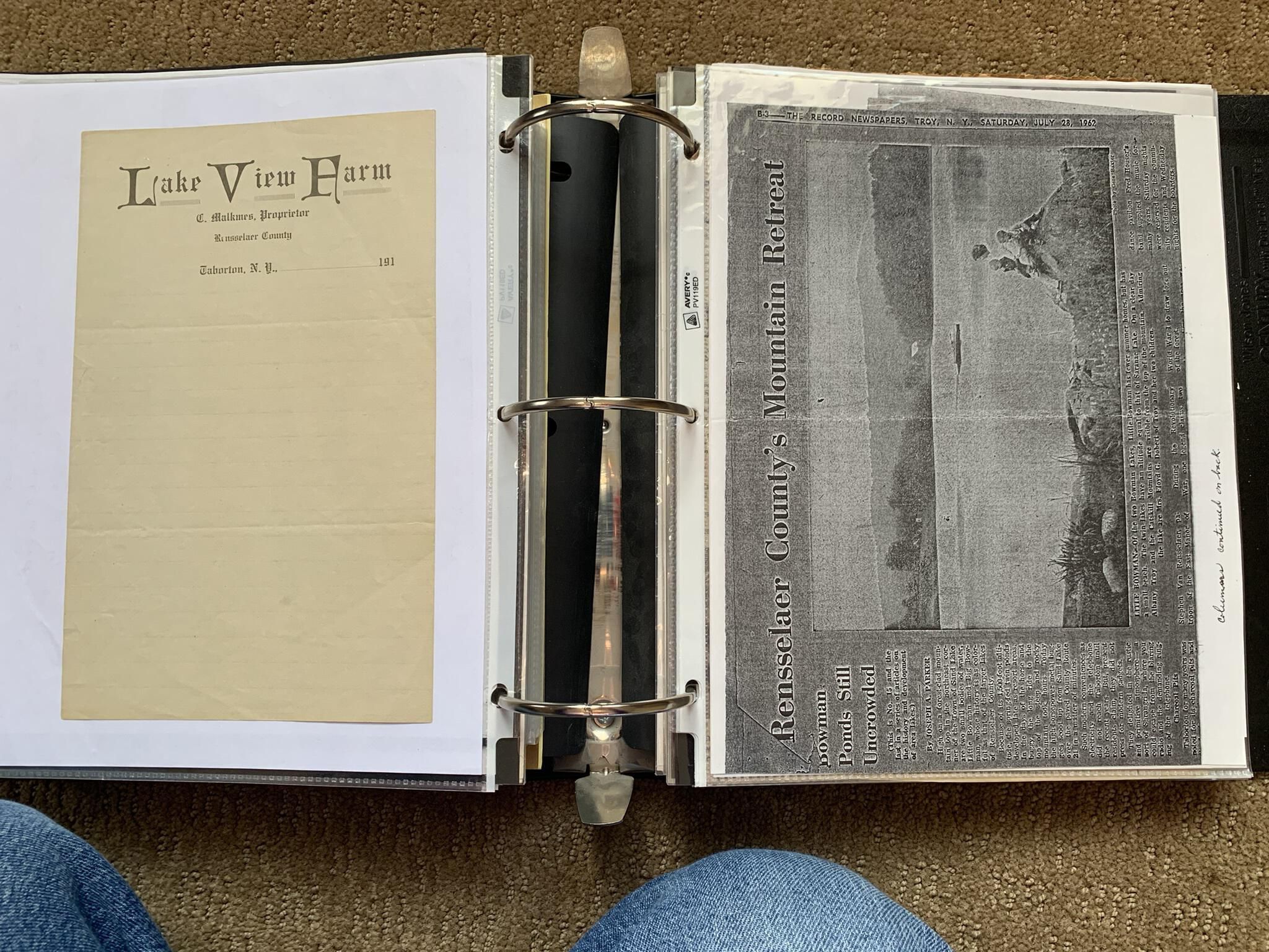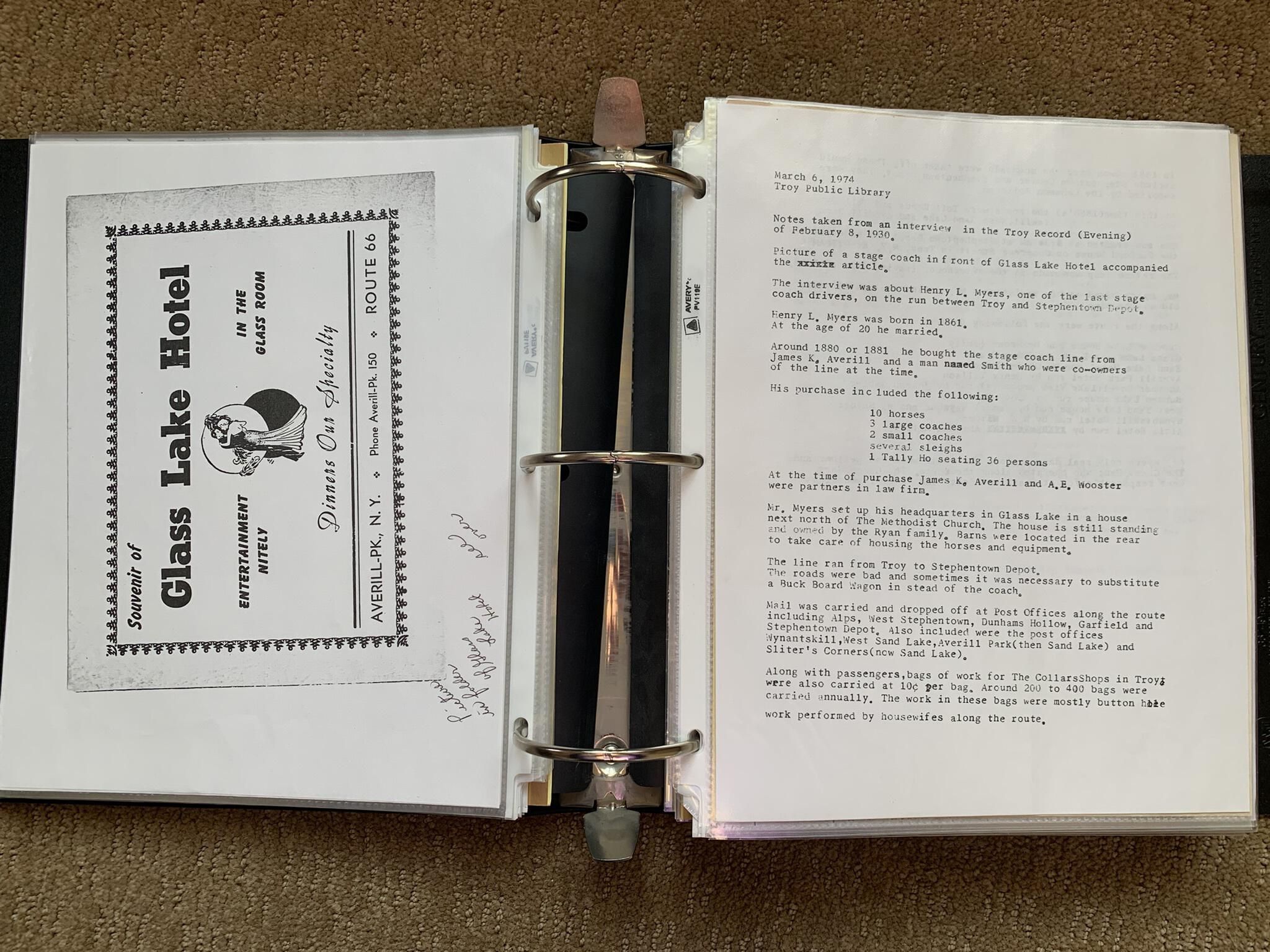 Binder of various newspaper articles, recollections, and memorabilia related to Town of Sand Lake historic hotels (particularly Crooked Lake Hotel), industry (particularly the Rensselaer Glass Factory and charcoal production), homes, churches, and the Sand Lake hamlet of Taborton. Much of the content already appears in other binders or could be obtained from online newspaper archives. Nearly all of the content consists of photocopies of original items. Several multi-page entries have been scanned to PDF and uploaded to the Informal Histories folder of this system as indicated below.Cataloged By