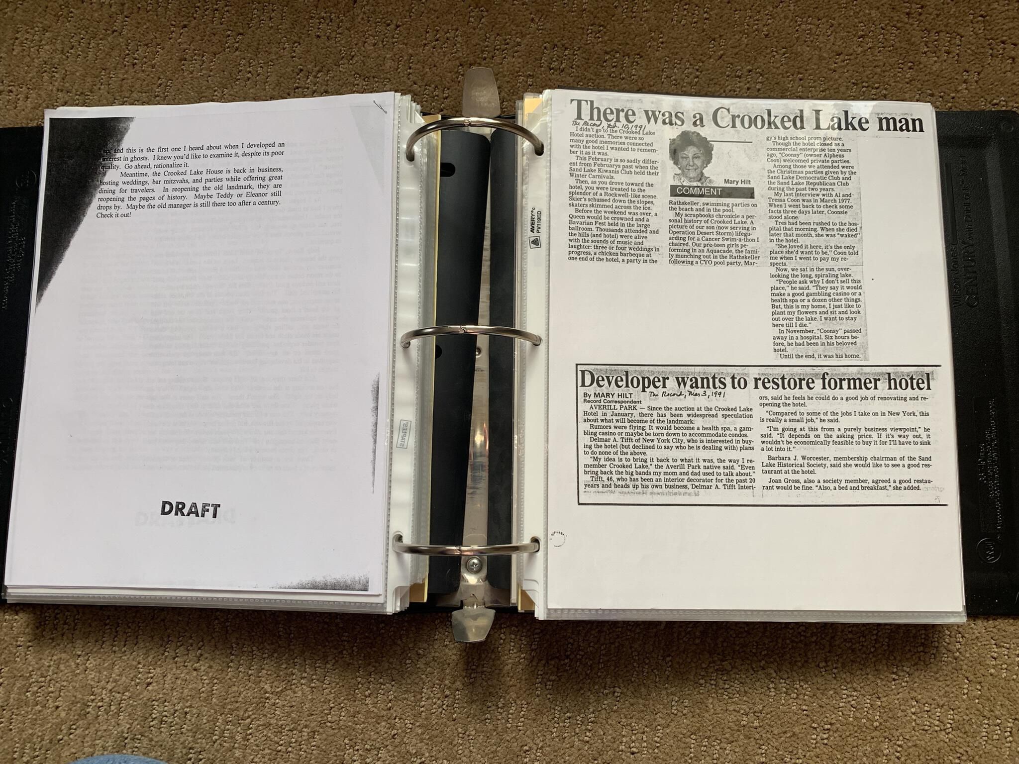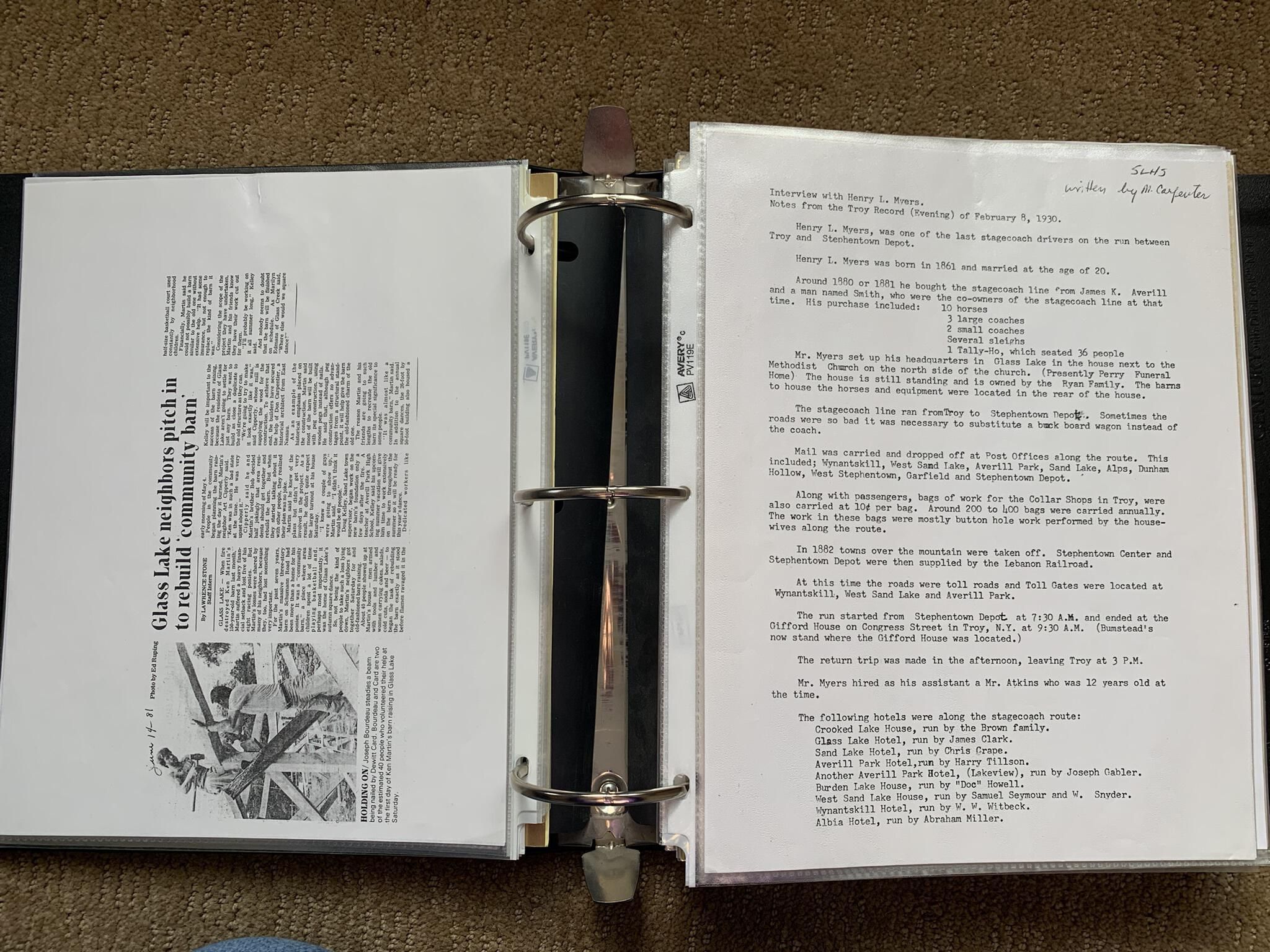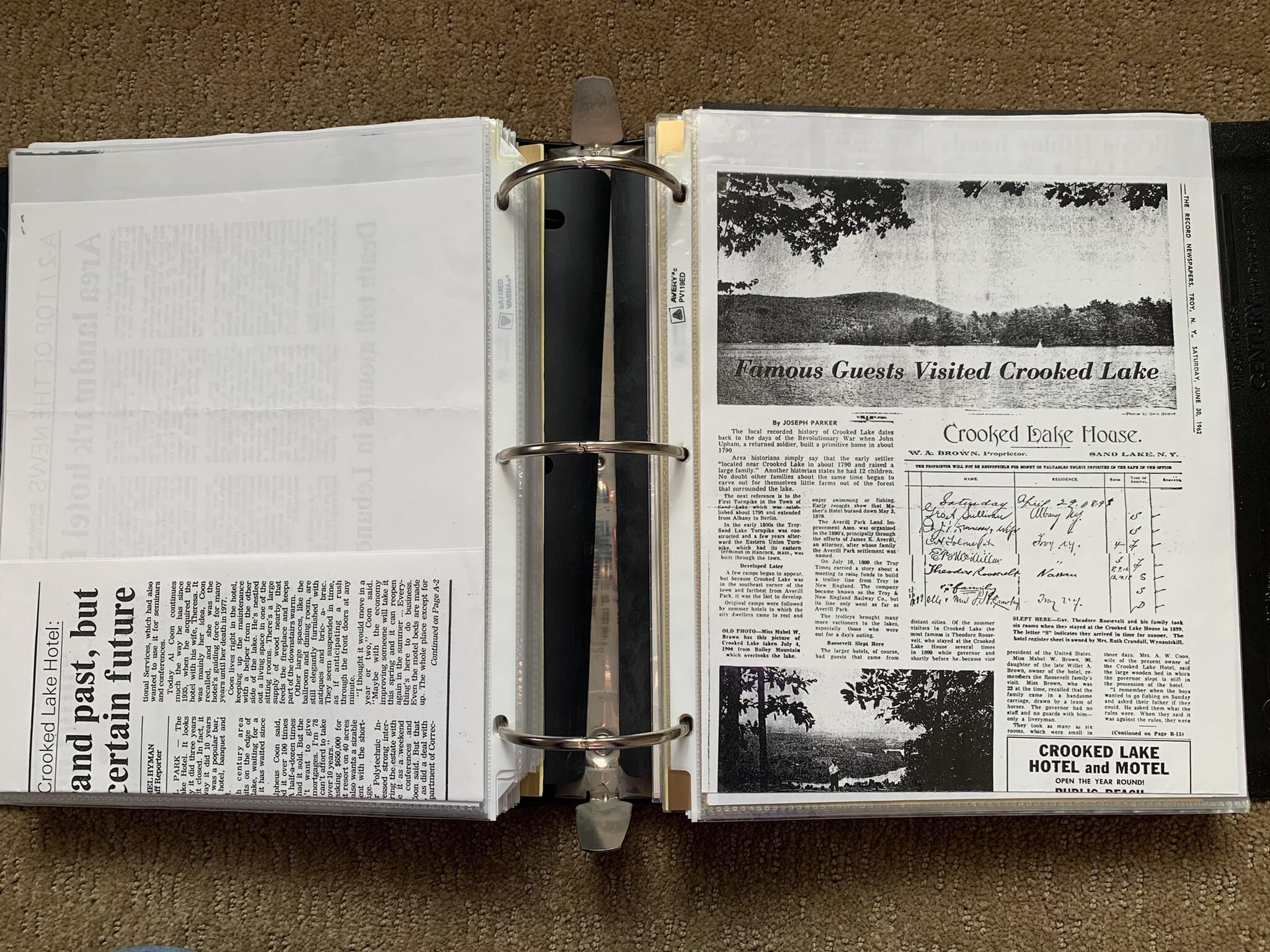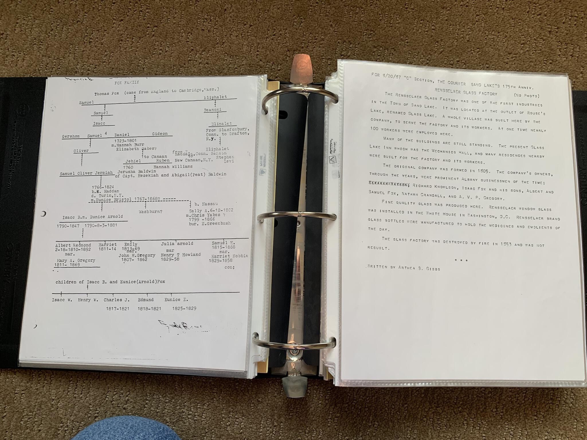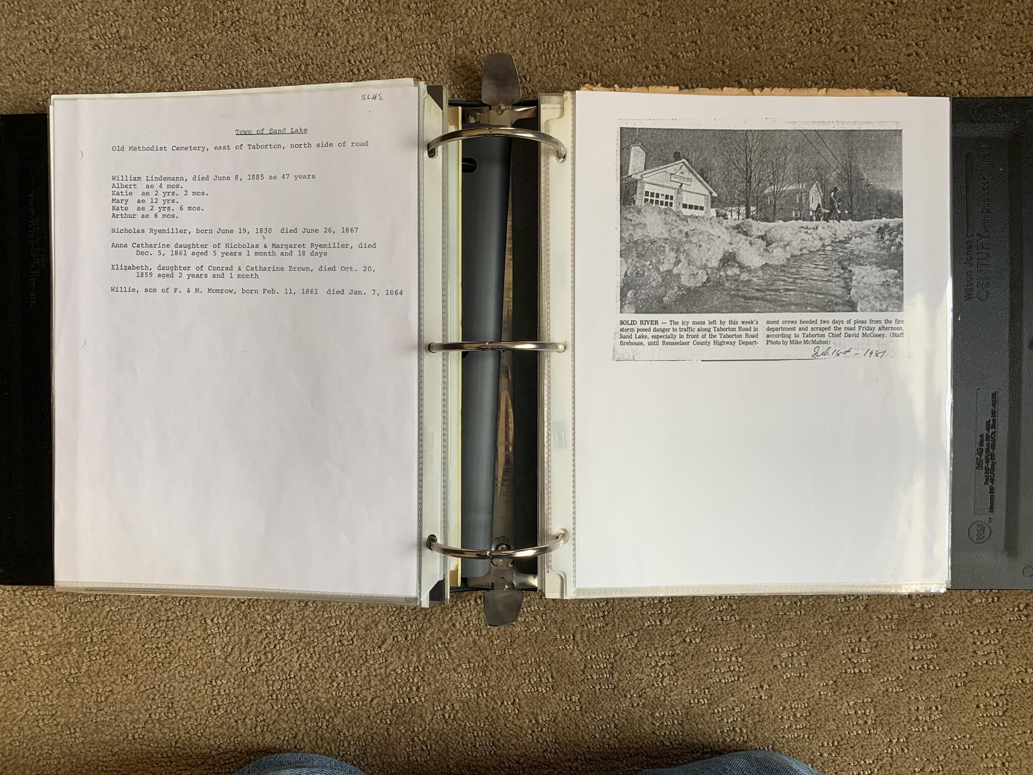 Binder of various newspaper articles, recollections, and memorabilia related to Town of Sand Lake historic hotels (particularly Crooked Lake Hotel), industry (particularly the Rensselaer Glass Factory and charcoal production), homes, churches, and the Sand Lake hamlet of Taborton. Much of the content already appears in other binders or could be obtained from online newspaper archives. Nearly all of the content consists of photocopies of original items. Several multi-page entries have been scanned to PDF and uploaded to the Informal Histories folder of this system as indicated below.Cataloged By