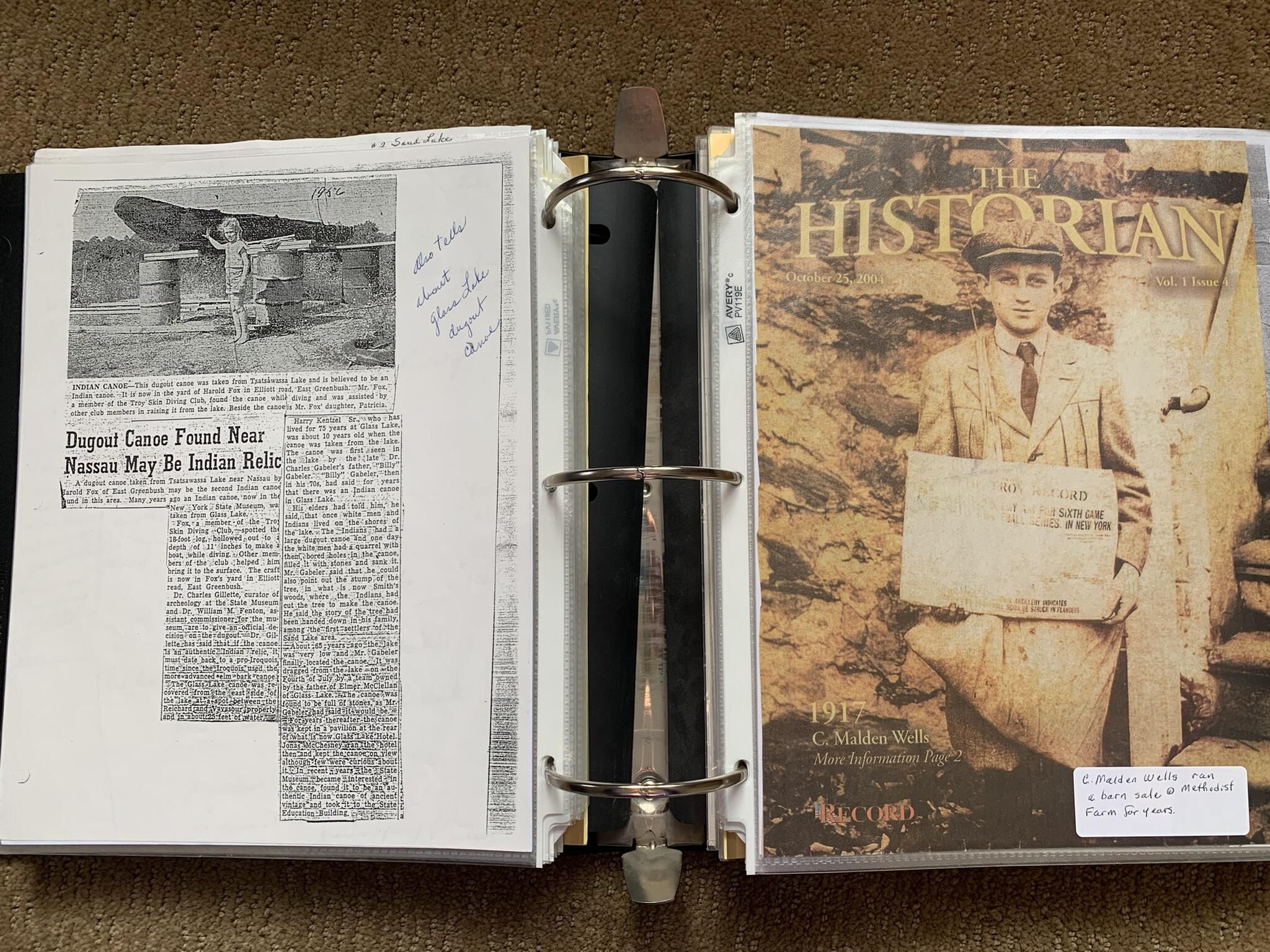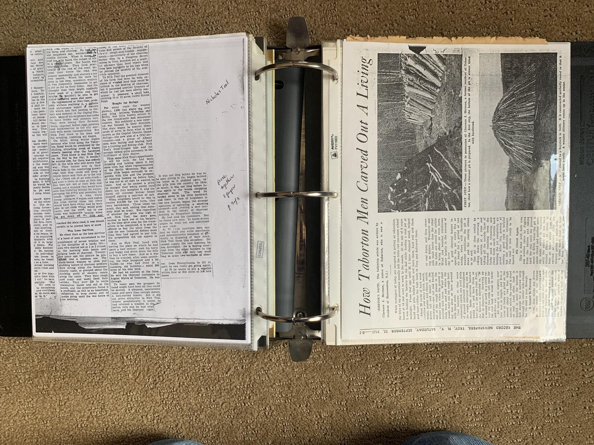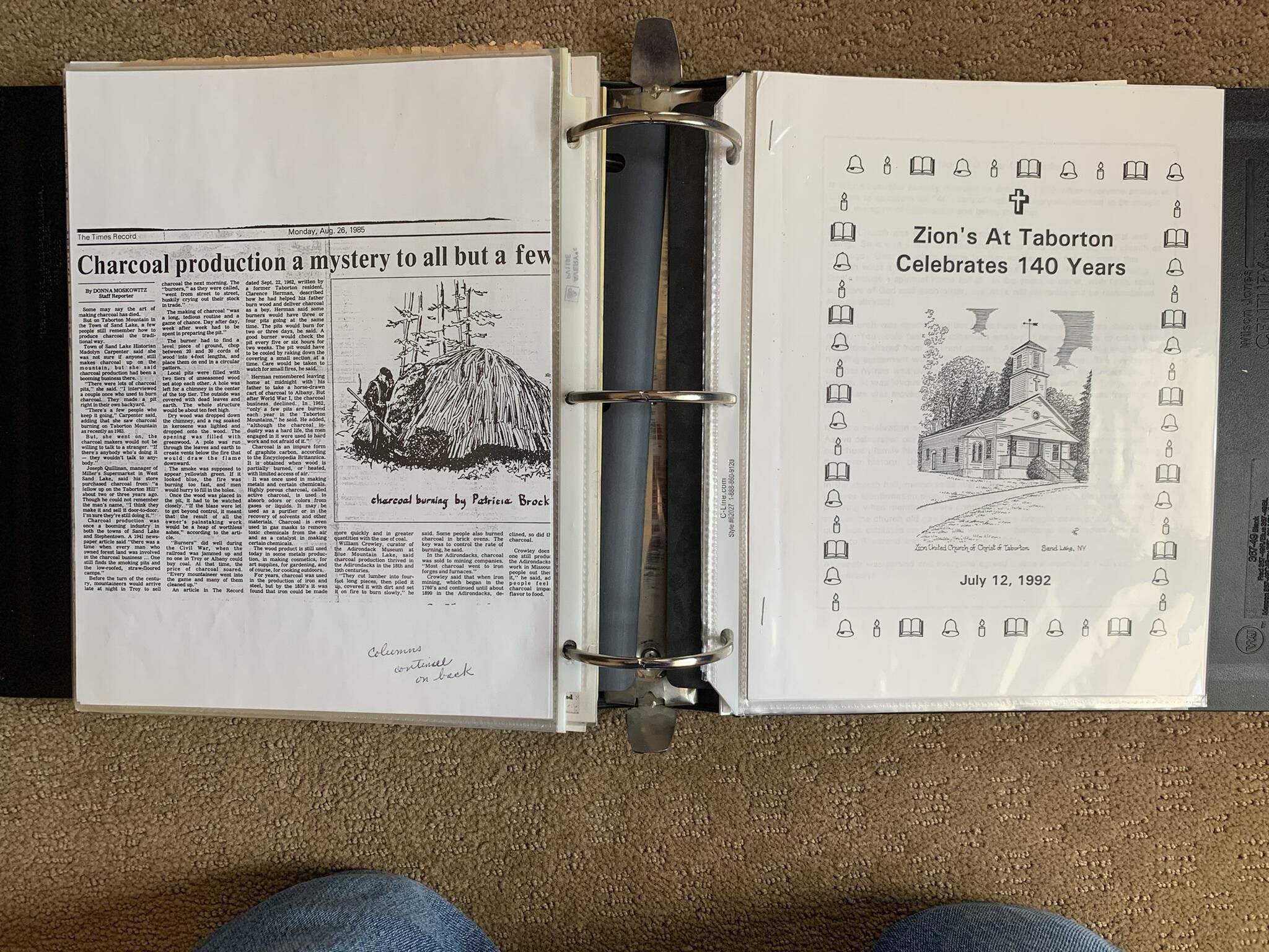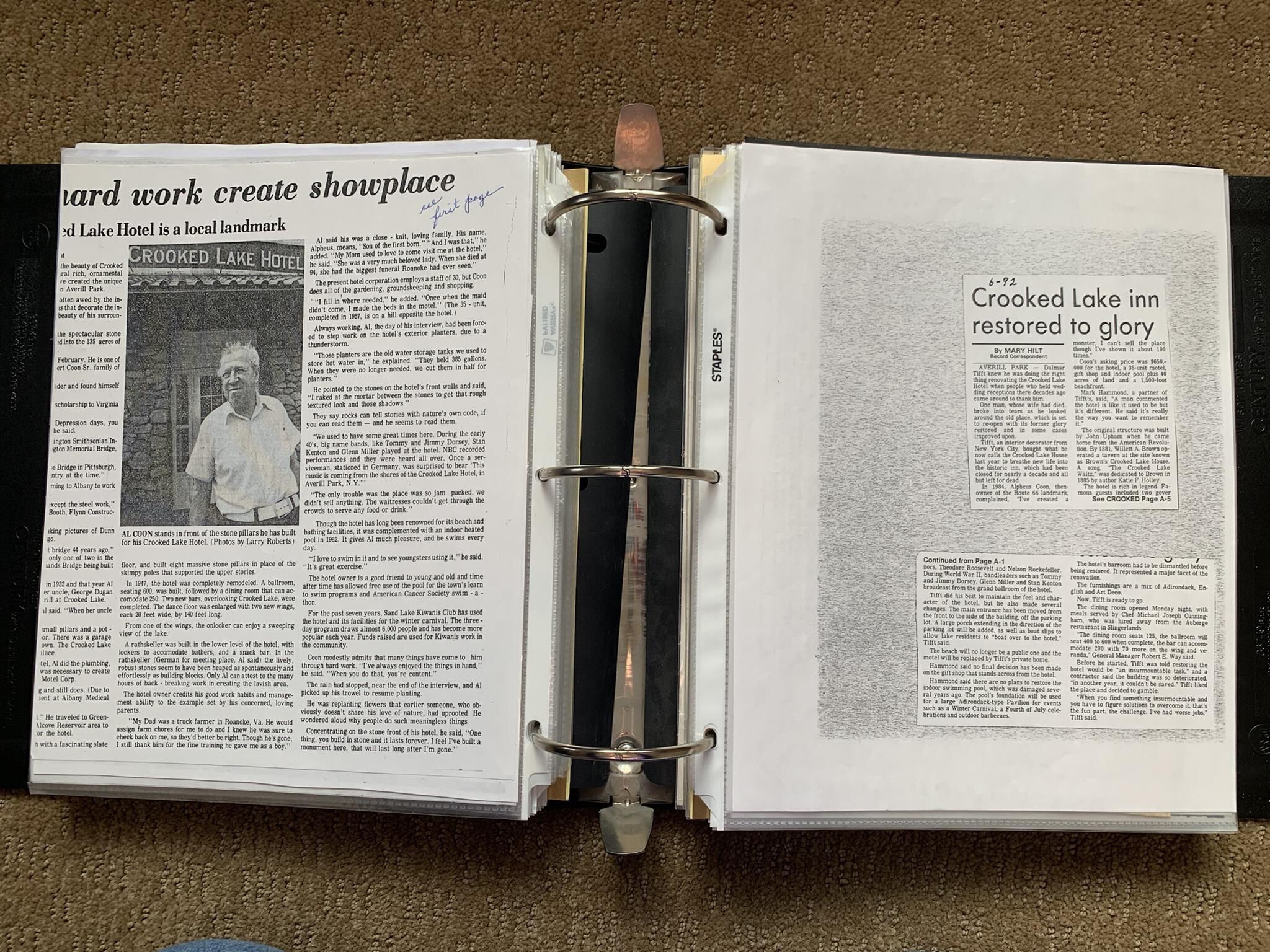 Binder of various newspaper articles, recollections, and memorabilia related to Town of Sand Lake historic hotels (particularly Crooked Lake Hotel), industry (particularly the Rensselaer Glass Factory and charcoal production), homes, churches, and the Sand Lake hamlet of Taborton. Much of the content already appears in other binders or could be obtained from online newspaper archives. Nearly all of the content consists of photocopies of original items. Several multi-page entries have been scanned to PDF and uploaded to the Informal Histories folder of this system as indicated below.Cataloged By