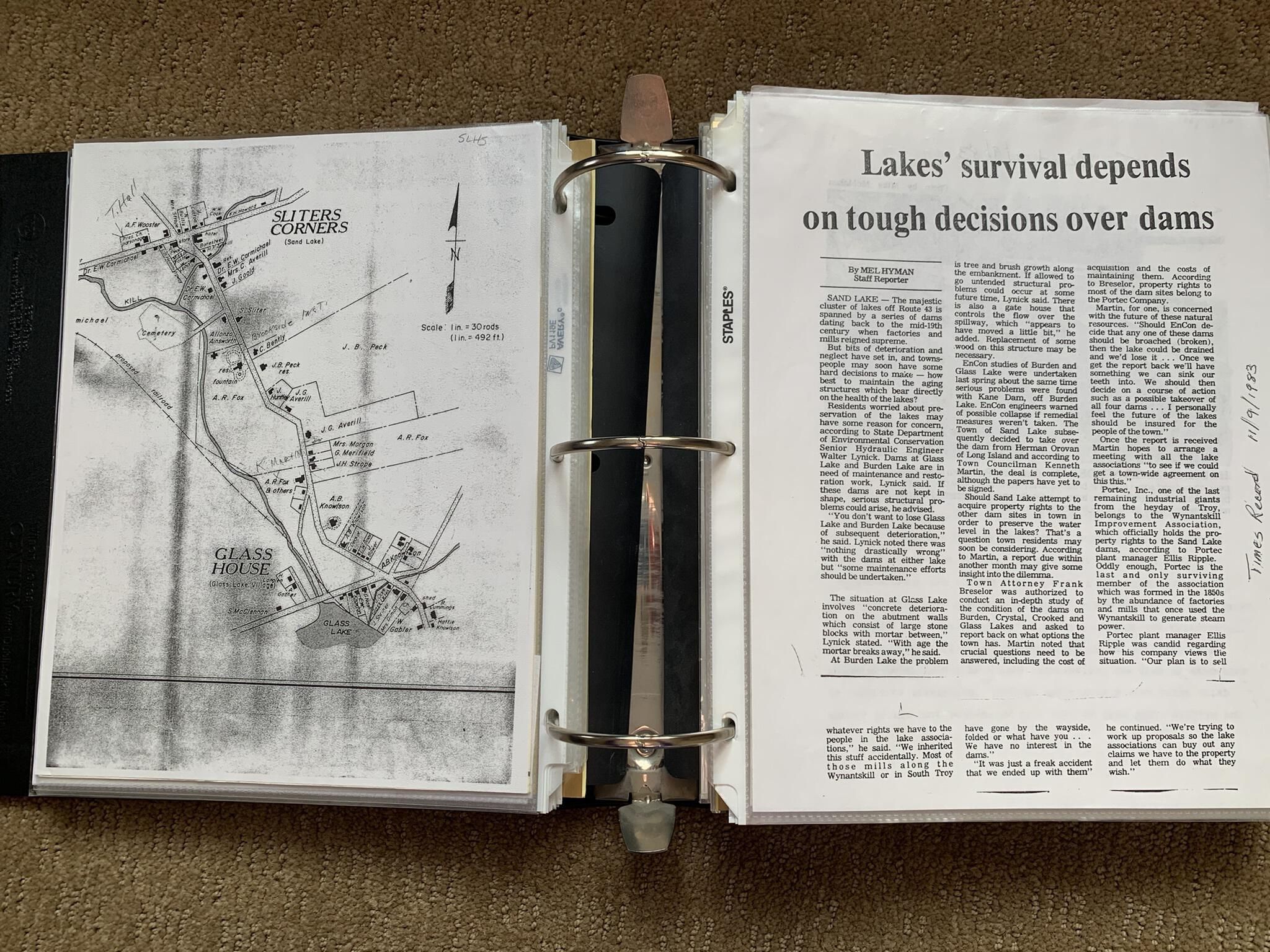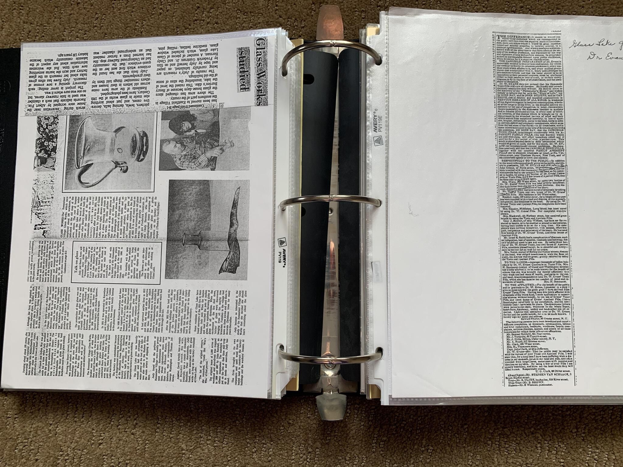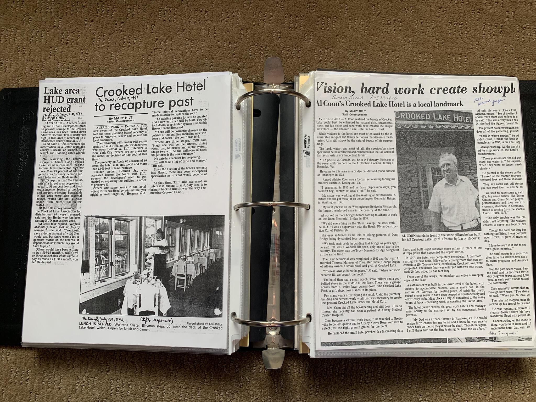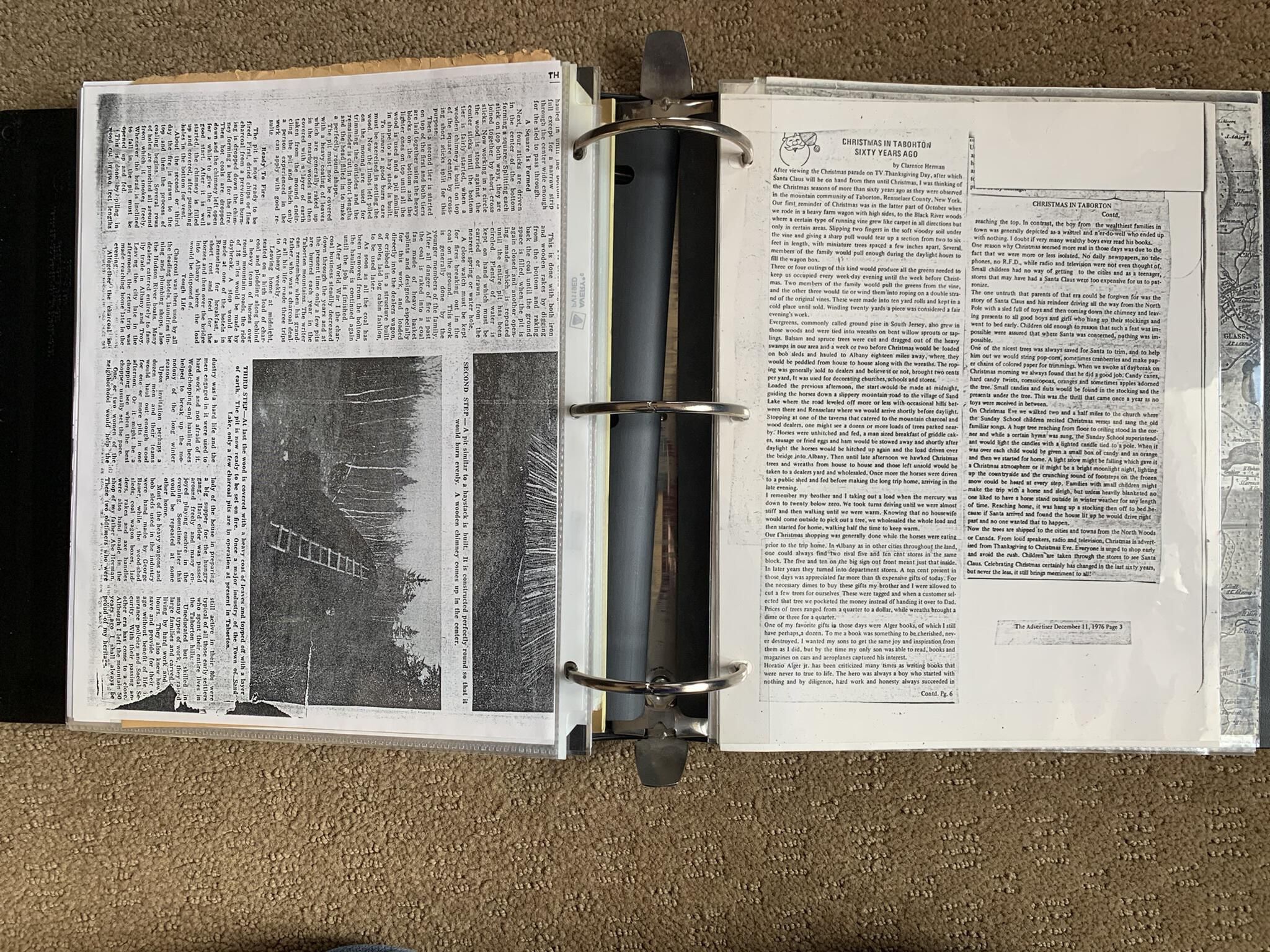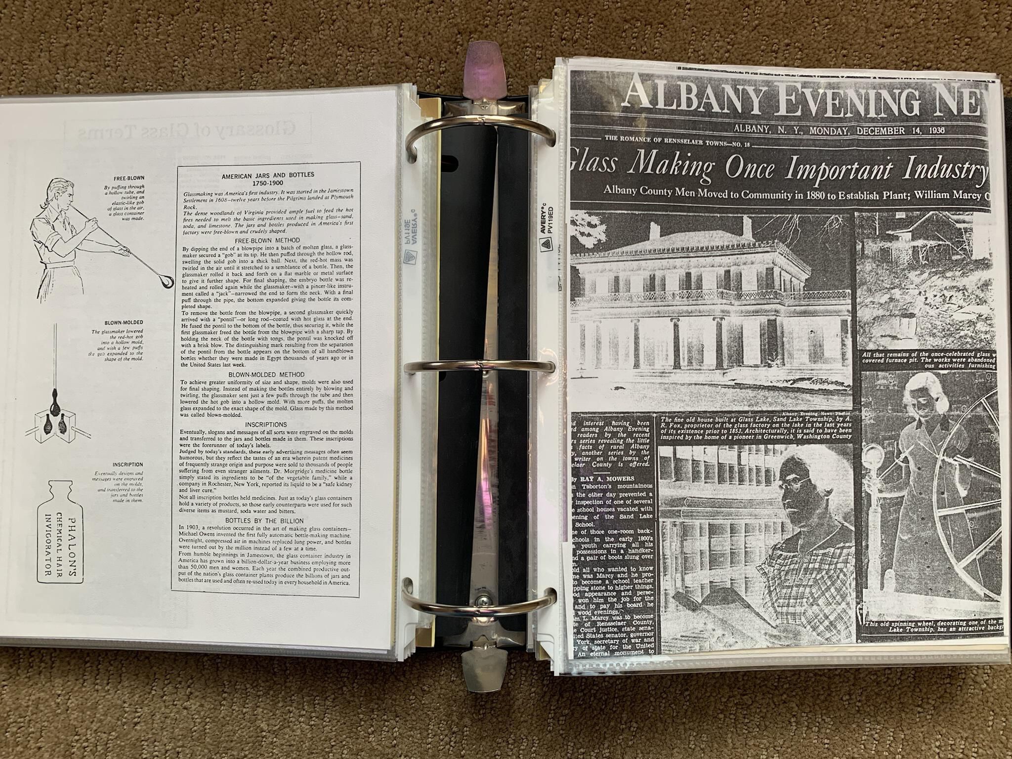Binder of various newspaper articles, recollections, and memorabilia related to Town of Sand Lake historic hotels (particularly Crooked Lake Hotel), industry (particularly the Rensselaer Glass Factory and charcoal production), homes, churches, and the Sand Lake hamlet of Taborton. Much of the content already appears in other binders or could be obtained from online newspaper archives. Nearly all of the content consists of photocopies of original items. Several multi-page entries have been scanned to PDF and uploaded to the Informal Histories folder of this system as indicated below.Cataloged By