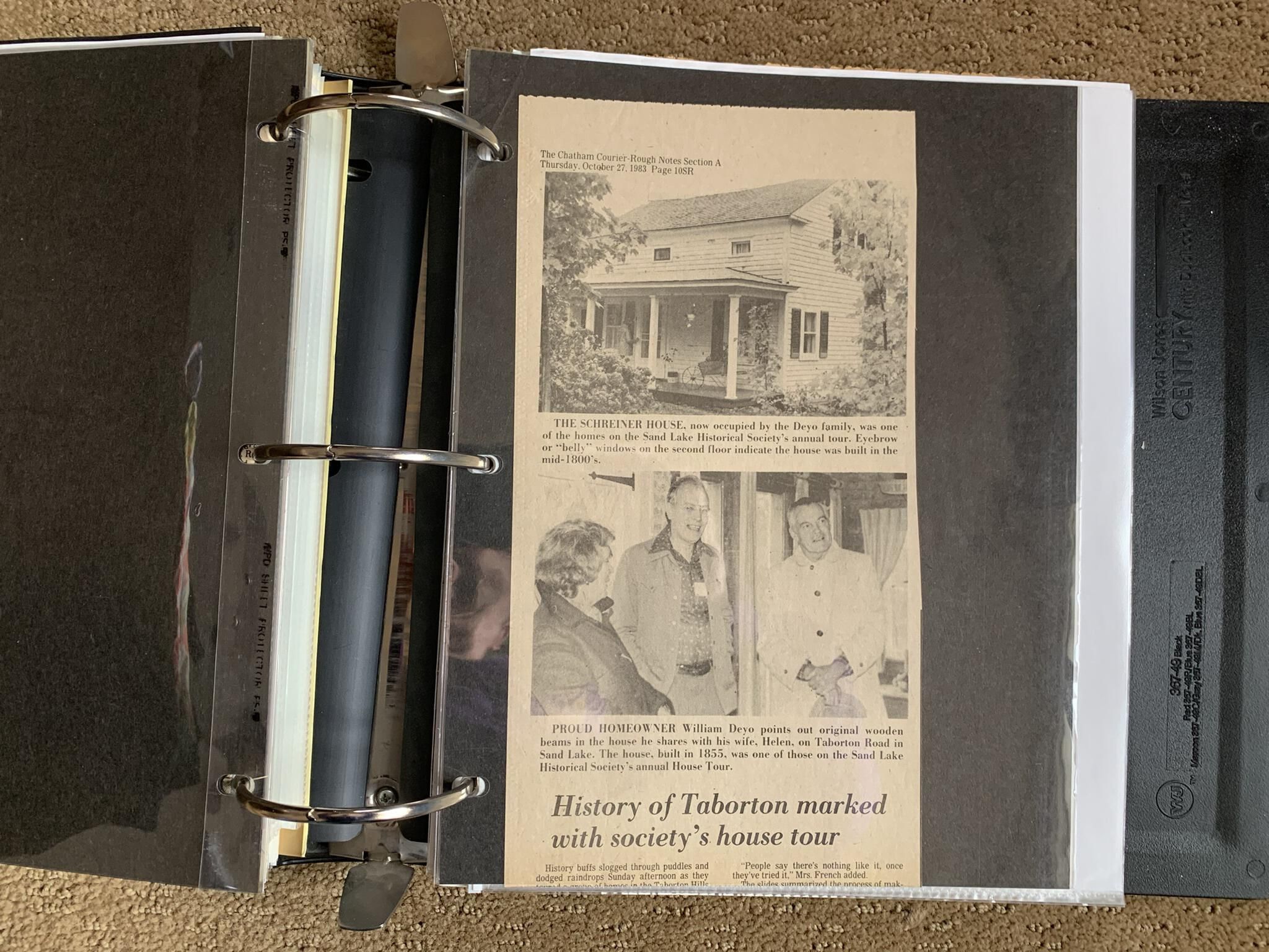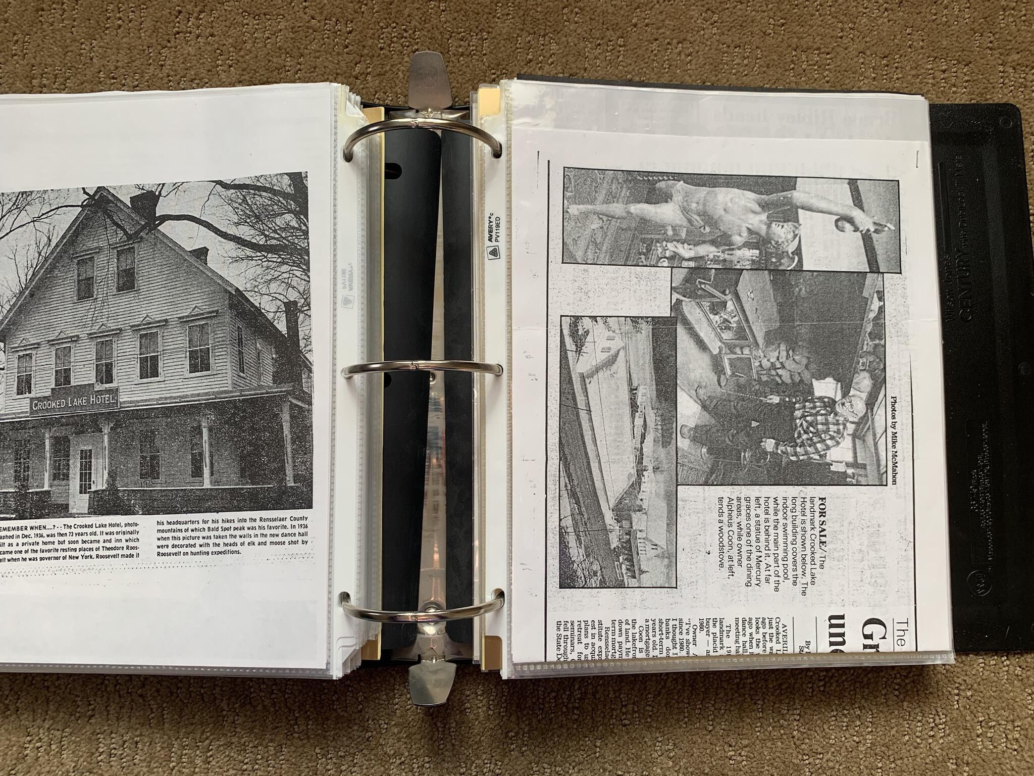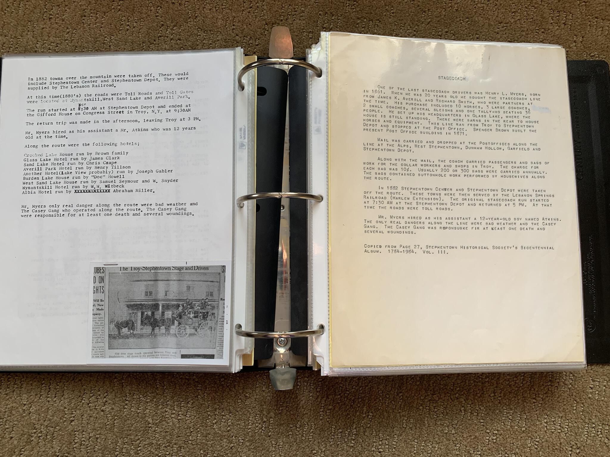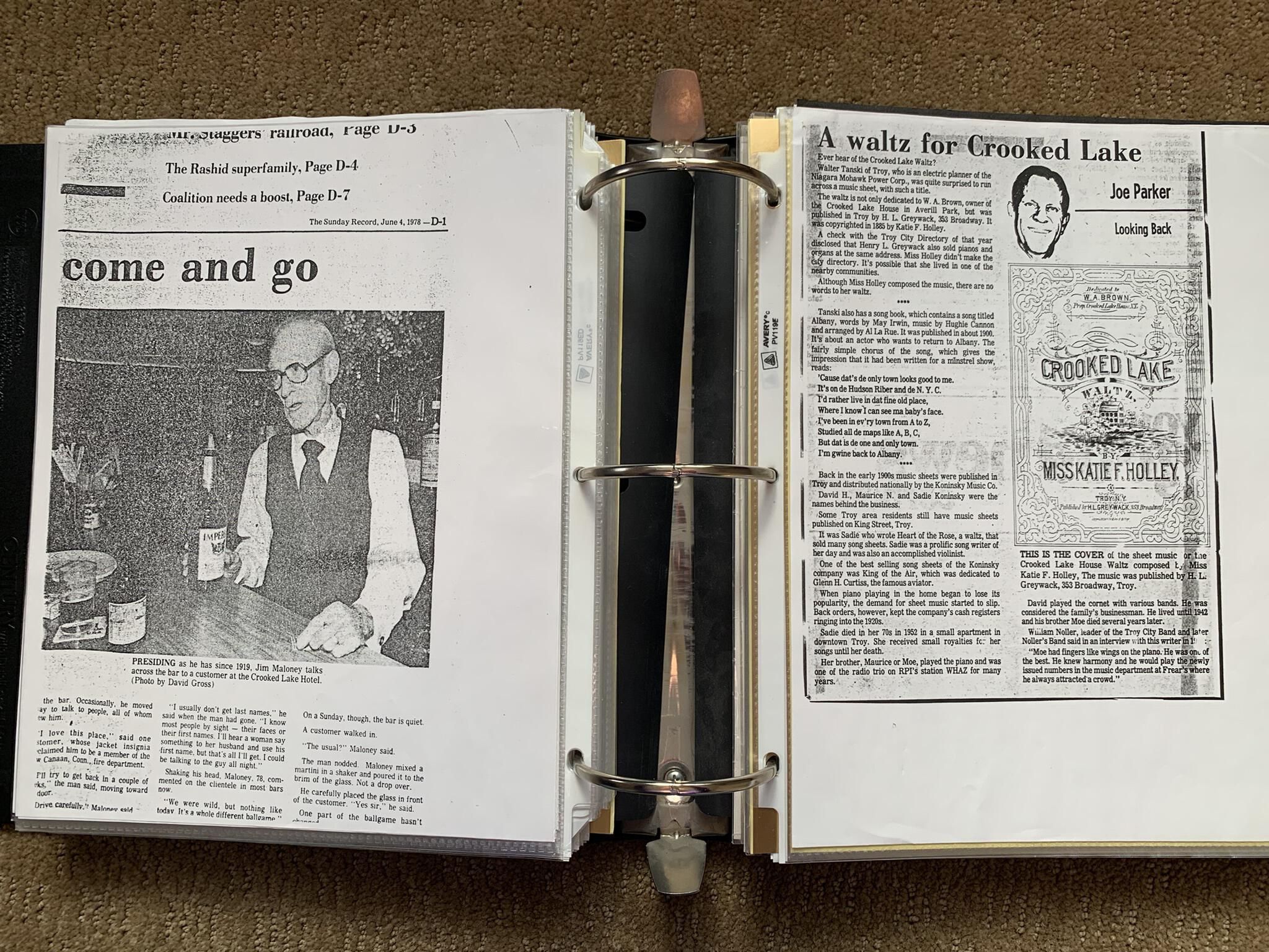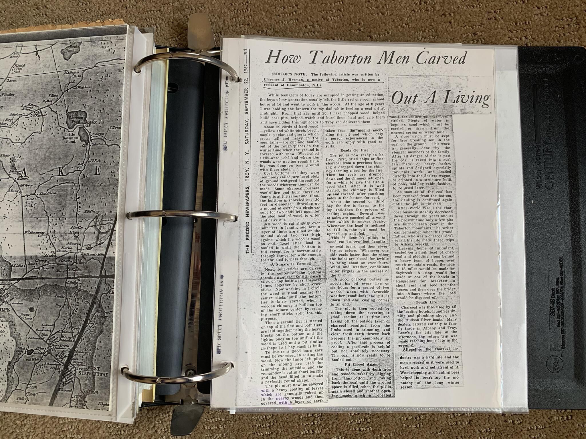 Binder of various newspaper articles, recollections, and memorabilia related to Town of Sand Lake historic hotels (particularly Crooked Lake Hotel), industry (particularly the Rensselaer Glass Factory and charcoal production), homes, churches, and the Sand Lake hamlet of Taborton. Much of the content already appears in other binders or could be obtained from online newspaper archives. Nearly all of the content consists of photocopies of original items. Several multi-page entries have been scanned to PDF and uploaded to the Informal Histories folder of this system as indicated below.Cataloged By