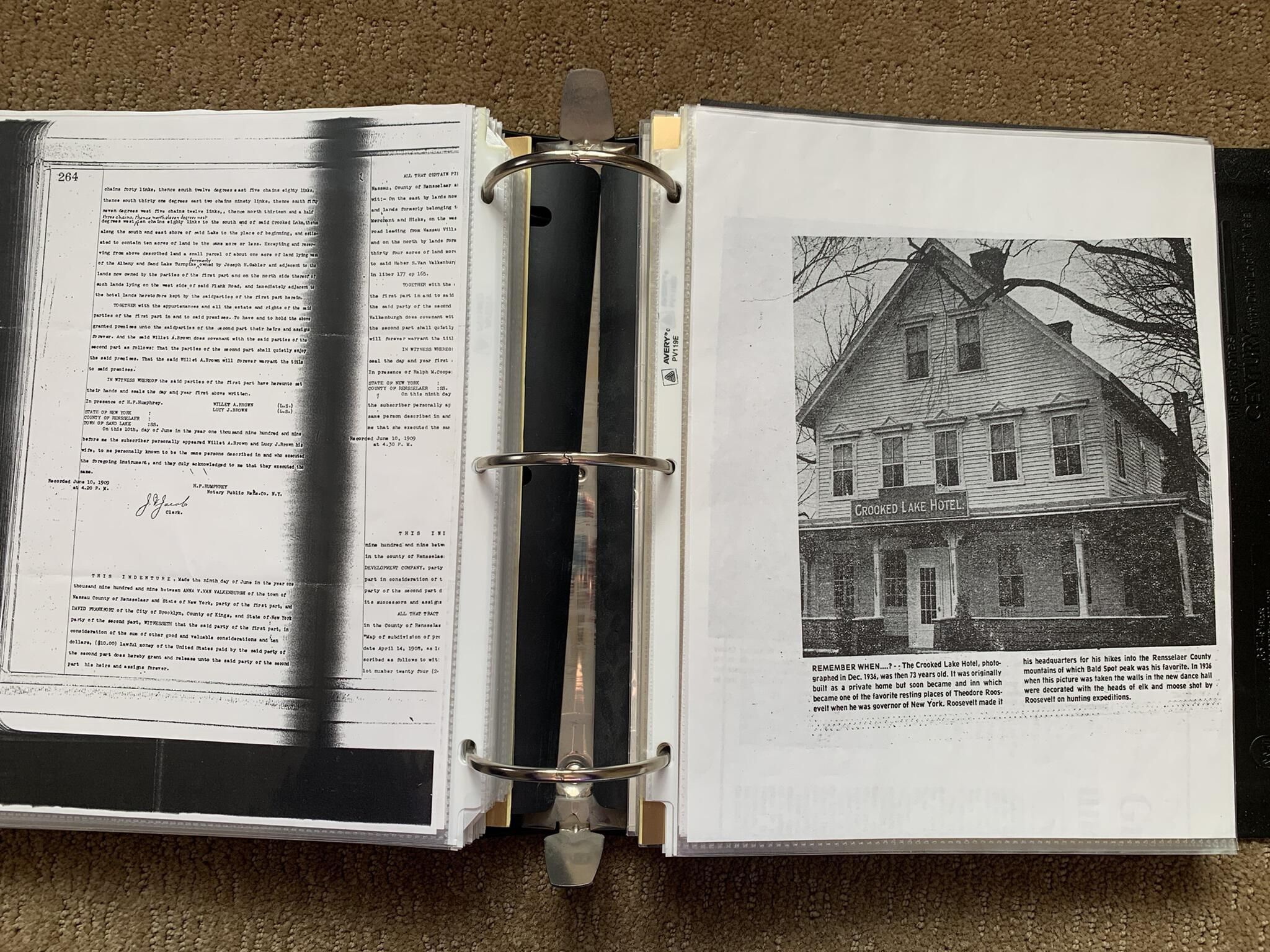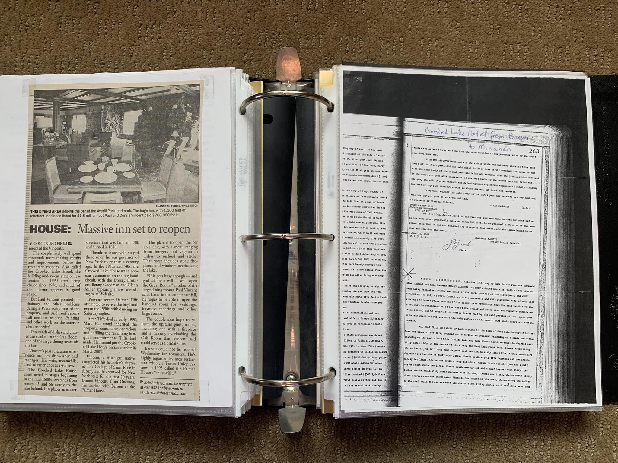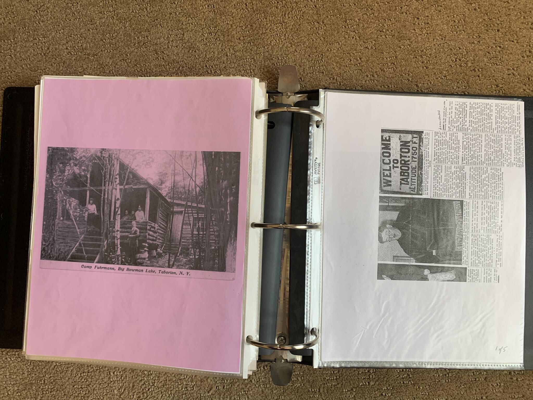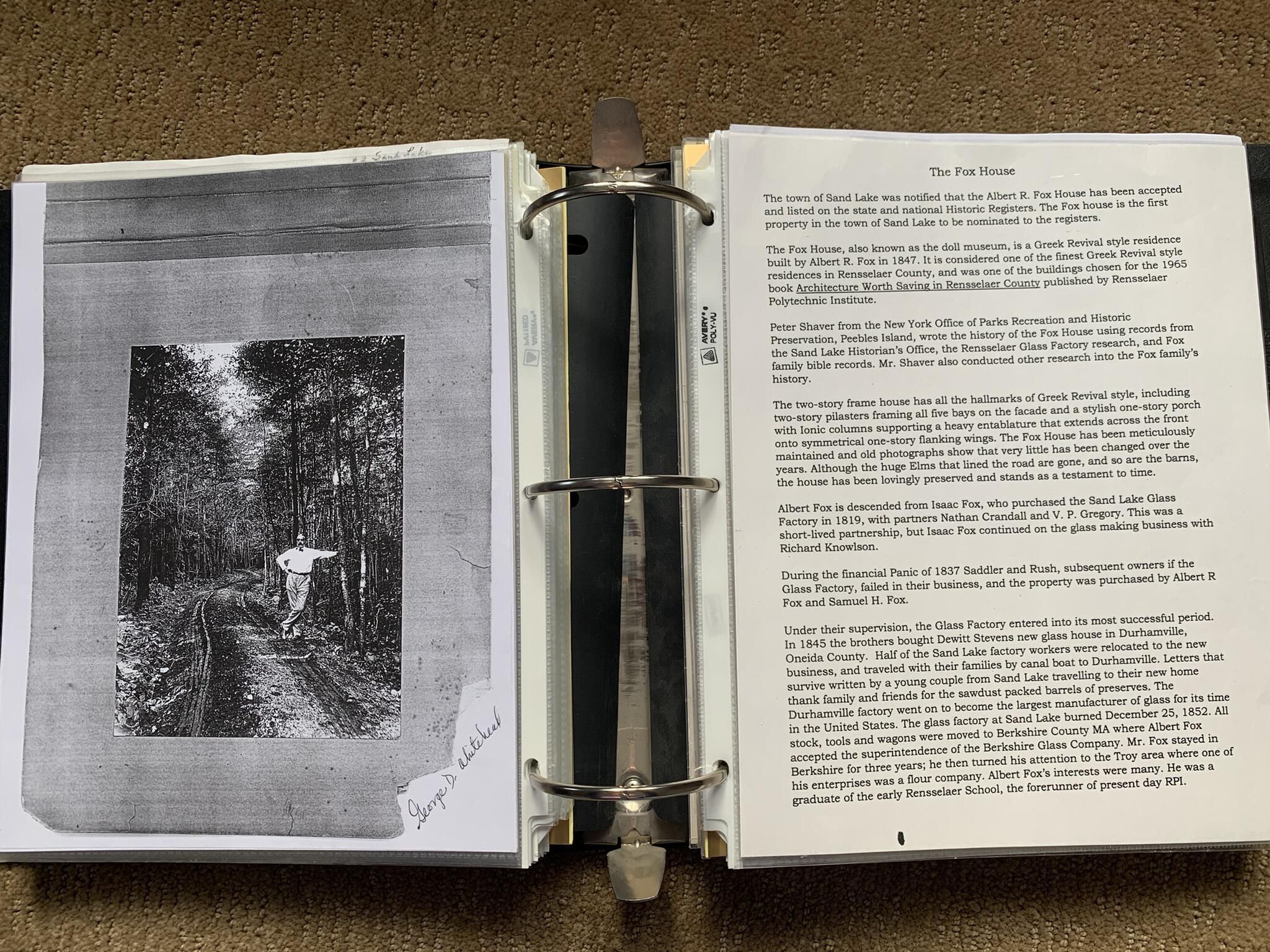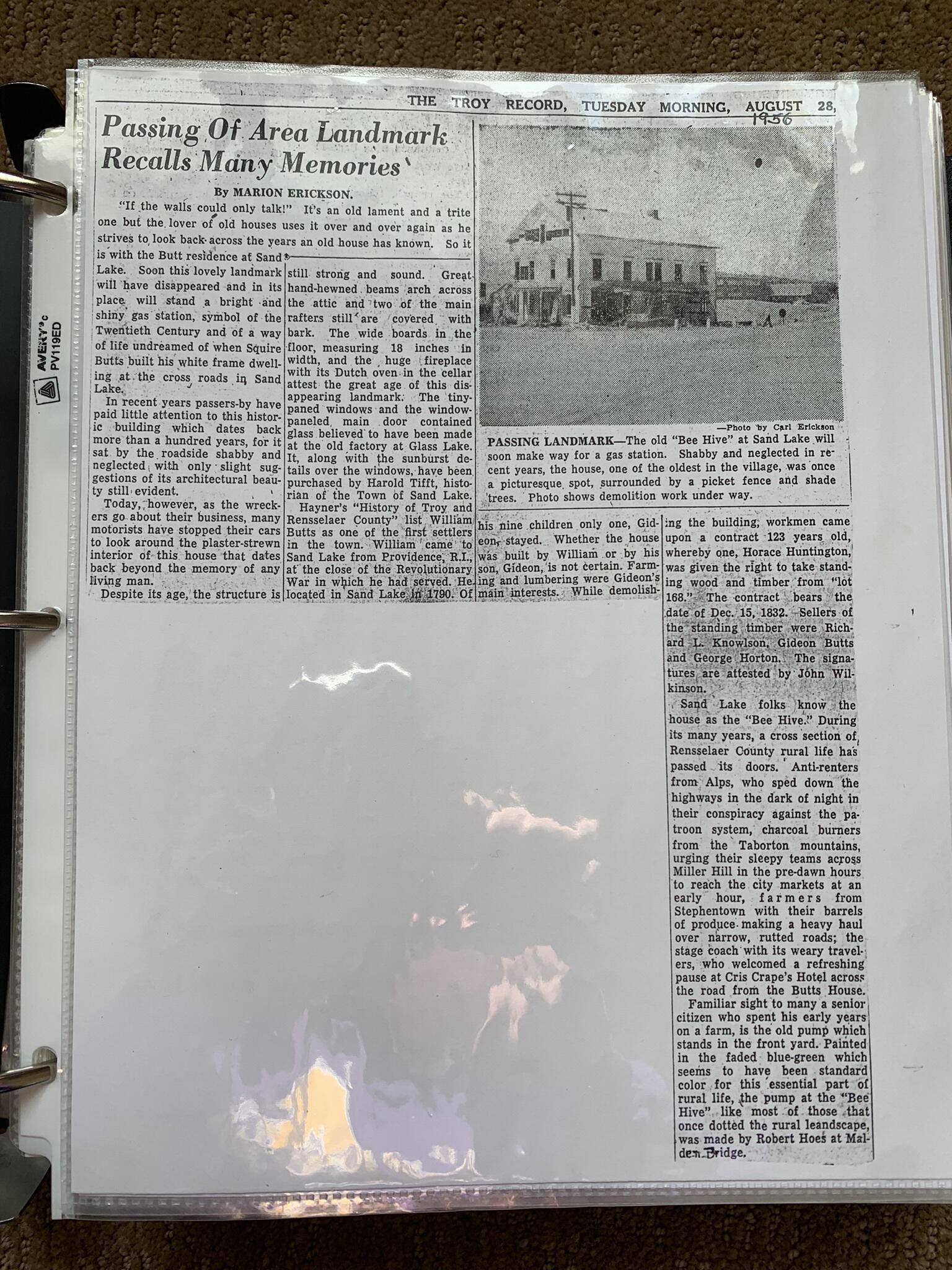Binder of various newspaper articles, recollections, and memorabilia related to Town of Sand Lake historic hotels (particularly Crooked Lake Hotel), industry (particularly the Rensselaer Glass Factory and charcoal production), homes, churches, and the Sand Lake hamlet of Taborton. Much of the content already appears in other binders or could be obtained from online newspaper archives. Nearly all of the content consists of photocopies of original items. Several multi-page entries have been scanned to PDF and uploaded to the Informal Histories folder of this system as indicated below.Cataloged By