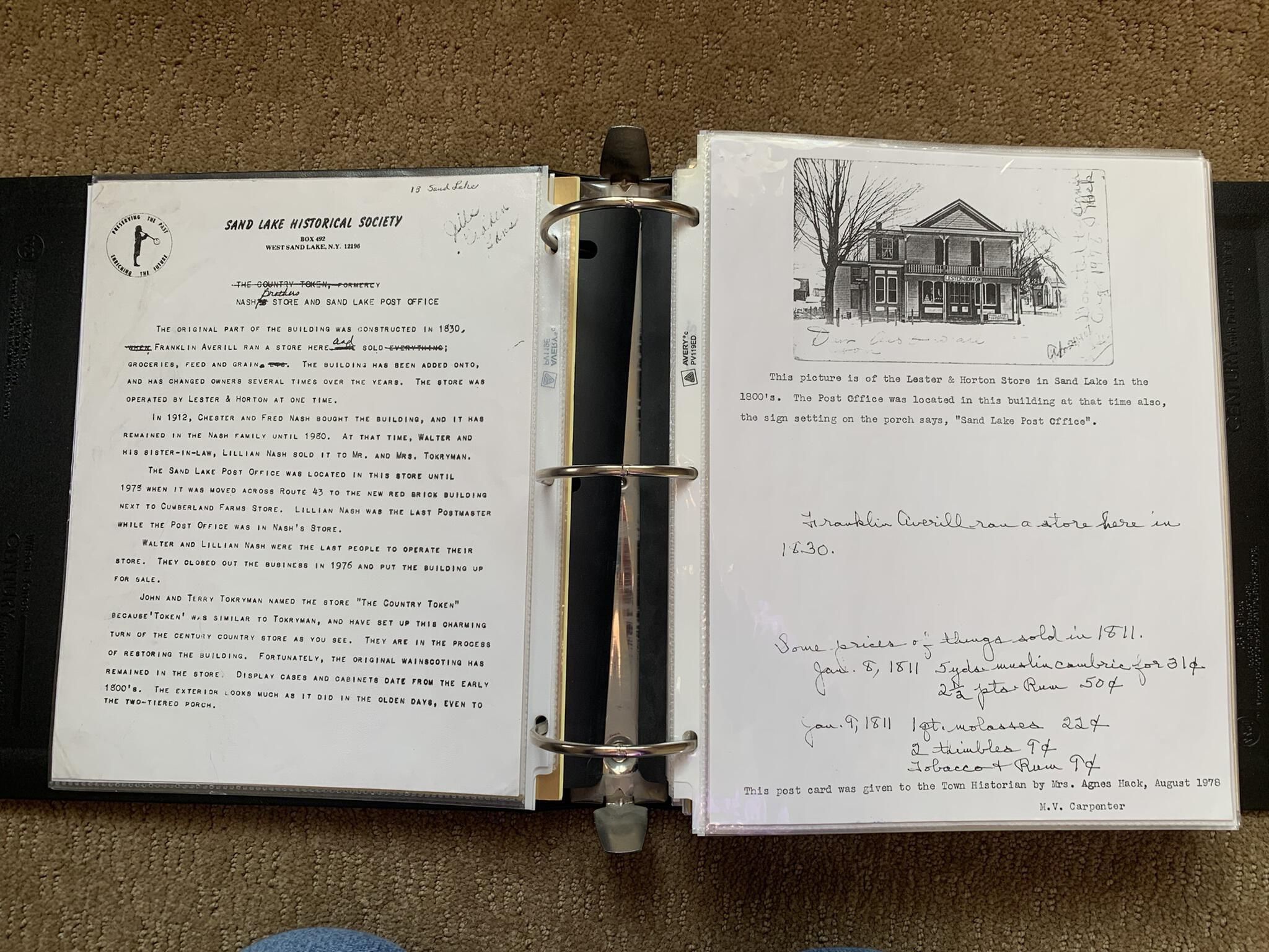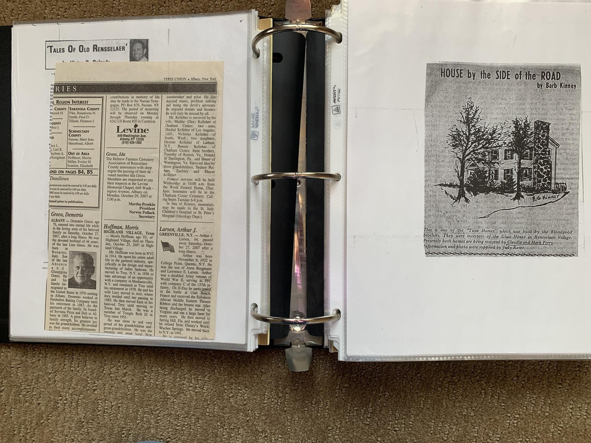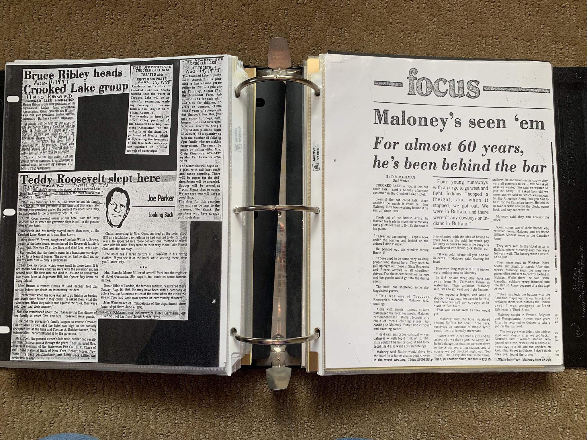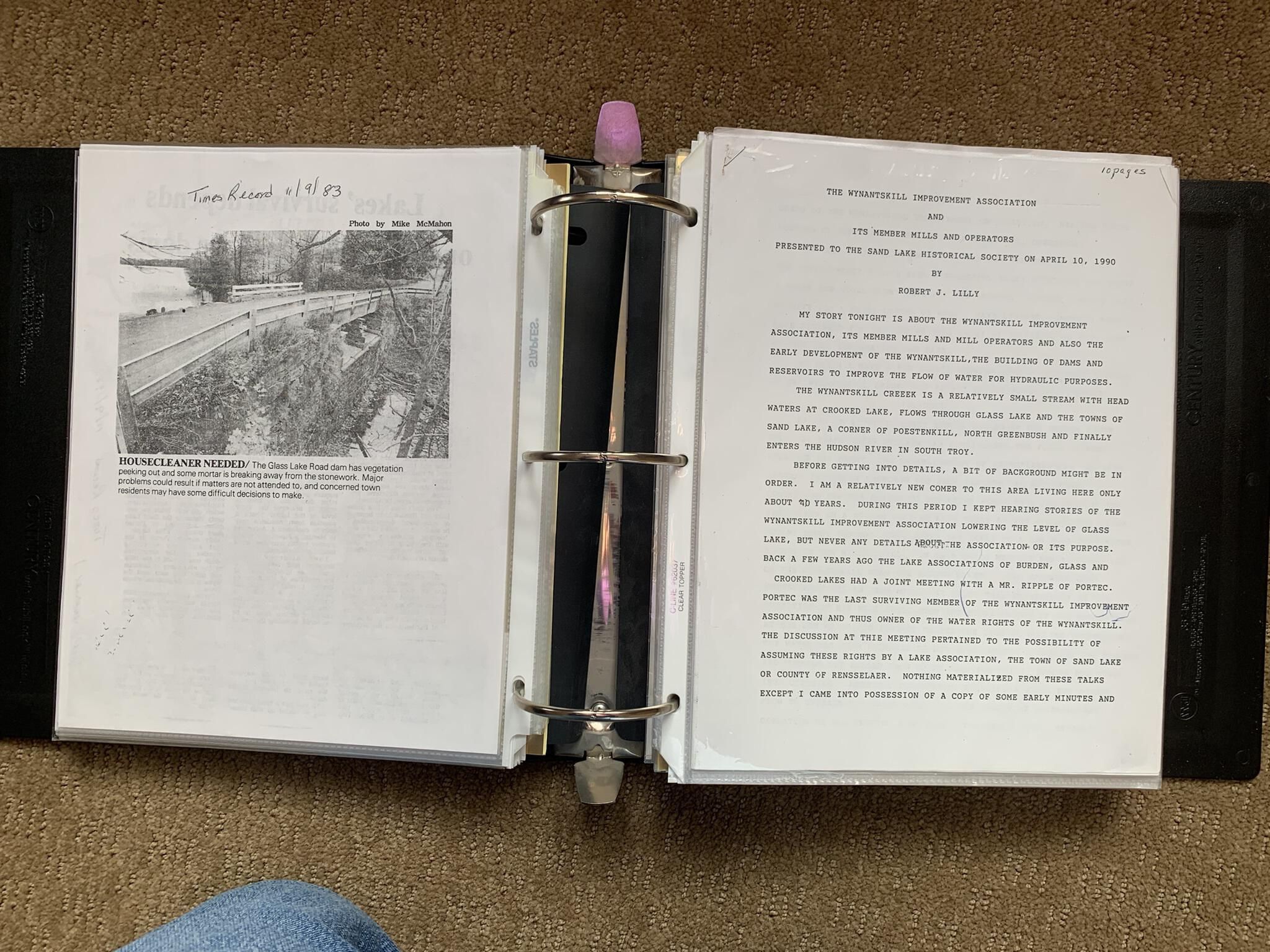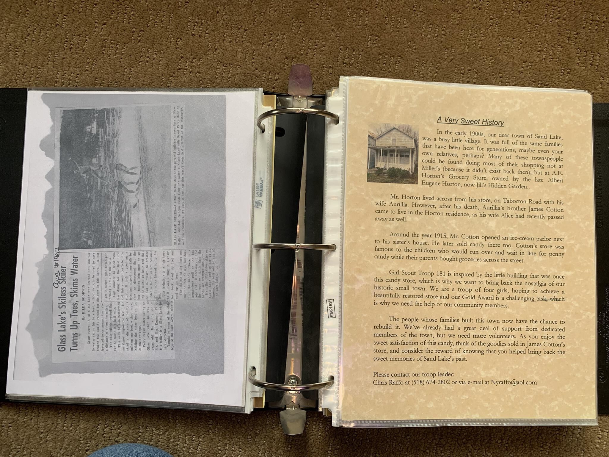 Binder of various newspaper articles, recollections, and memorabilia related to Town of Sand Lake historic hotels (particularly Crooked Lake Hotel), industry (particularly the Rensselaer Glass Factory and charcoal production), homes, churches, and the Sand Lake hamlet of Taborton. Much of the content already appears in other binders or could be obtained from online newspaper archives. Nearly all of the content consists of photocopies of original items. Several multi-page entries have been scanned to PDF and uploaded to the Informal Histories folder of this system as indicated below.Cataloged By