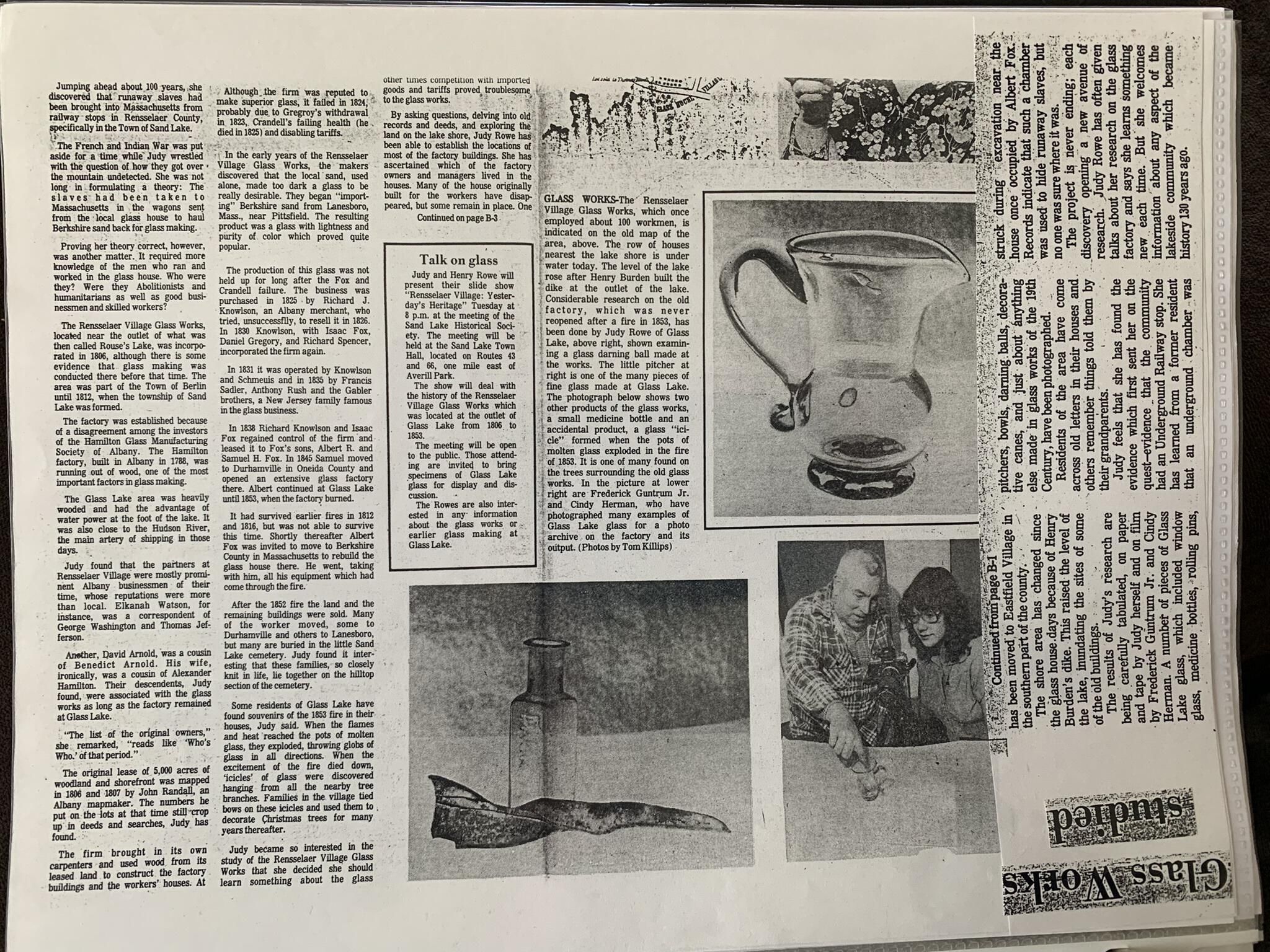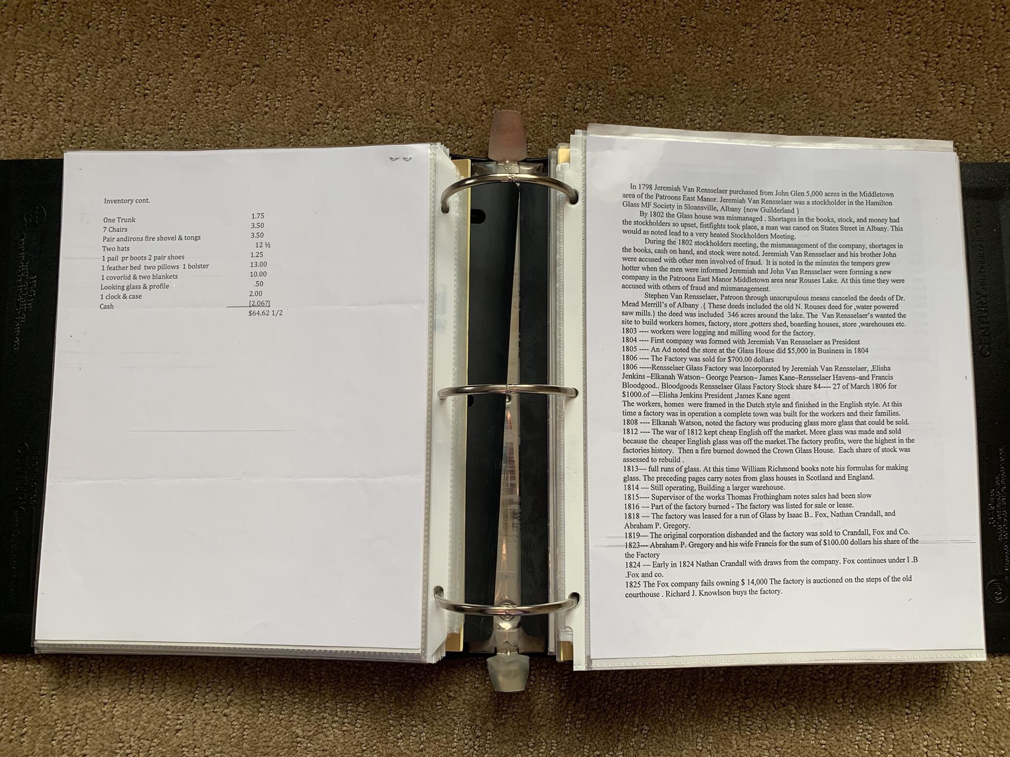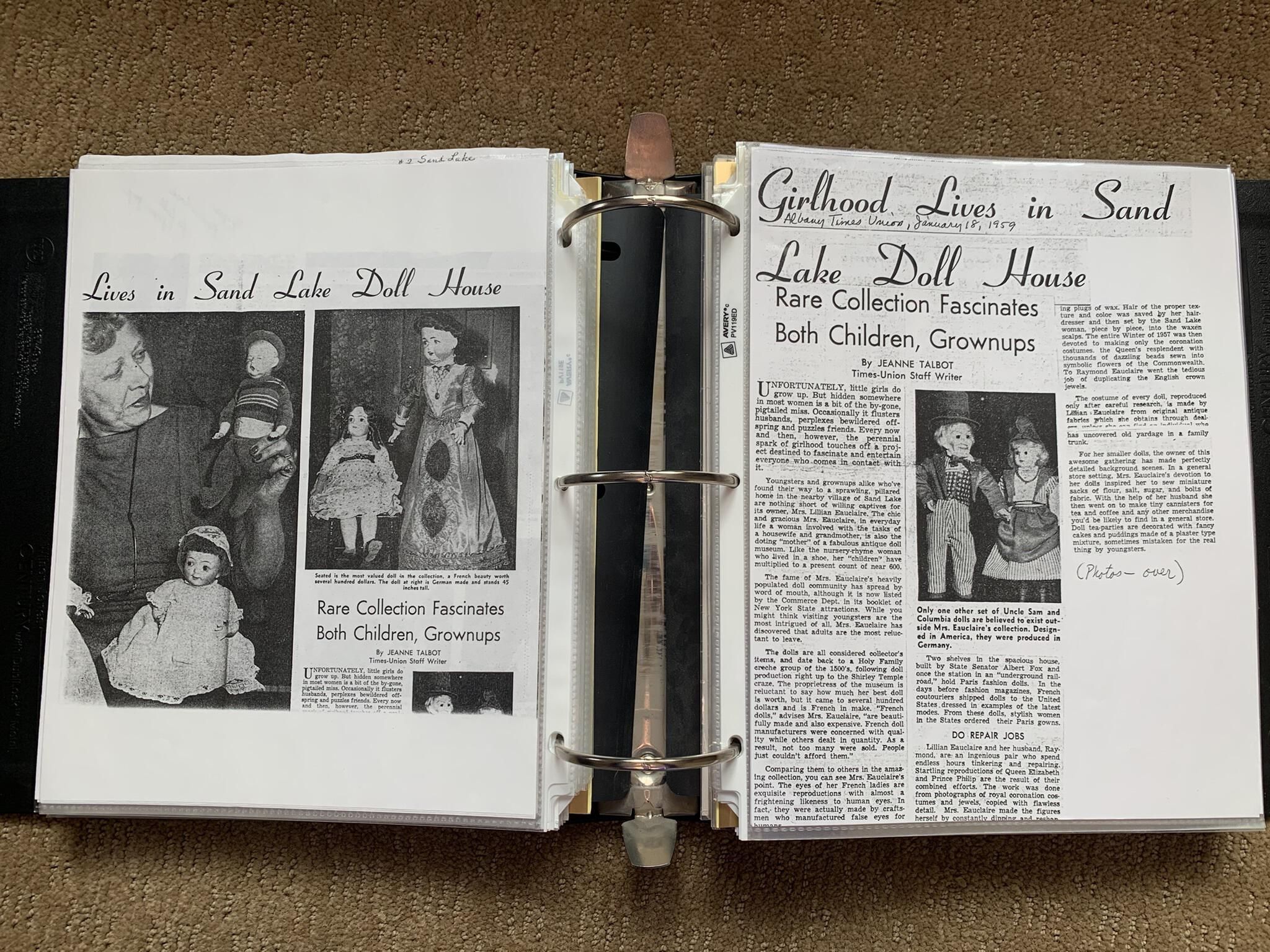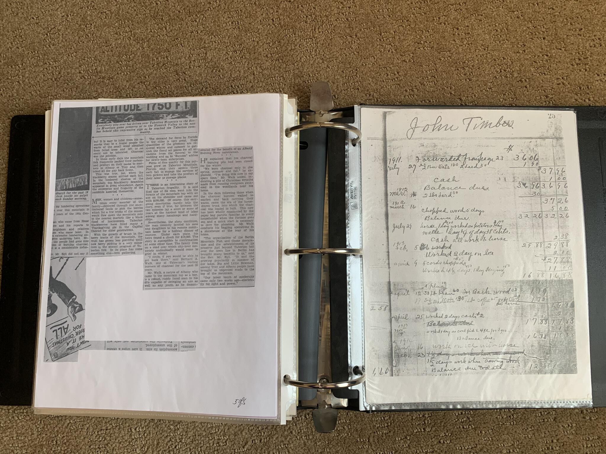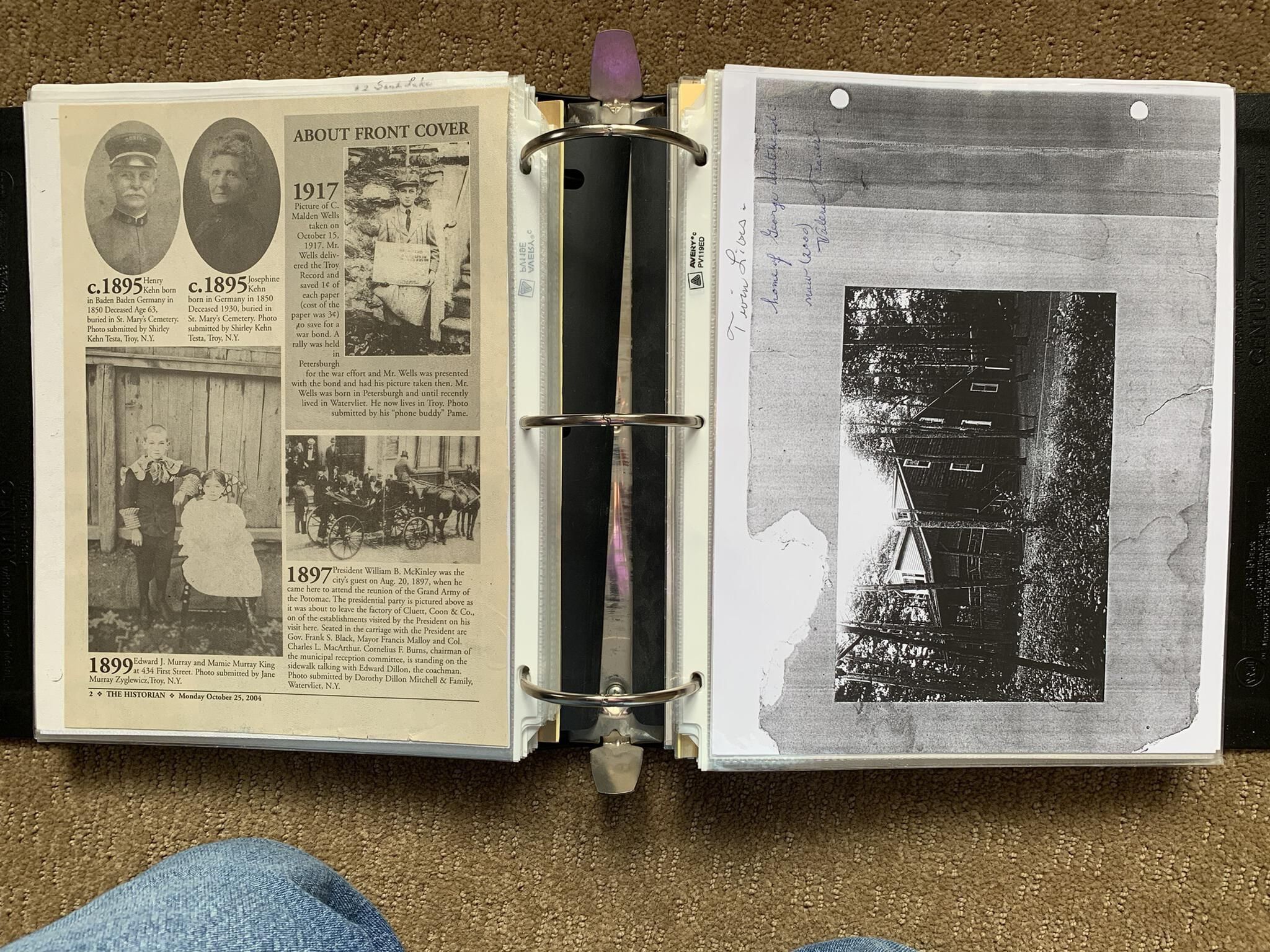 Binder of various newspaper articles, recollections, and memorabilia related to Town of Sand Lake historic hotels (particularly Crooked Lake Hotel), industry (particularly the Rensselaer Glass Factory and charcoal production), homes, churches, and the Sand Lake hamlet of Taborton. Much of the content already appears in other binders or could be obtained from online newspaper archives. Nearly all of the content consists of photocopies of original items. Several multi-page entries have been scanned to PDF and uploaded to the Informal Histories folder of this system as indicated below.Cataloged By
