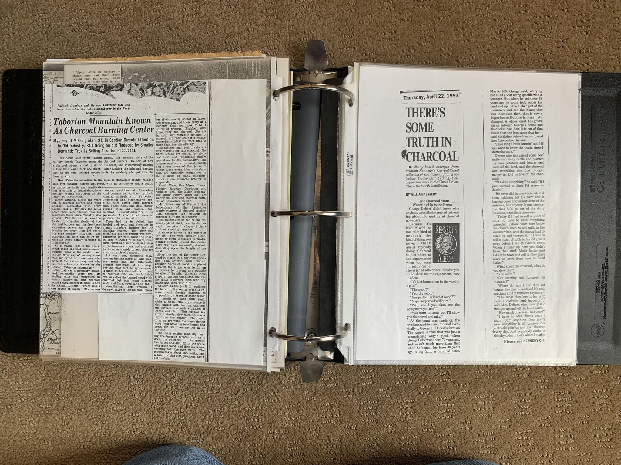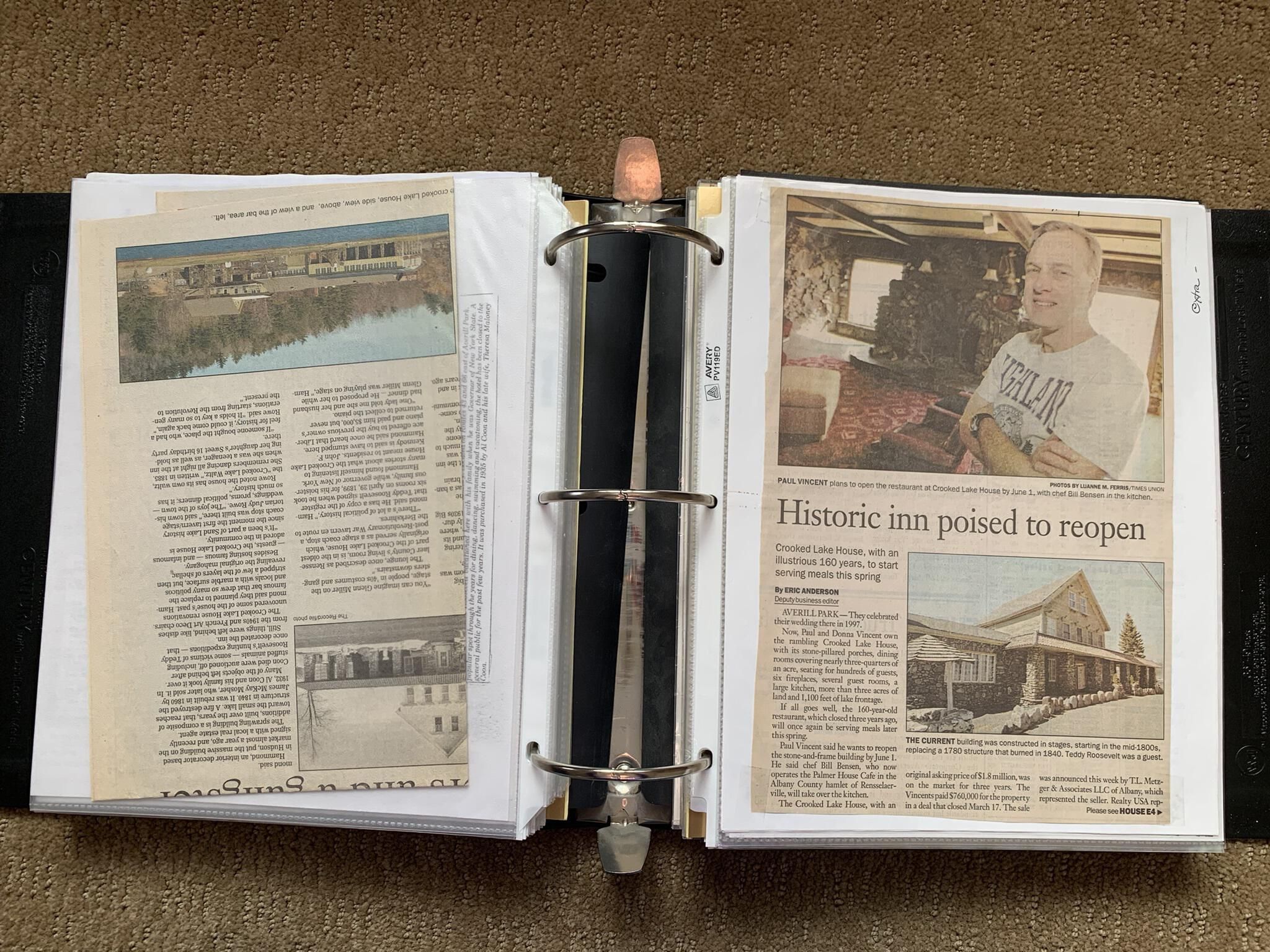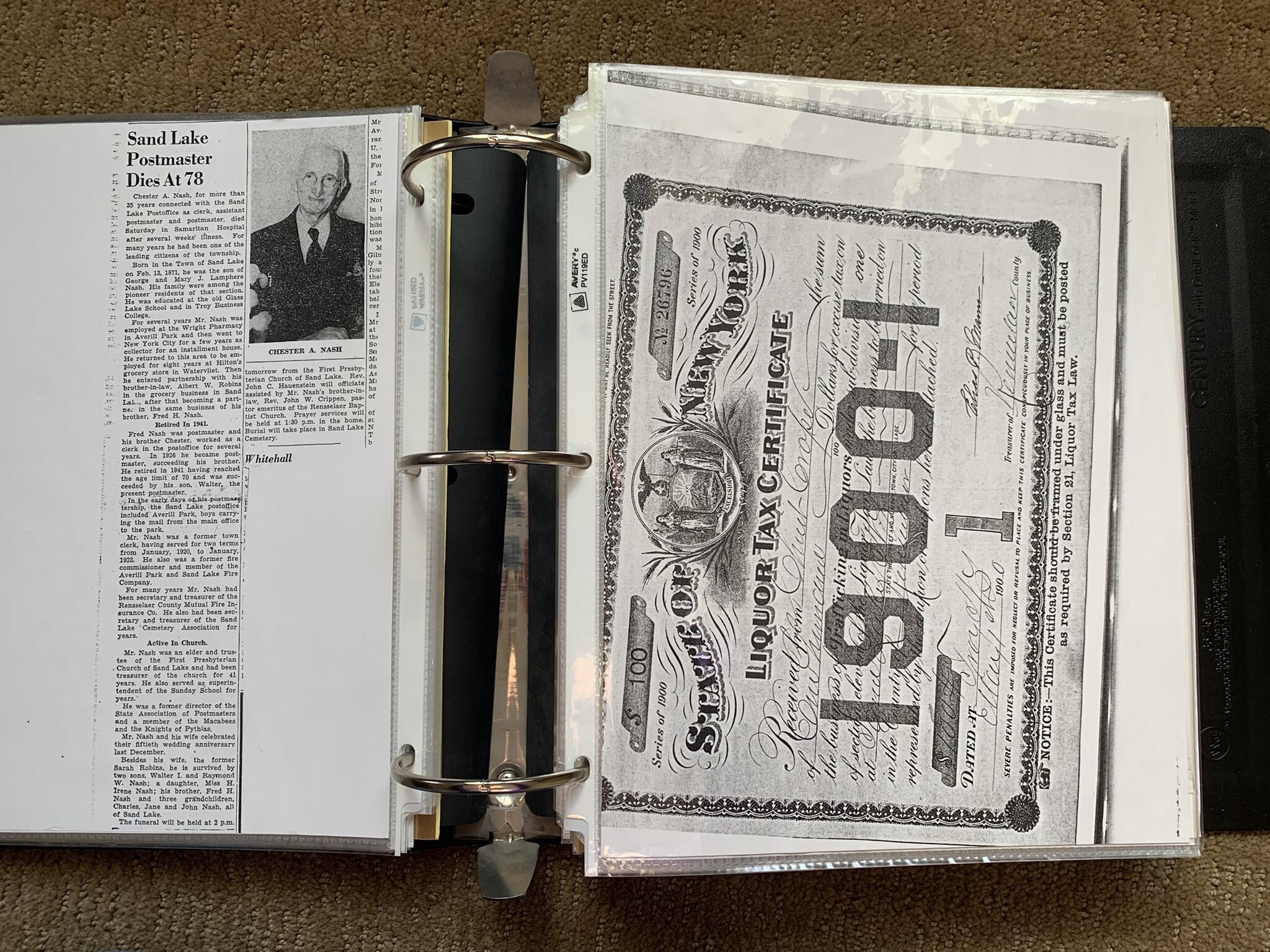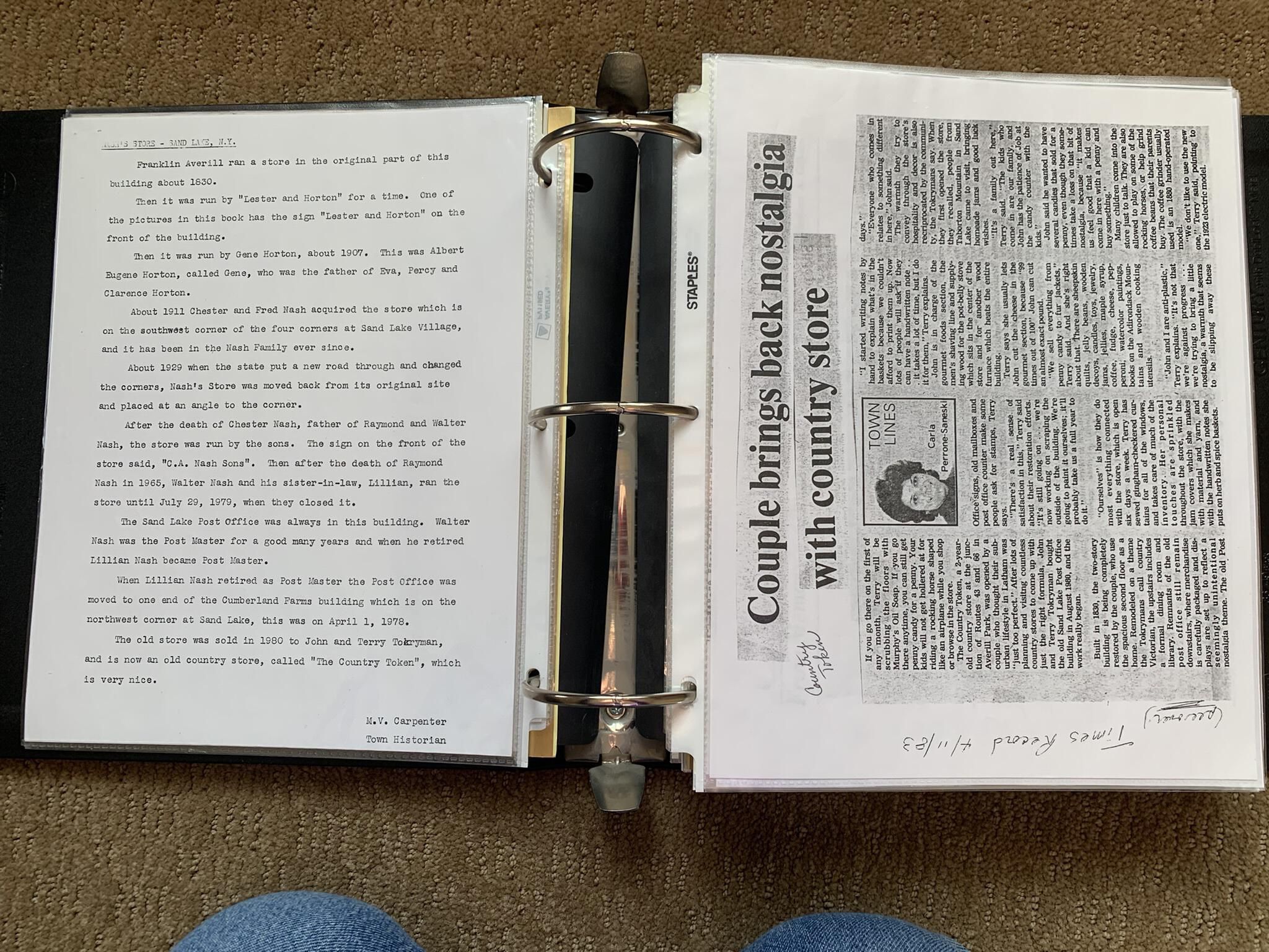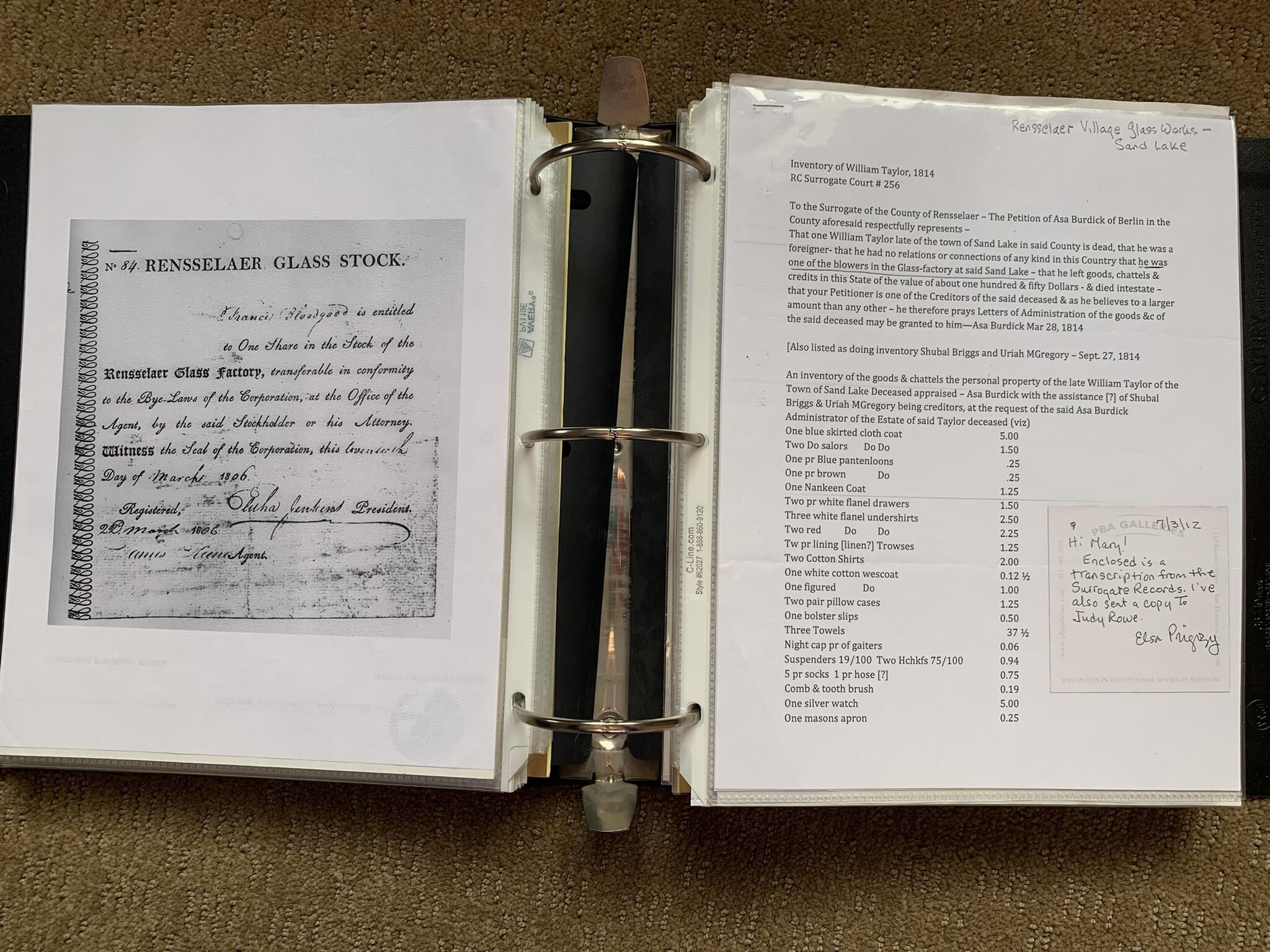 Binder of various newspaper articles, recollections, and memorabilia related to Town of Sand Lake historic hotels (particularly Crooked Lake Hotel), industry (particularly the Rensselaer Glass Factory and charcoal production), homes, churches, and the Sand Lake hamlet of Taborton. Much of the content already appears in other binders or could be obtained from online newspaper archives. Nearly all of the content consists of photocopies of original items. Several multi-page entries have been scanned to PDF and uploaded to the Informal Histories folder of this system as indicated below.Cataloged By