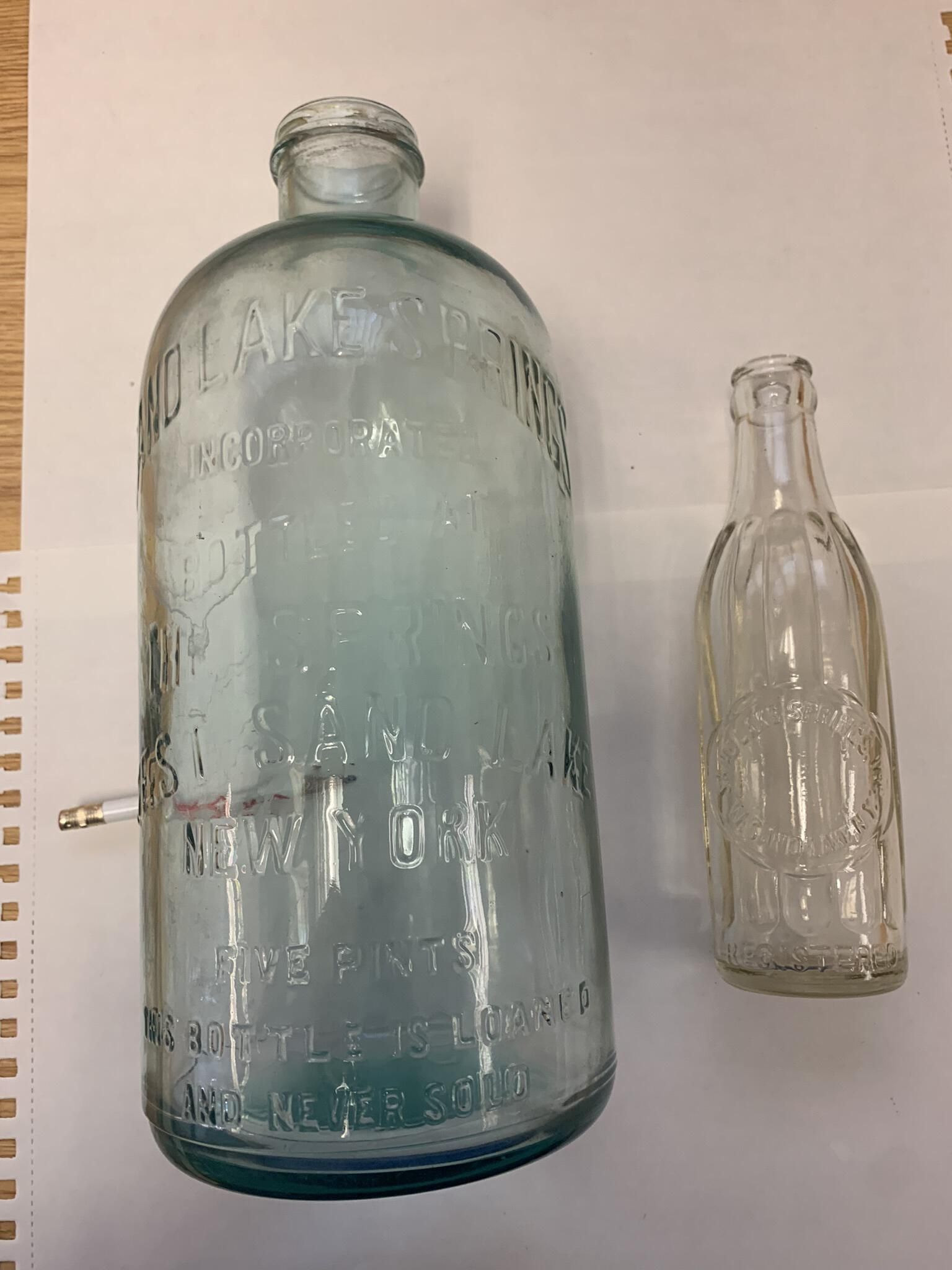One Sand Lake Springs five-pint water bottle and one seven-ounce Sand Lake Springs soda / soft drink bottle. The spring was likely located about three quarters of a mile East of West Sand Lake and reportedly a chalybeate spring, meaning it offered natural mineral waters containing iron salts. Both bottles are extra as compared to the SLHS Sand Lake Springs bottles that are already publicly displayed in Town Hall, wrapped in newspaper and plastic, marked, carefully tucked inside the cardboard box displayed in this entry, and stored in SLHS File Cabinet 5 - Drawer 3. Refer to the other entries in this folder for additional pictures of identical bottles as/if desired.Cataloged By