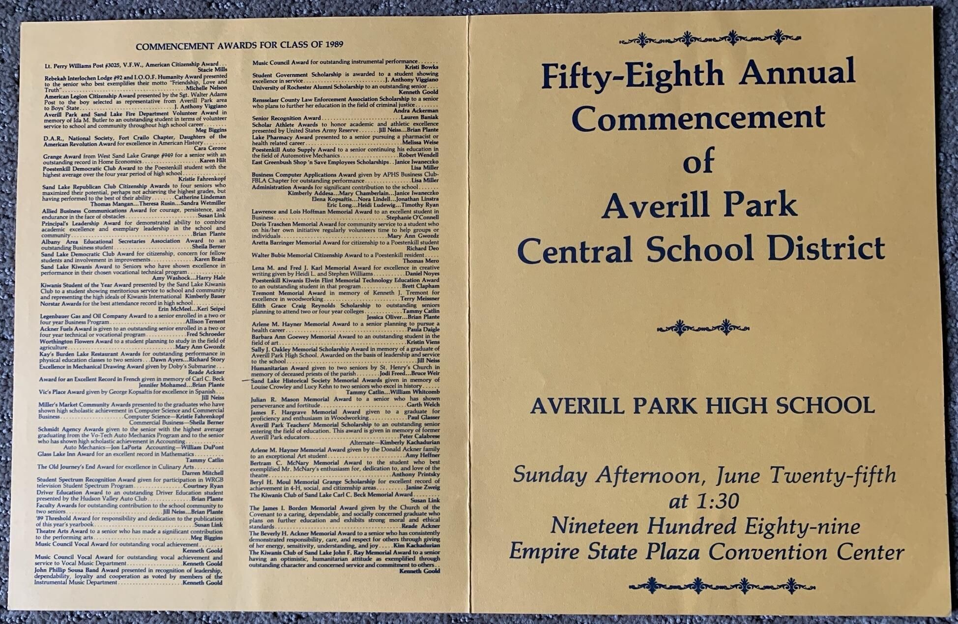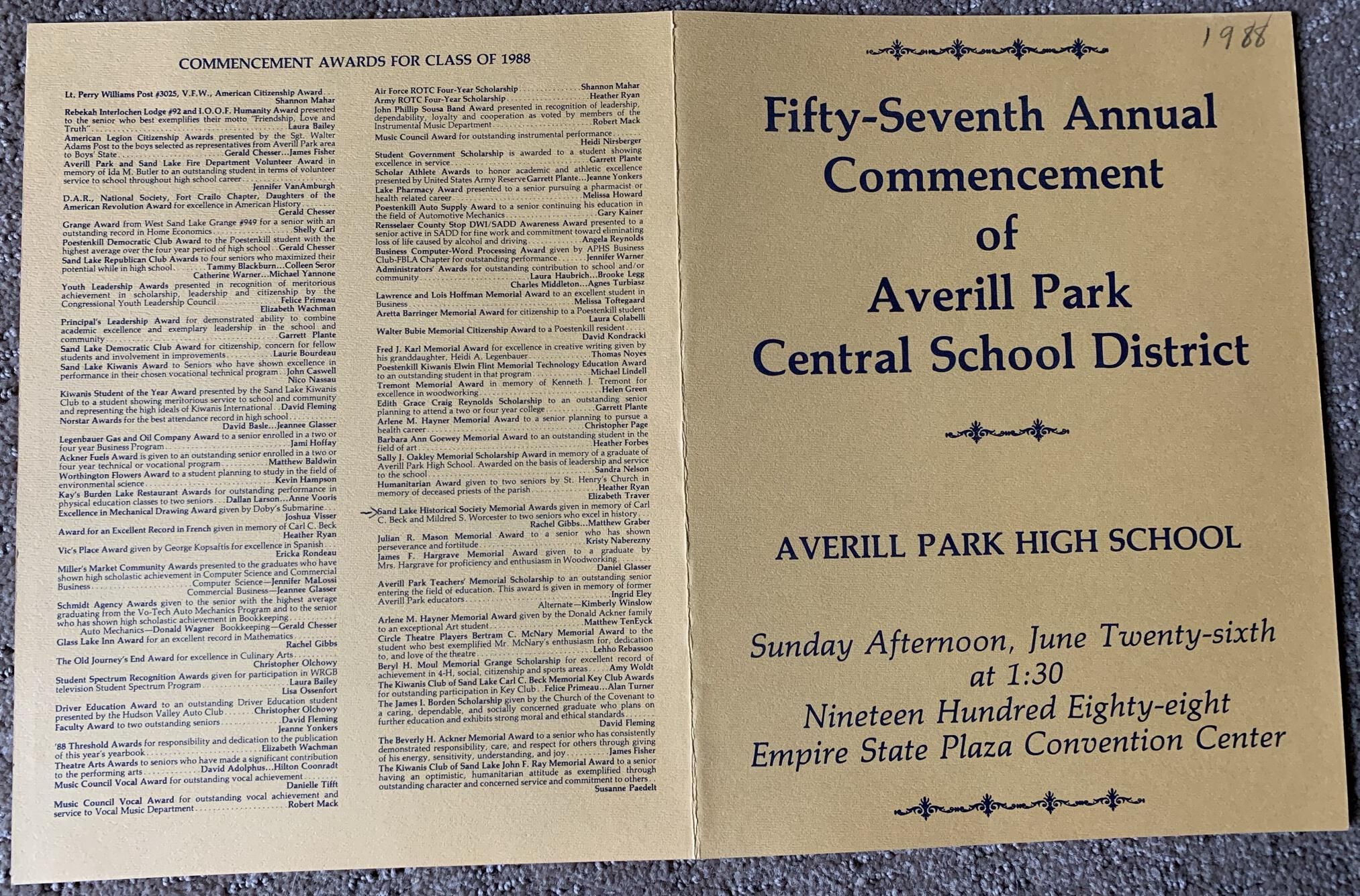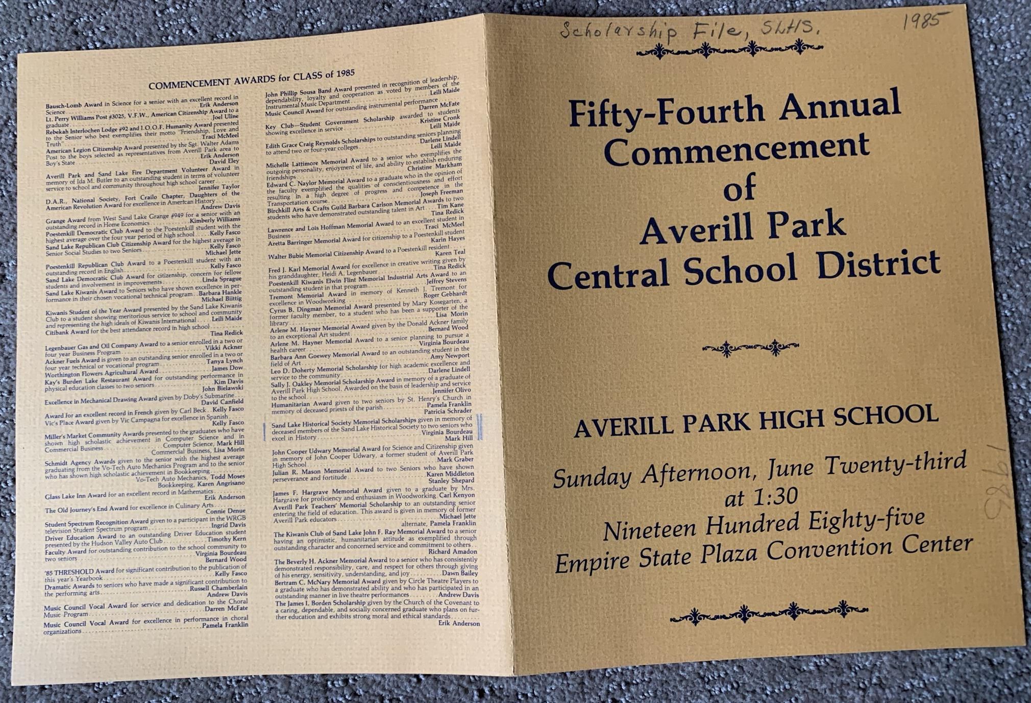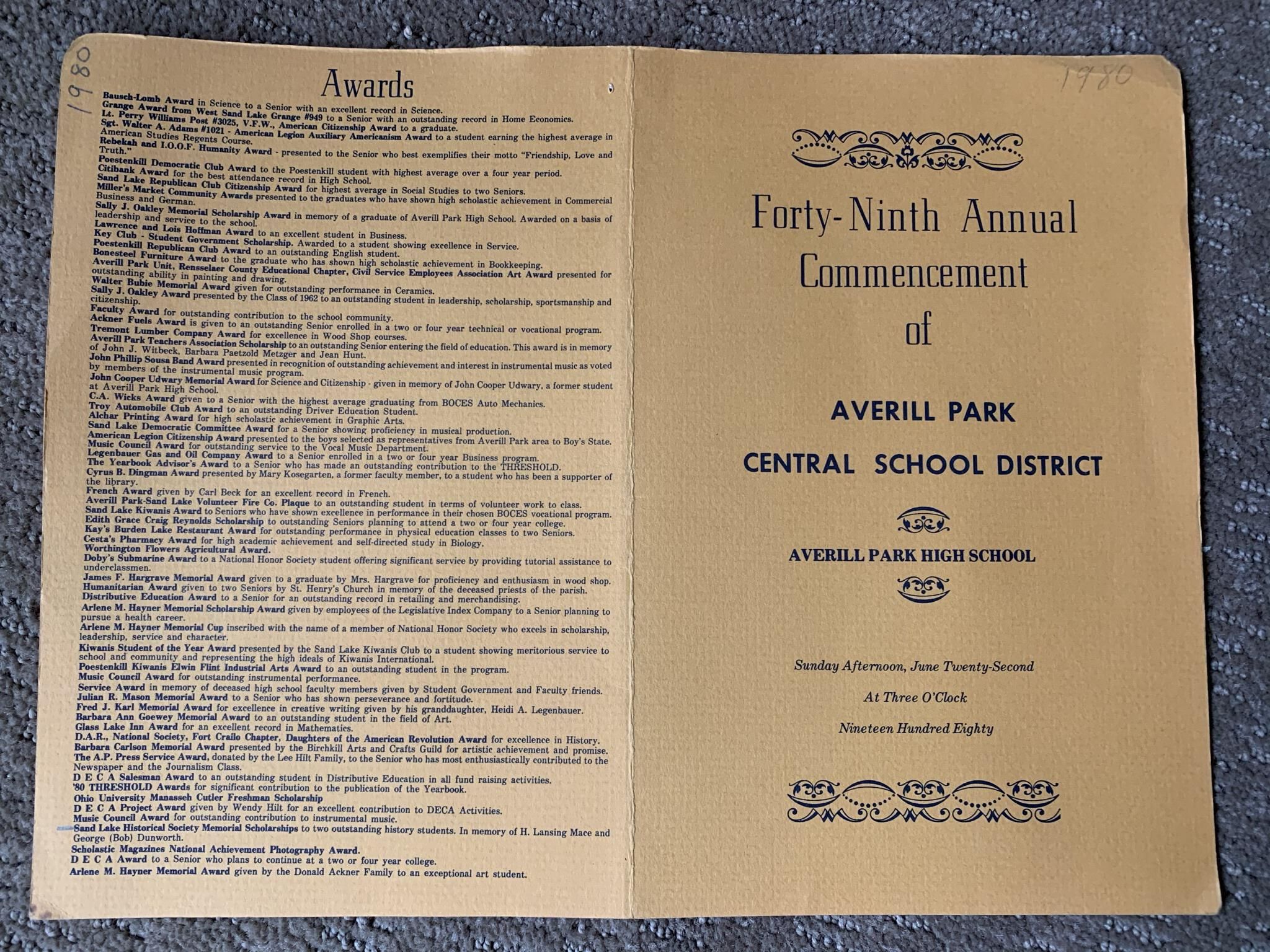 Each year the Sand Lake Historical Society (SLHS) sponsors the award of typically $100 each to an Averill Park High School (APHS) graduating male and female student who have demonstrated an exception interest in historical studies and in the memory of past SLHS members. This entry notes the SLHS member memorials made and, as/if noted, student winners from 1980 through 1989 as well as includes photos of the APHS Commencement Ceremony Programs for most of those years. These artifacts are stored in a SLHS Scholarship Program folder that can be found in Drawer 1 of SLHS File Cabinet 2 located on the second floor of Town Hall. The awards continued through present, but similar records are not readily available.Context