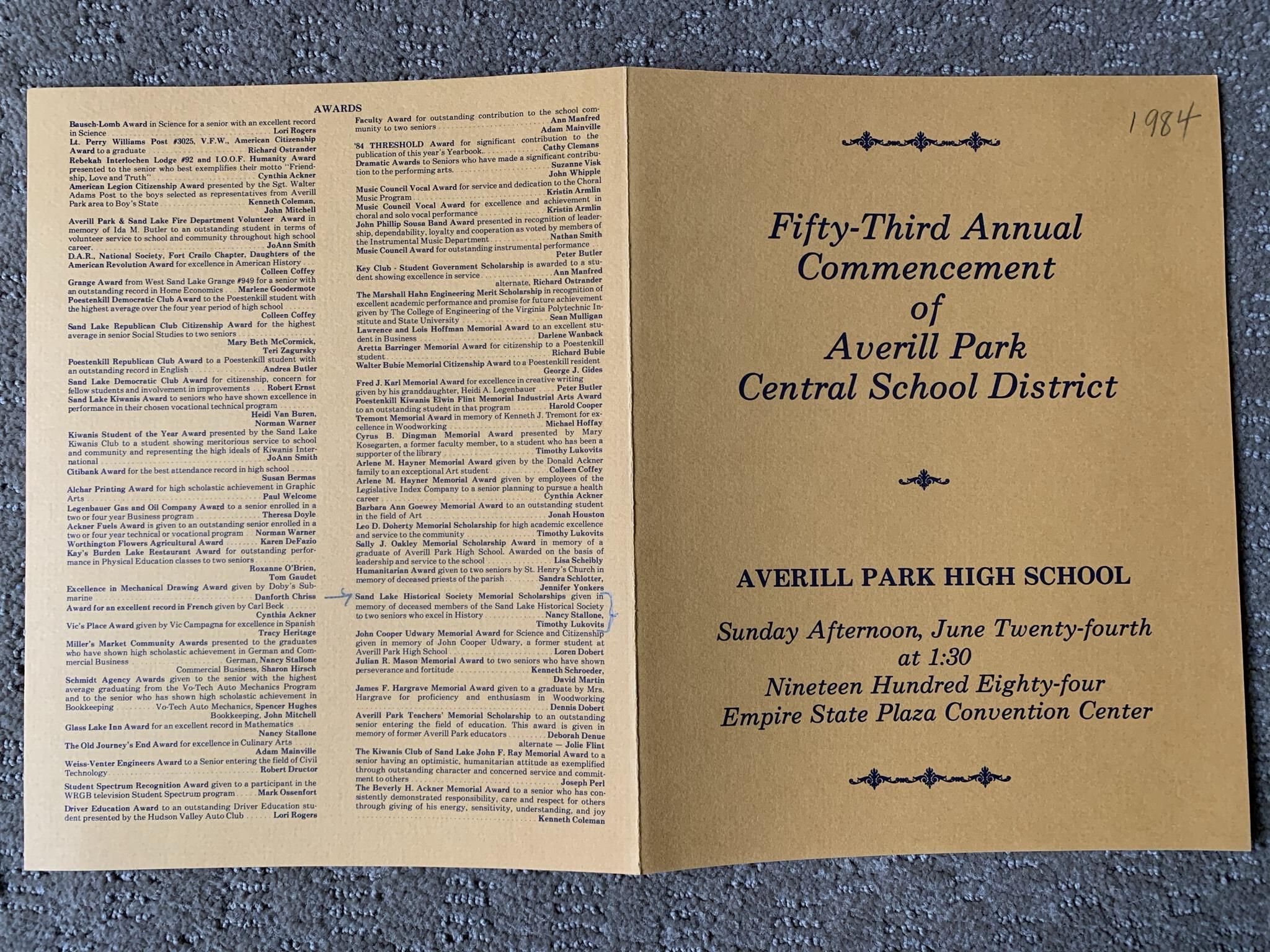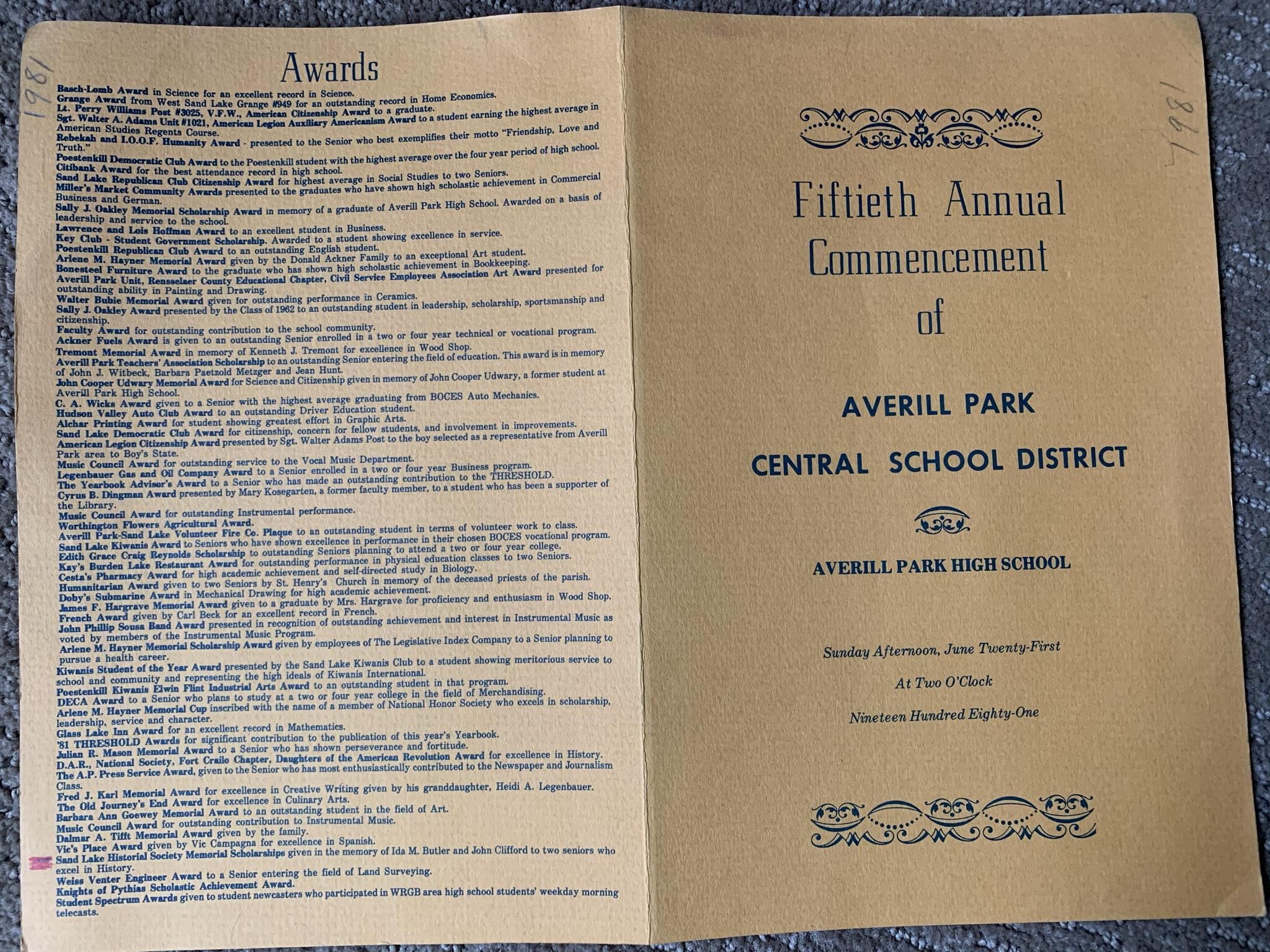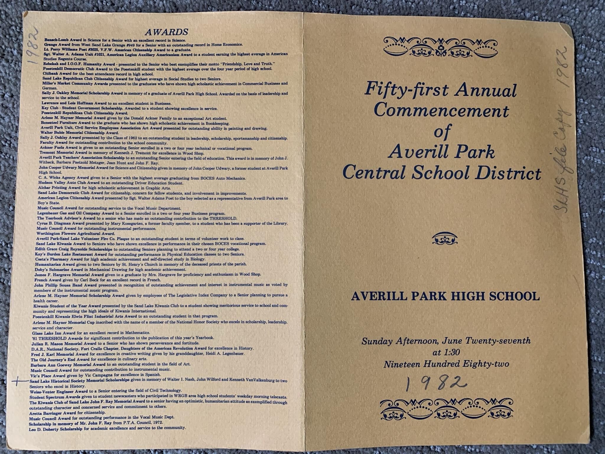 Each year the Sand Lake Historical Society (SLHS) sponsors the award of typically $100 each to an Averill Park High School (APHS) graduating male and female student who have demonstrated an exception interest in historical studies and in the memory of past SLHS members. This entry notes the SLHS member memorials made and, as/if noted, student winners from 1980 through 1989 as well as includes photos of the APHS Commencement Ceremony Programs for most of those years. These artifacts are stored in a SLHS Scholarship Program folder that can be found in Drawer 1 of SLHS File Cabinet 2 located on the second floor of Town Hall. The awards continued through present, but similar records are not readily available.Context
