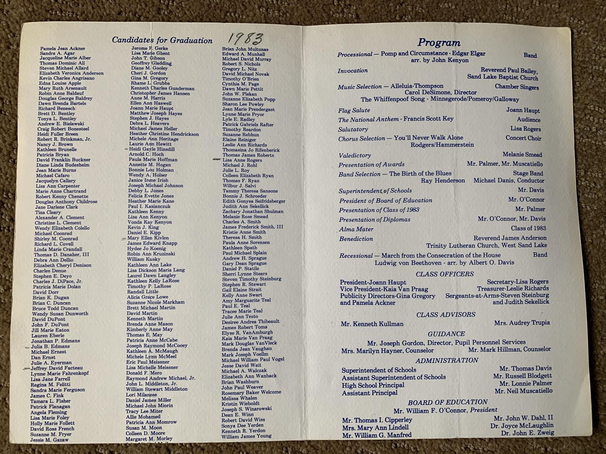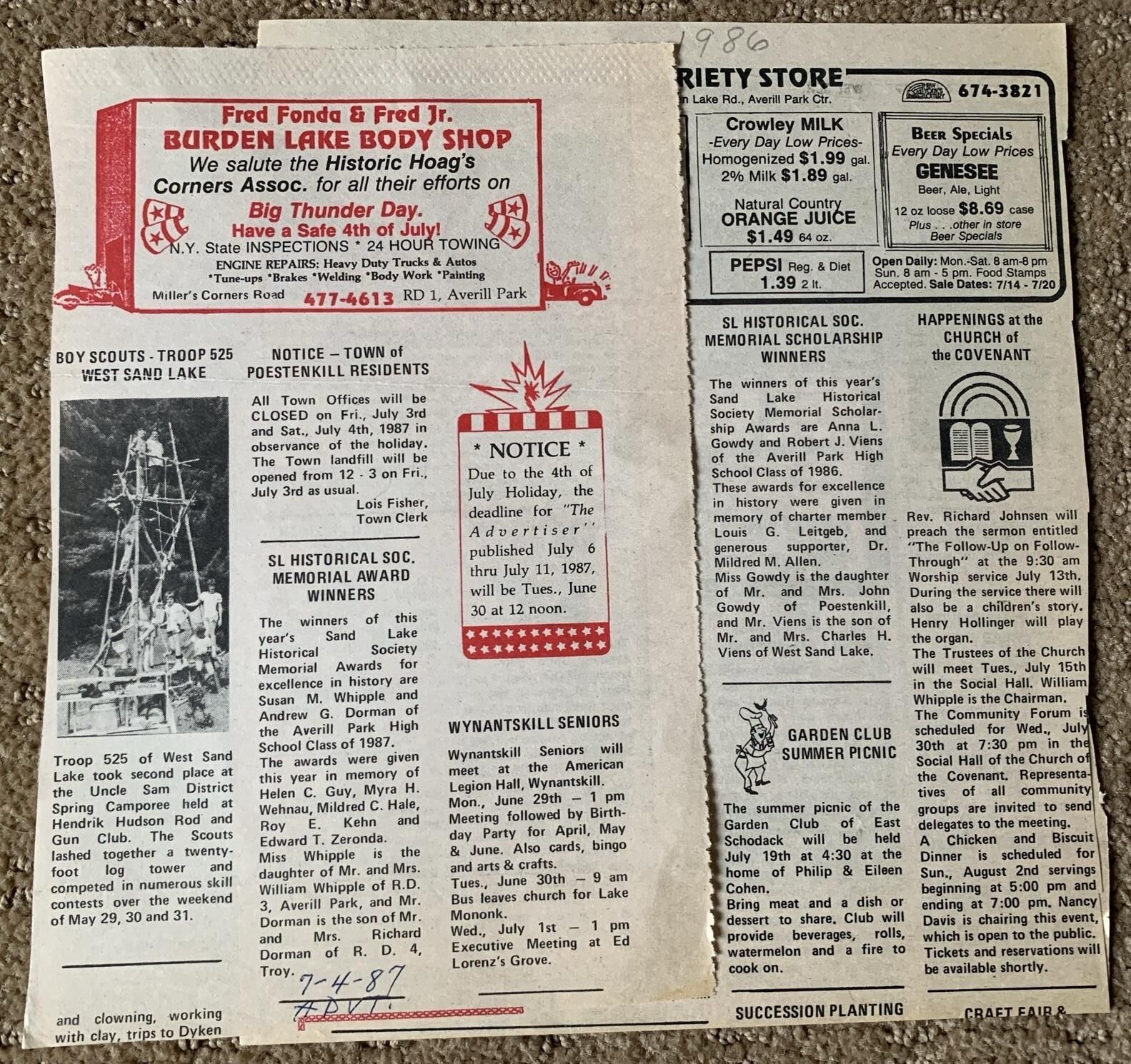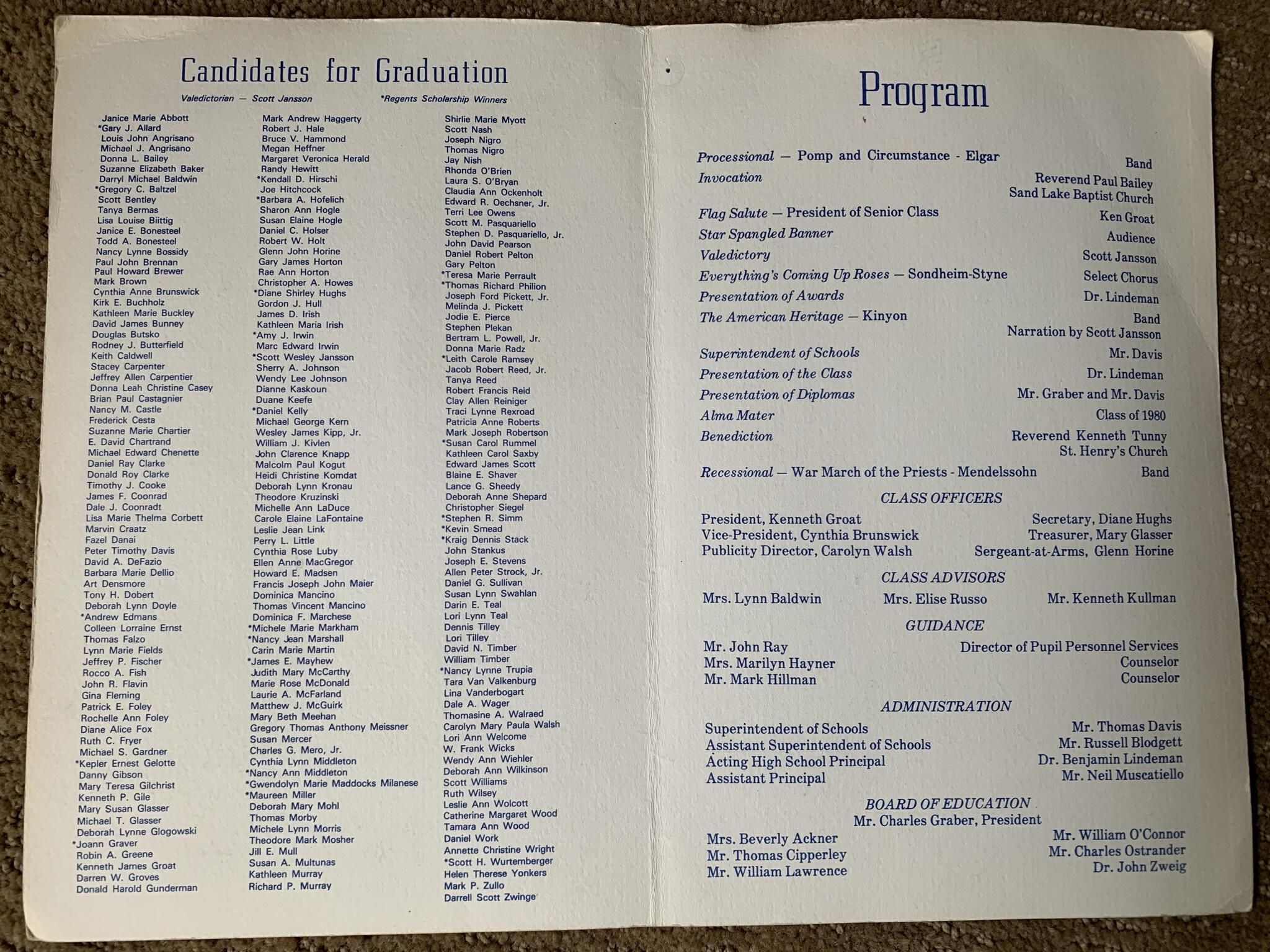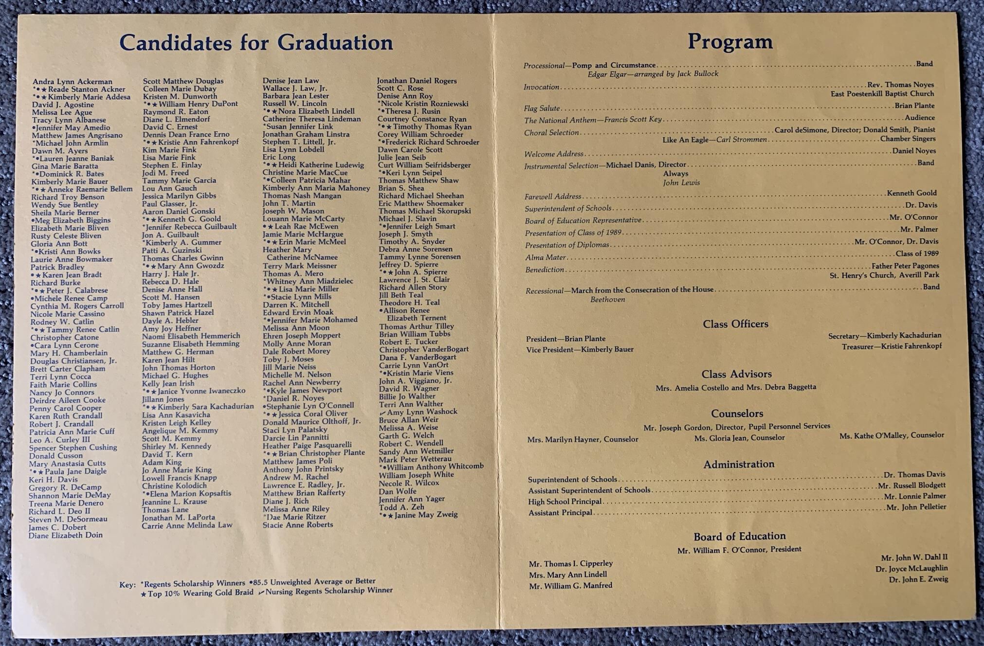 Each year the Sand Lake Historical Society (SLHS) sponsors the award of typically $100 each to an Averill Park High School (APHS) graduating male and female student who have demonstrated an exception interest in historical studies and in the memory of past SLHS members. This entry notes the SLHS member memorials made and, as/if noted, student winners from 1980 through 1989 as well as includes photos of the APHS Commencement Ceremony Programs for most of those years. These artifacts are stored in a SLHS Scholarship Program folder that can be found in Drawer 1 of SLHS File Cabinet 2 located on the second floor of Town Hall. The awards continued through present, but similar records are not readily available.Context