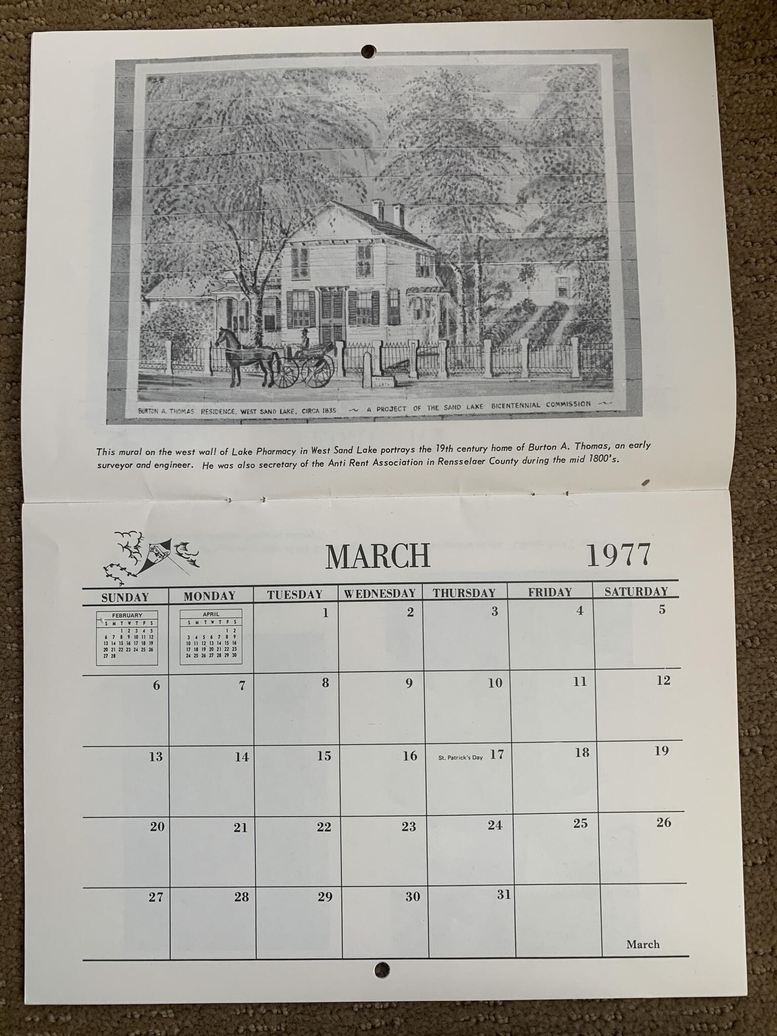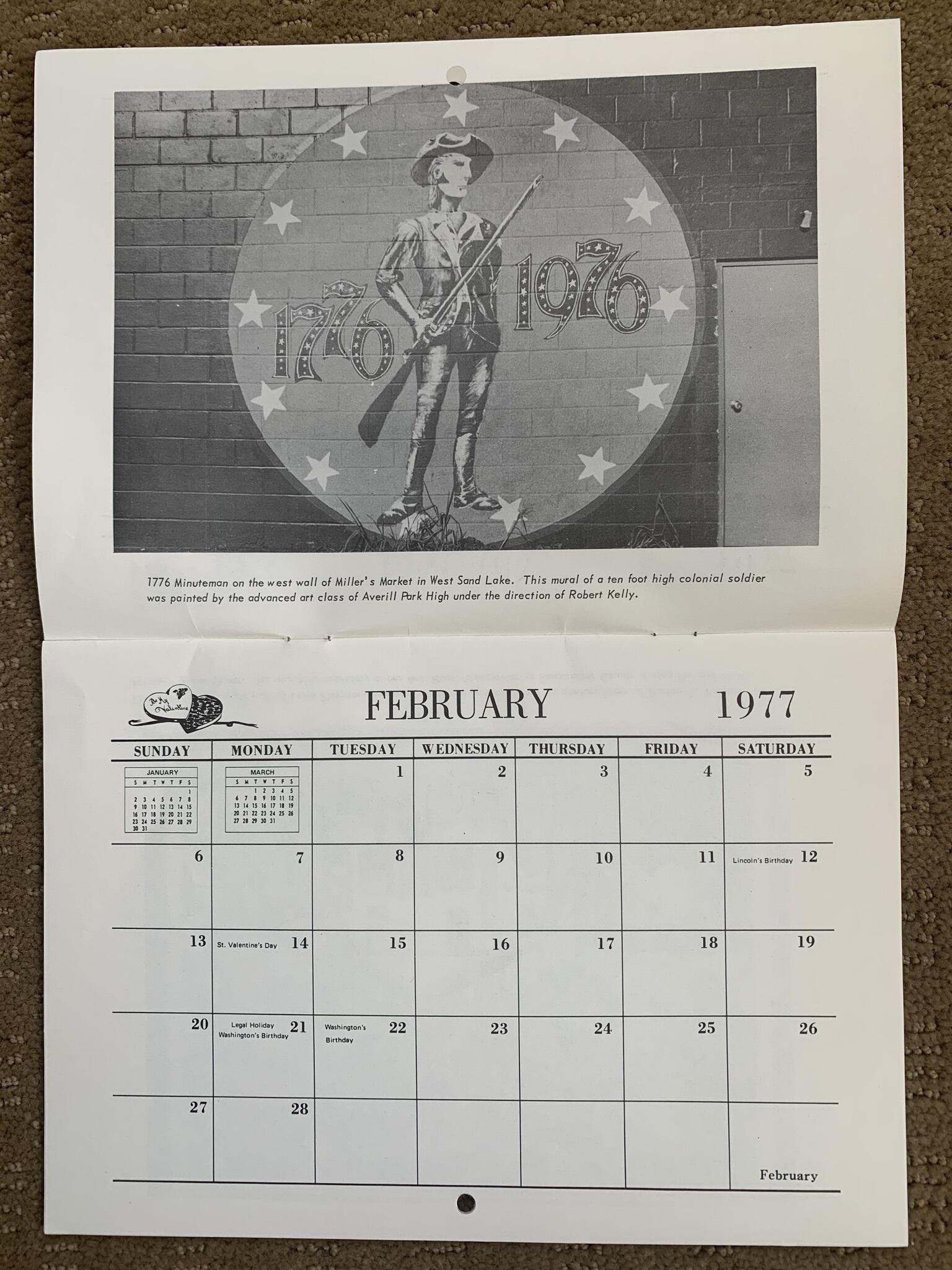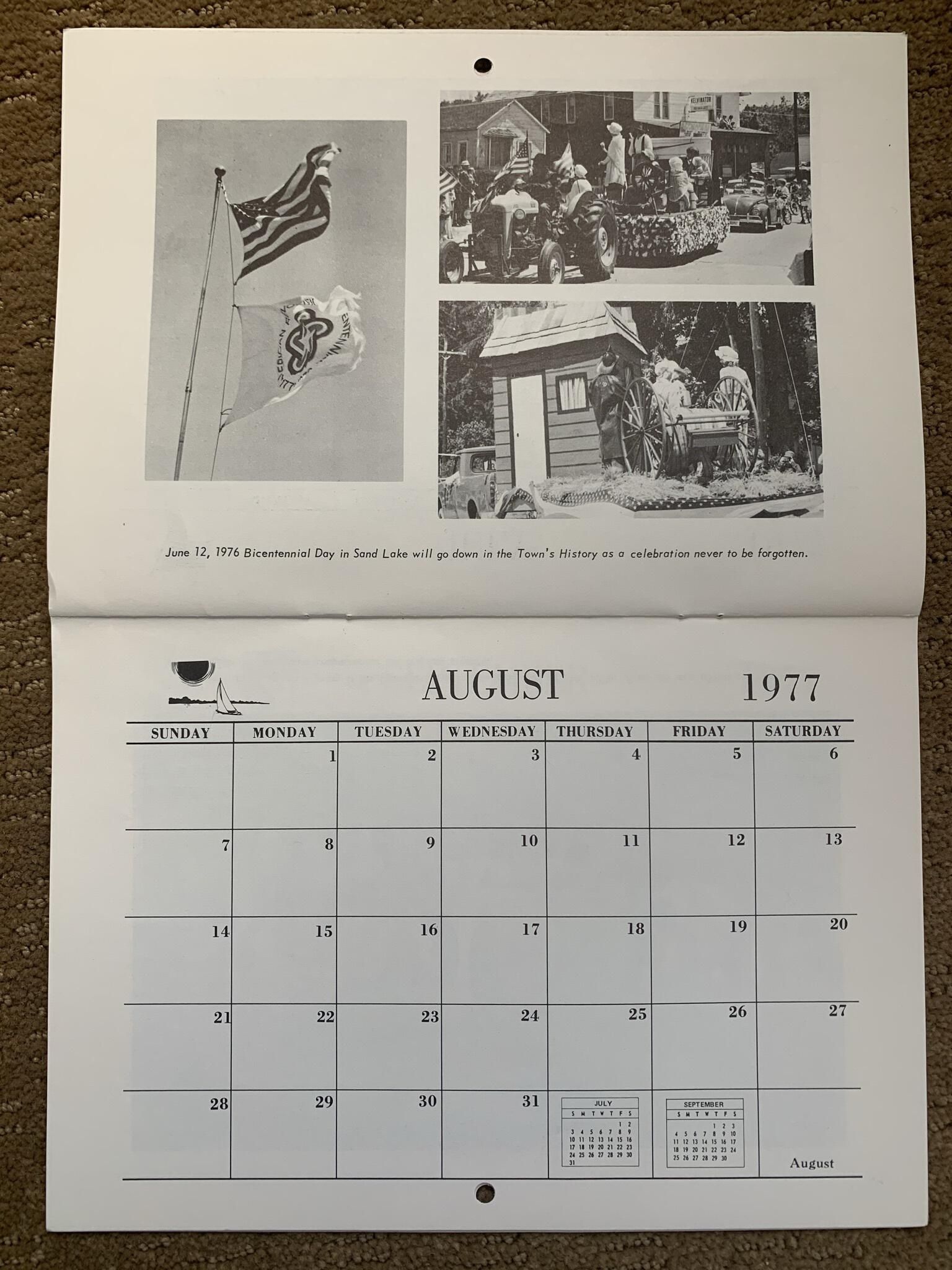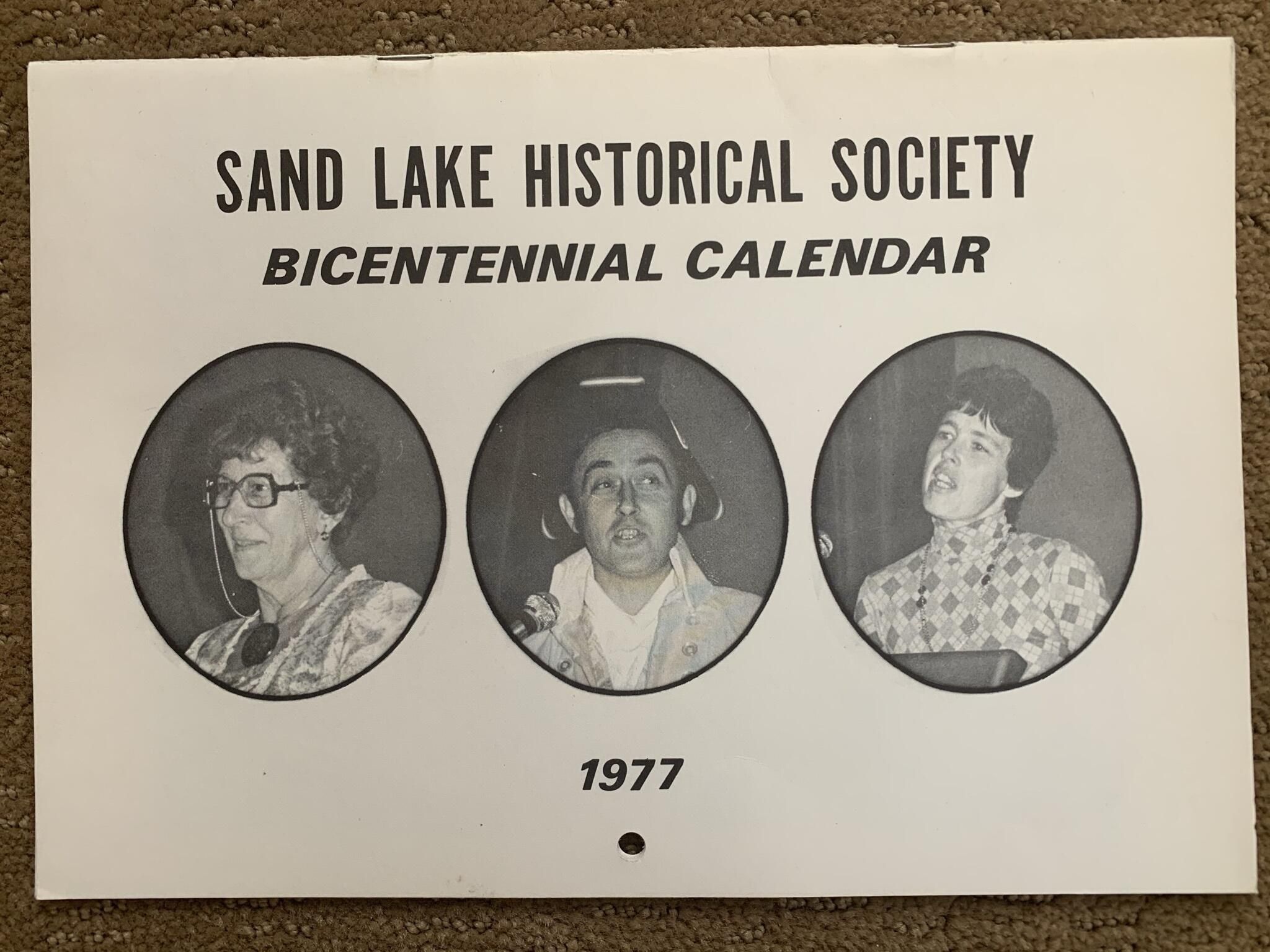 Celebratory and fund raising calendar created by the Sand Lake Historical Society in 1977 to commemorate US Bicentennial events conducted throughout the Town of Sand Lake in 1975 and 1976. SLHS had several copies remaining as of 2021, including an archival copy that is stored in Page Protector 11 of the SLHS Miscellaneous Ephemera and Artifacts binder that is located in Drawer 2 of SLHS File Cabinet 1 located on the second floor of Town Hall.Cataloged By