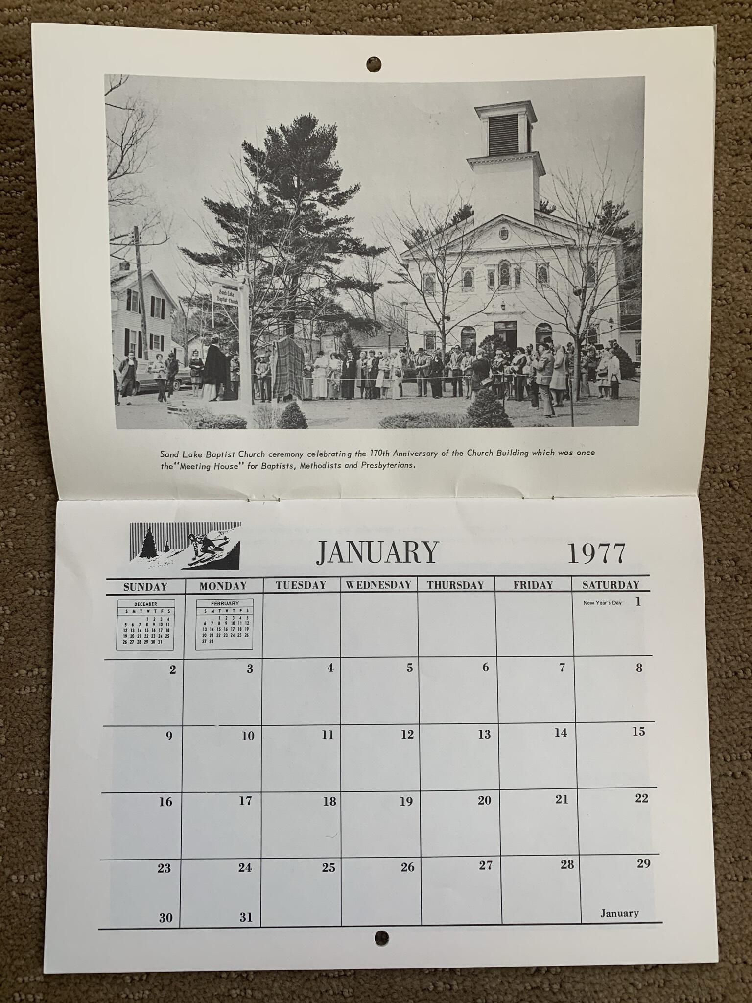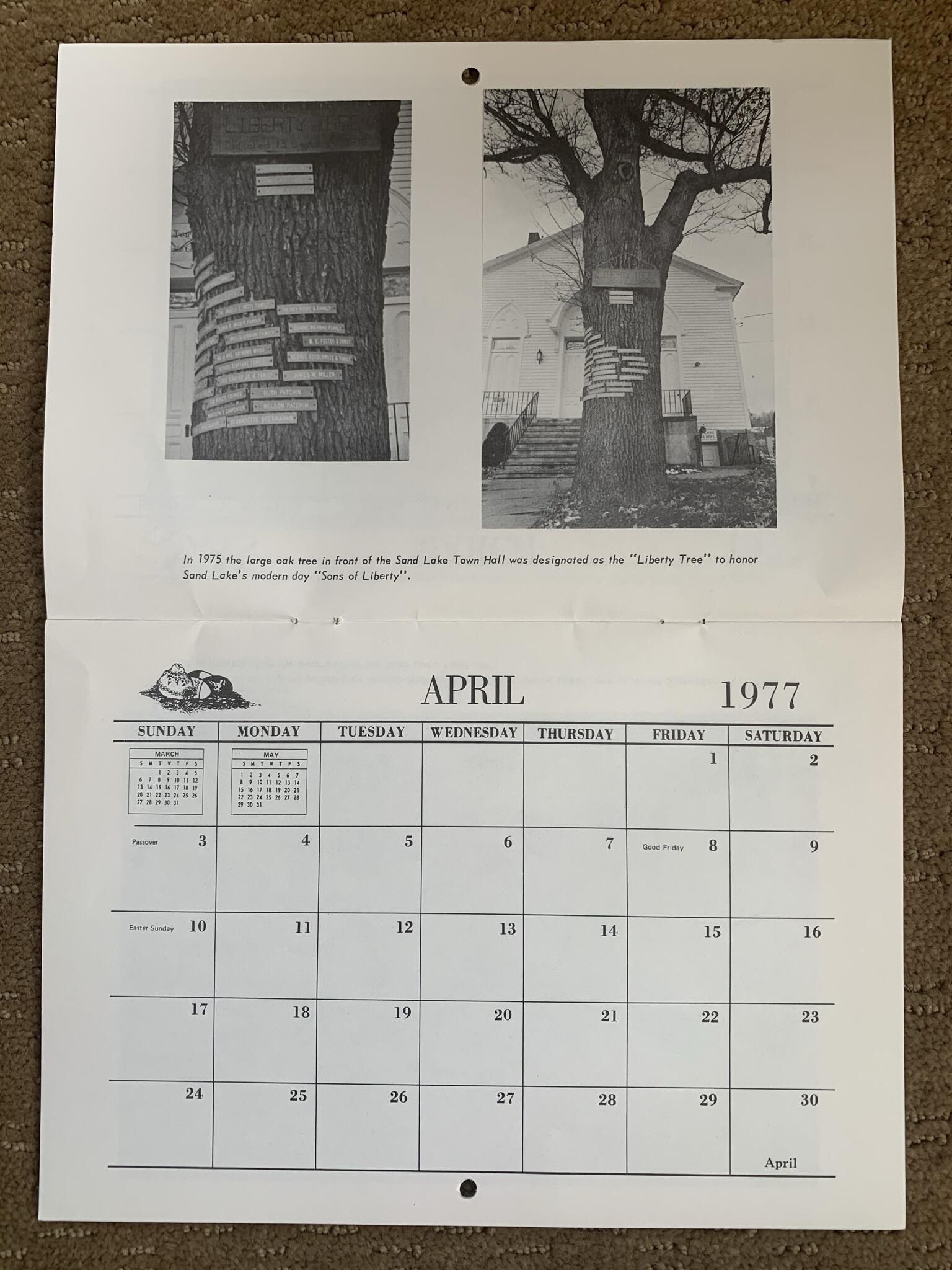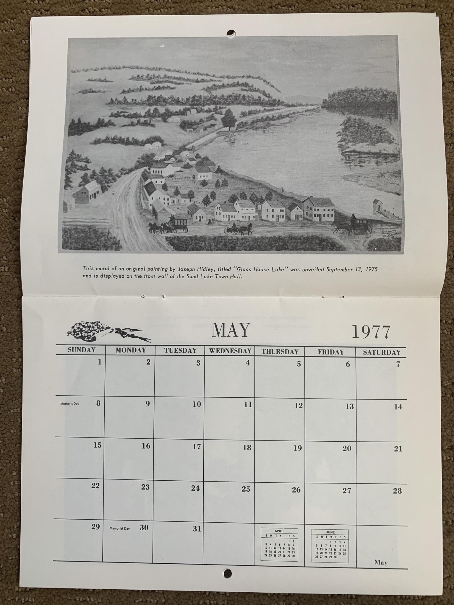 Celebratory and fund raising calendar created by the Sand Lake Historical Society in 1977 to commemorate US Bicentennial events conducted throughout the Town of Sand Lake in 1975 and 1976. SLHS had several copies remaining as of 2021, including an archival copy that is stored in Page Protector 11 of the SLHS Miscellaneous Ephemera and Artifacts binder that is located in Drawer 2 of SLHS File Cabinet 1 located on the second floor of Town Hall.Cataloged By