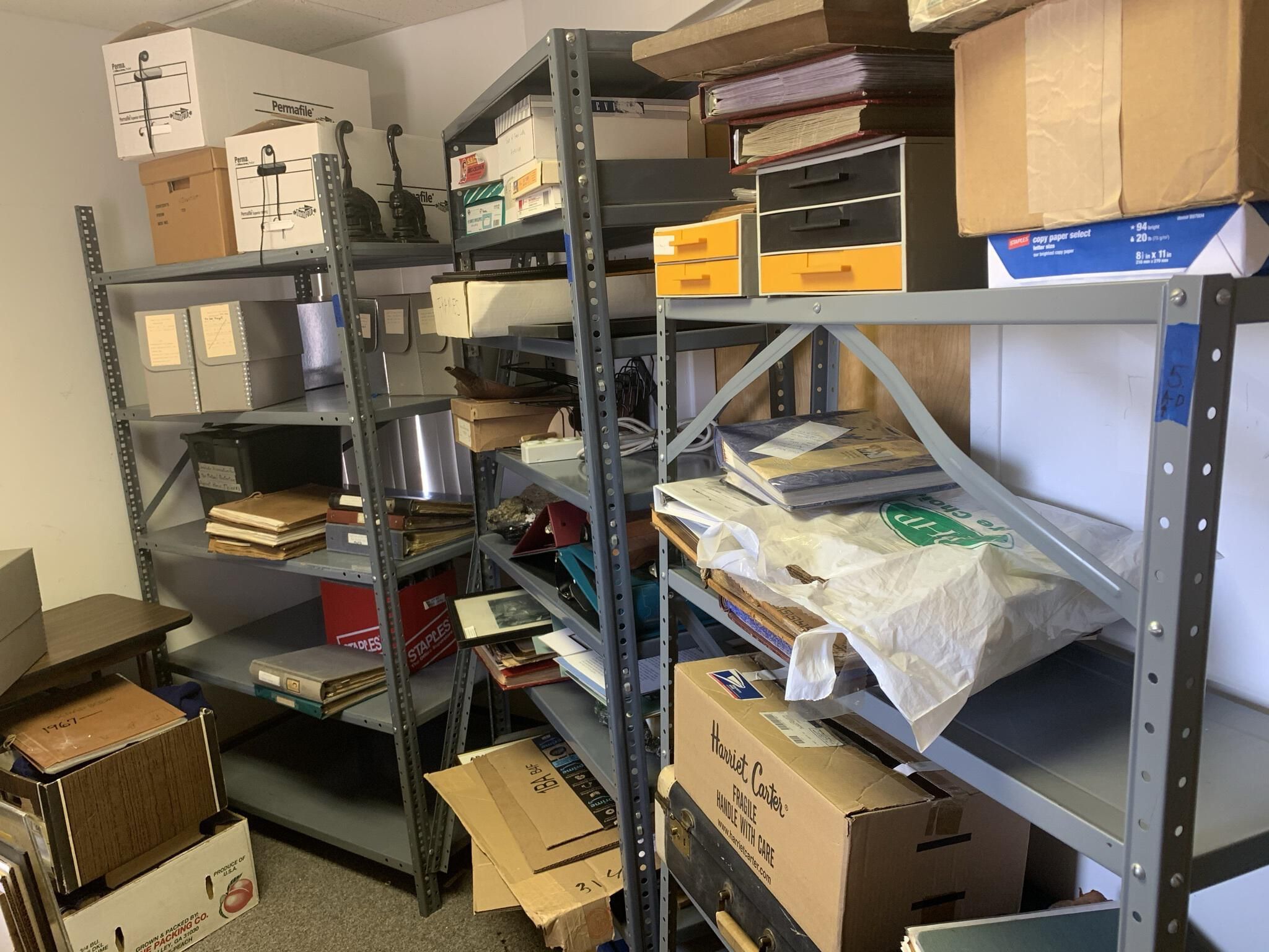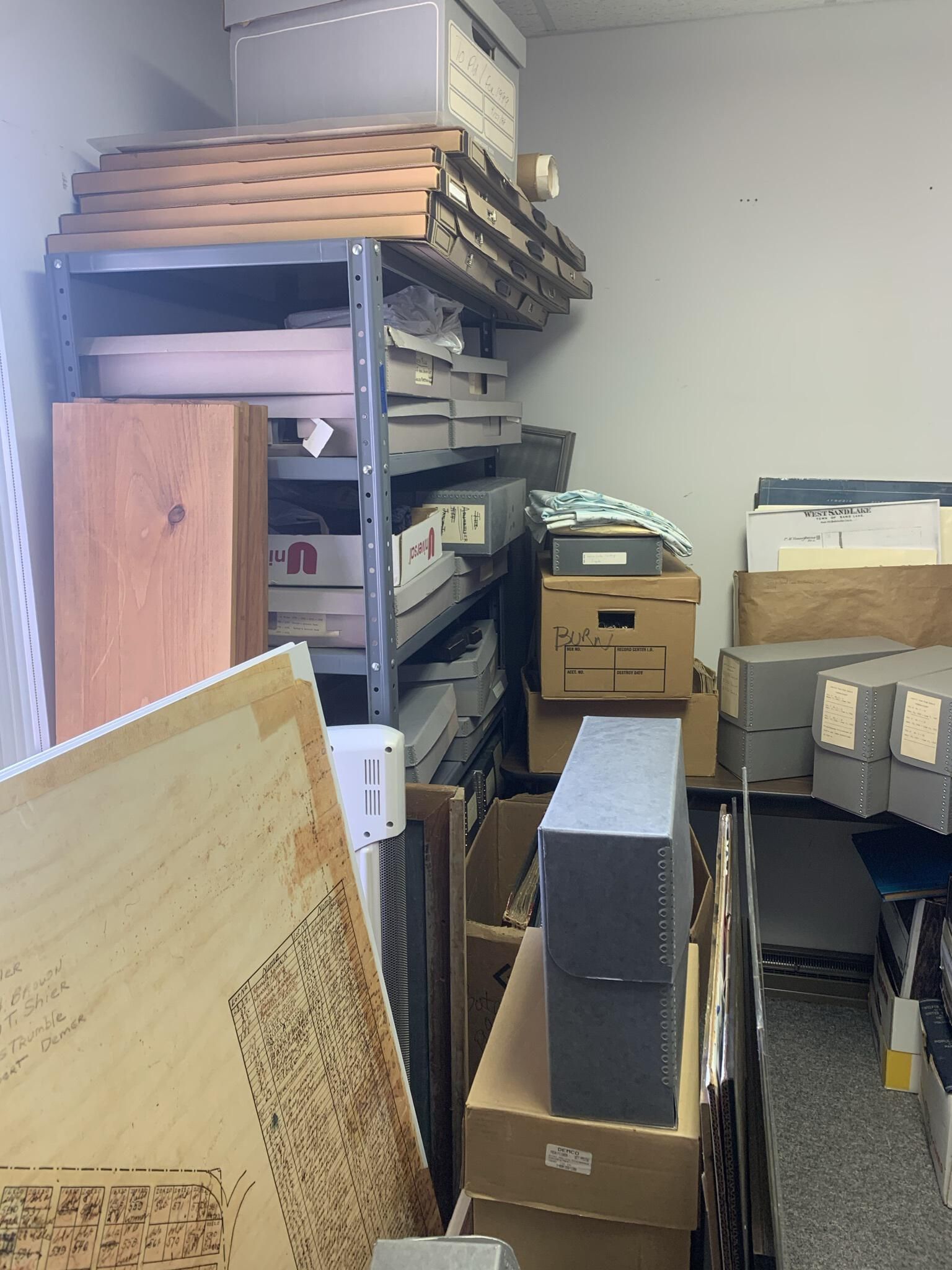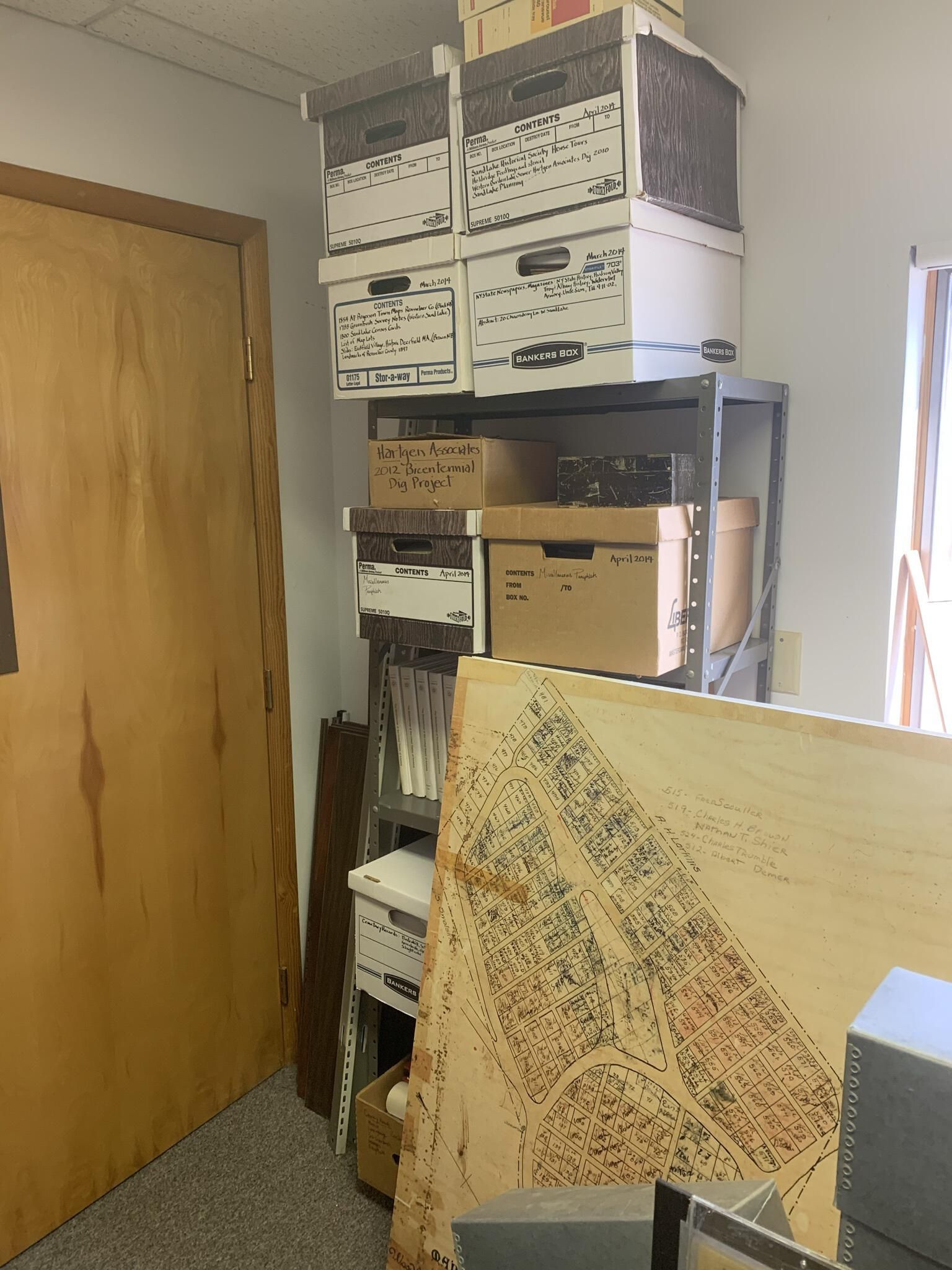 Town of Sand Lake Historian's Storeroom and storage locations. The storeroom includes five set of shelves numbered from 1 to 5 from left to right along the left and right sides of the storerooms with each shelf being lettered from "a" to up to "f." The following entries detail the general content of each of the shelf sets and shelves.Cataloged By