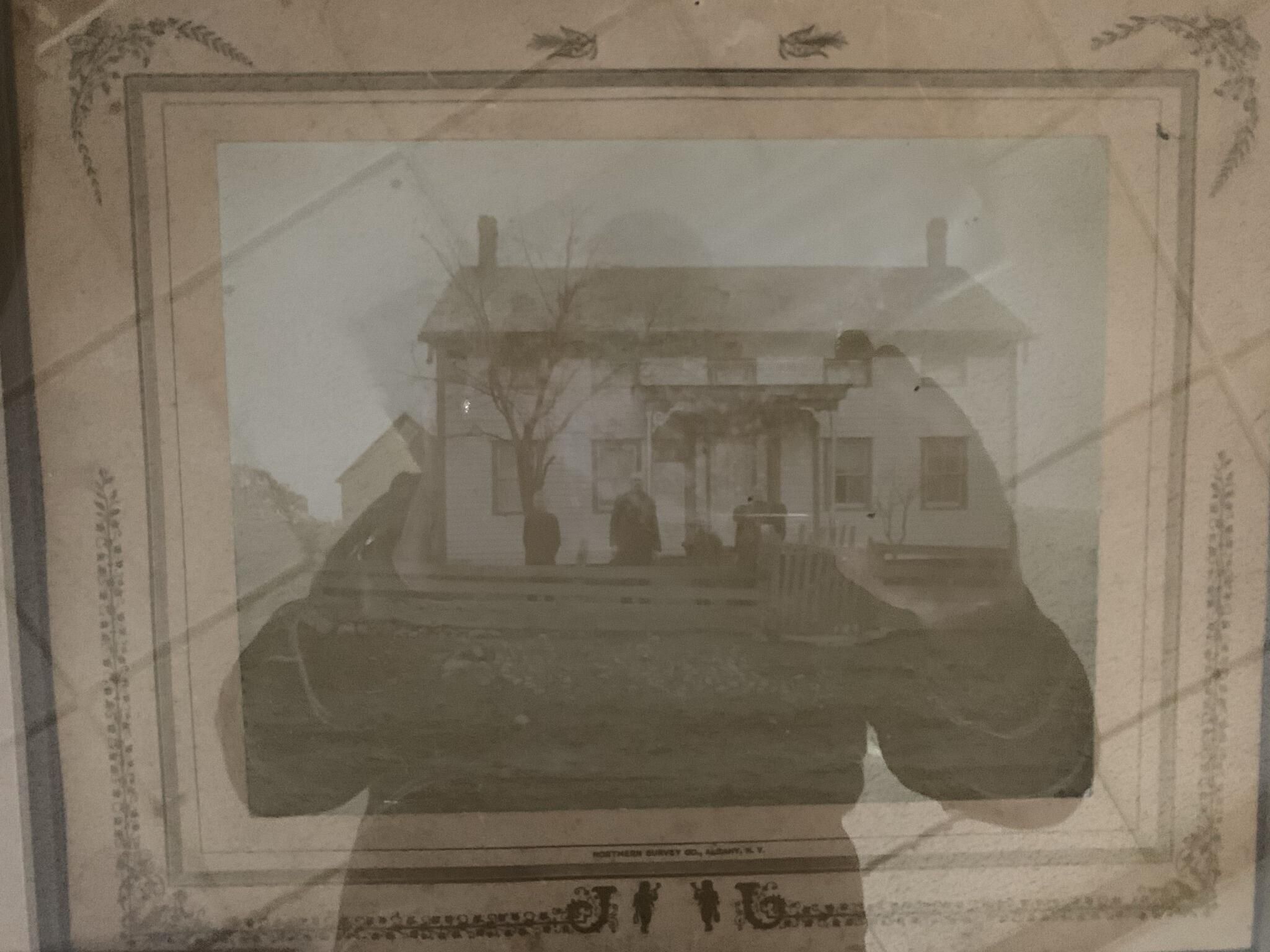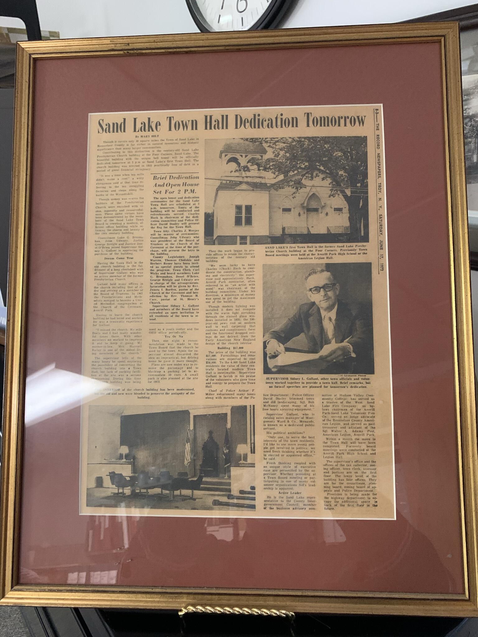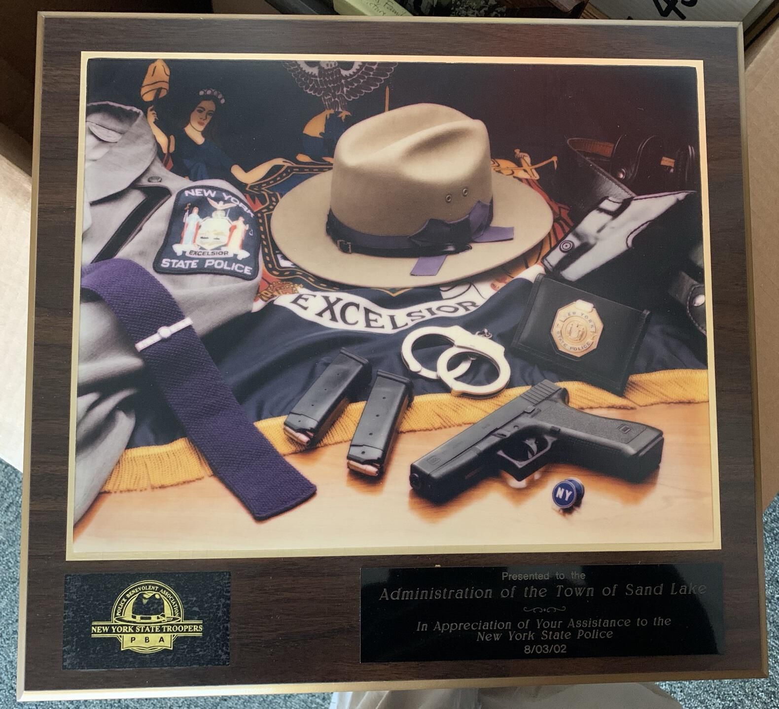 Town of Sand Lake (TOSL) owned Photo Box #1 - Cardboard box filled with miscellaneous primarily framed vintage, as well as more recent, photos and plaques that were found in various unrecorded locations throughout the Town Historian's office and storeroom. As a result, Town Historian Bob Moore and SLHS representative Michael Perry collected, photographed, and stored the various photos in a large box that is currently located under a table toward the rear of the Town Historian's storeroom on the 2nd floor of Town Hall. Some room still remains in the box. Note that several of the photos of artifacts stored in this box are redundantly included in other portions of this site as deemed appropriate with the understanding that the original photos can be found in this box and location. All of the items pictured in this entry can be found in this box and are owned by the TOSL.Context