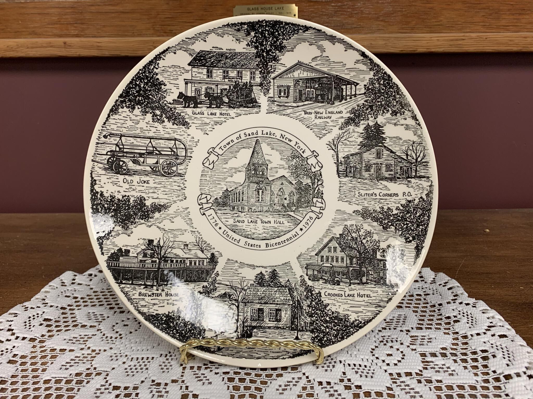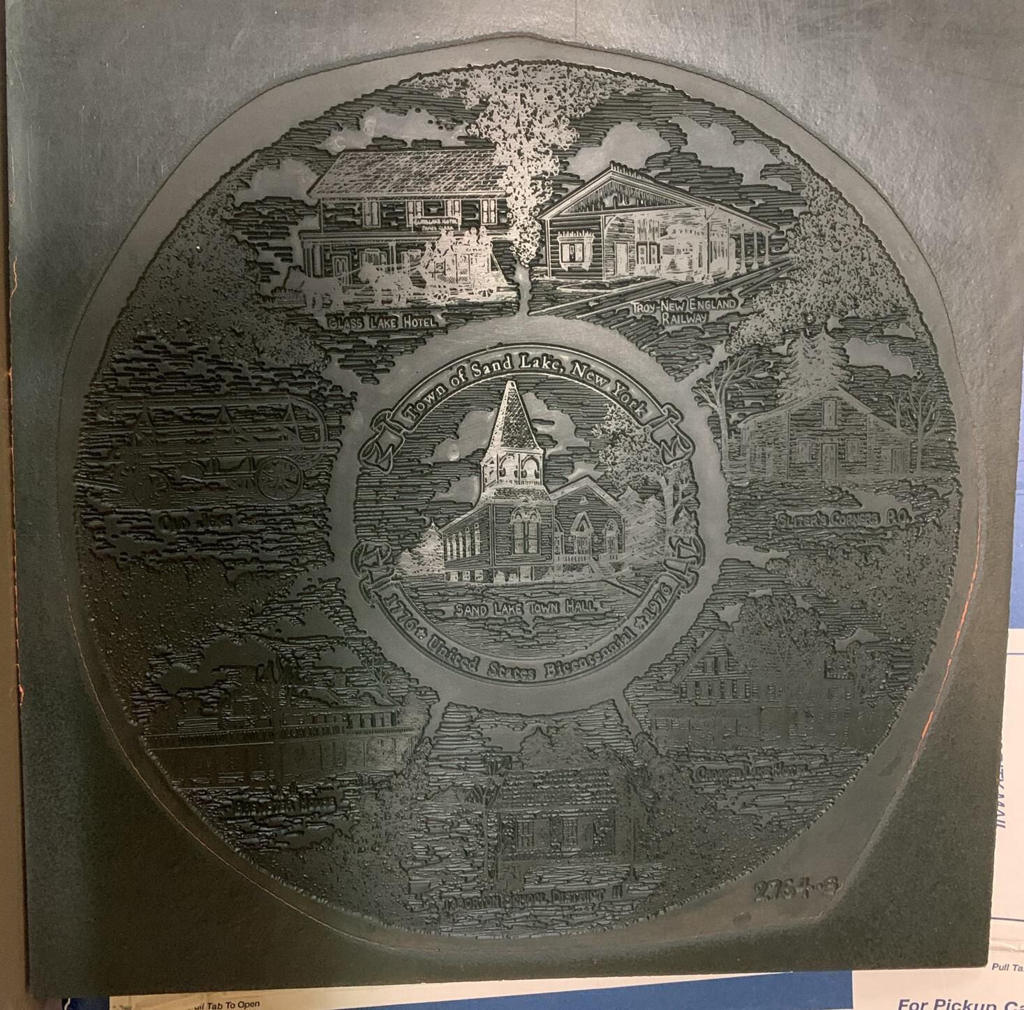 Artistic sketches used to provide the art work needed to support the design and production of a Town of Sand Lake, NY, sponsored ceramic plate and postcards to help commemorate the Bicentennial of the United States in 1976. All of the sketches are currently hanging just outside of the lunch room on the first floor of Town Hall.Context
