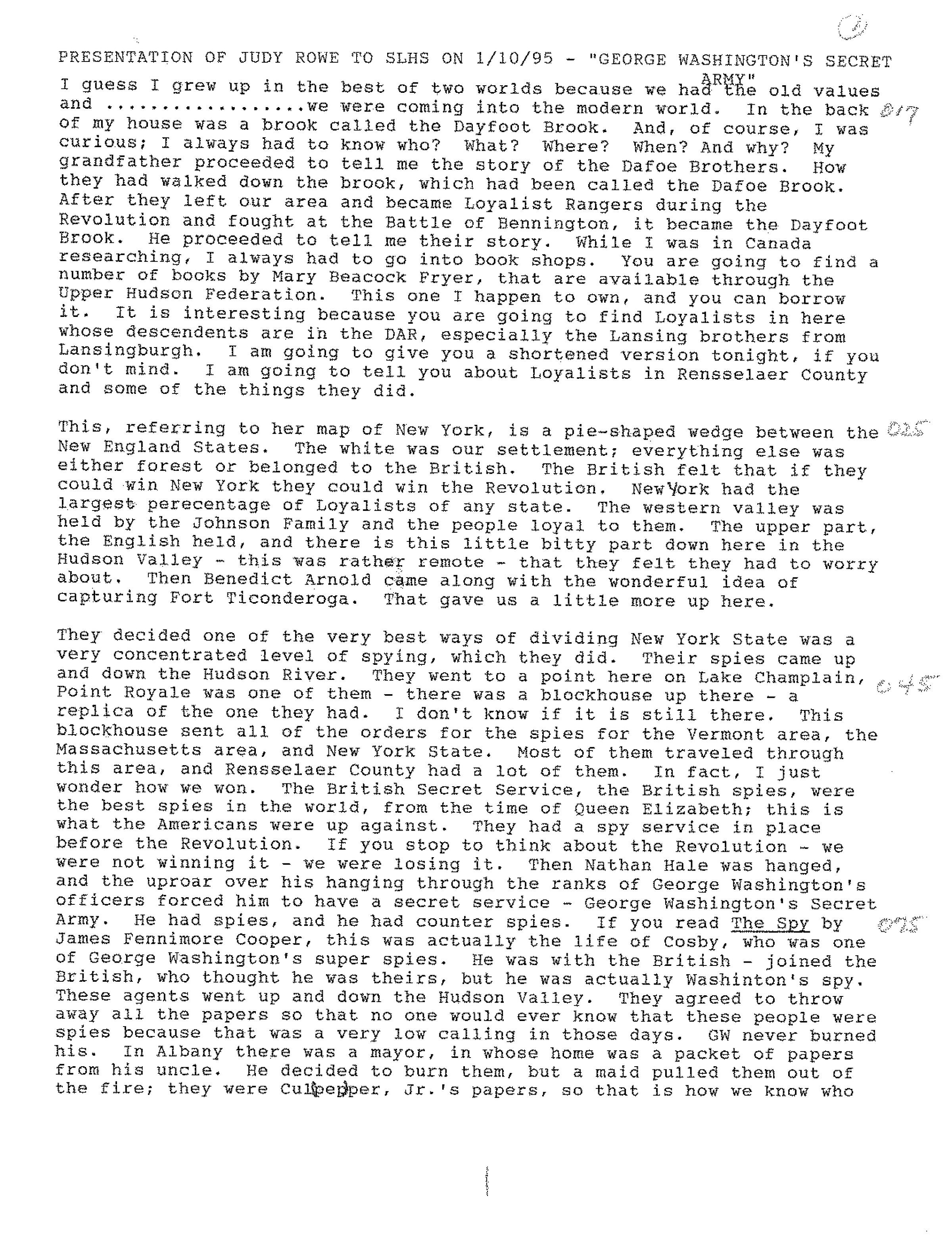 Nine-page PDF of a transcript and research notes from a 1995 SLHS program presentation by Judy Rowe entitled, "Washington's Secret Army," of spies. The presentation highlights the story covered in greater detail by the AMC documdrama television series, "Turn," from 2014 through 2017. However, Judy addressed the story long before it became such a hot topic. The PDF is downloadable while fully logged into the system. The original document is stored in Blue Presentations Folder 2 and located in drawer 3 of SLHS File Cabinet 5.Cataloged By