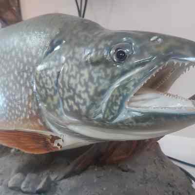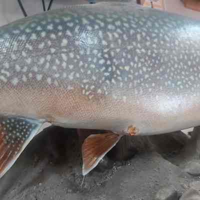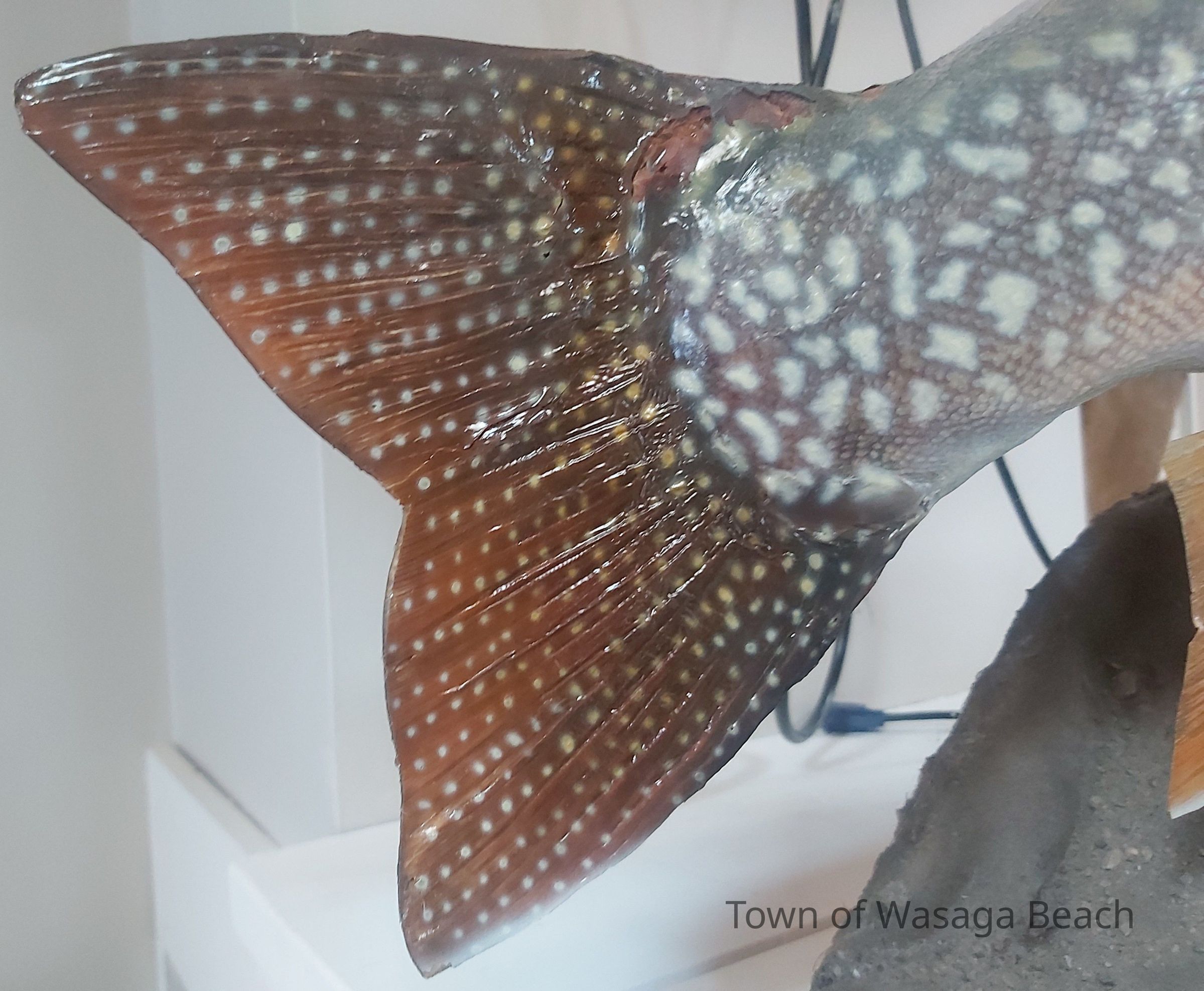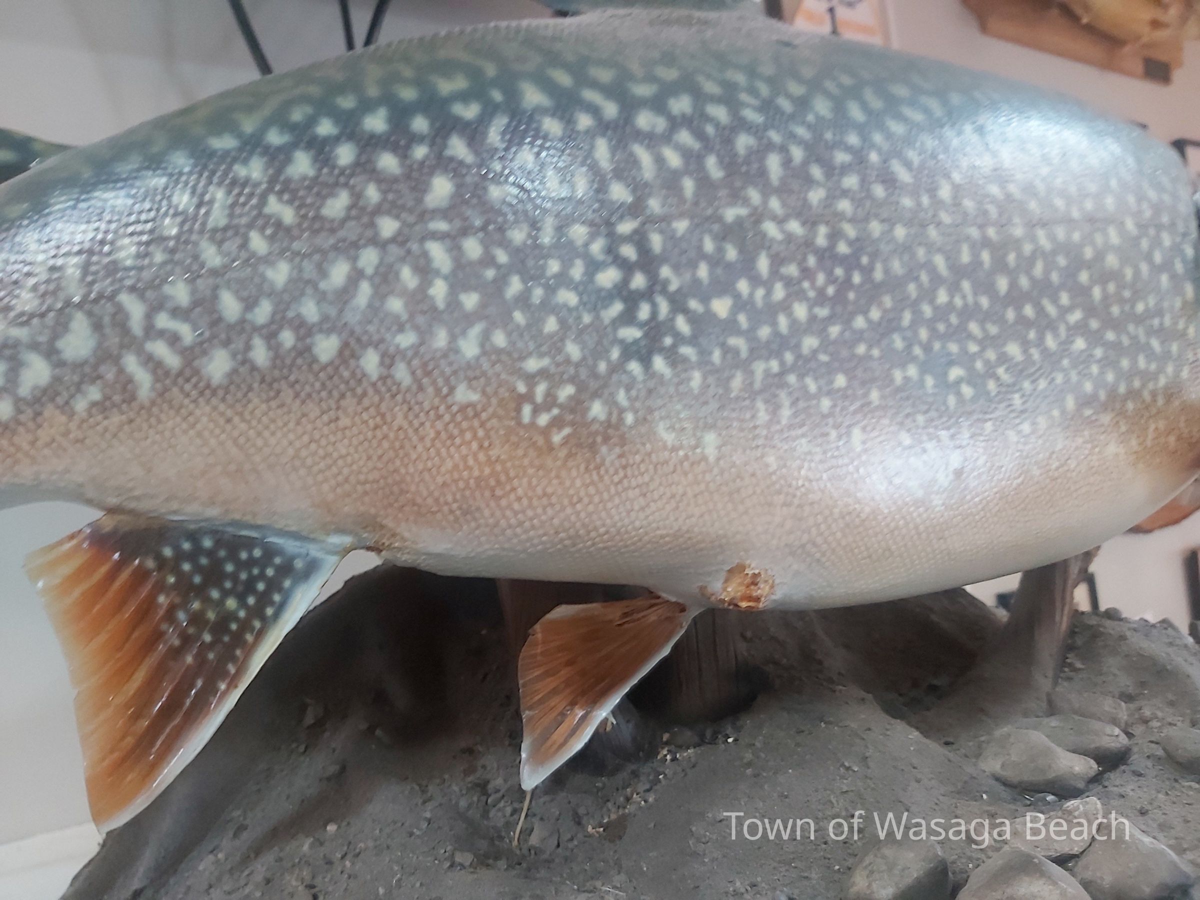 The mounted, World Record splake, weighing 9.39 kg (20 lb 11 oz) was caught by Paul S. Thompson on May 17, 1987 in Georgian Bay. The World Record was awarded by the International Game Fish Association certifying that Paul S. Thompson "has been awarded a world angling record for a catch of the heaviest fish of a species in an approved line class category, and that the catch was made in accordance with international angling regulations" (information from certificate awarded). The splake is mounted to a large driftwood base. A stamp on the back of the wood base reads "Bush Taxidermy Studio, Wasaga Beach".