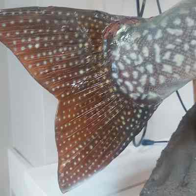 Dimension are approximate as displayed. The depth, including the tip of the top fin to tip of the bottom fin, is approximately 13.5". The depth, not including the fins, is approximately 8.75". The width of the fish (side to side) is approximately 3.5".Height