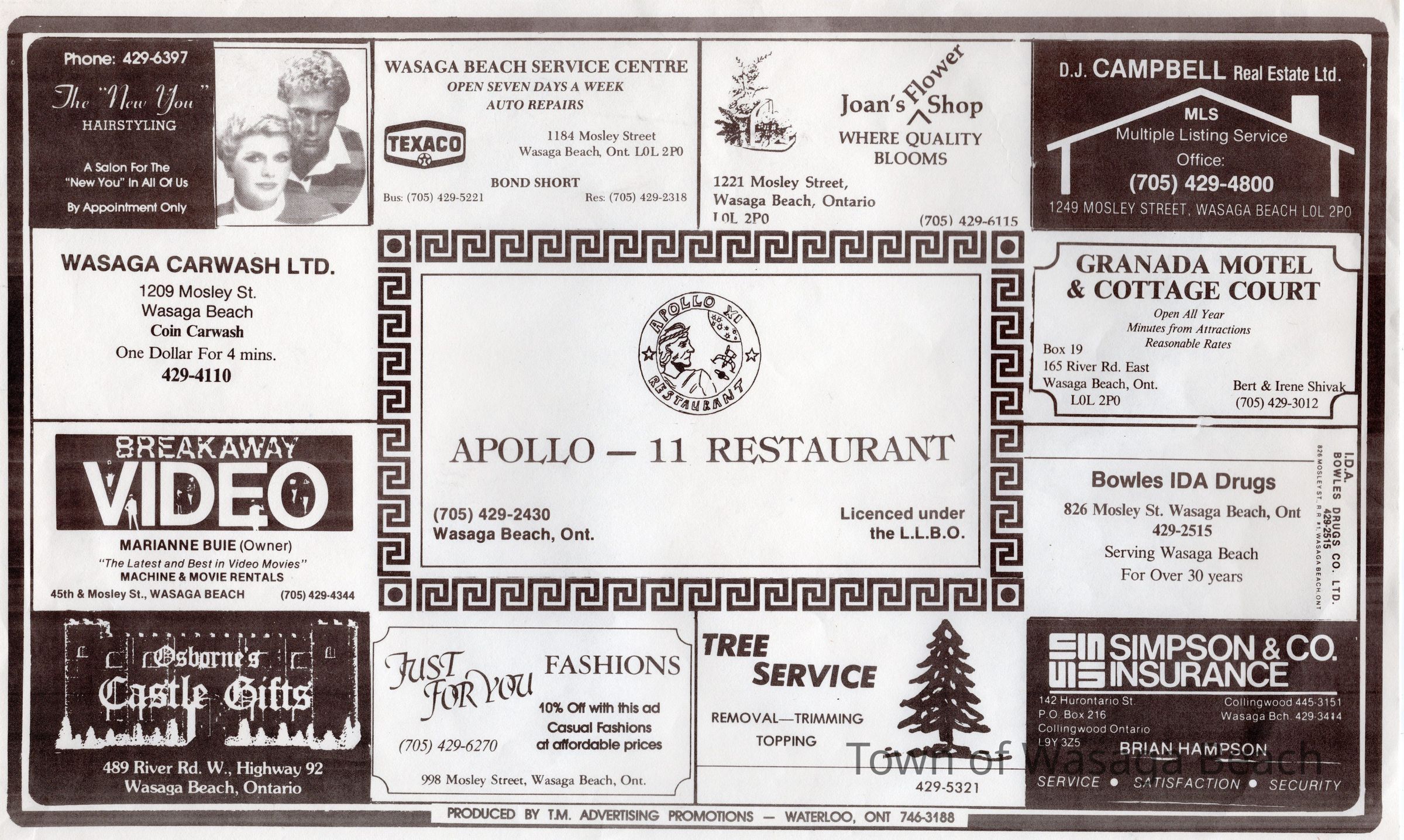 Placemat from the Apollo 11 Restaurant featuring area businesses. The Apollo was located where the Riverbend Plaza (McDonald's & Tim's) is now located. The Apollo was demolished in the 1980's. The owner of the Apollo was "Jimmy".