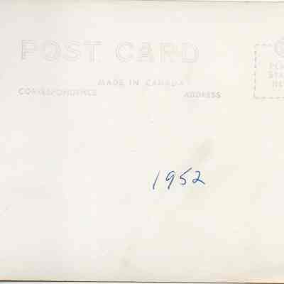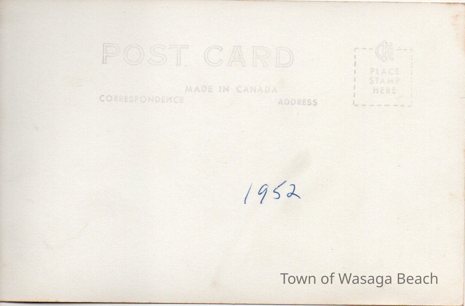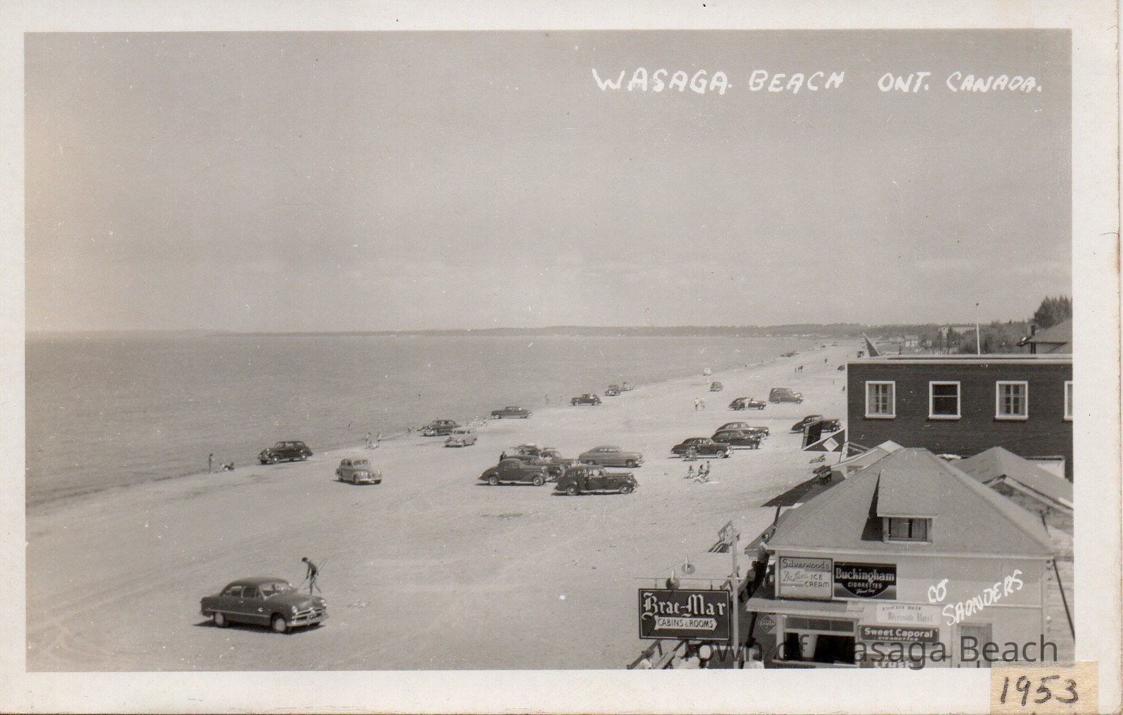 Picture of Wasaga Beach beachfront with cars driving and parked along the beach and close to the water. The sign "Brae-Mar Cabins and Rooms" can be seen on a building in the photo. The front of the postcard has a label "1953". The back of the postcard has a handwritten "1952" in blue pen.Acquisition