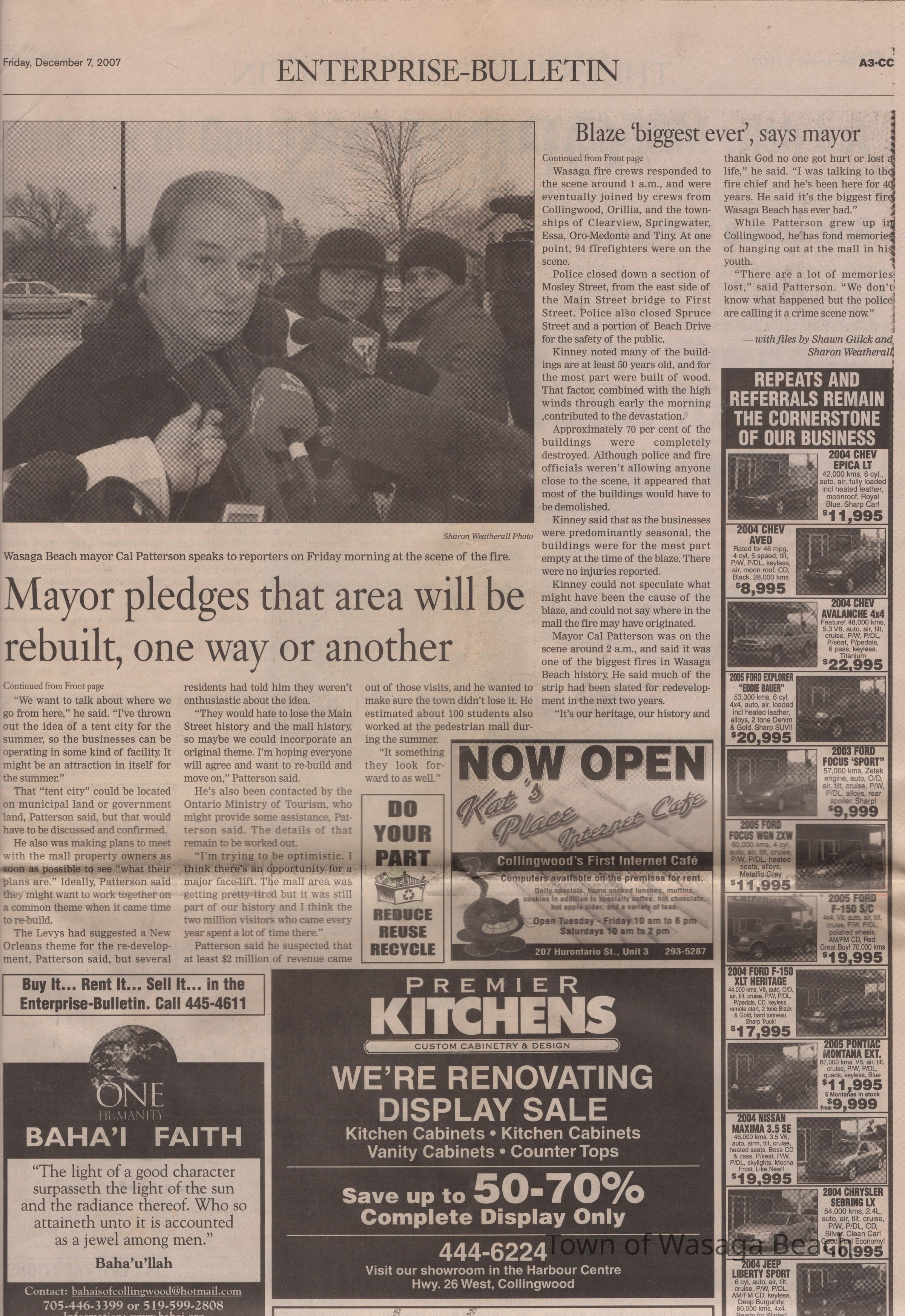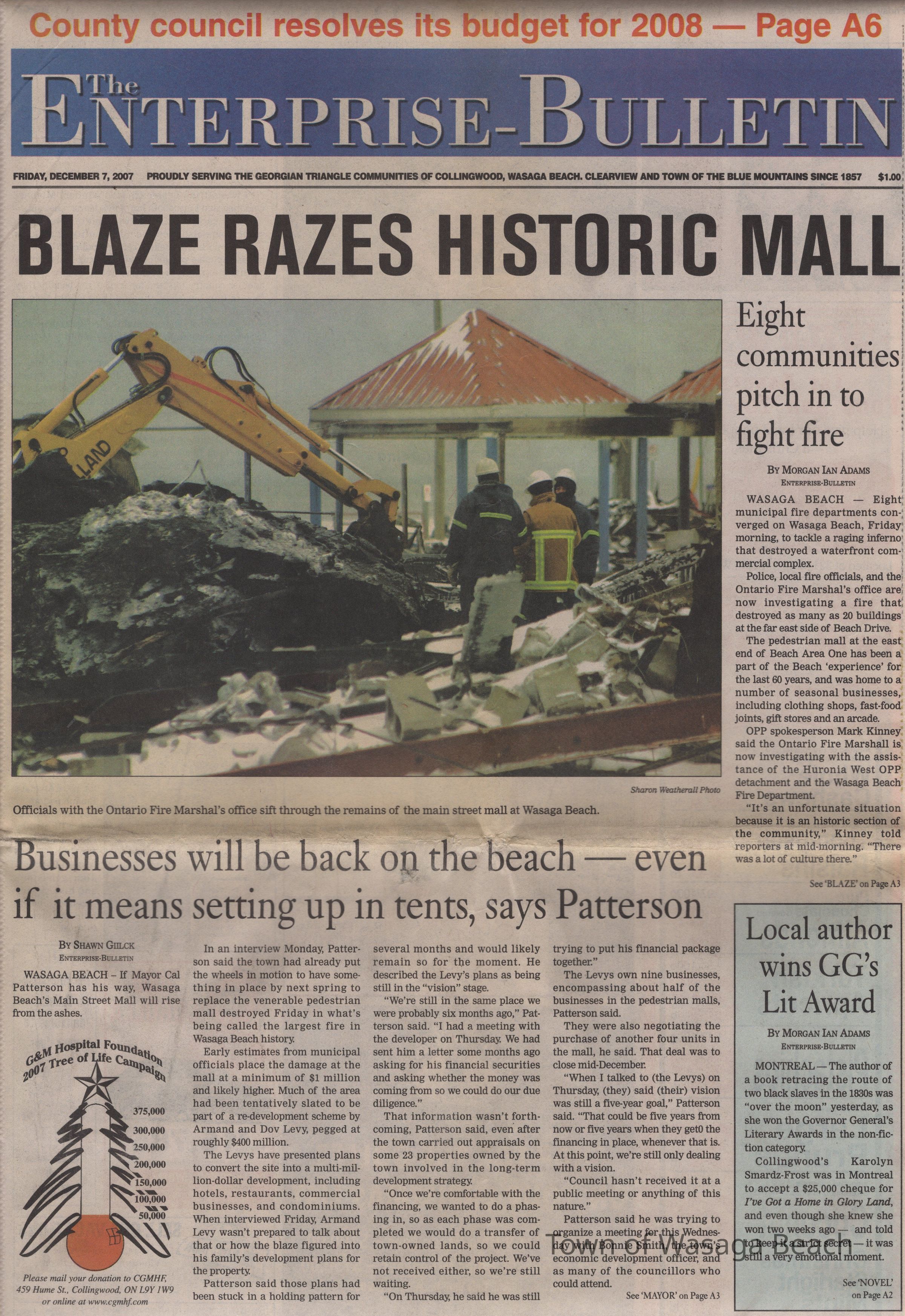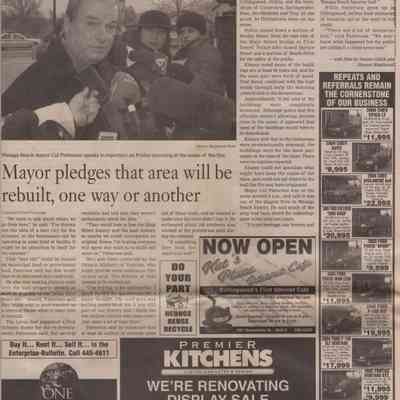 The article "Businesses will be back on the beach - even if it means setting up in tents, says Patterson", by Shawn Gilck, Enterprise Bulletin, Mayor Cal Patterson discusses the plans to rebuild the area after the fire.Acquisition