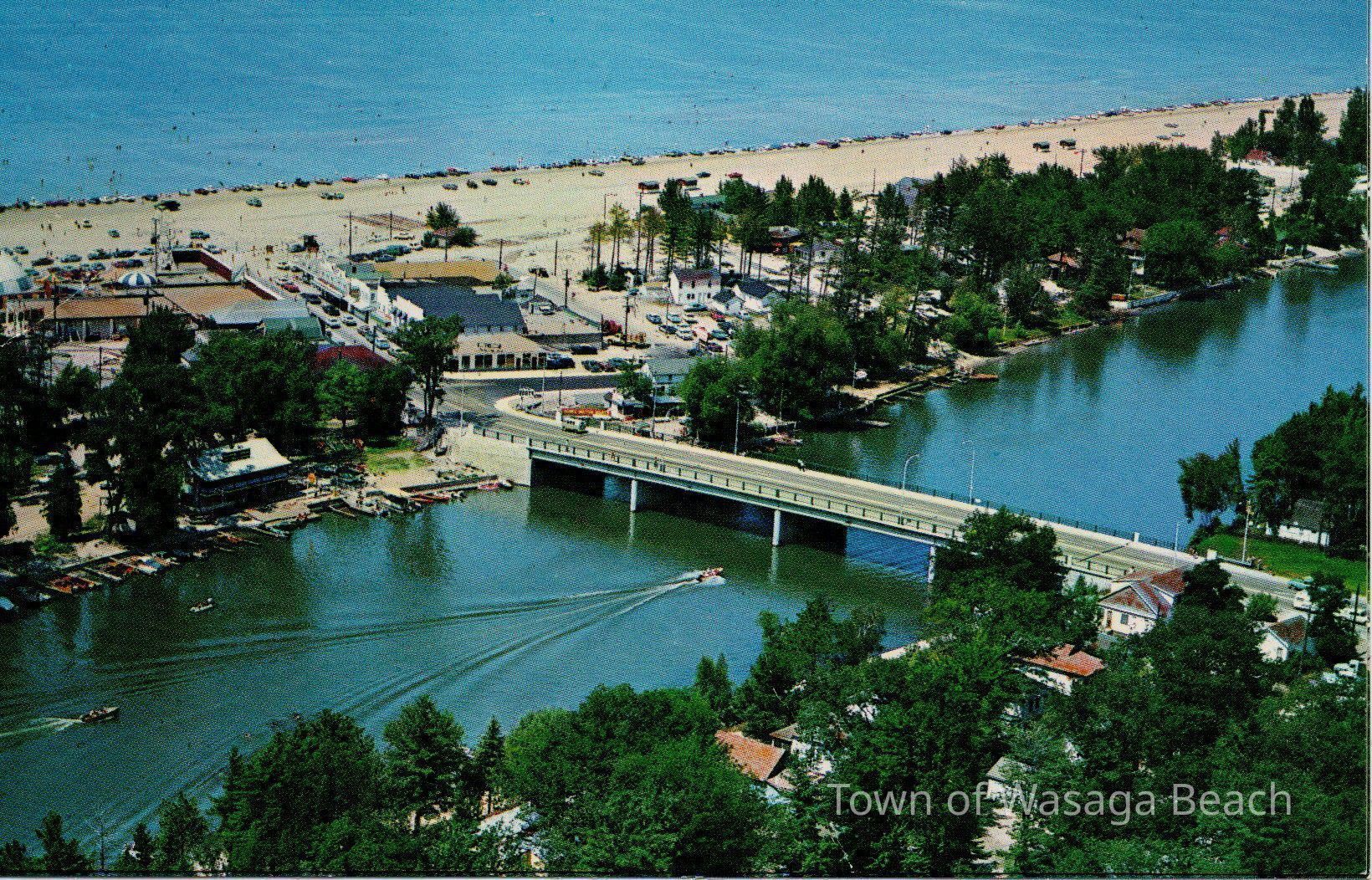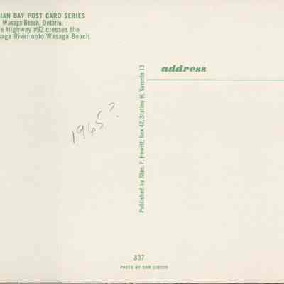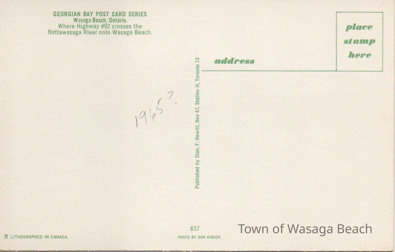 Colour photo showing the river, bridge, Main St., beach and bay with buildings along the spit, c.1965 is printed in pencil on the back of the postcard. Photo by: Dan GibsonAcquisition