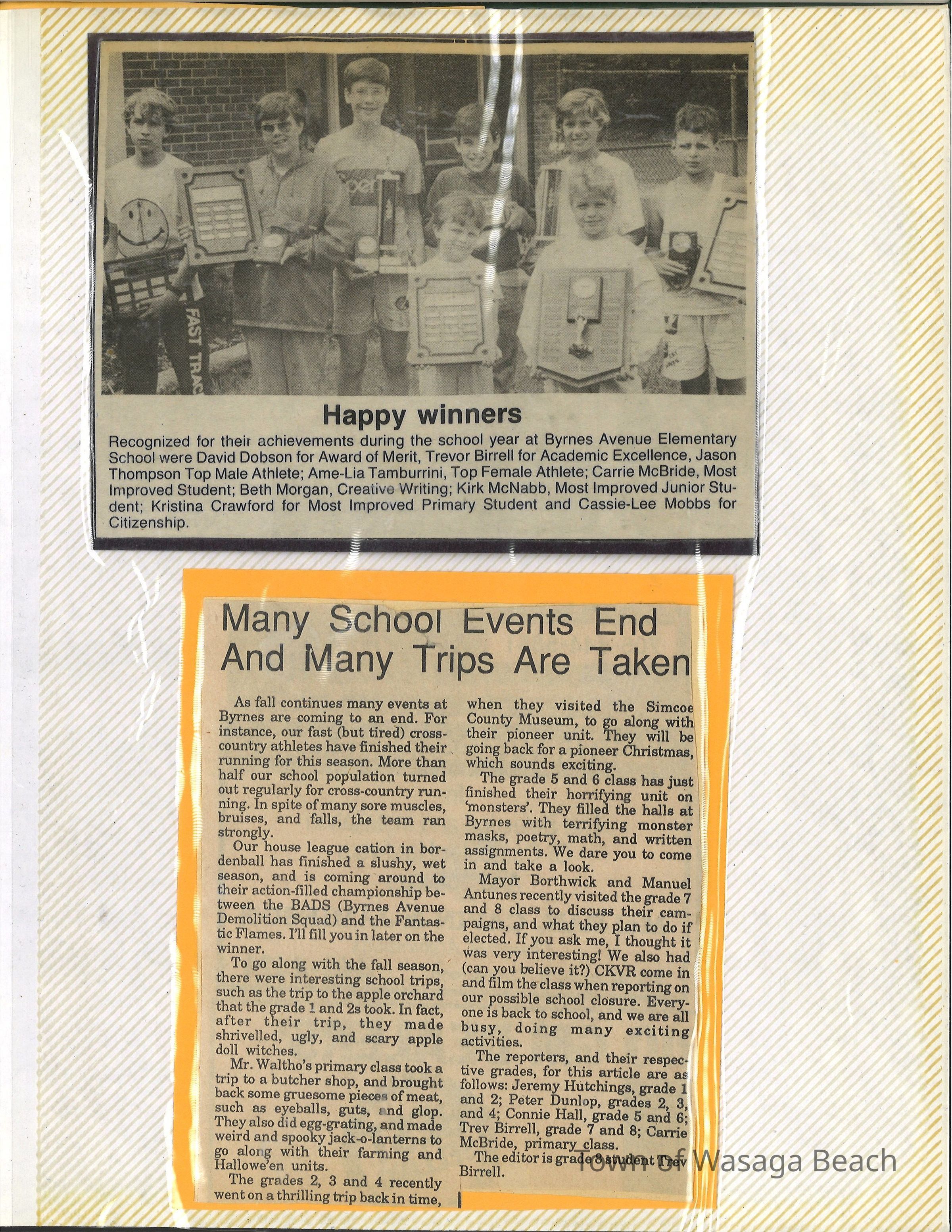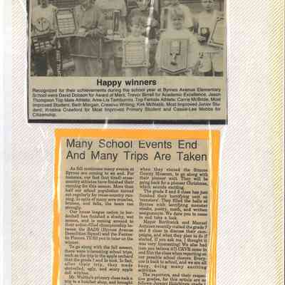 A collection of newspaper clippings about various activities, events and programs at Byrnes Avenue School, 1988-89