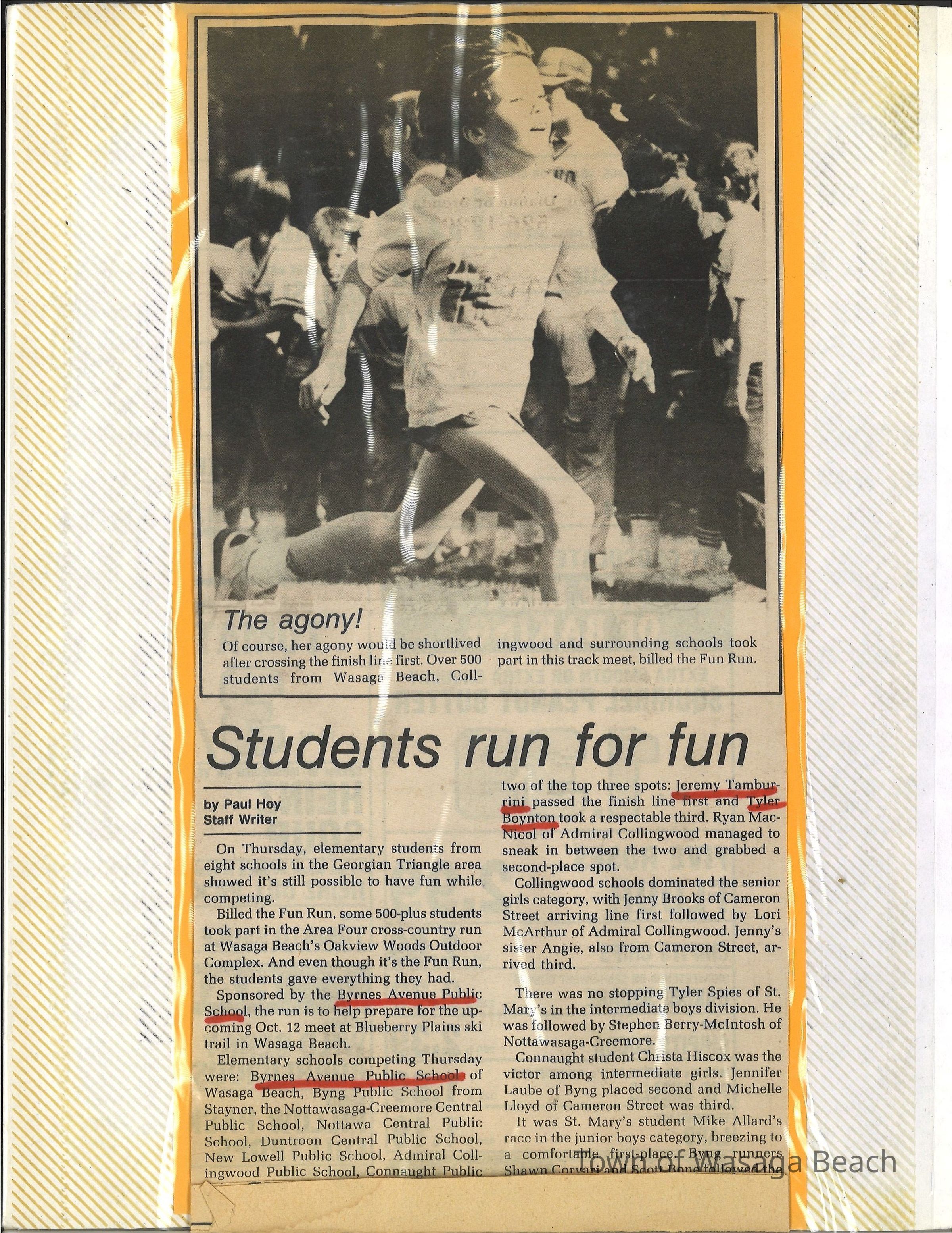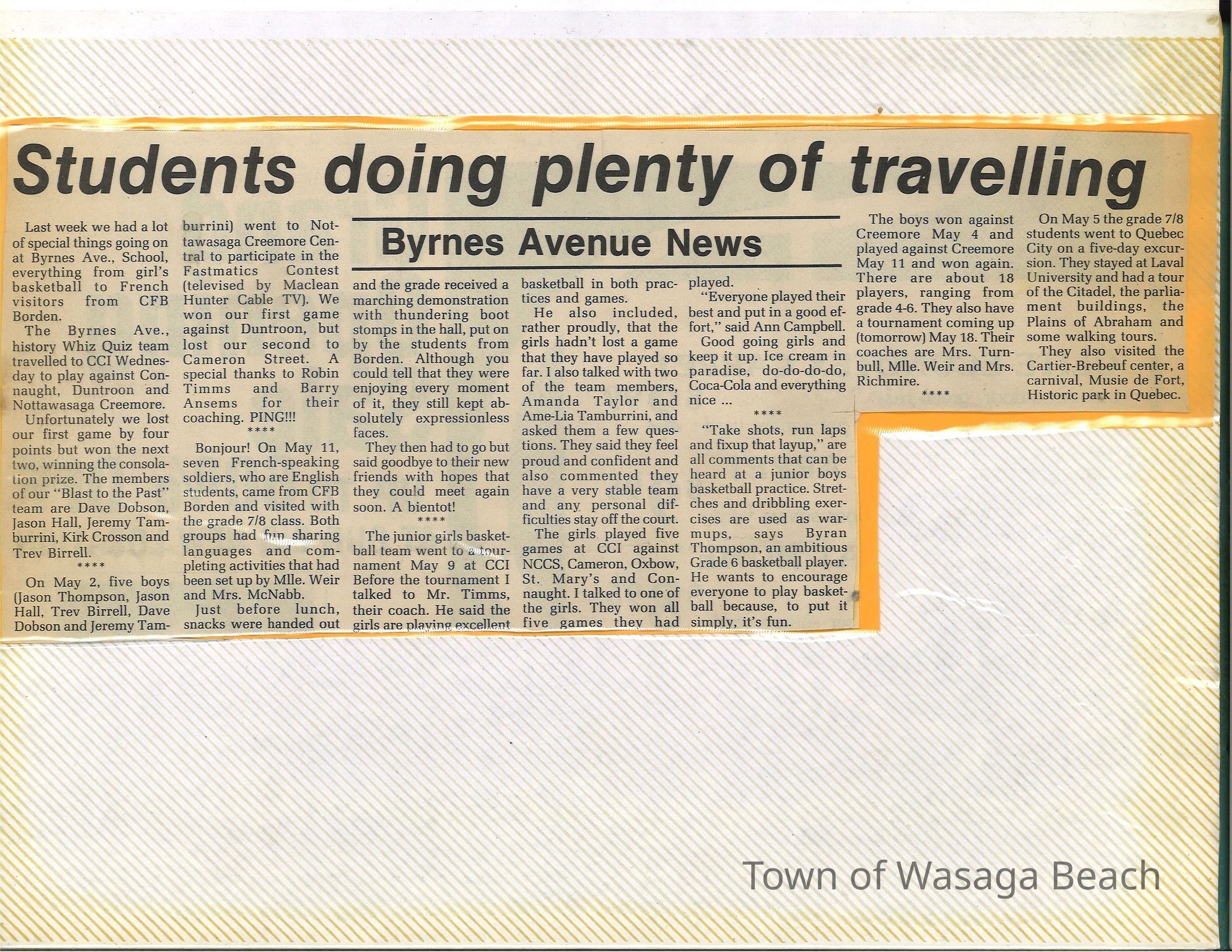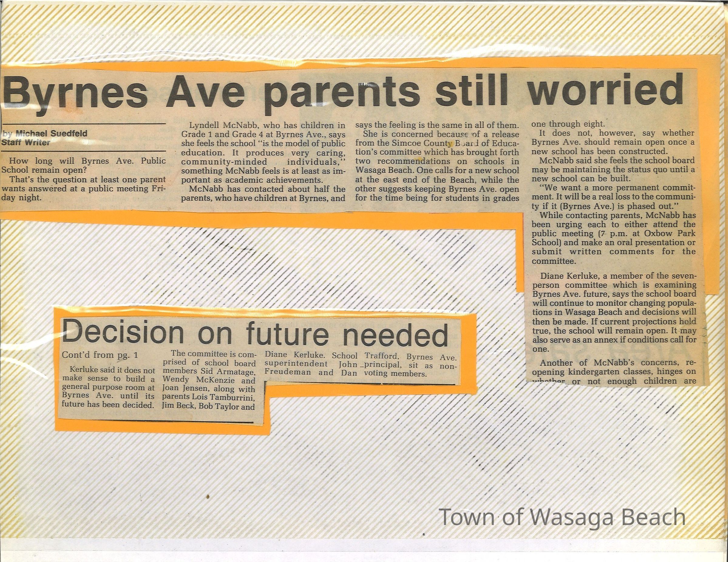 “Byrnes Avenue School was constructed as a two-room school by the Nottawasaga Township School Board in 1940 and contained Grades 1-6. It was named Byrnes Avenue School due to its location on Byrnes Avenue (now Mosley Street). From 1954-60, students from both Buckingham and Fisher Public Schools began attending Byrnes Avenue School. Students from Baywood Public School were added when that school was closed in 1971. An addition was built after 1963, and in later years, portables were added, as well as the “Bubble” gymnasium. Byrnes was twinned with Oxbow Park School from 1974-78, then later permanently twinned when Oxbow Park was renamed Worsley Elementary School. The School was closed in 1994 and subsequently purchased by the Wasaga Beach Christian School.”Acquisition