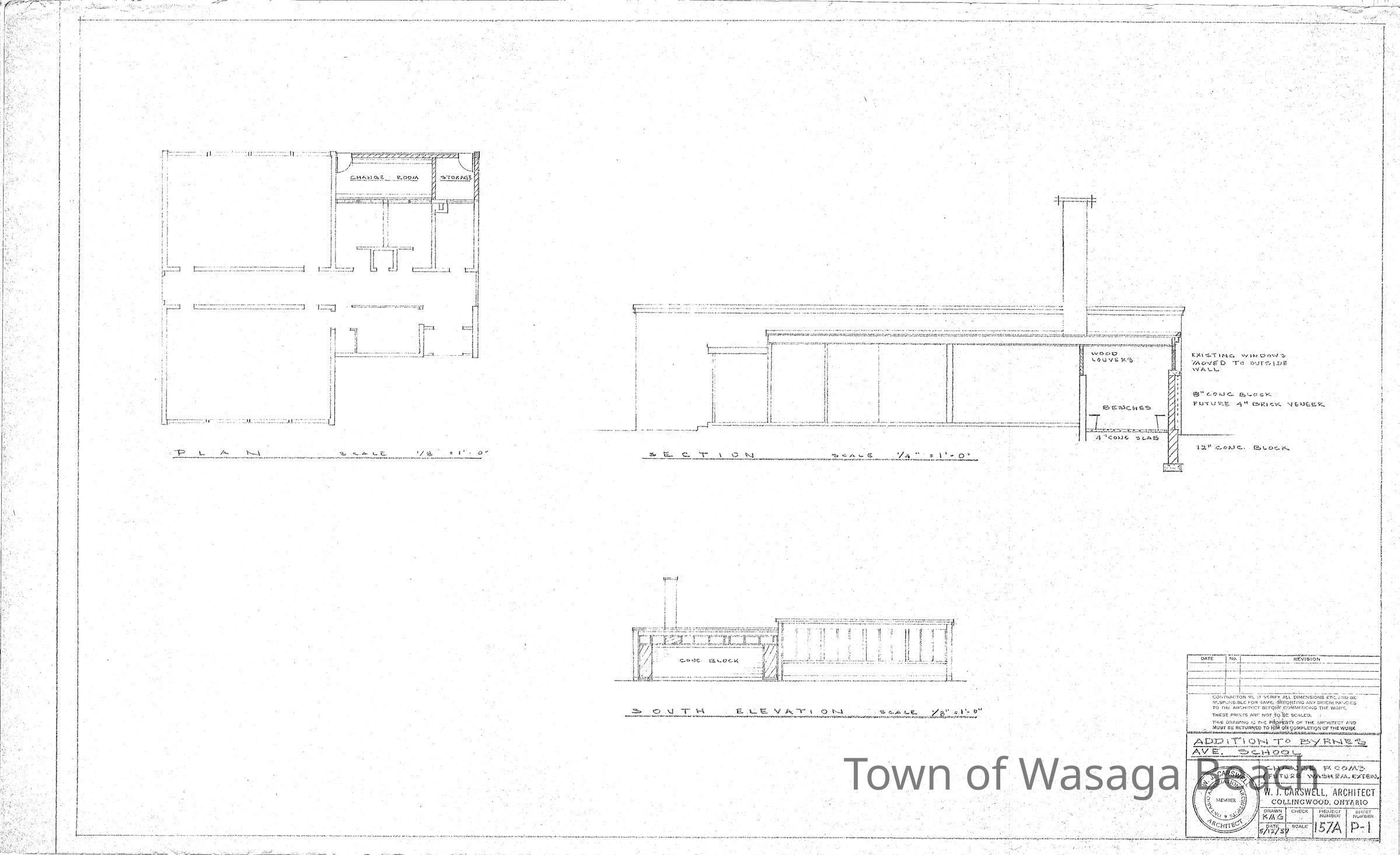Two drawings for Byrnes Avenue School created by W.J. Carswell, Architect, showing proposed change rooms and washroom extension, Sheet #P-1, 1957 and proposed addition of two classrooms and two future classrooms, 1963.