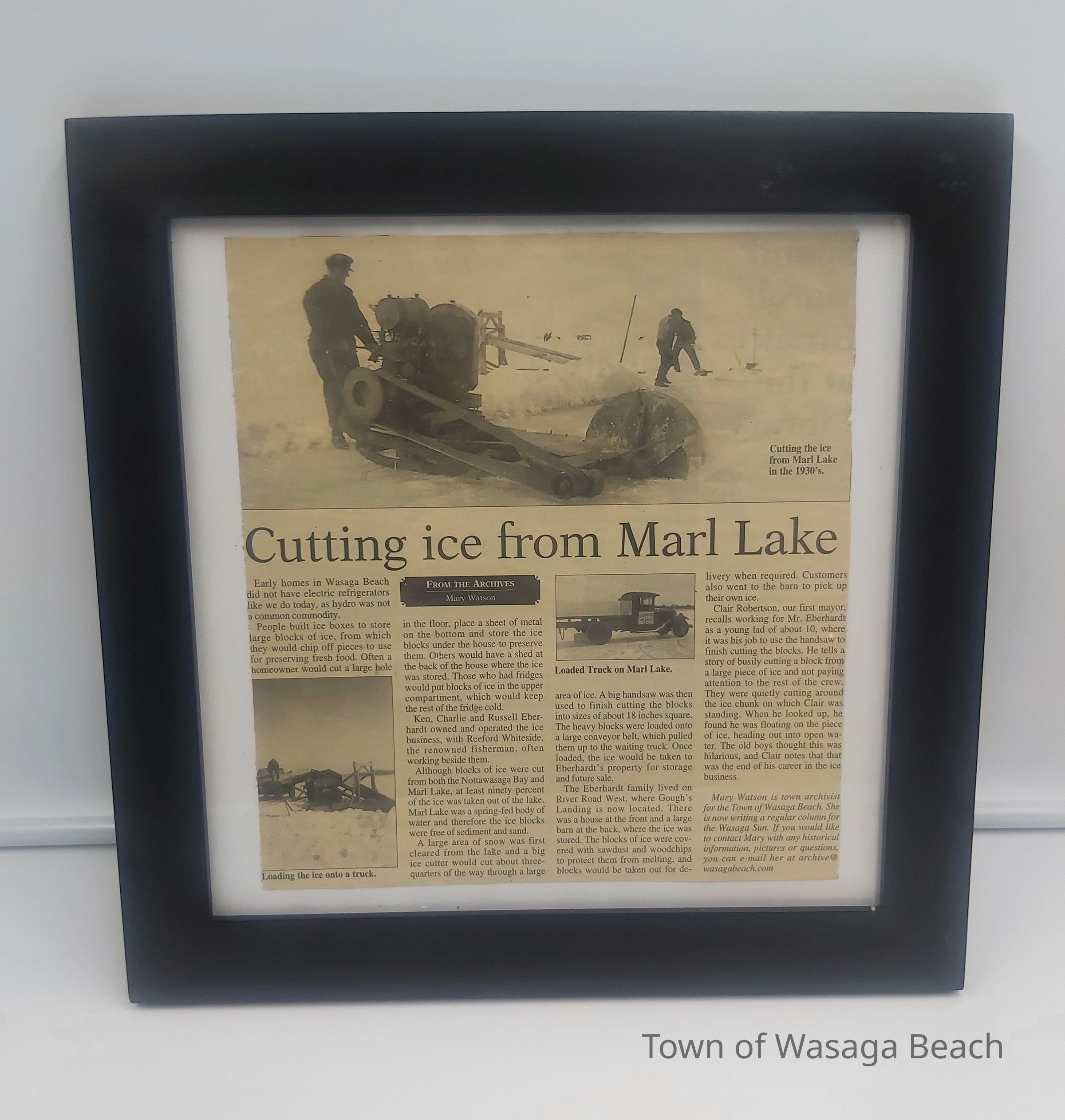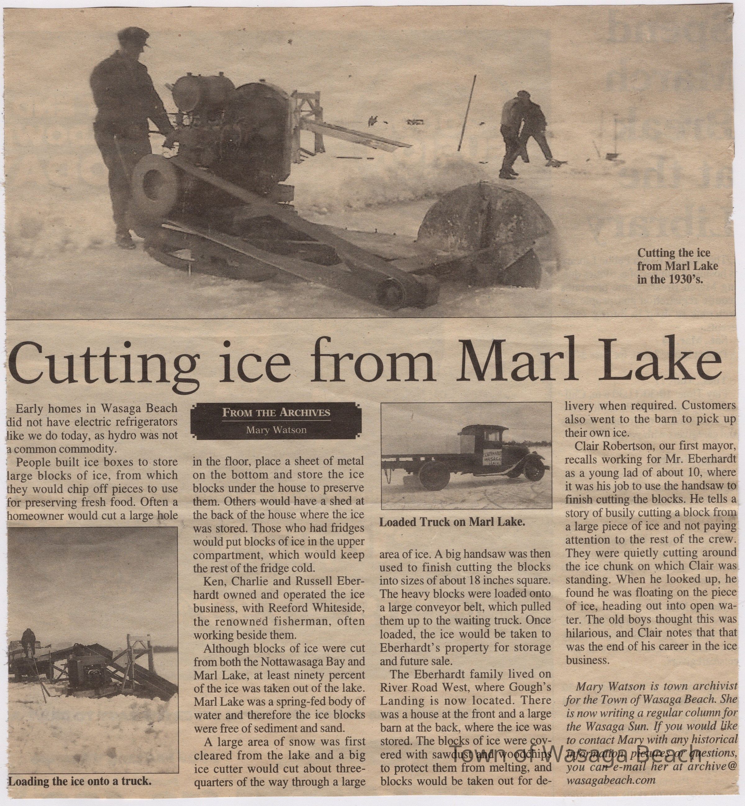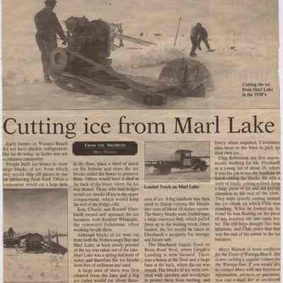 A newspaper article written by Archivist, Mary Watson about "Cutting Ice from Marl Lake" in the 1930's.