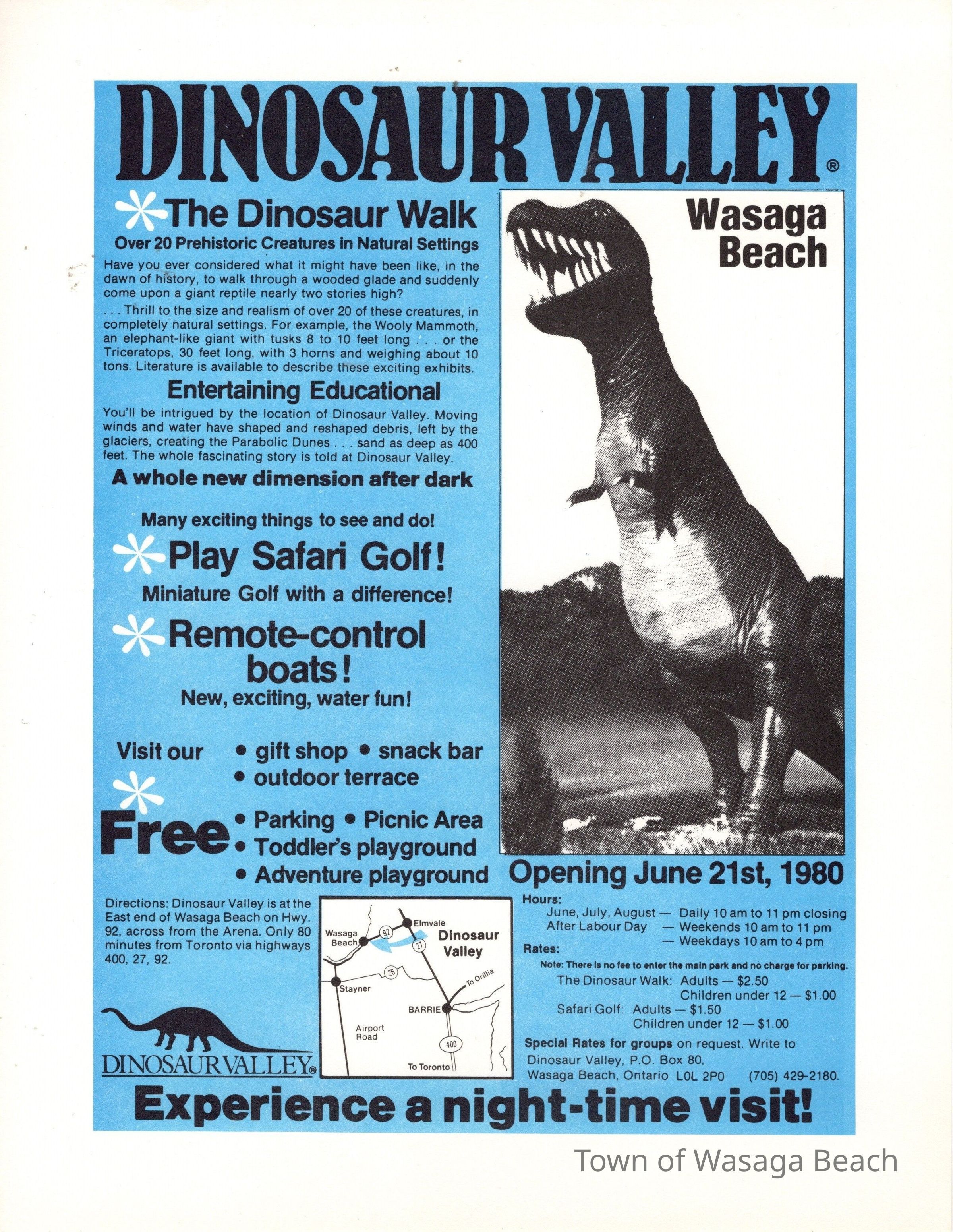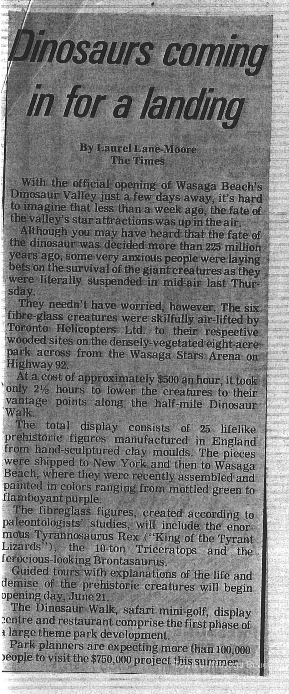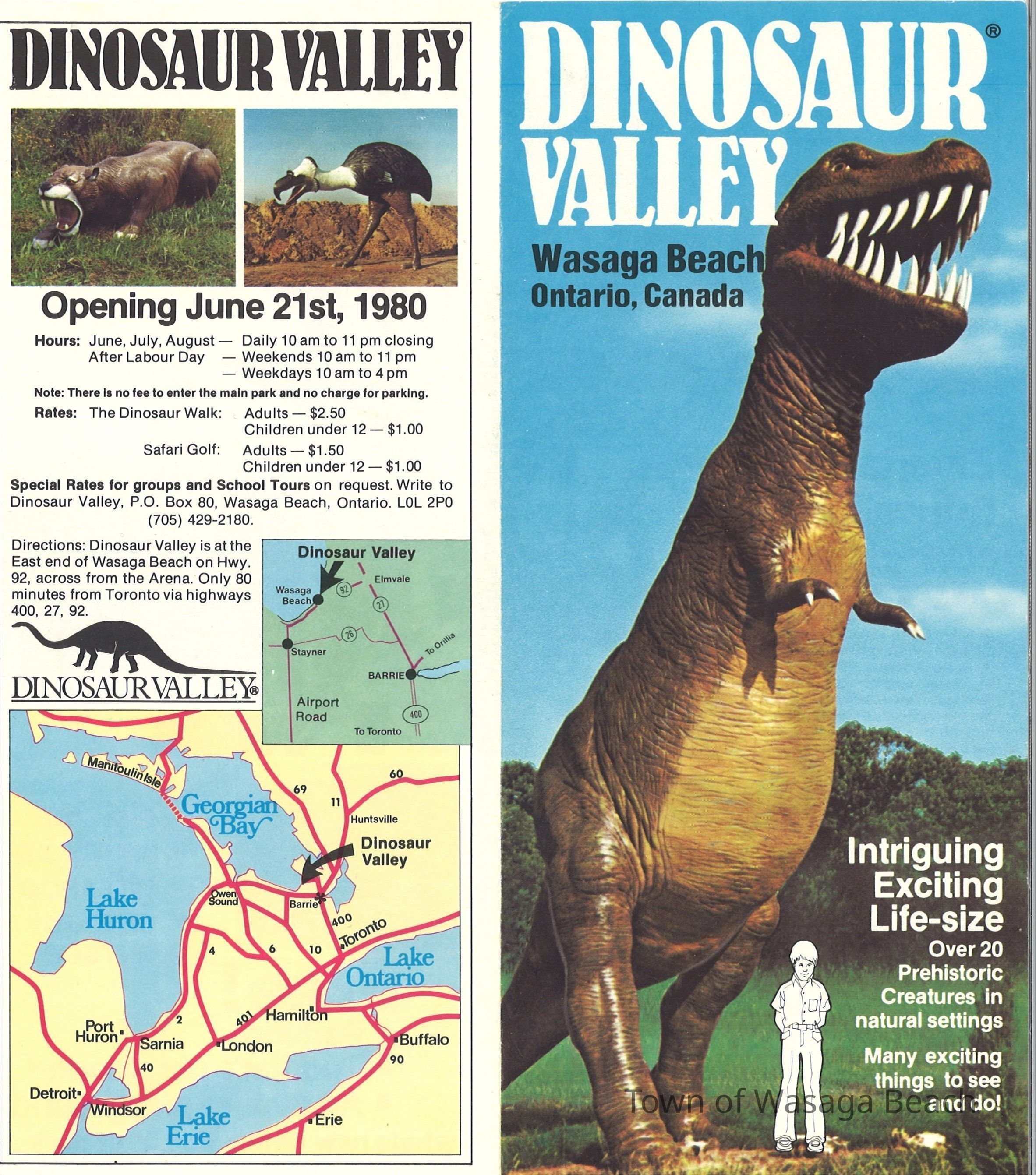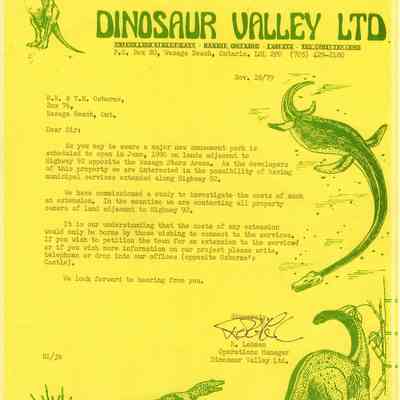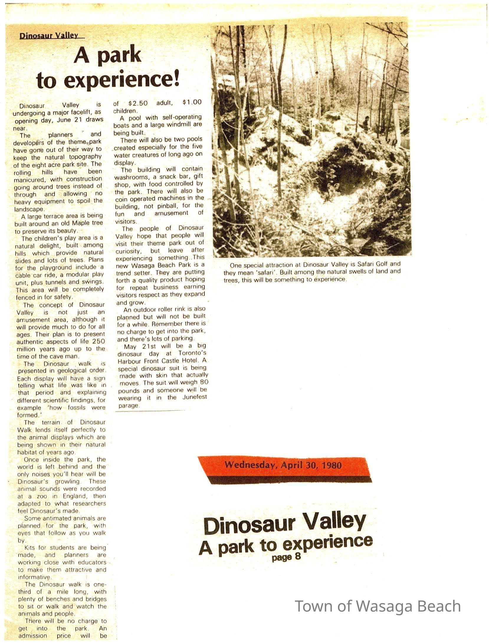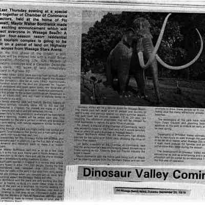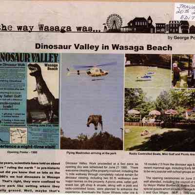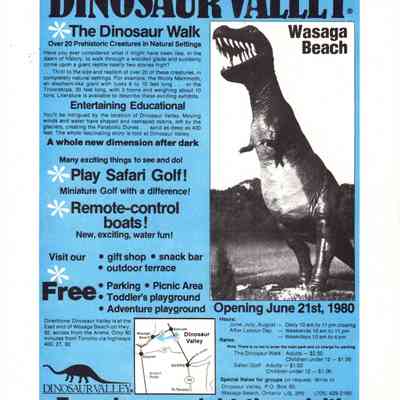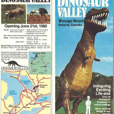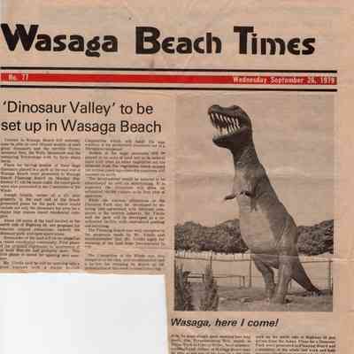 Dinosaur Valley, owned by the Rainbow Hills Development Company, opened on June 21, 1980. Located across the road from the old Wasaga Stars Arena, eight acres of woodland and natural sand dunes provided the setting for half hour tours back in time to the Mesozoic Era. Dinosaur Valley offered "The Dinosaur Walk - over 20 prehistoric creatures in natural settings....For example, the Wooly Mammoth, an elephant-like giant with tusks 8 to 10 feet long...or the Triceratops, 30 feet long, with 3 horns and weighing about 10 tons", mini golf, known as Safari Golf, remote-control boats, a gift shop, snack bar and an outdoor terrace. Rainbow Hills Development Company filed for bankruptcy and the site disappeared in 1983.Acquisition
