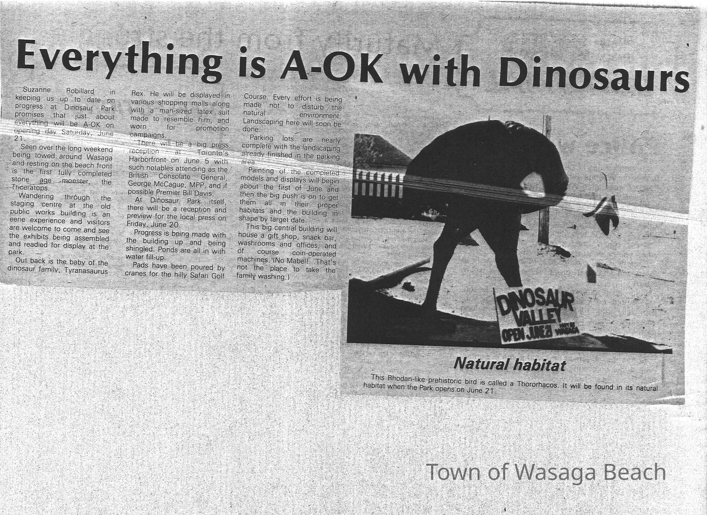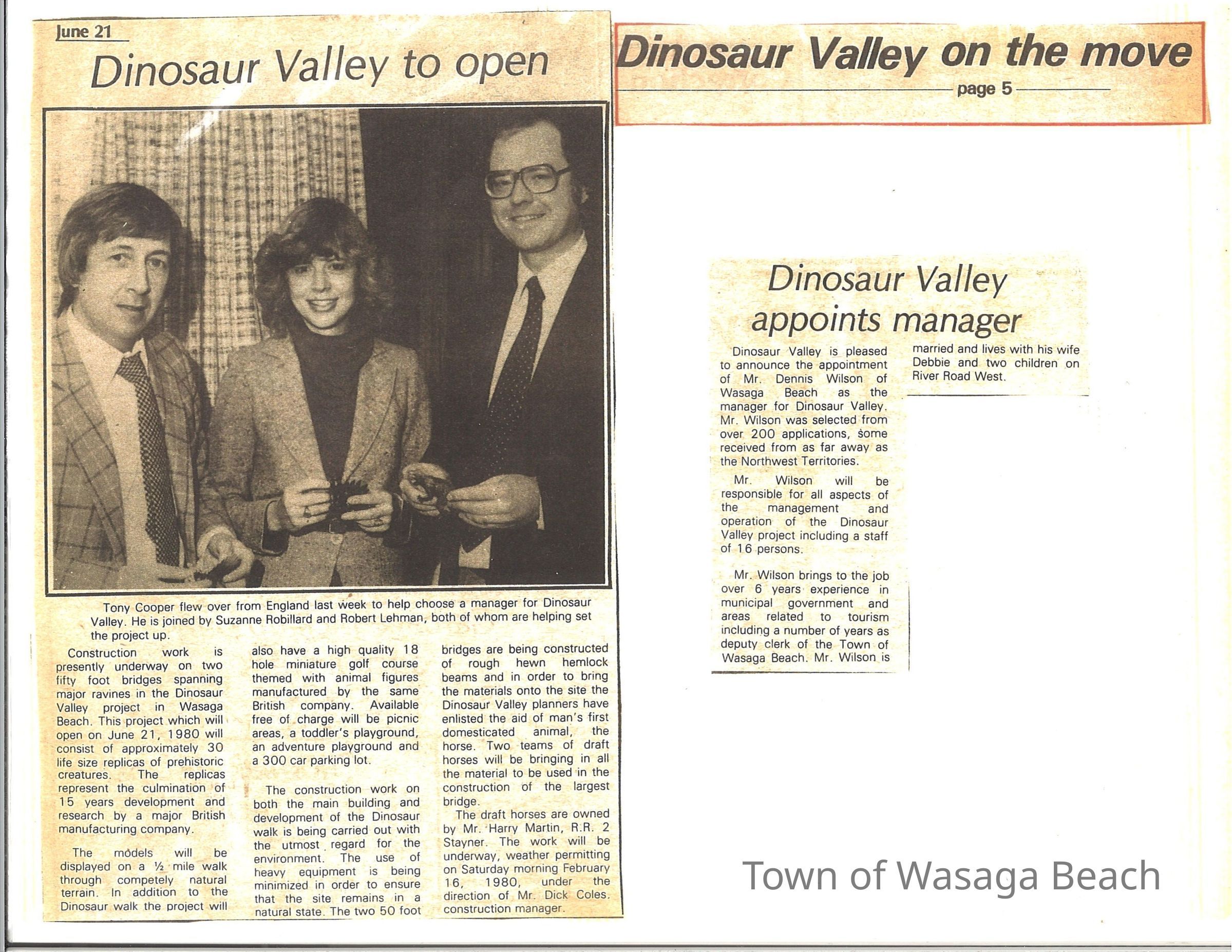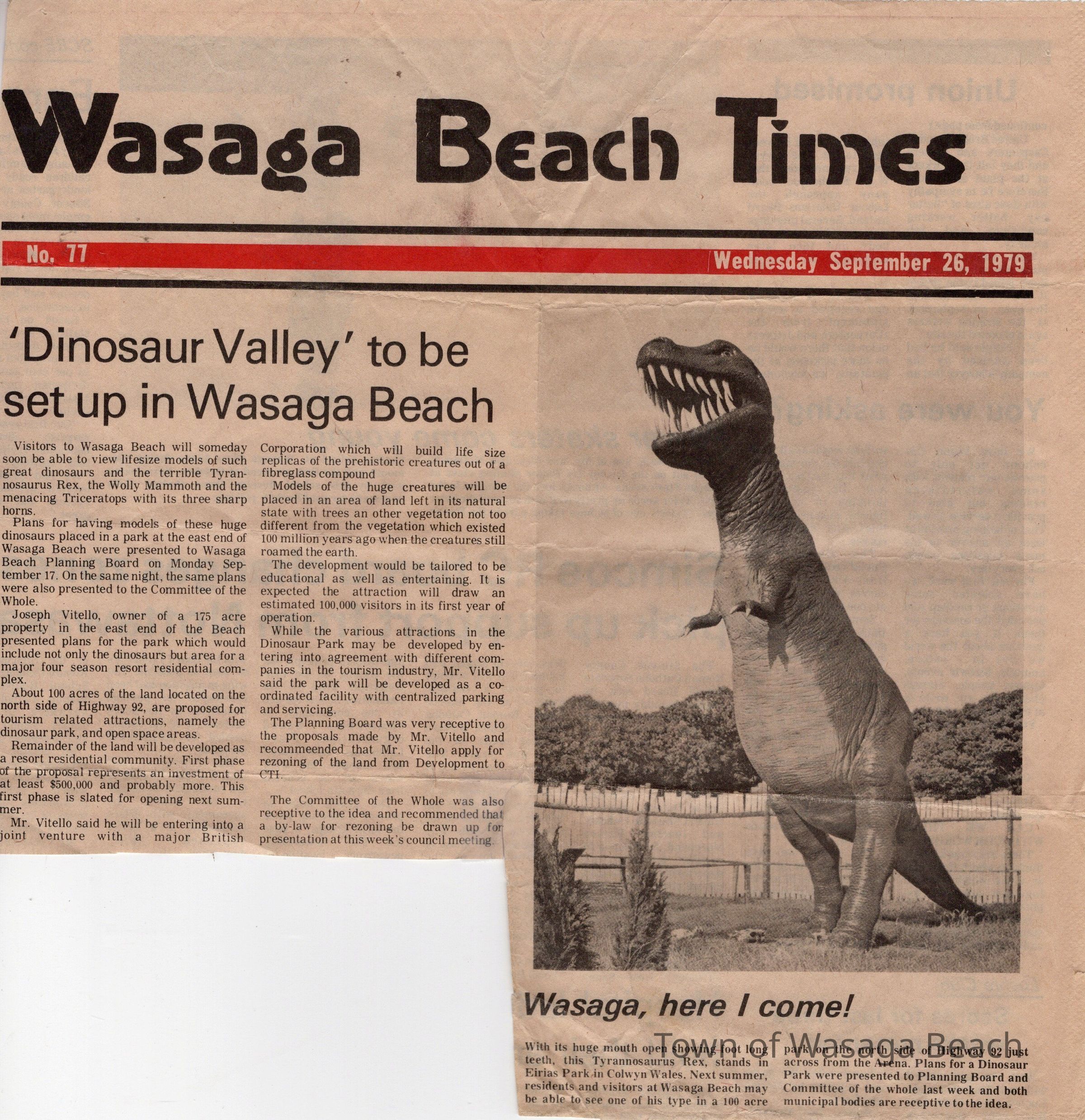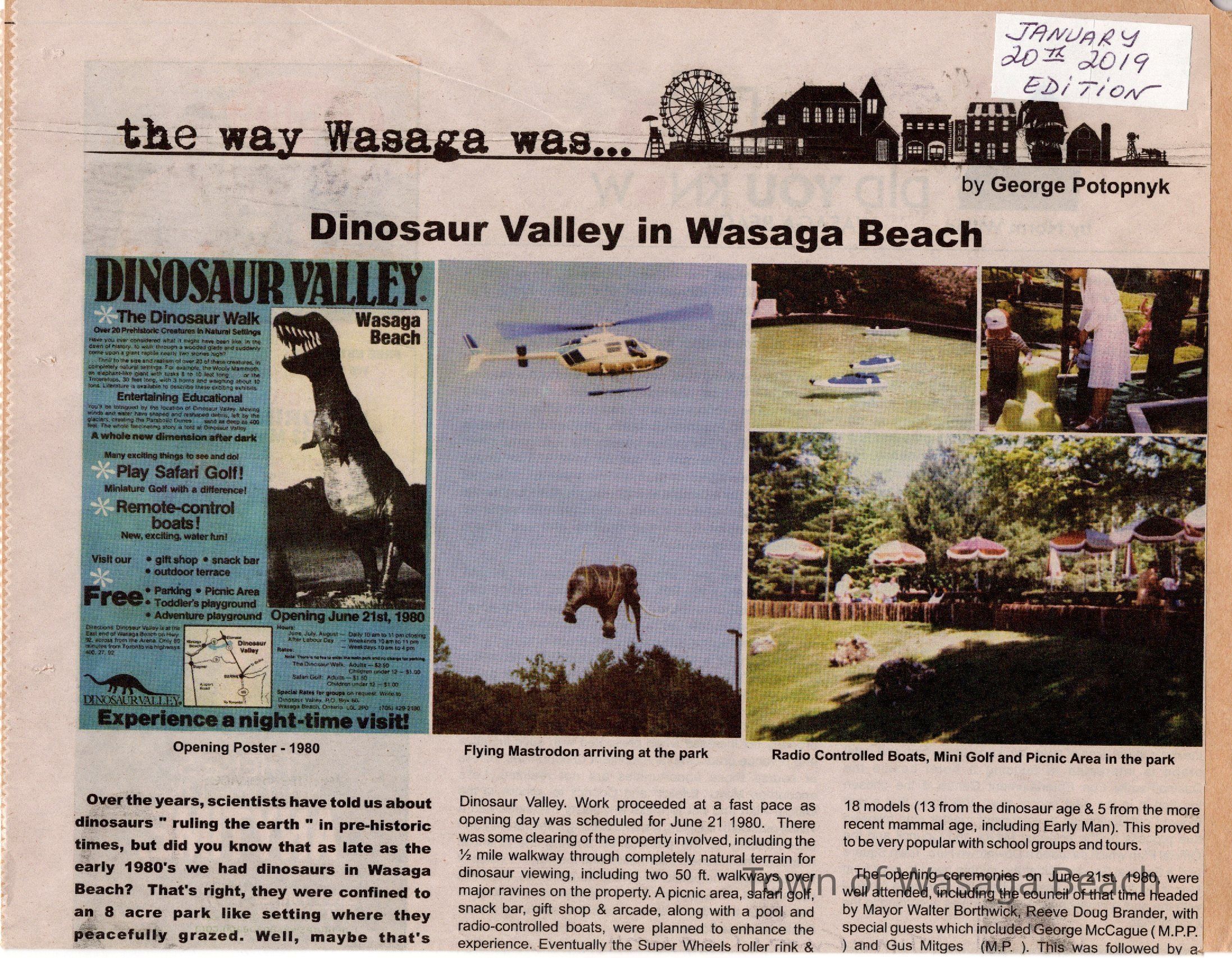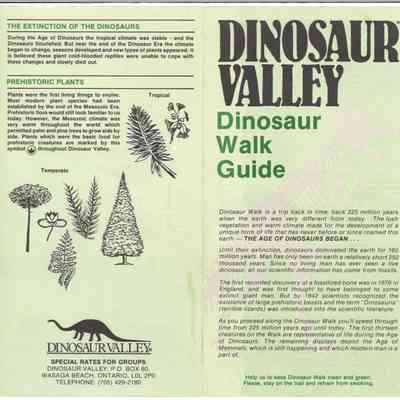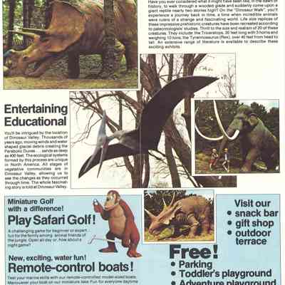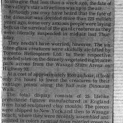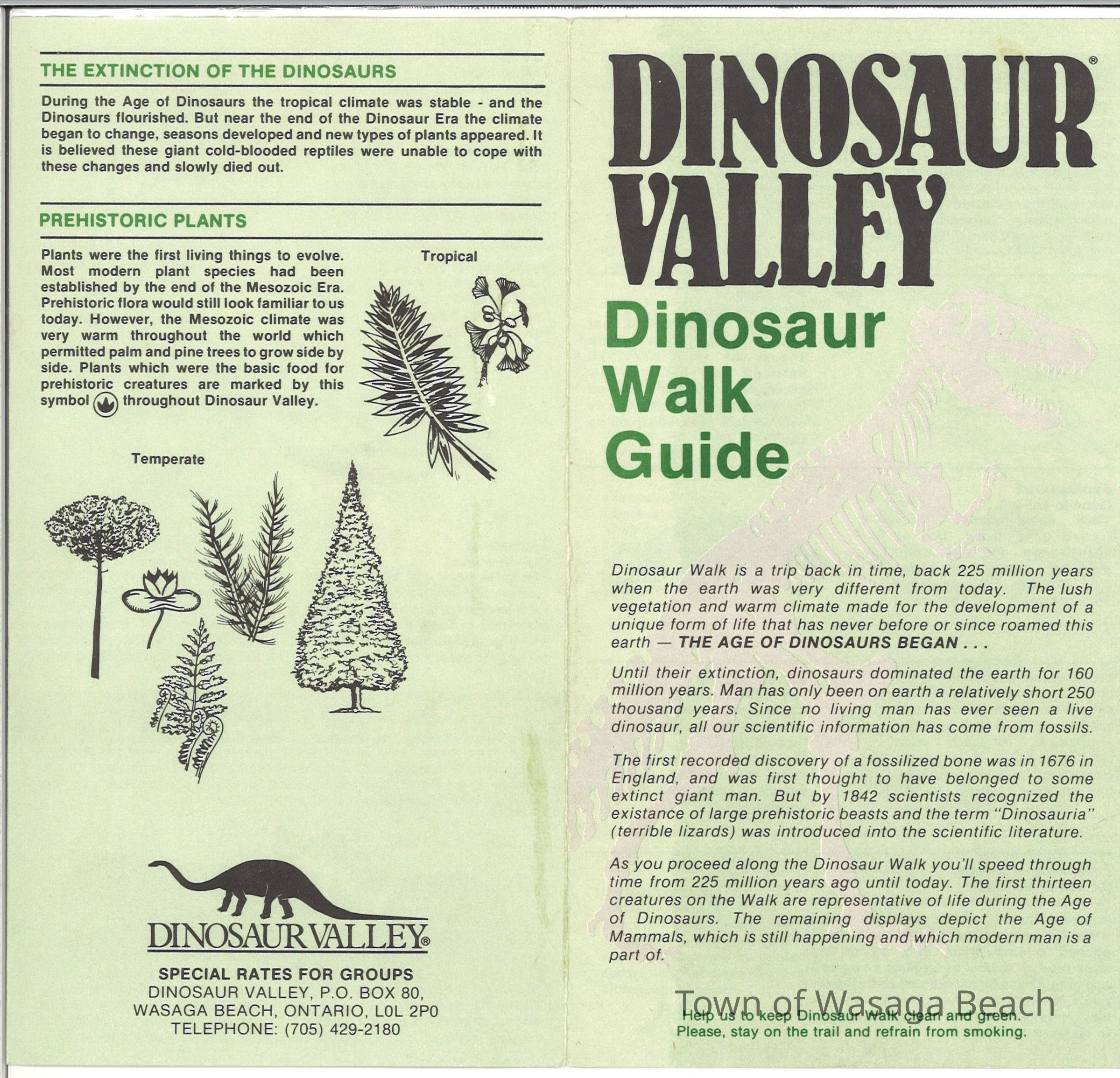 Dinosaur Valley, owned by the Rainbow Hills Development Company, opened on June 21, 1980. Located across the road from the old Wasaga Stars Arena, eight acres of woodland and natural sand dunes provided the setting for half hour tours back in time to the Mesozoic Era. Dinosaur Valley offered "The Dinosaur Walk - over 20 prehistoric creatures in natural settings....For example, the Wooly Mammoth, an elephant-like giant with tusks 8 to 10 feet long...or the Triceratops, 30 feet long, with 3 horns and weighing about 10 tons", mini golf, known as Safari Golf, remote-control boats, a gift shop, snack bar and an outdoor terrace. Rainbow Hills Development Company filed for bankruptcy and the site disappeared in 1983.Acquisition