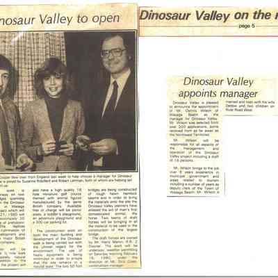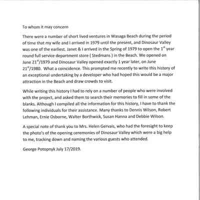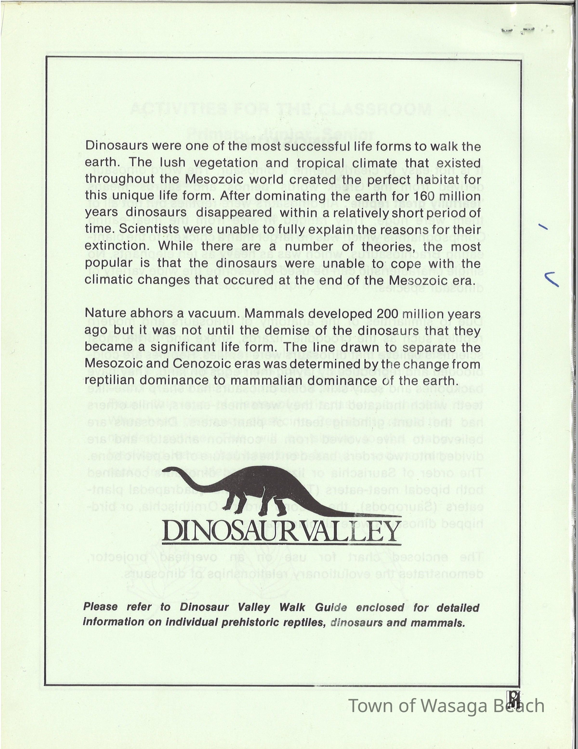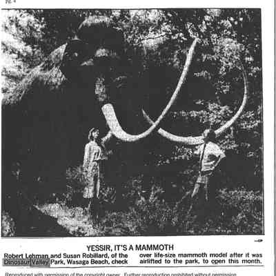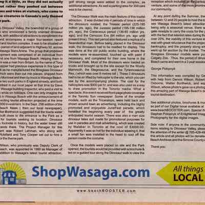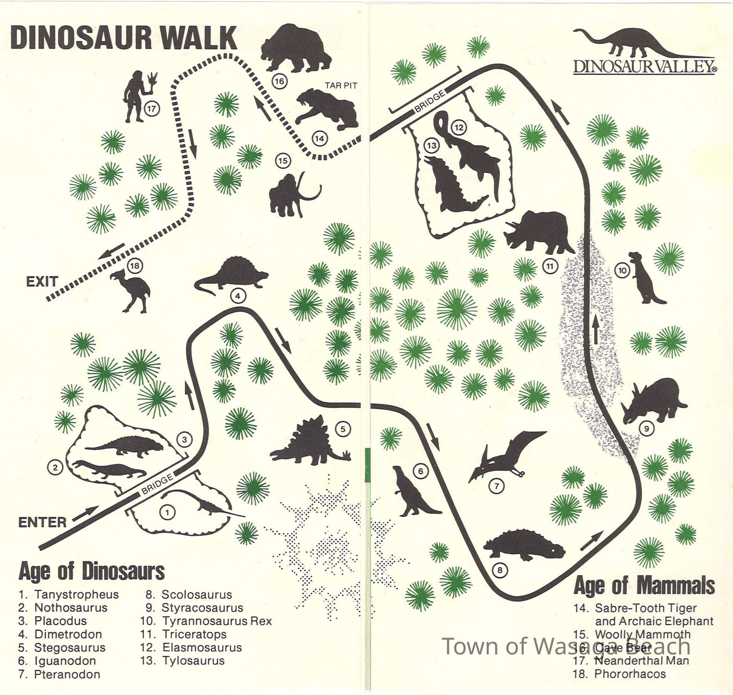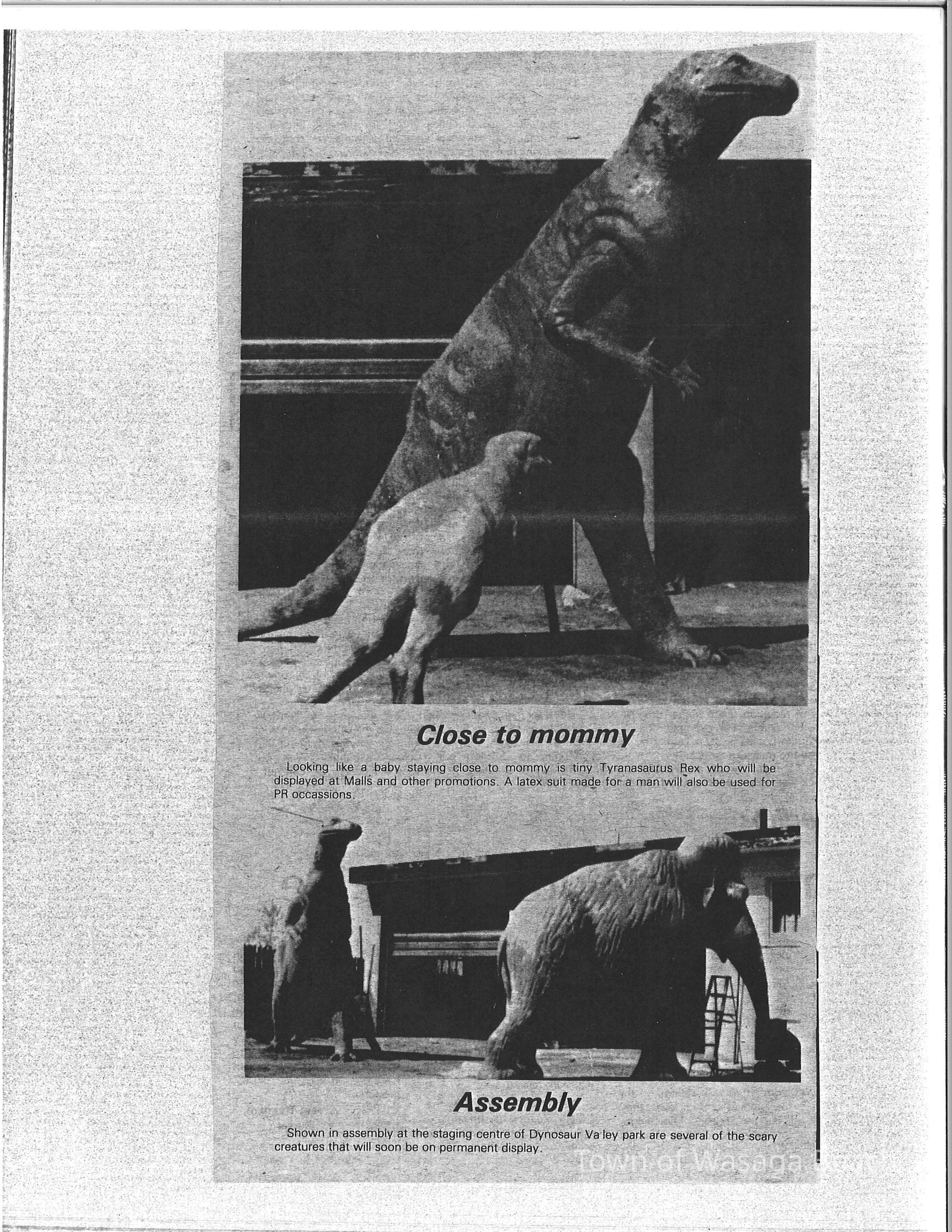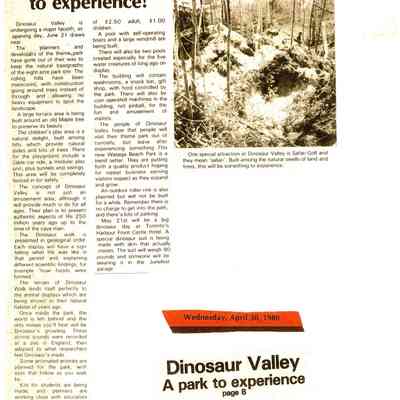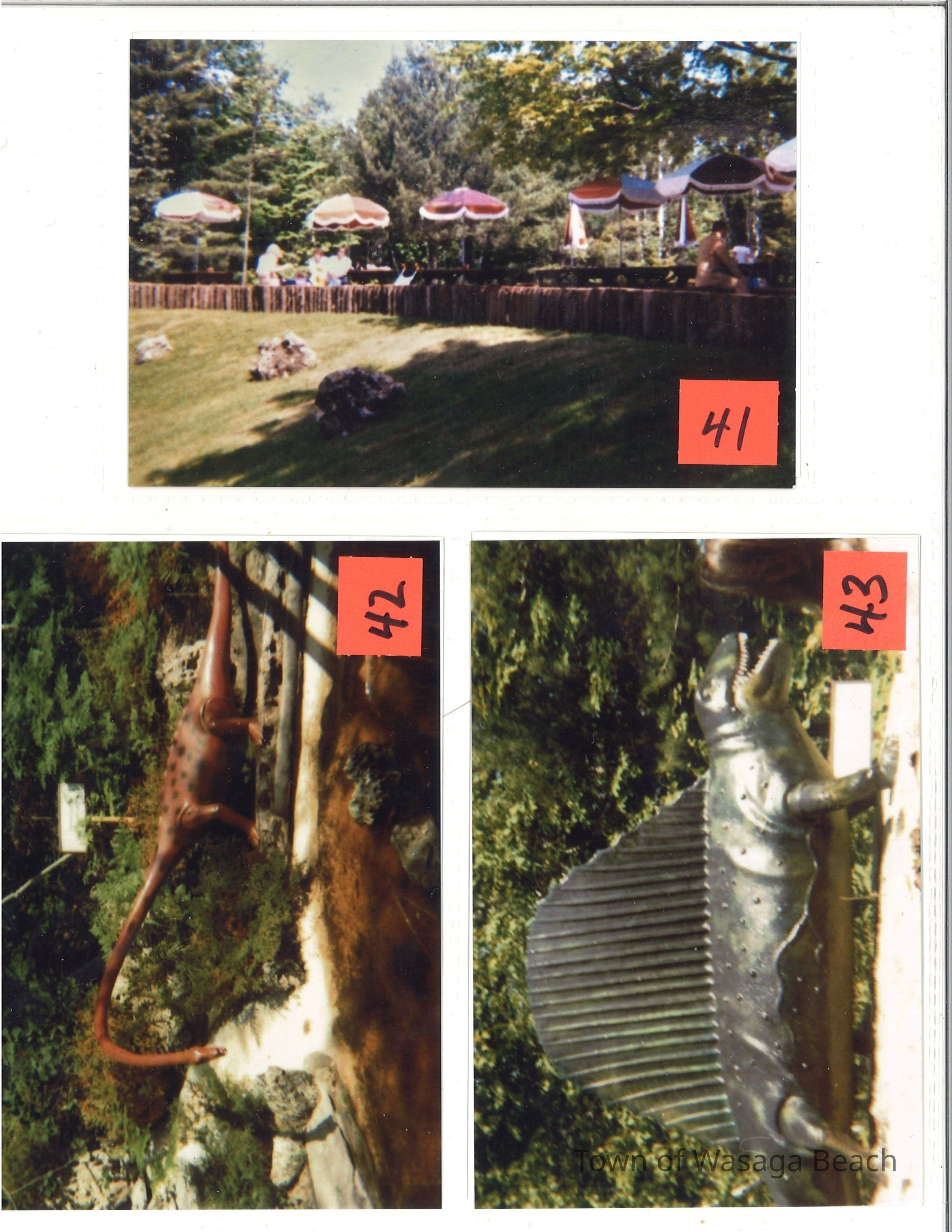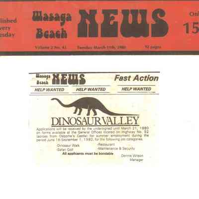 Dinosaur Valley, owned by the Rainbow Hills Development Company, opened on June 21, 1980. Located across the road from the old Wasaga Stars Arena, eight acres of woodland and natural sand dunes provided the setting for half hour tours back in time to the Mesozoic Era. Dinosaur Valley offered "The Dinosaur Walk - over 20 prehistoric creatures in natural settings....For example, the Wooly Mammoth, an elephant-like giant with tusks 8 to 10 feet long...or the Triceratops, 30 feet long, with 3 horns and weighing about 10 tons", mini golf, known as Safari Golf, remote-control boats, a gift shop, snack bar and an outdoor terrace. Rainbow Hills Development Company filed for bankruptcy and the site disappeared in 1983.Acquisition