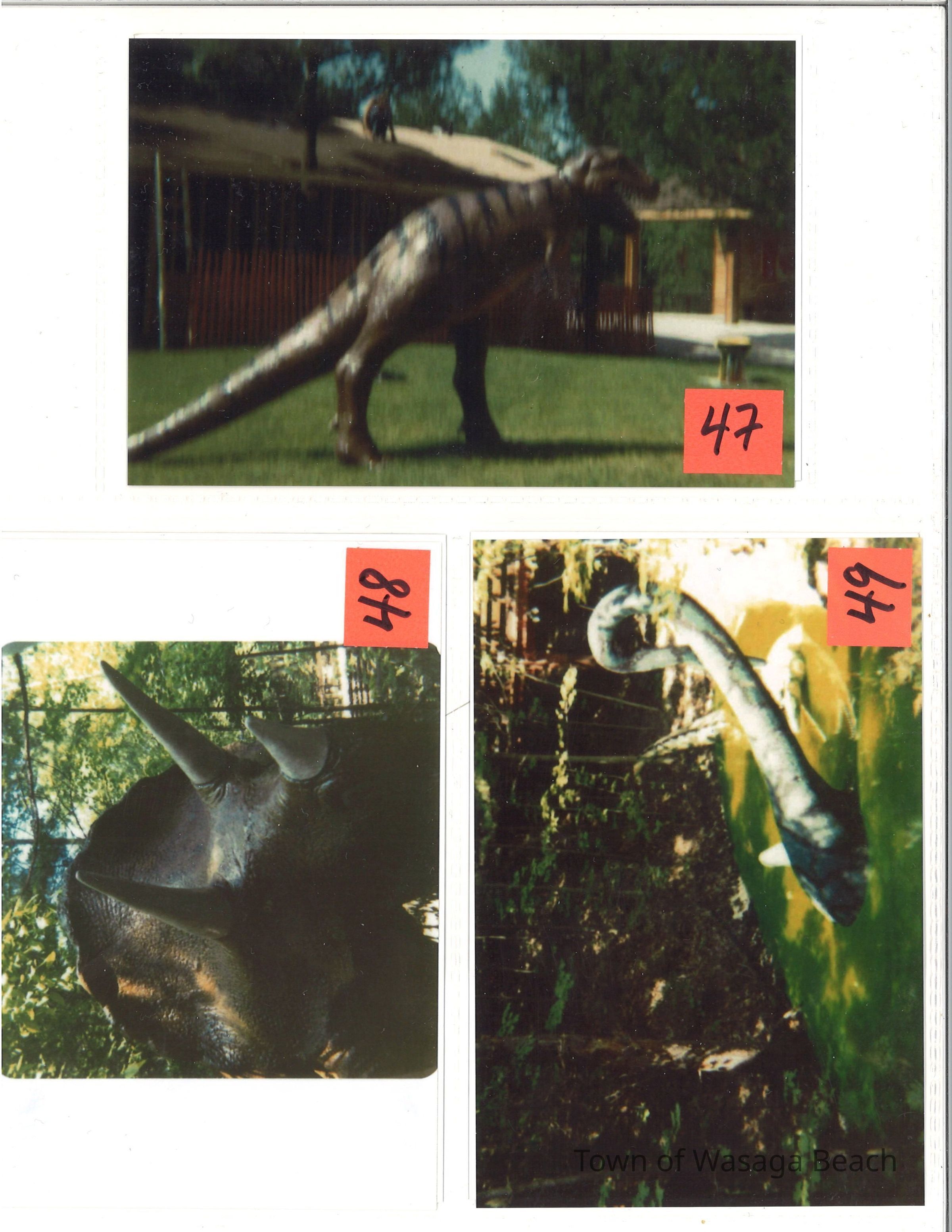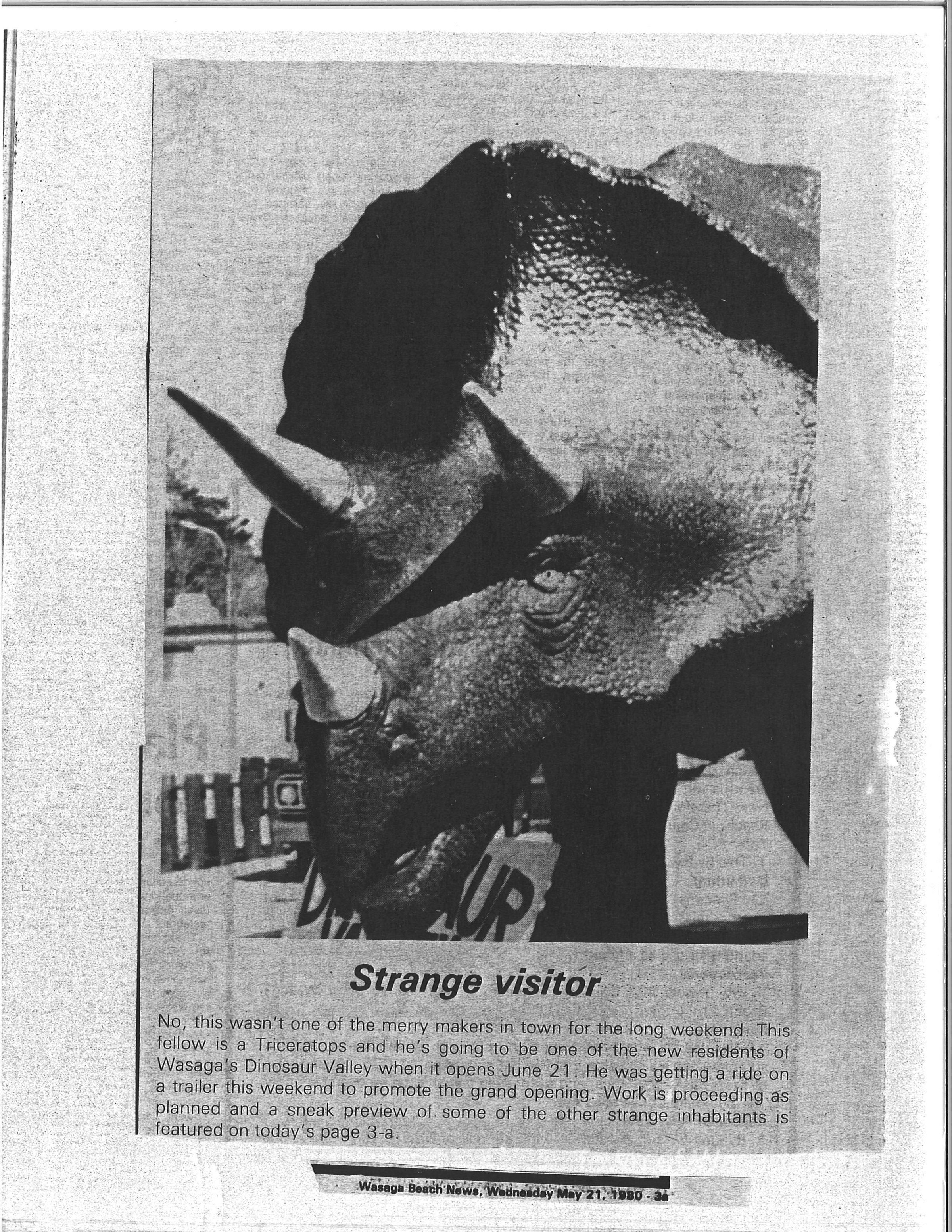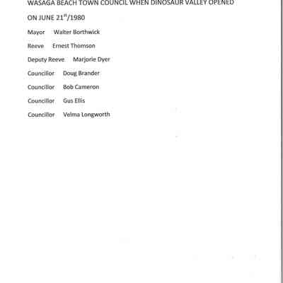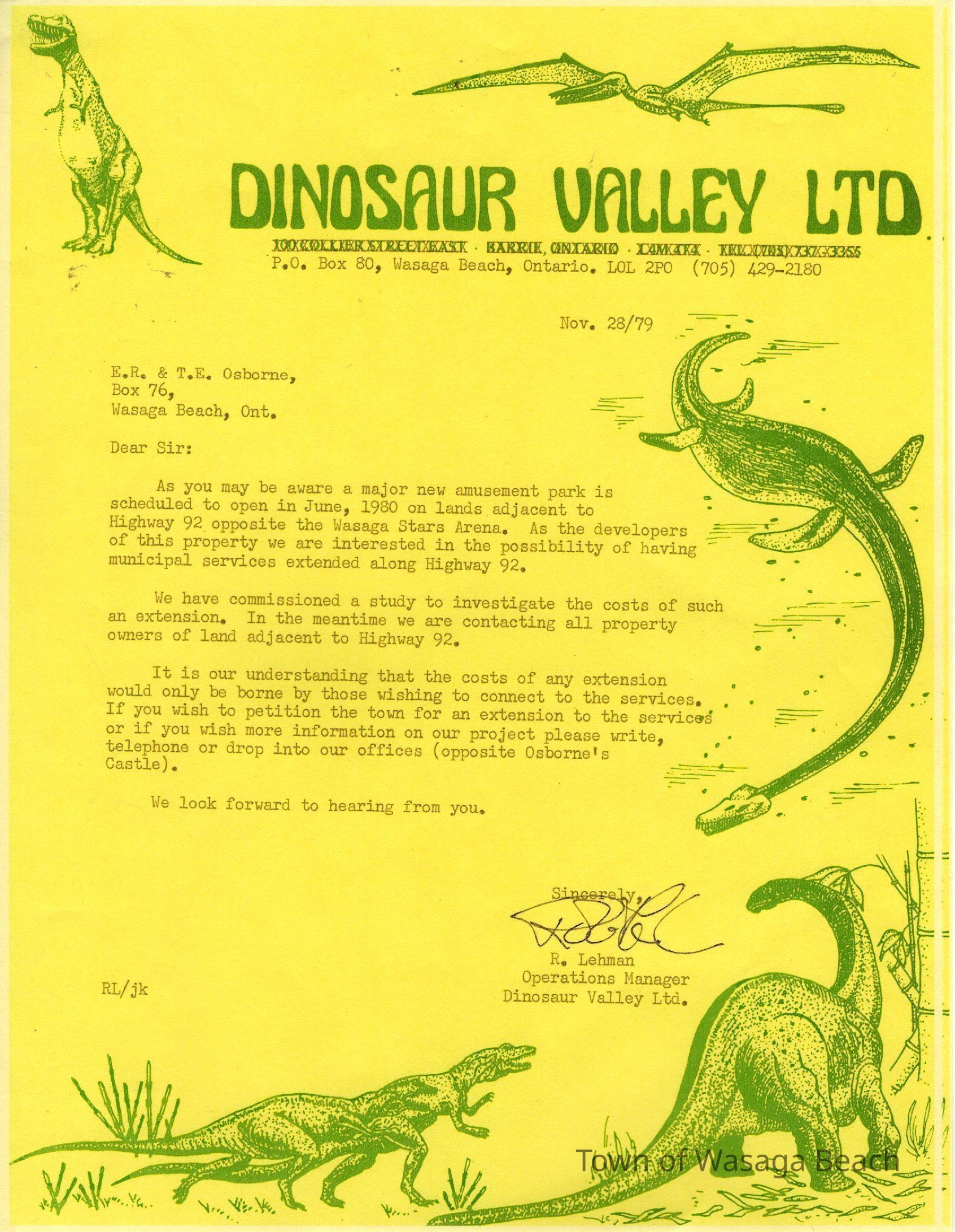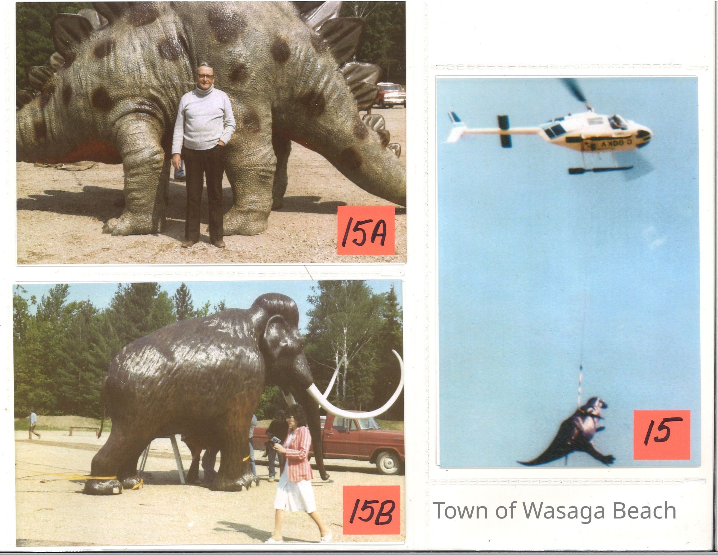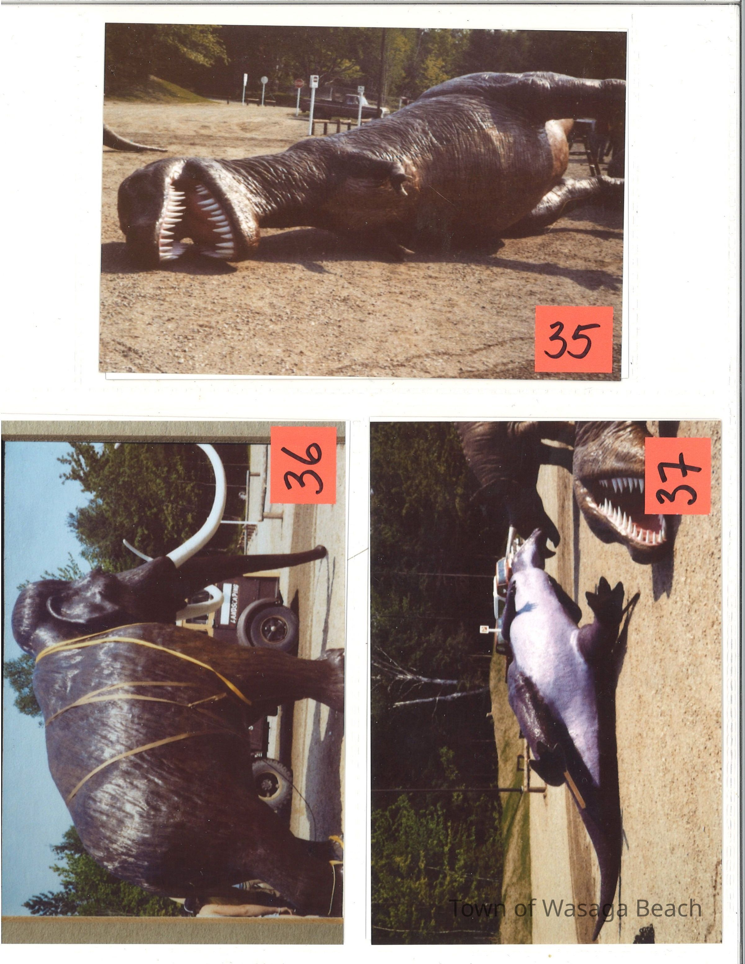 Dinosaur Valley, owned by the Rainbow Hills Development Company, opened on June 21, 1980. Located across the road from the old Wasaga Stars Arena, eight acres of woodland and natural sand dunes provided the setting for half hour tours back in time to the Mesozoic Era. Dinosaur Valley offered "The Dinosaur Walk - over 20 prehistoric creatures in natural settings....For example, the Wooly Mammoth, an elephant-like giant with tusks 8 to 10 feet long...or the Triceratops, 30 feet long, with 3 horns and weighing about 10 tons", mini golf, known as Safari Golf, remote-control boats, a gift shop, snack bar and an outdoor terrace. Rainbow Hills Development Company filed for bankruptcy and the site disappeared in 1983.Acquisition