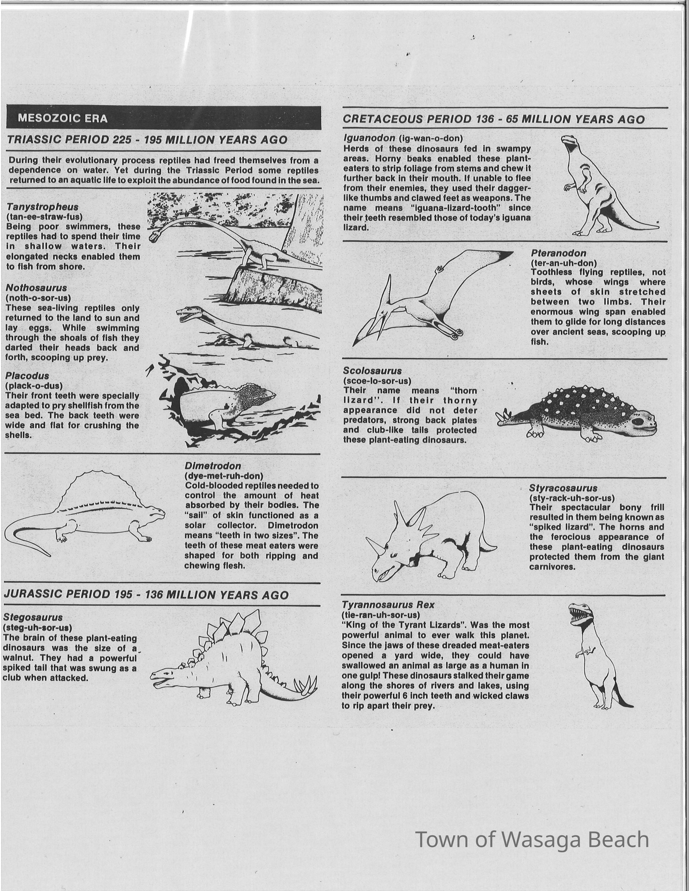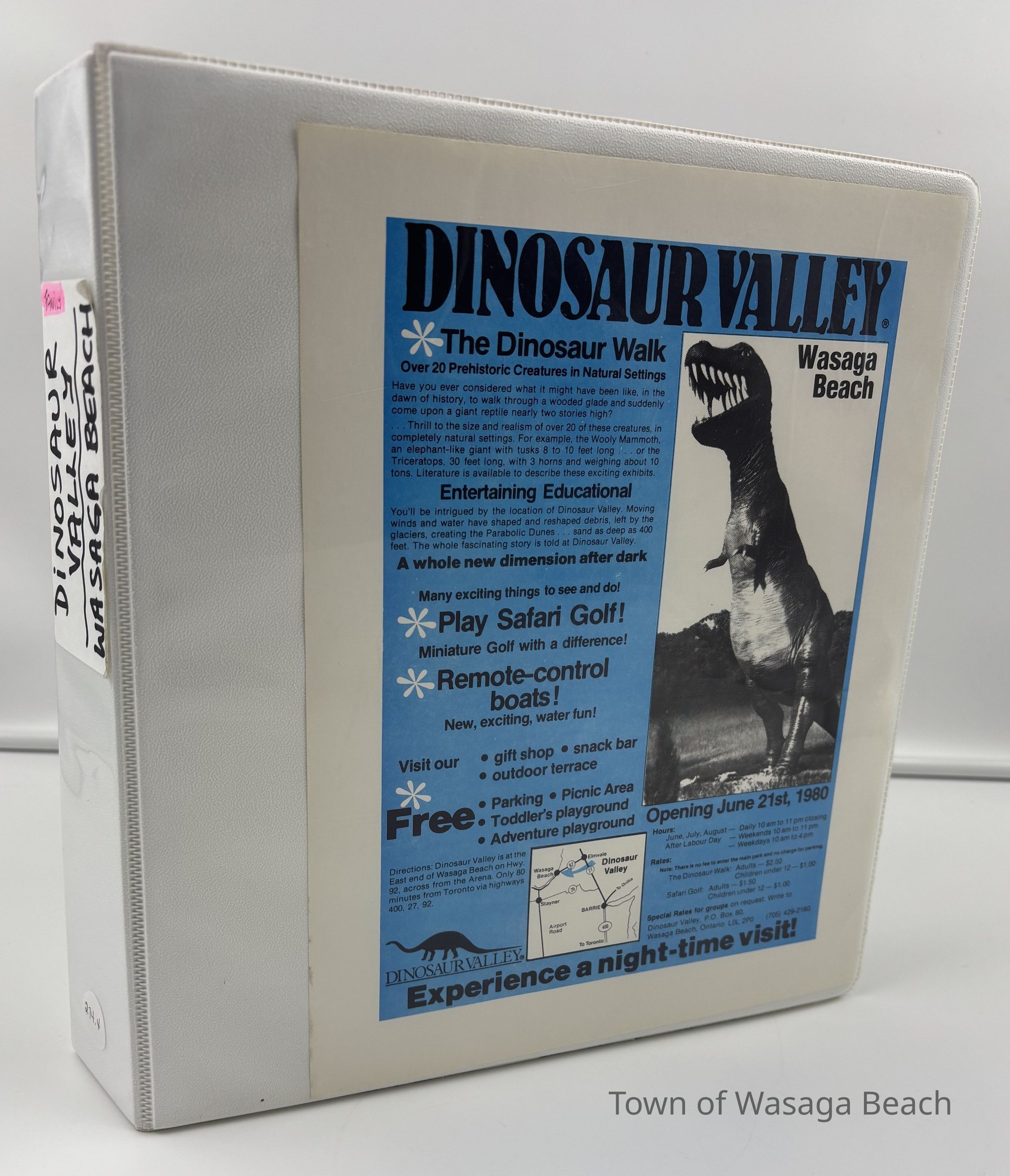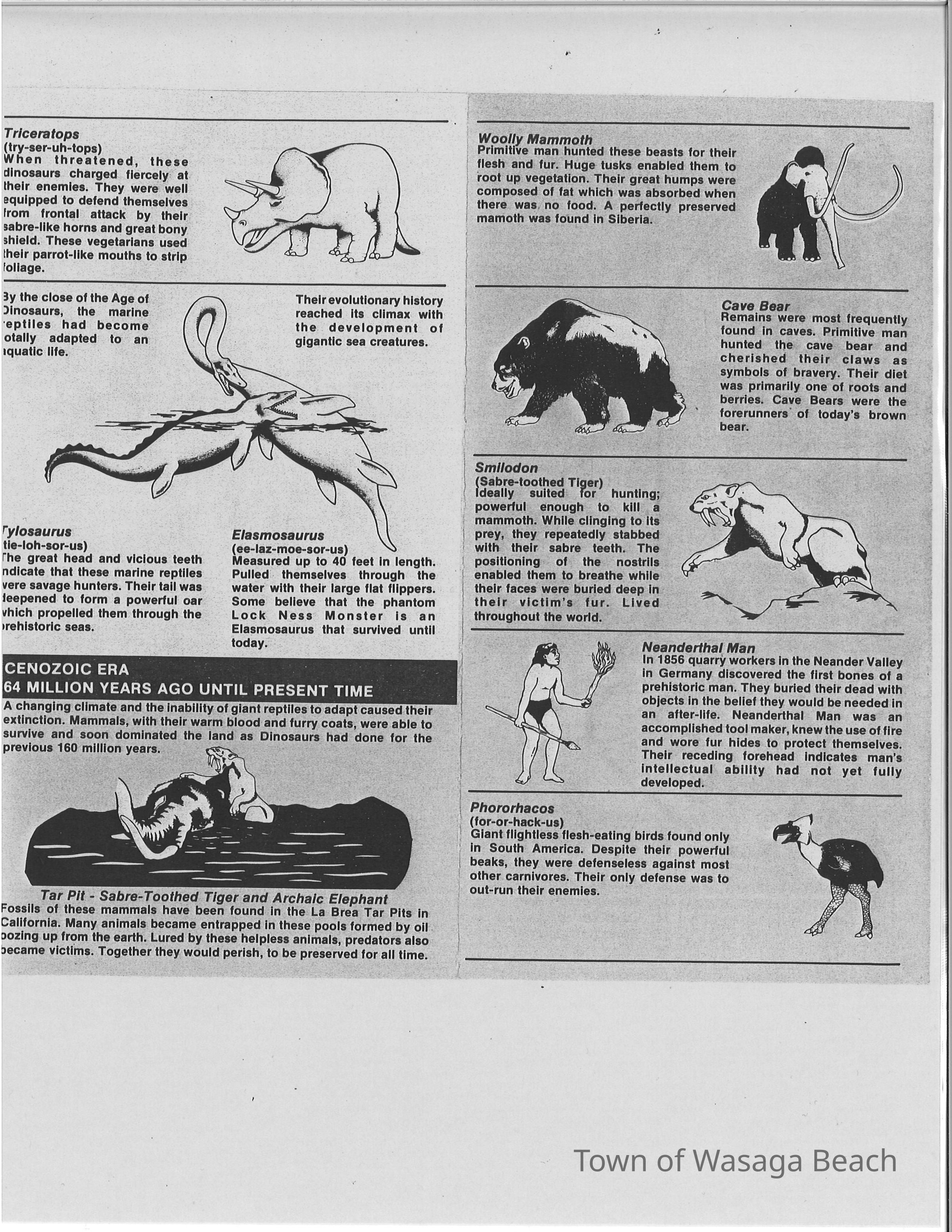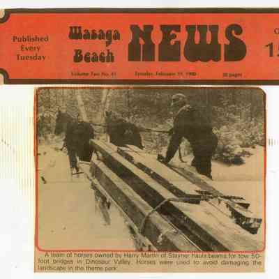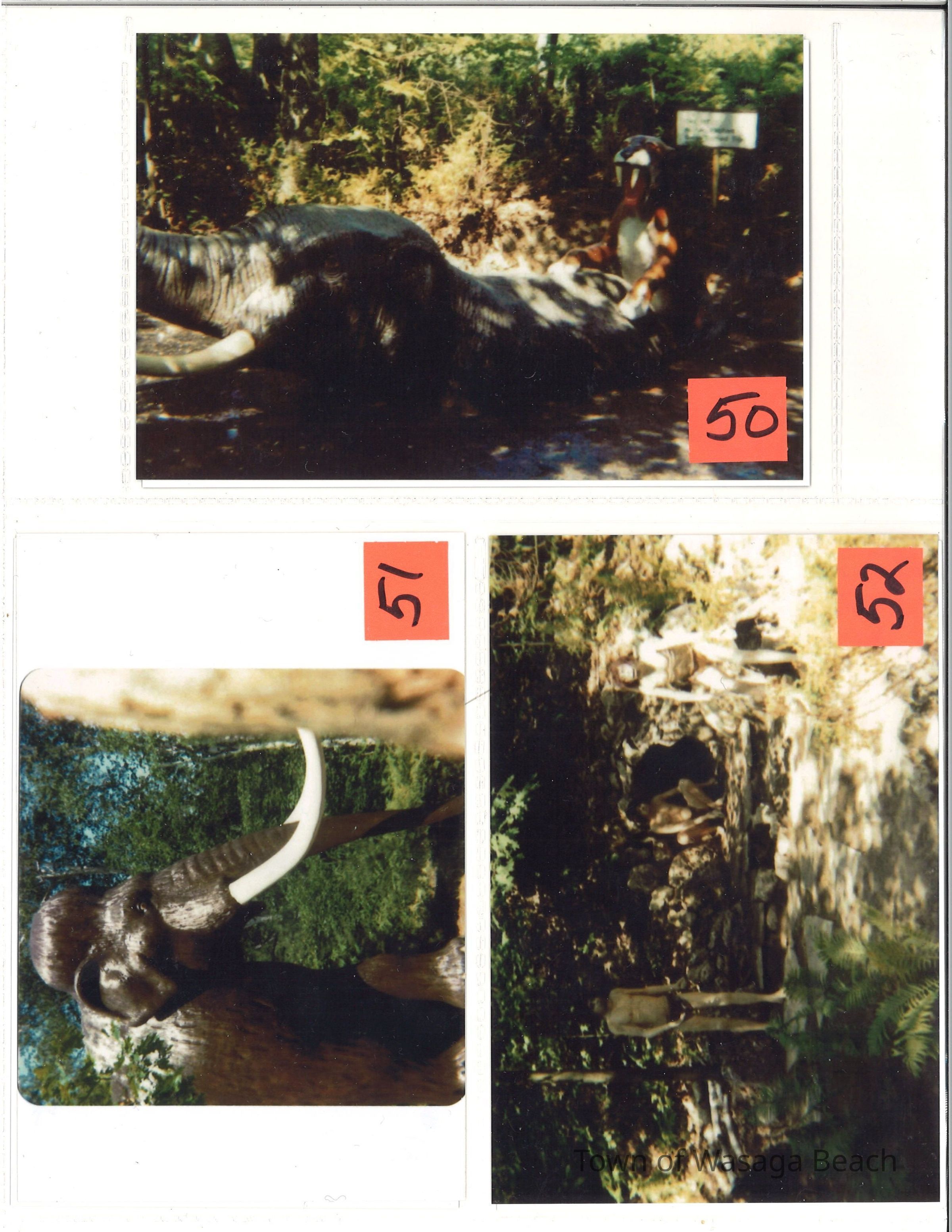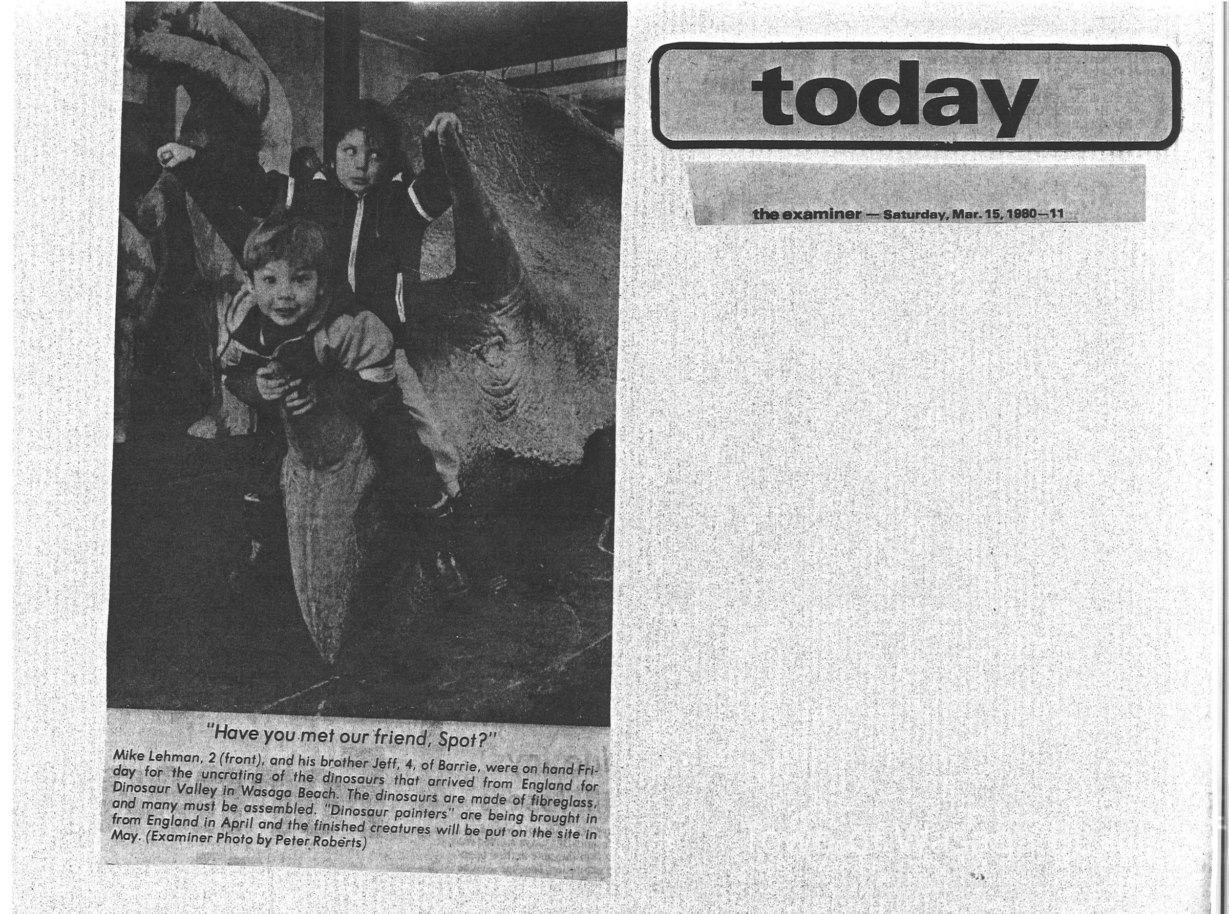 Dinosaur Valley, owned by the Rainbow Hills Development Company, opened on June 21, 1980. Located across the road from the old Wasaga Stars Arena, eight acres of woodland and natural sand dunes provided the setting for half hour tours back in time to the Mesozoic Era. Dinosaur Valley offered "The Dinosaur Walk - over 20 prehistoric creatures in natural settings....For example, the Wooly Mammoth, an elephant-like giant with tusks 8 to 10 feet long...or the Triceratops, 30 feet long, with 3 horns and weighing about 10 tons", mini golf, known as Safari Golf, remote-control boats, a gift shop, snack bar and an outdoor terrace. Rainbow Hills Development Company filed for bankruptcy and the site disappeared in 1983.Acquisition