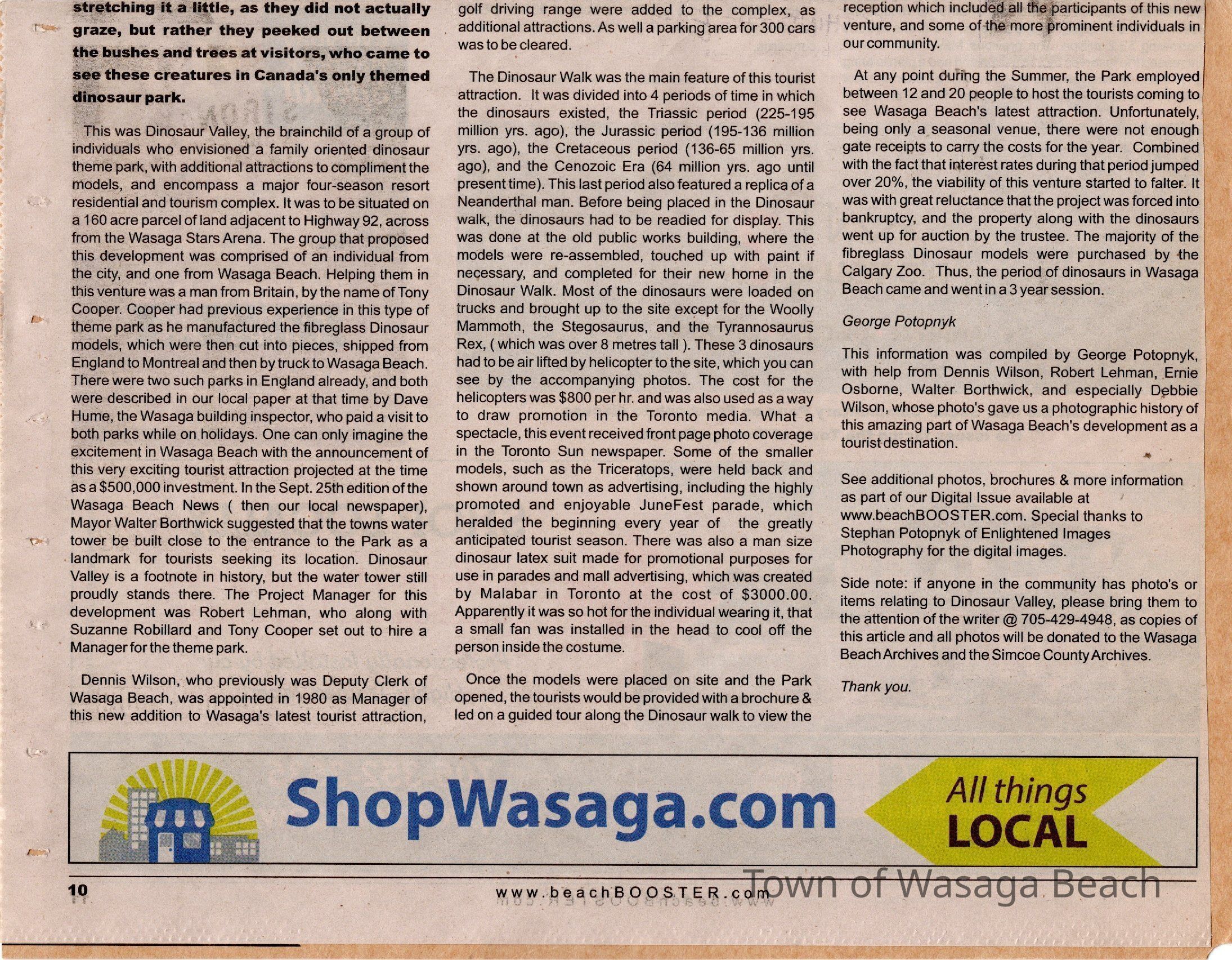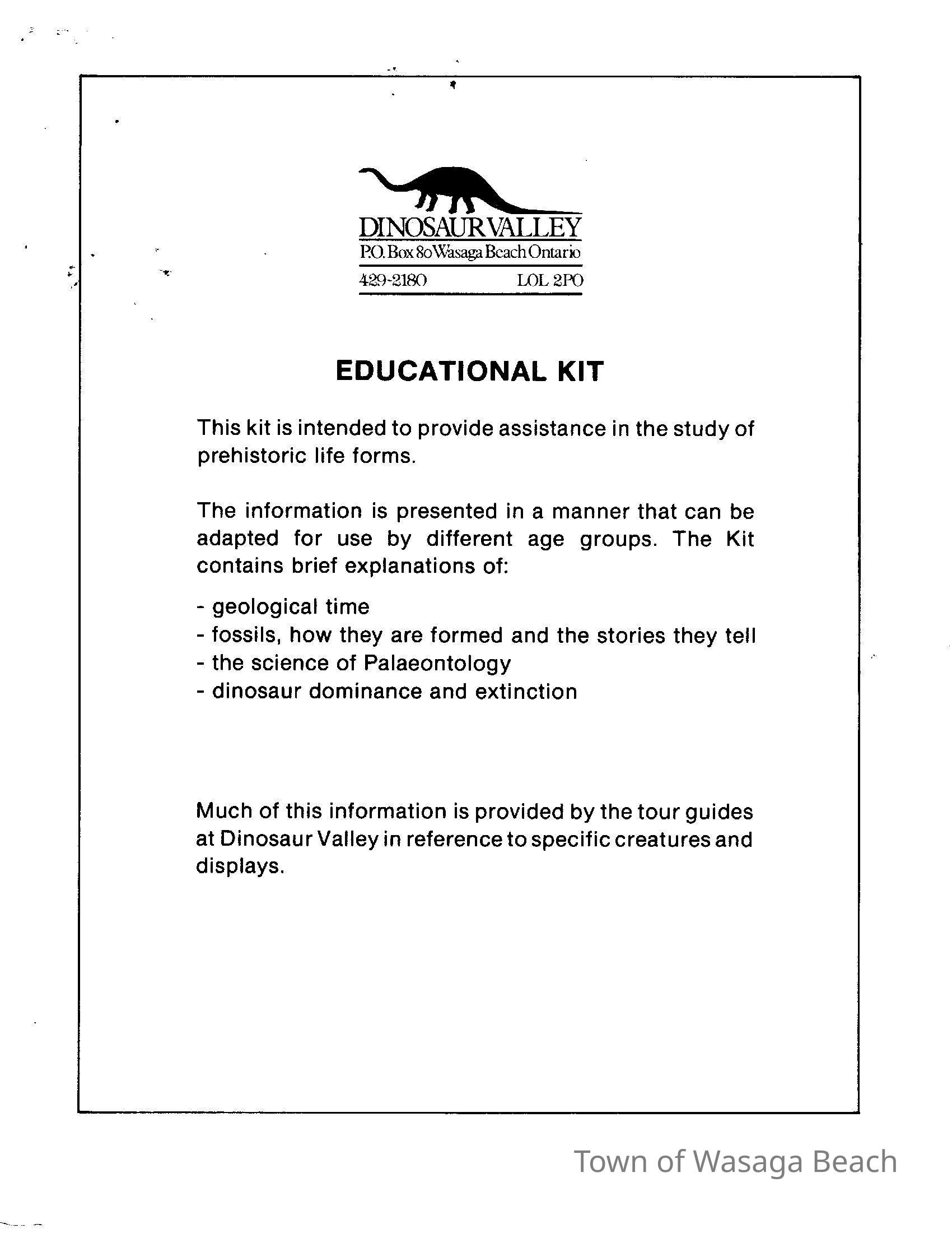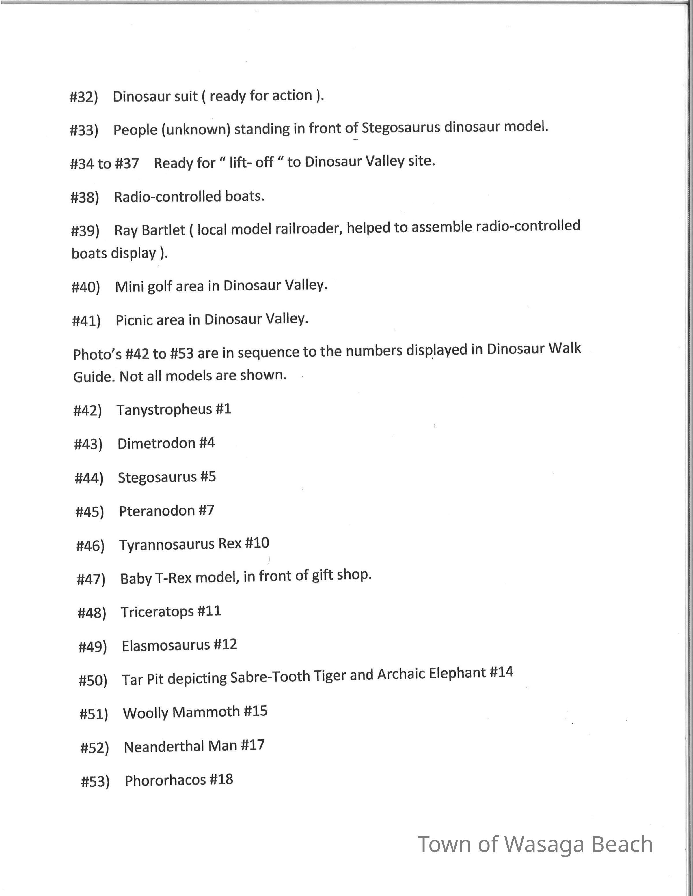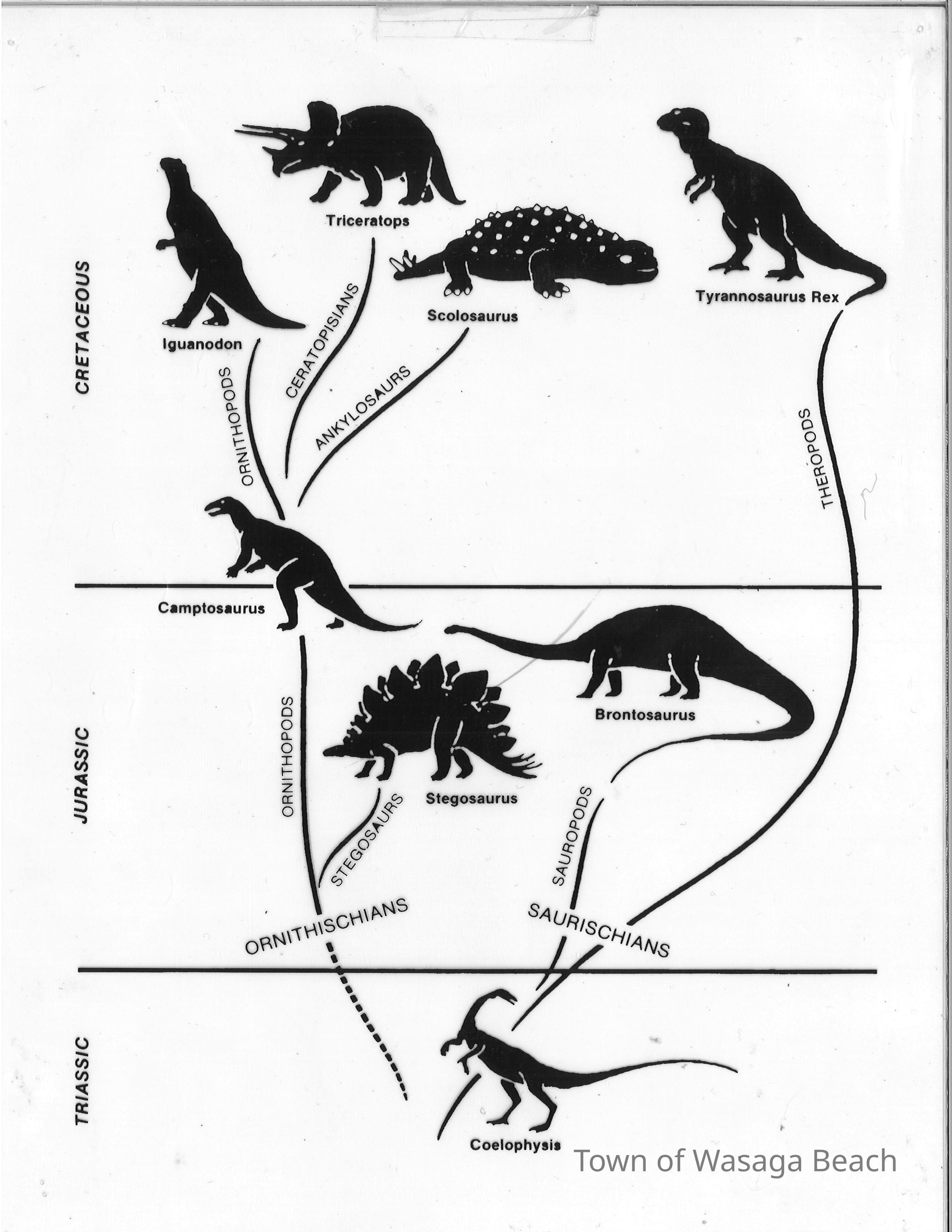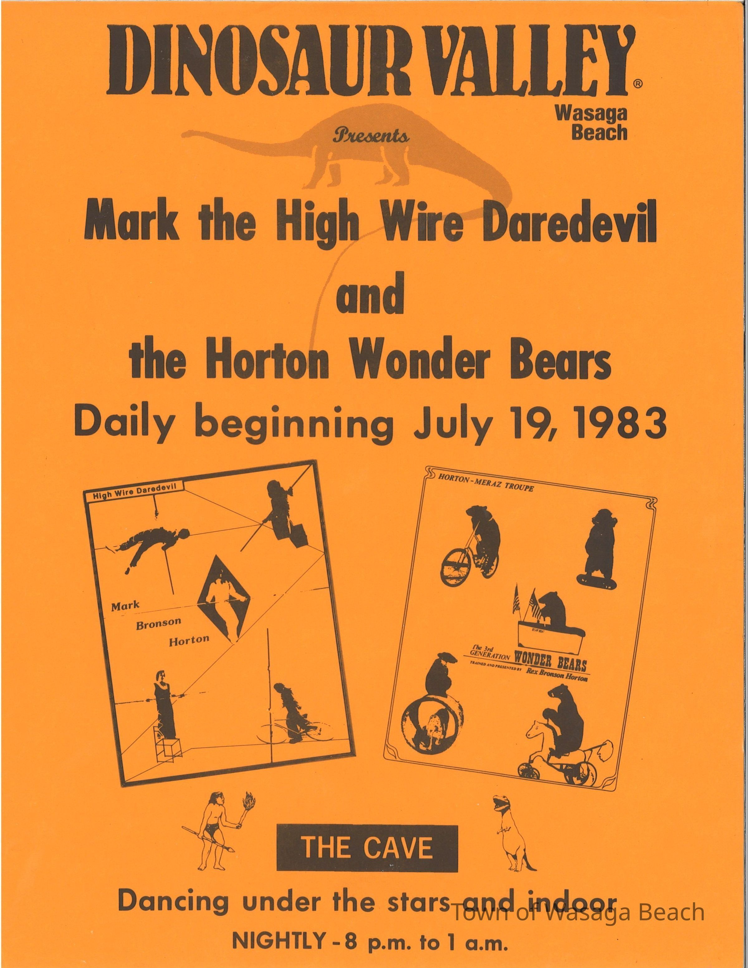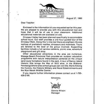 Dinosaur Valley, owned by the Rainbow Hills Development Company, opened on June 21, 1980. Located across the road from the old Wasaga Stars Arena, eight acres of woodland and natural sand dunes provided the setting for half hour tours back in time to the Mesozoic Era. Dinosaur Valley offered "The Dinosaur Walk - over 20 prehistoric creatures in natural settings....For example, the Wooly Mammoth, an elephant-like giant with tusks 8 to 10 feet long...or the Triceratops, 30 feet long, with 3 horns and weighing about 10 tons", mini golf, known as Safari Golf, remote-control boats, a gift shop, snack bar and an outdoor terrace. Rainbow Hills Development Company filed for bankruptcy and the site disappeared in 1983.Acquisition