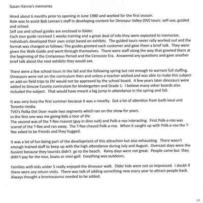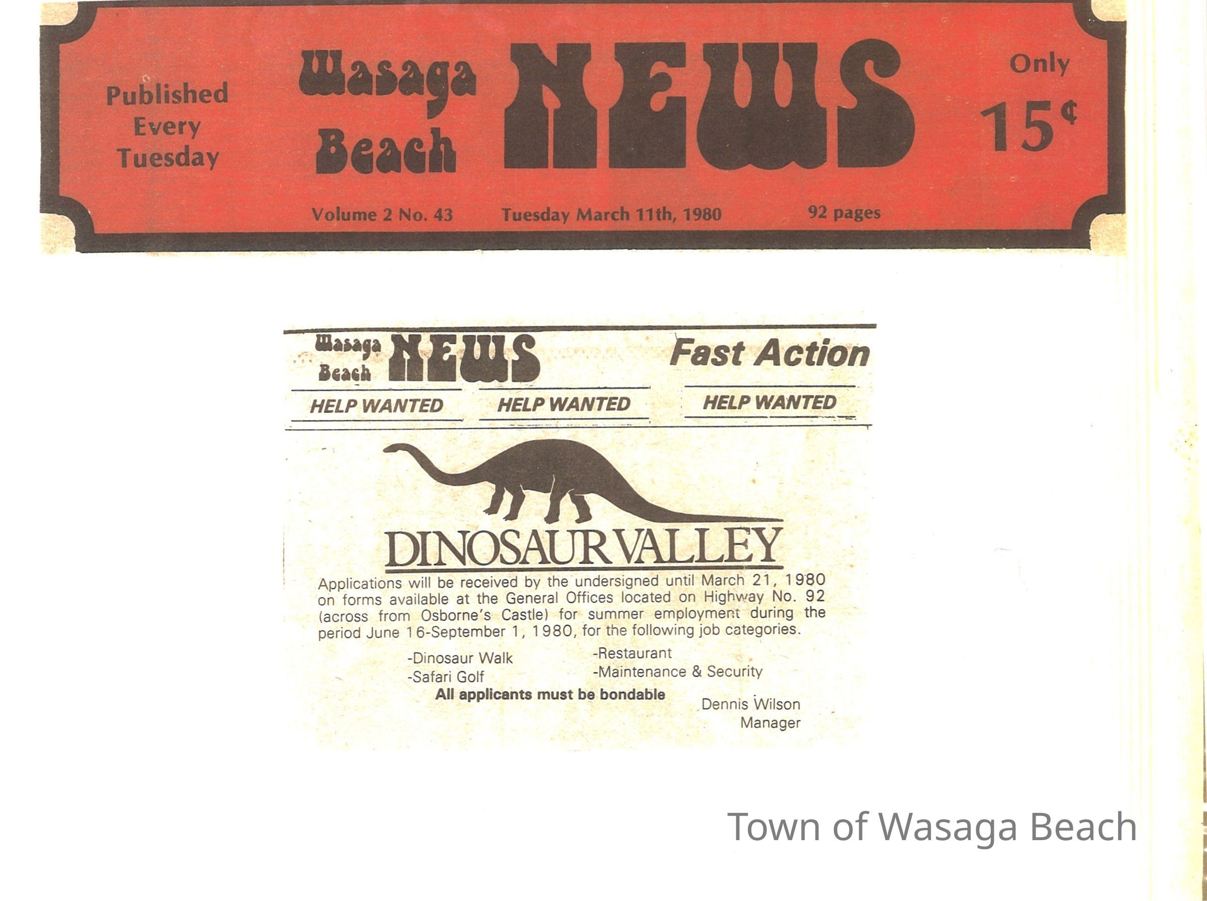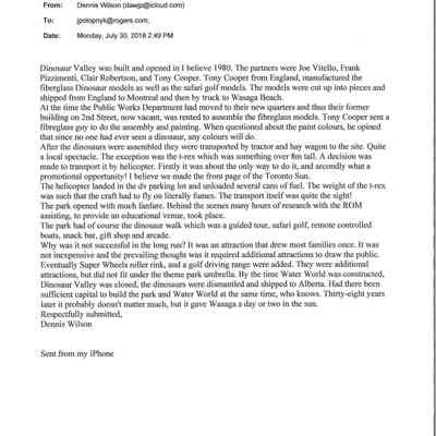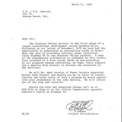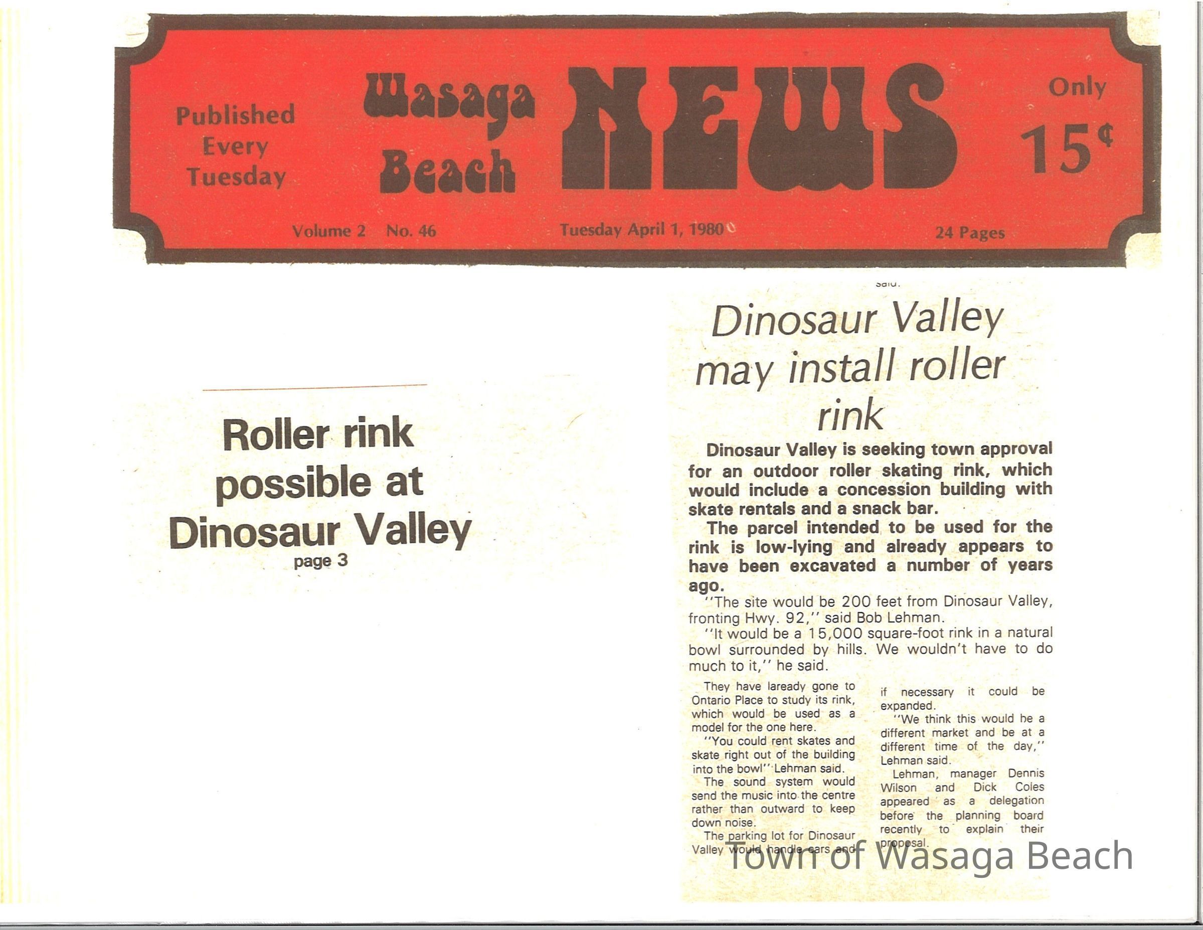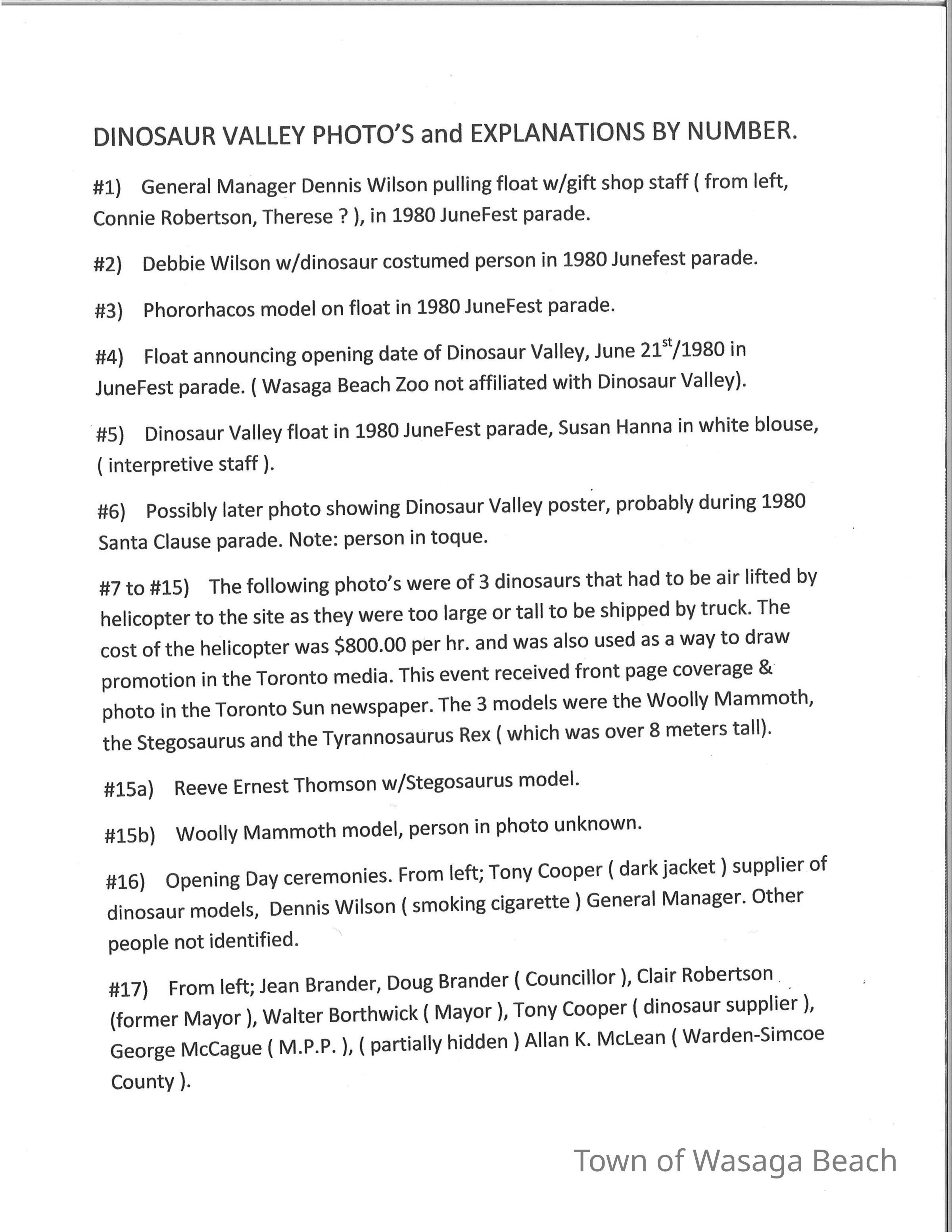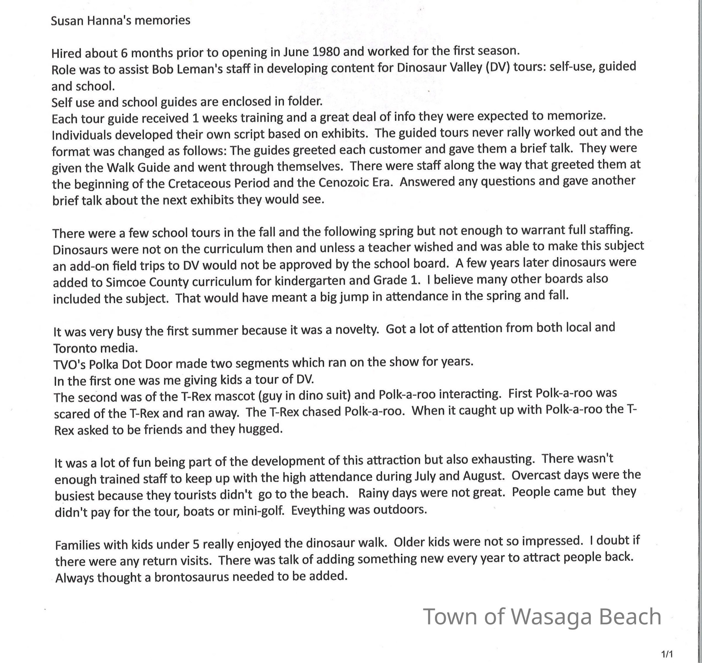 Dinosaur Valley, owned by the Rainbow Hills Development Company, opened on June 21, 1980. Located across the road from the old Wasaga Stars Arena, eight acres of woodland and natural sand dunes provided the setting for half hour tours back in time to the Mesozoic Era. Dinosaur Valley offered "The Dinosaur Walk - over 20 prehistoric creatures in natural settings....For example, the Wooly Mammoth, an elephant-like giant with tusks 8 to 10 feet long...or the Triceratops, 30 feet long, with 3 horns and weighing about 10 tons", mini golf, known as Safari Golf, remote-control boats, a gift shop, snack bar and an outdoor terrace. Rainbow Hills Development Company filed for bankruptcy and the site disappeared in 1983.Acquisition