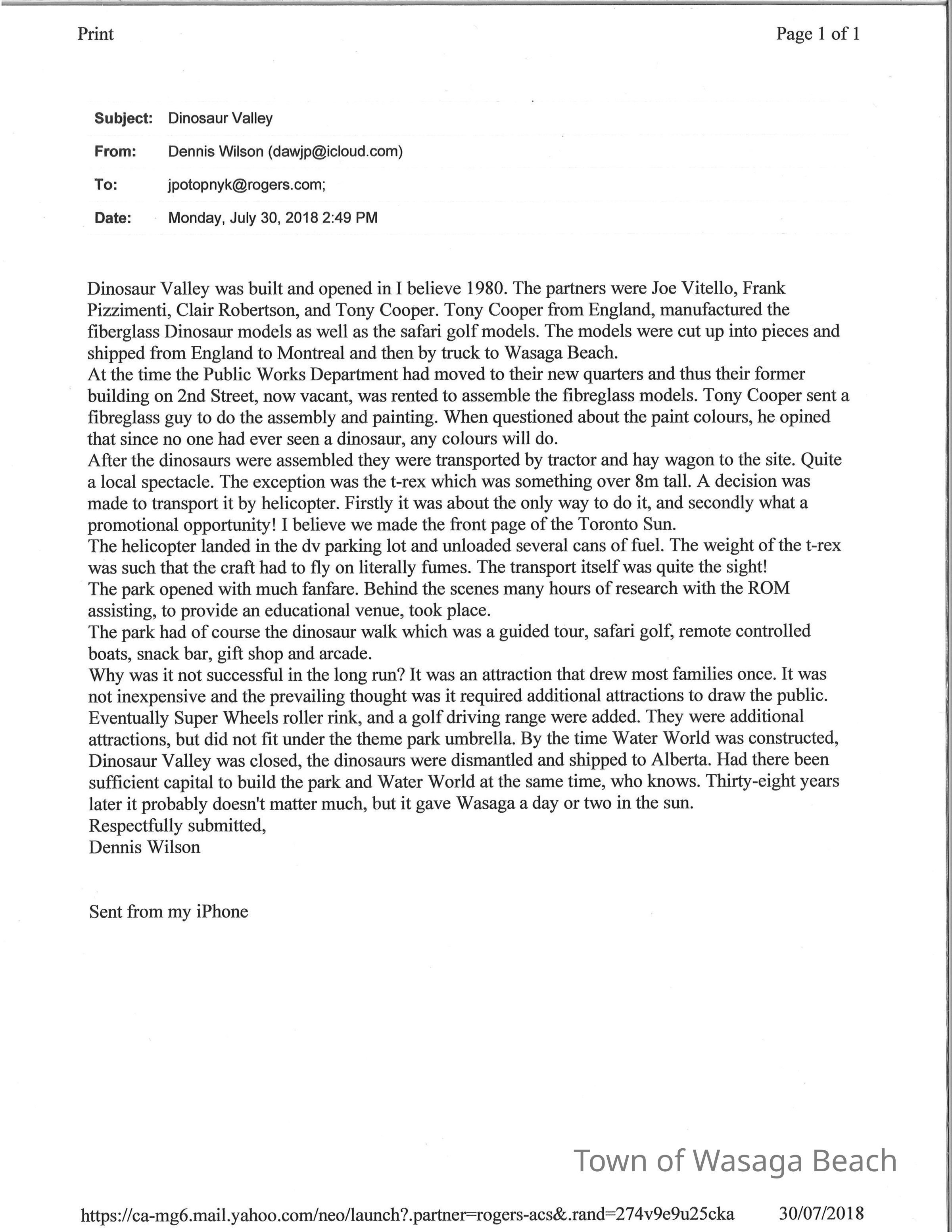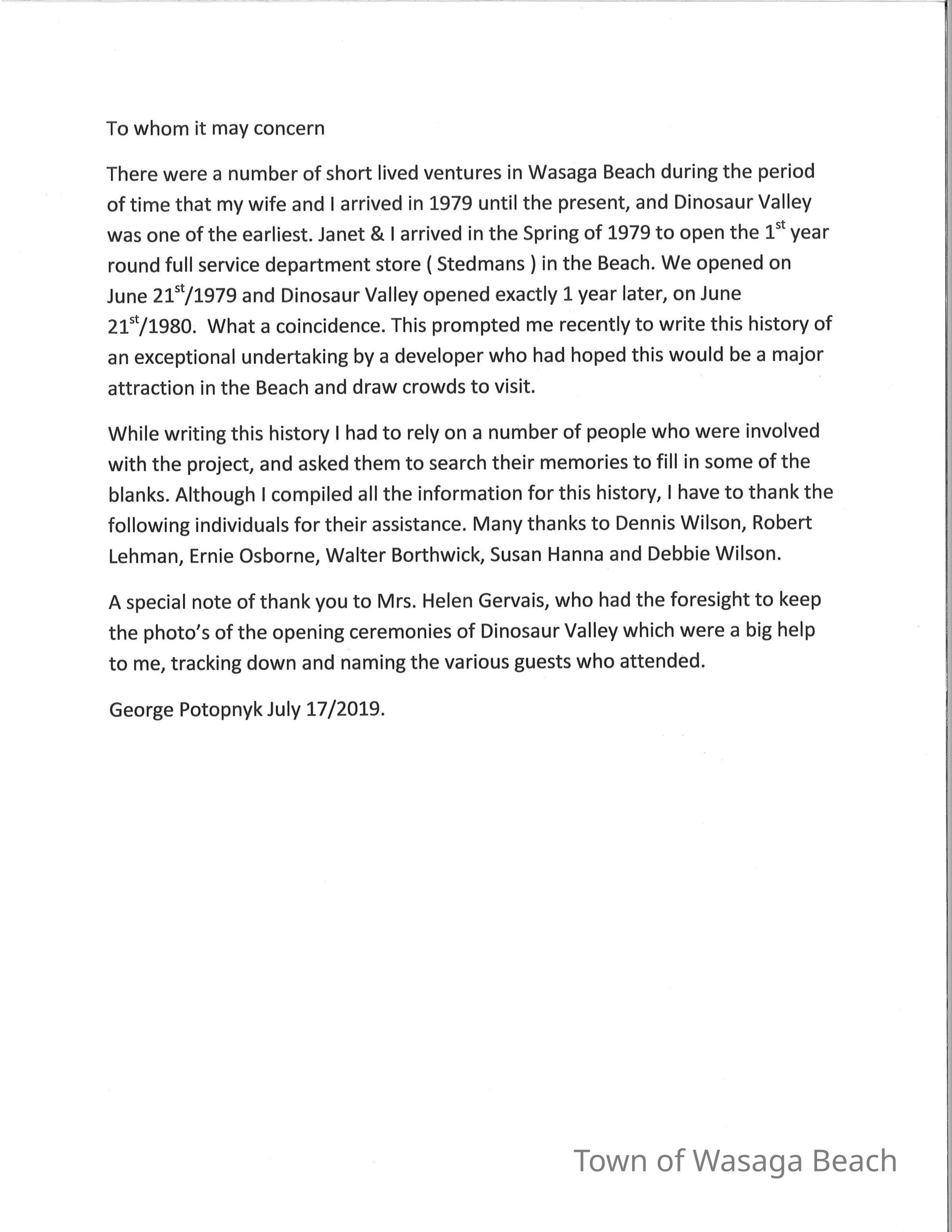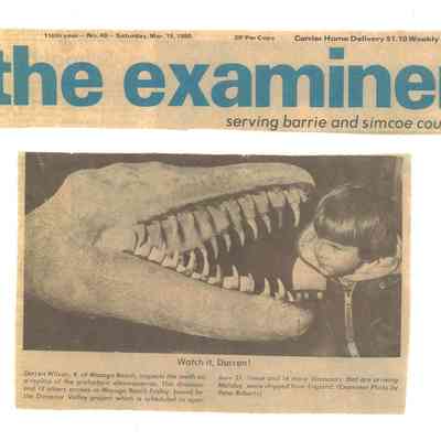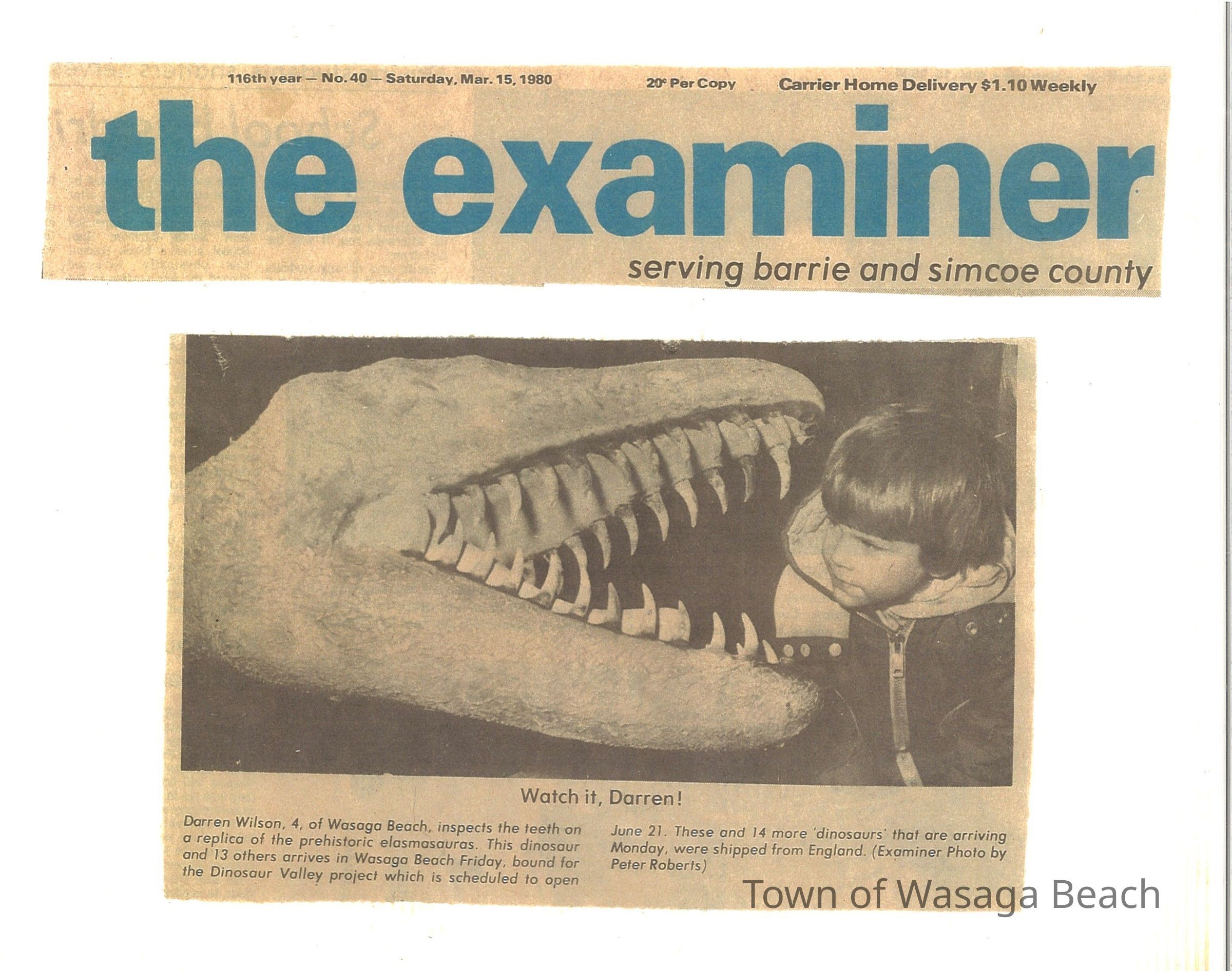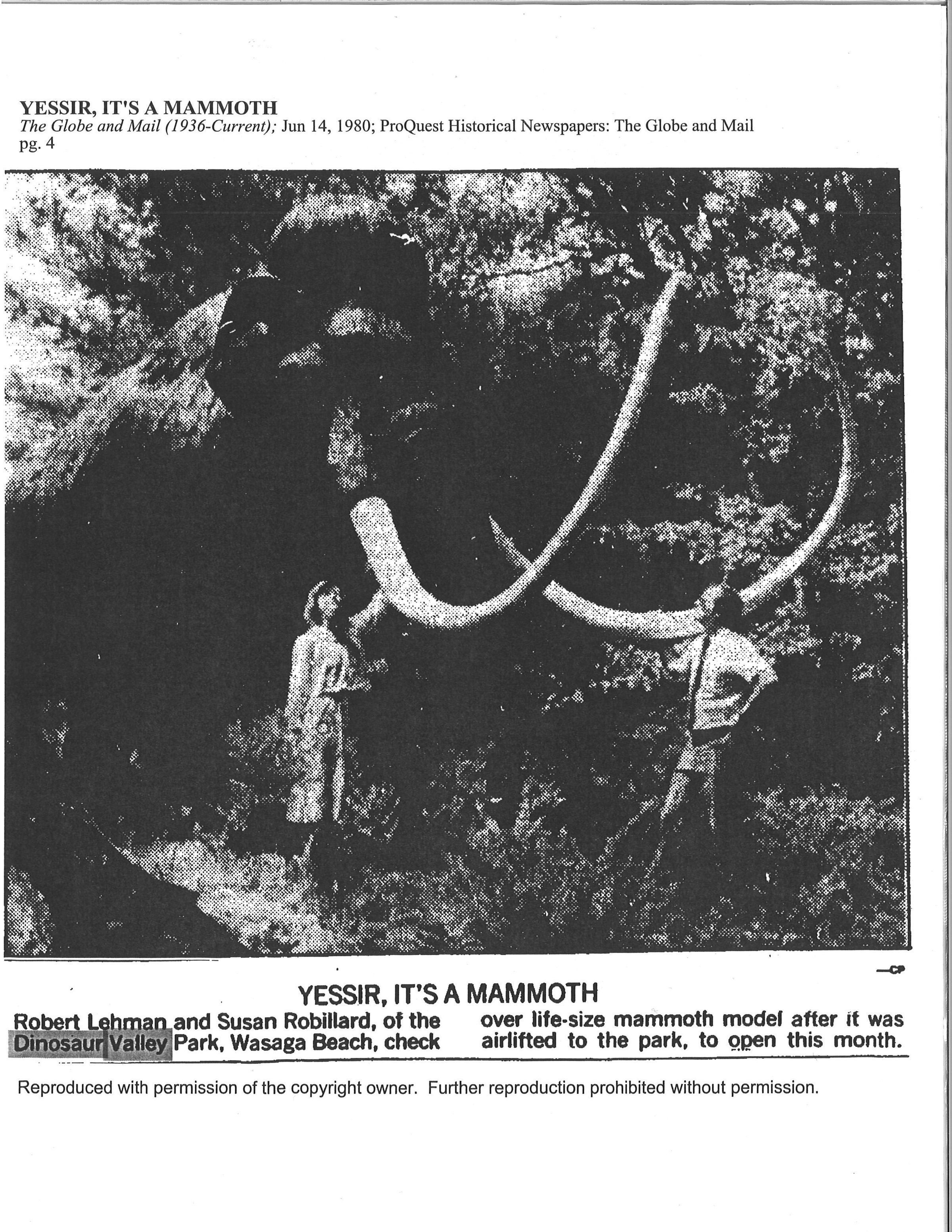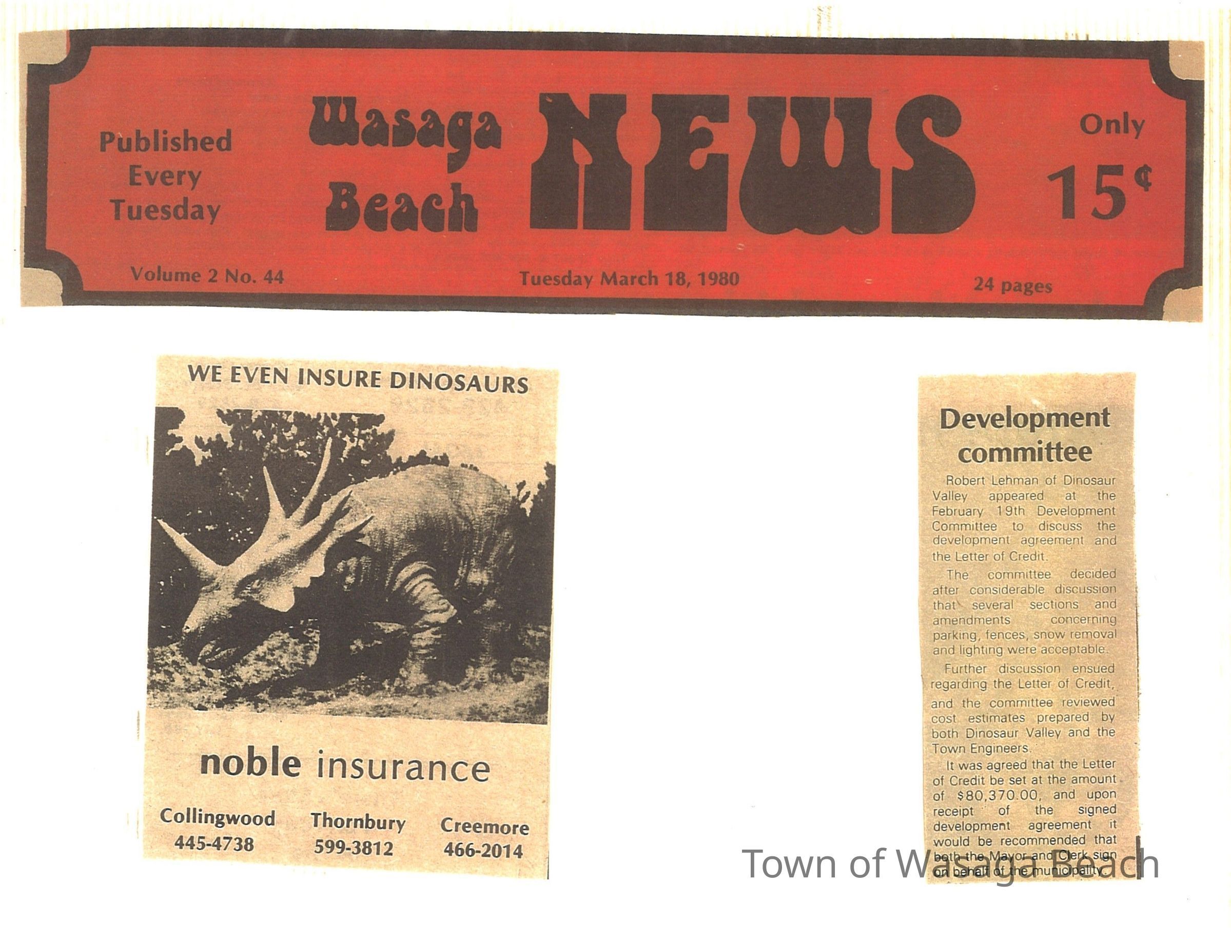 Dinosaur Valley, owned by the Rainbow Hills Development Company, opened on June 21, 1980. Located across the road from the old Wasaga Stars Arena, eight acres of woodland and natural sand dunes provided the setting for half hour tours back in time to the Mesozoic Era. Dinosaur Valley offered "The Dinosaur Walk - over 20 prehistoric creatures in natural settings....For example, the Wooly Mammoth, an elephant-like giant with tusks 8 to 10 feet long...or the Triceratops, 30 feet long, with 3 horns and weighing about 10 tons", mini golf, known as Safari Golf, remote-control boats, a gift shop, snack bar and an outdoor terrace. Rainbow Hills Development Company filed for bankruptcy and the site disappeared in 1983.Acquisition