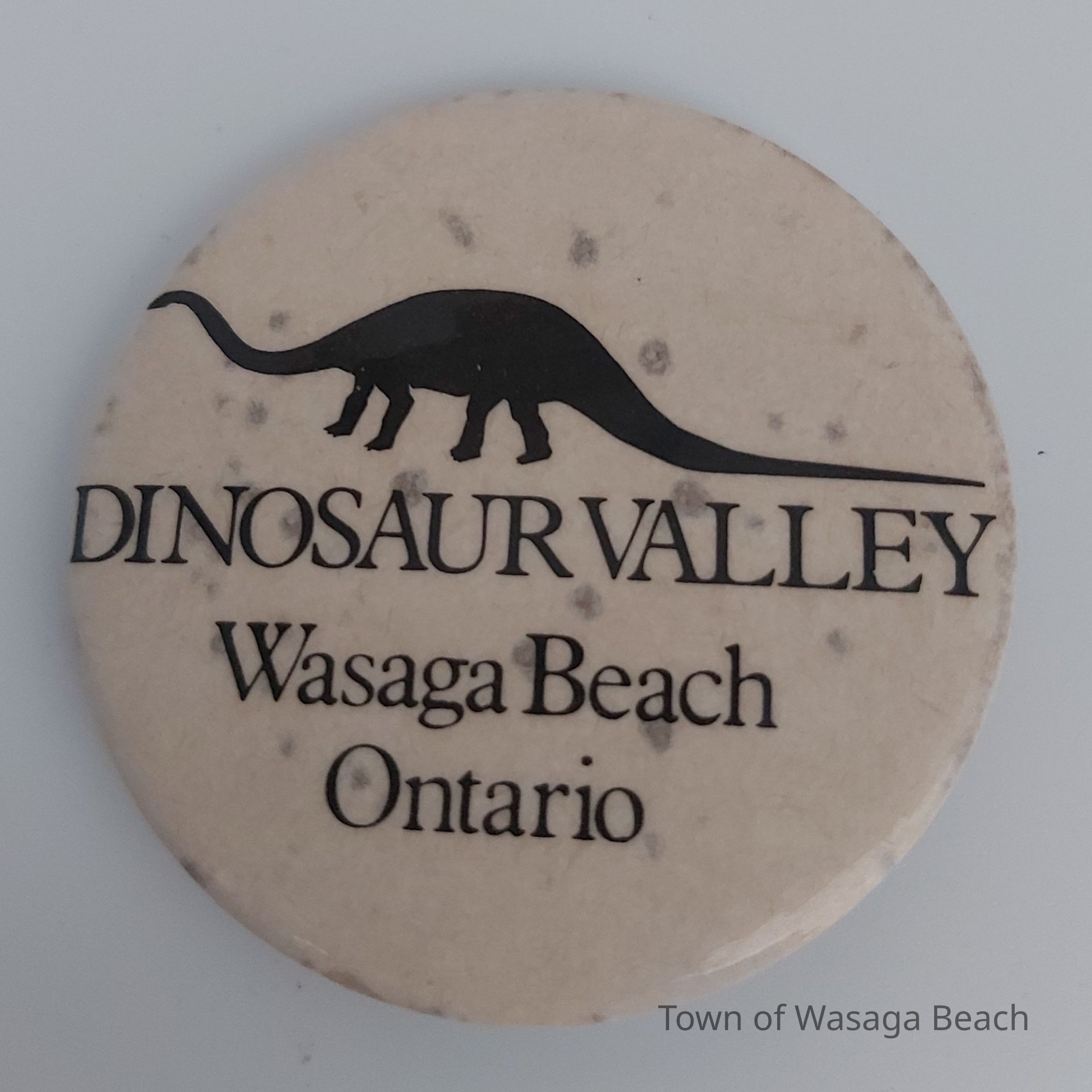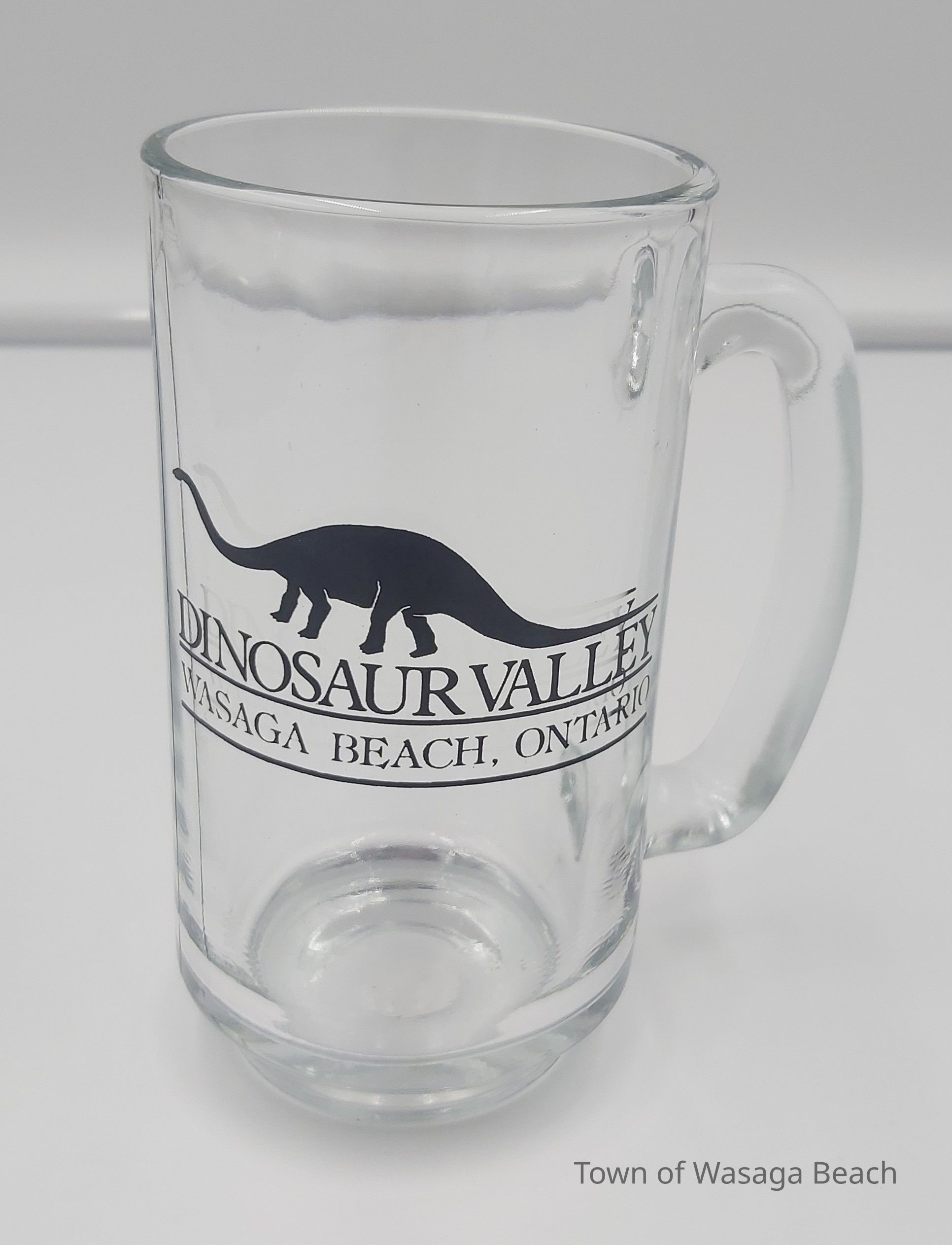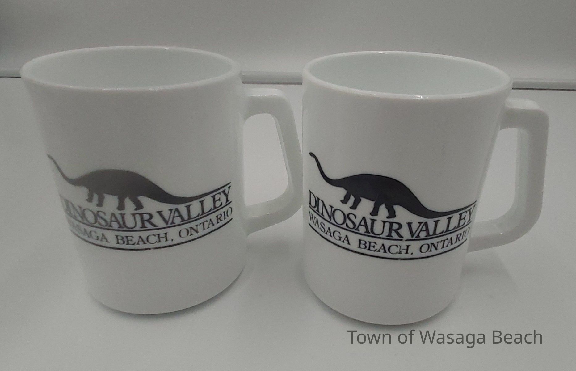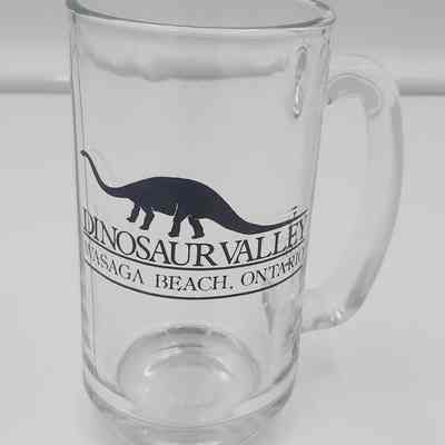 Dinosaur souvenir items: button, 2 mugs and one glass mug with handle